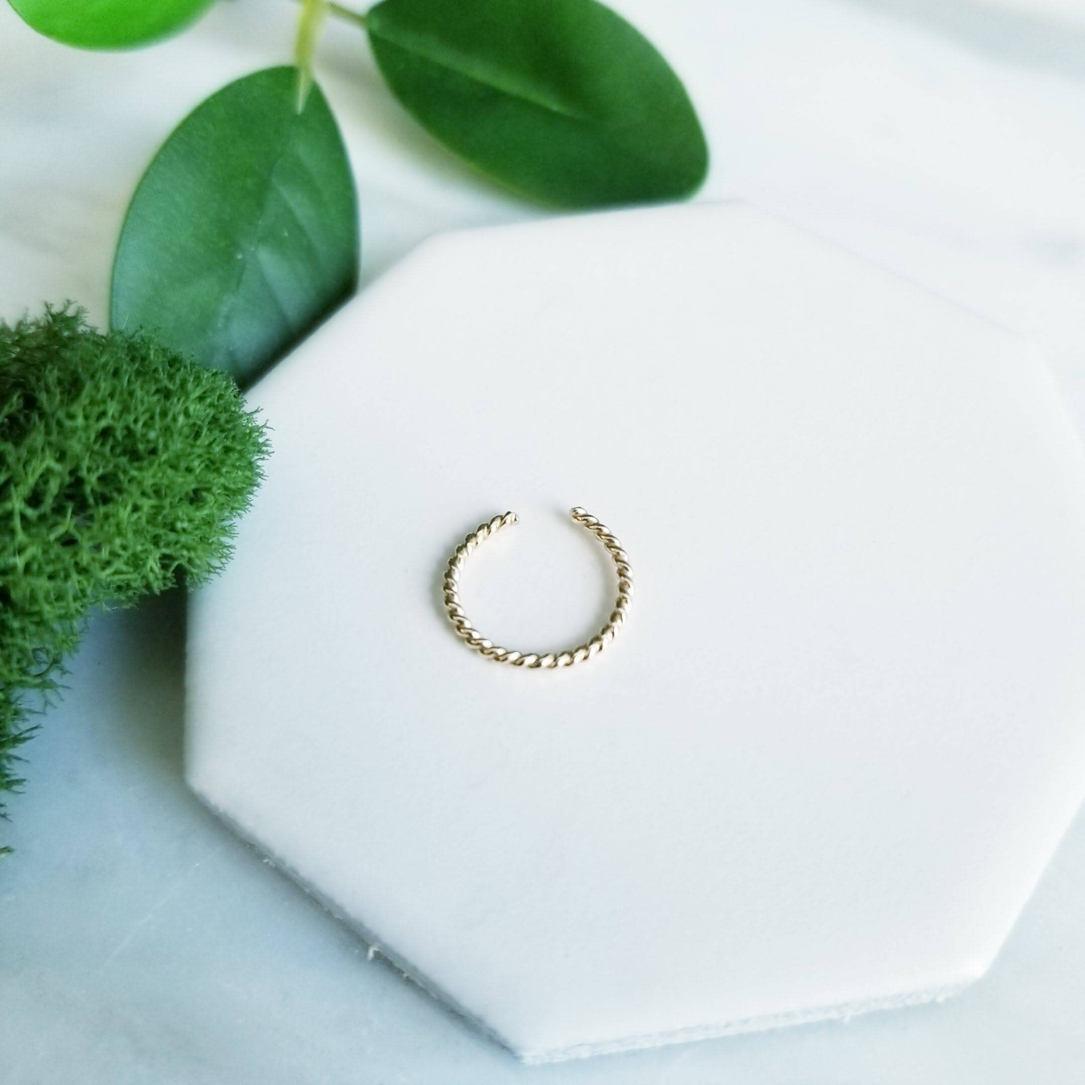 Can also be slid onto the side of your nose as a faux hoop piercing. Squeeze gently to size.