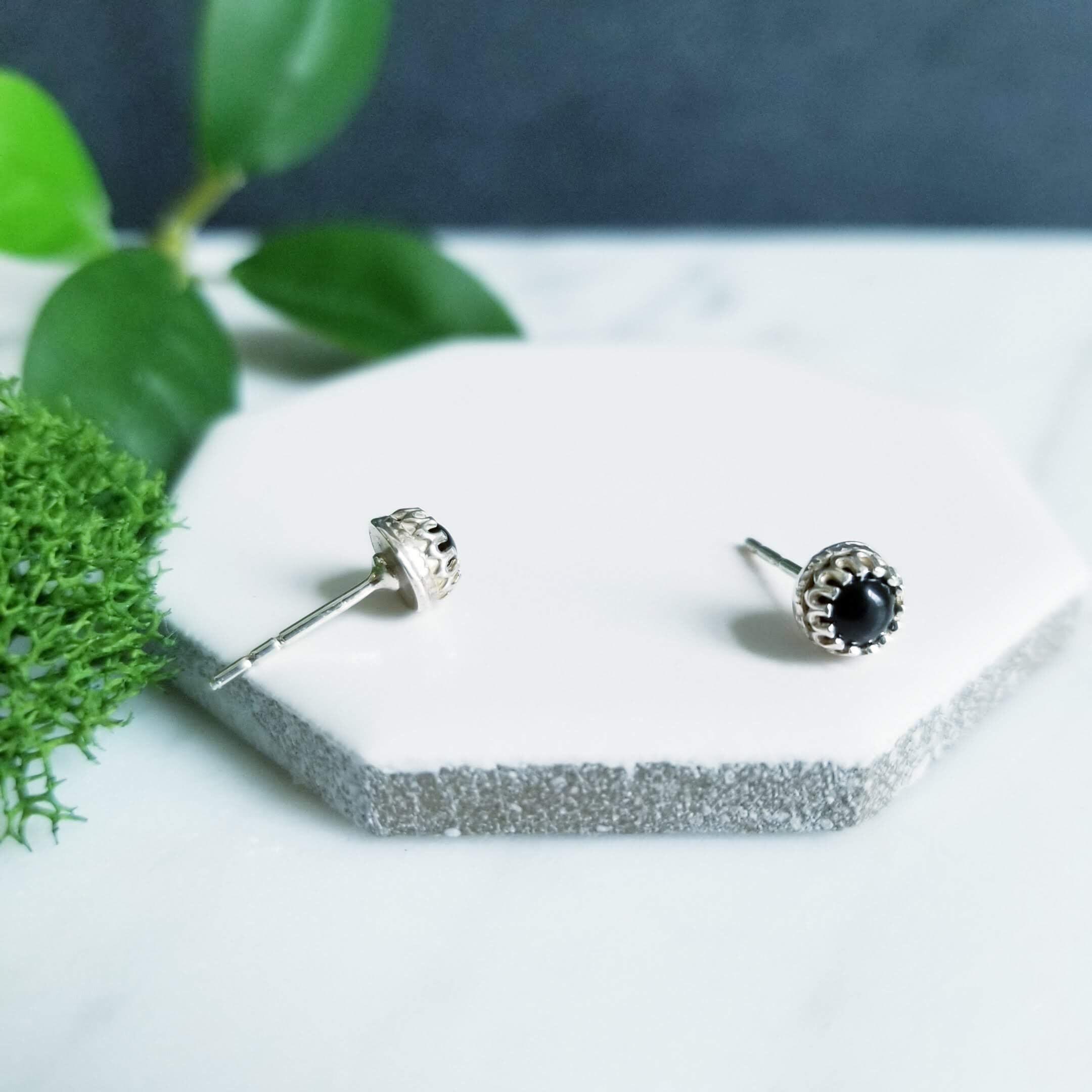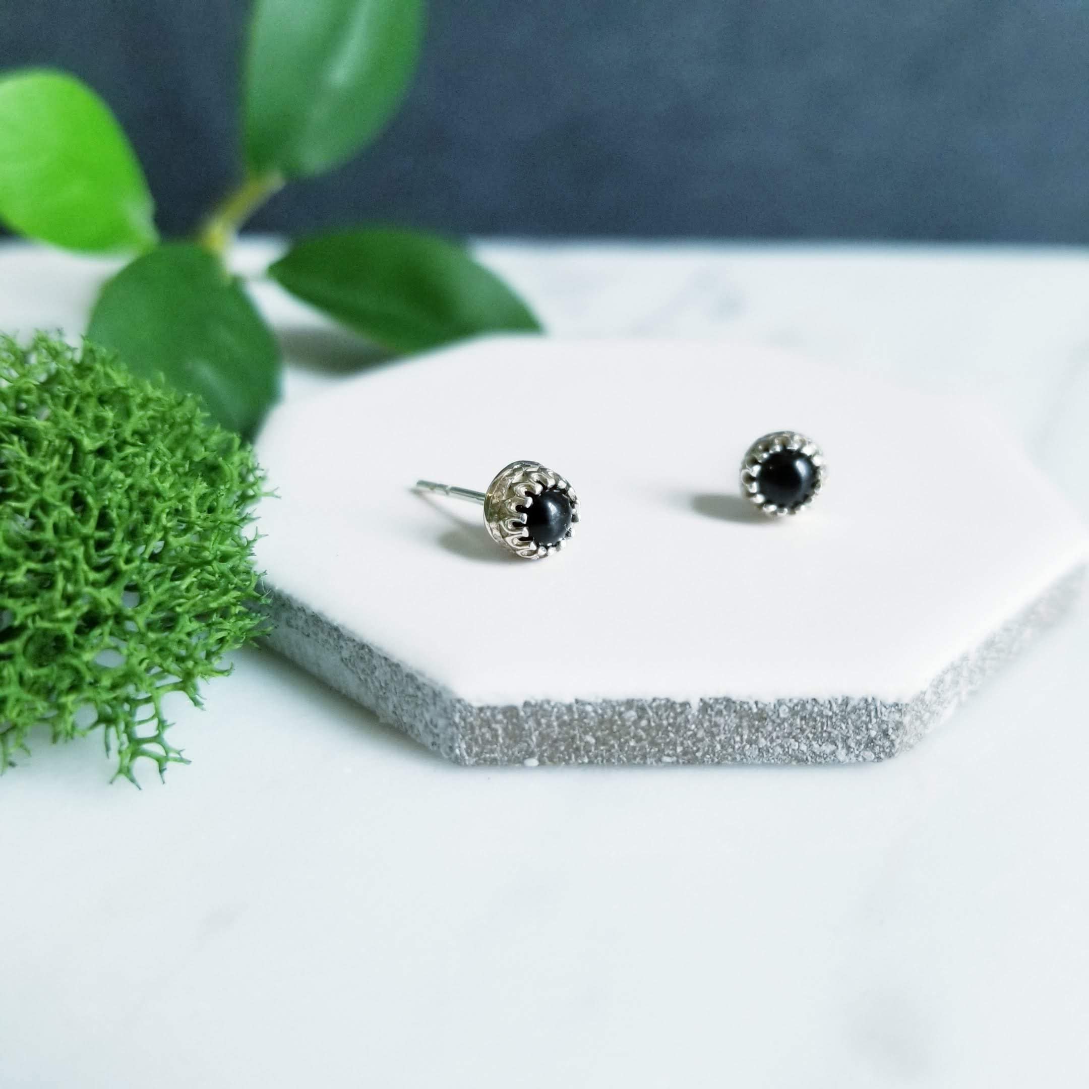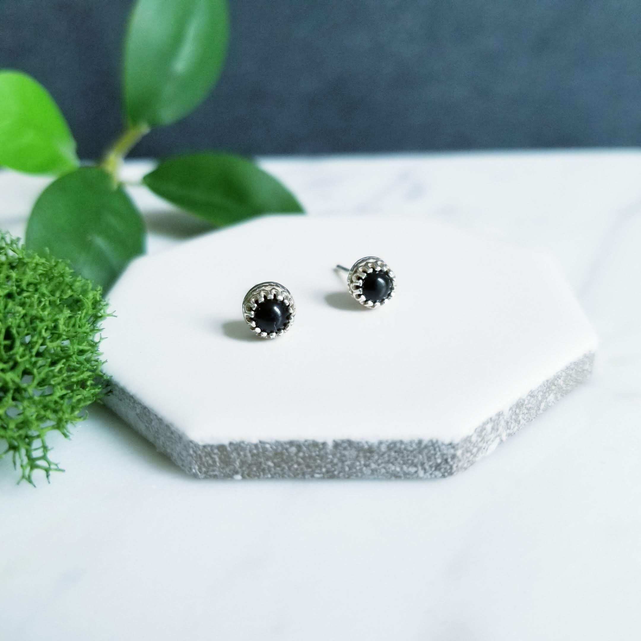 Smooth Matte Black Spinel cabochon set in a grown cut sterling silver ear post.