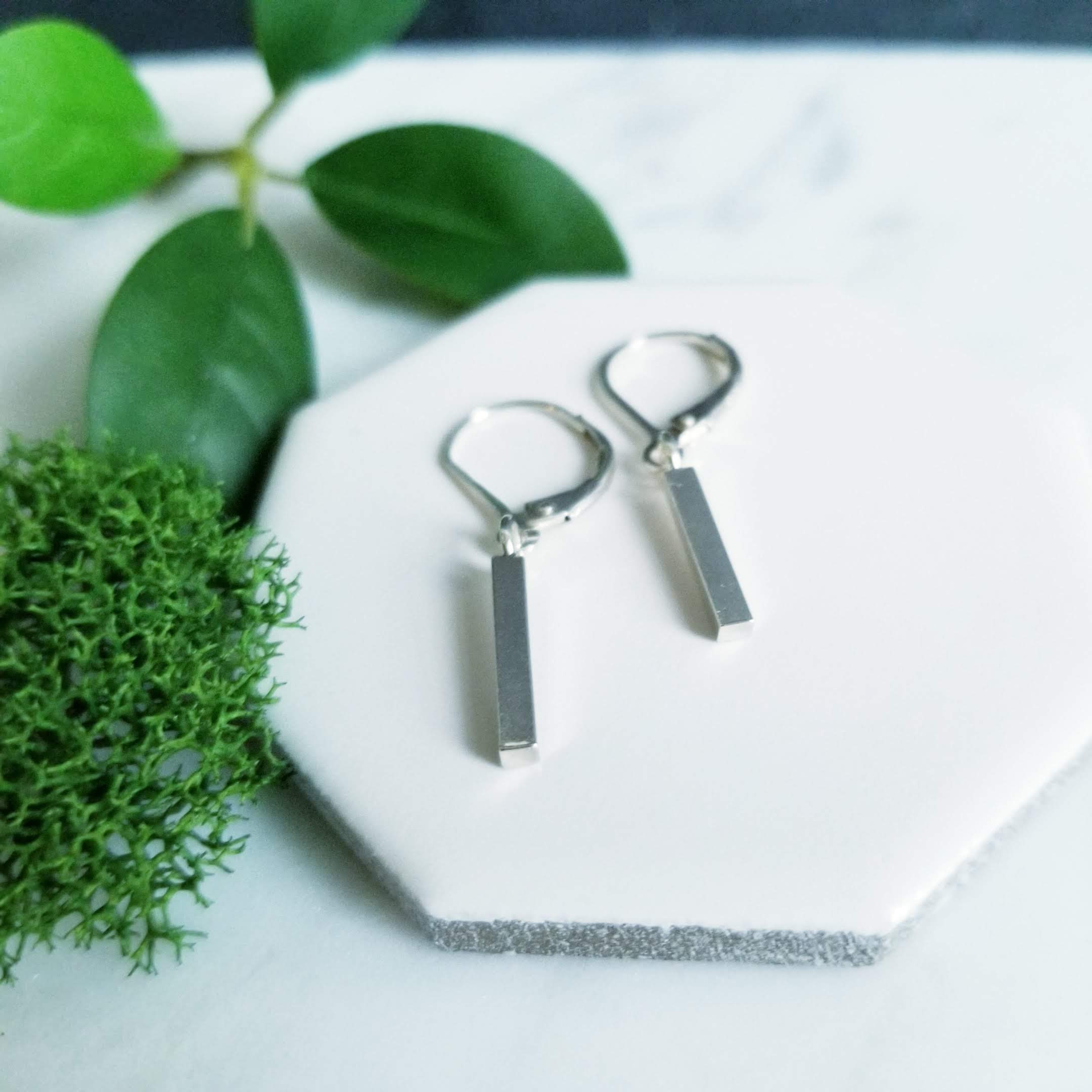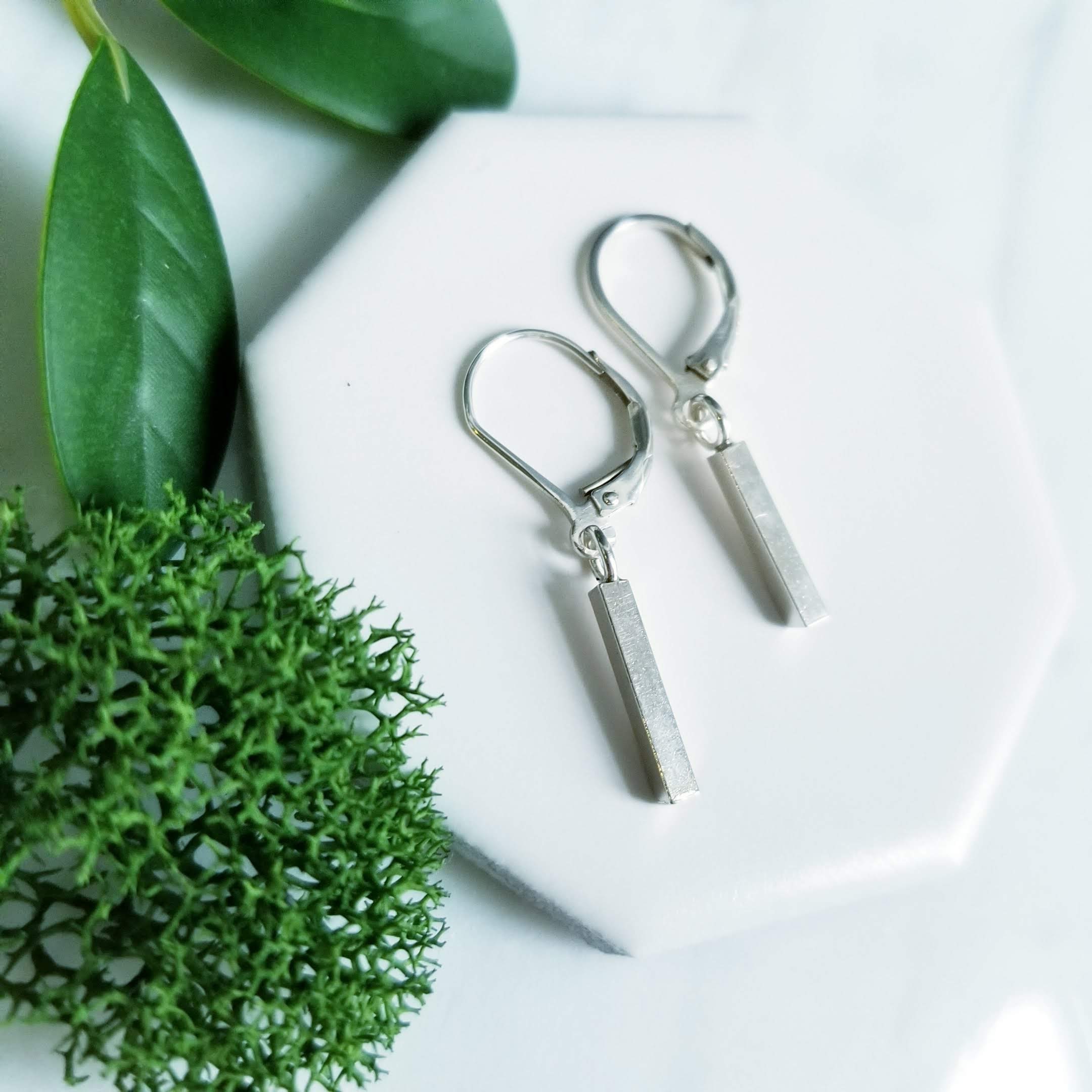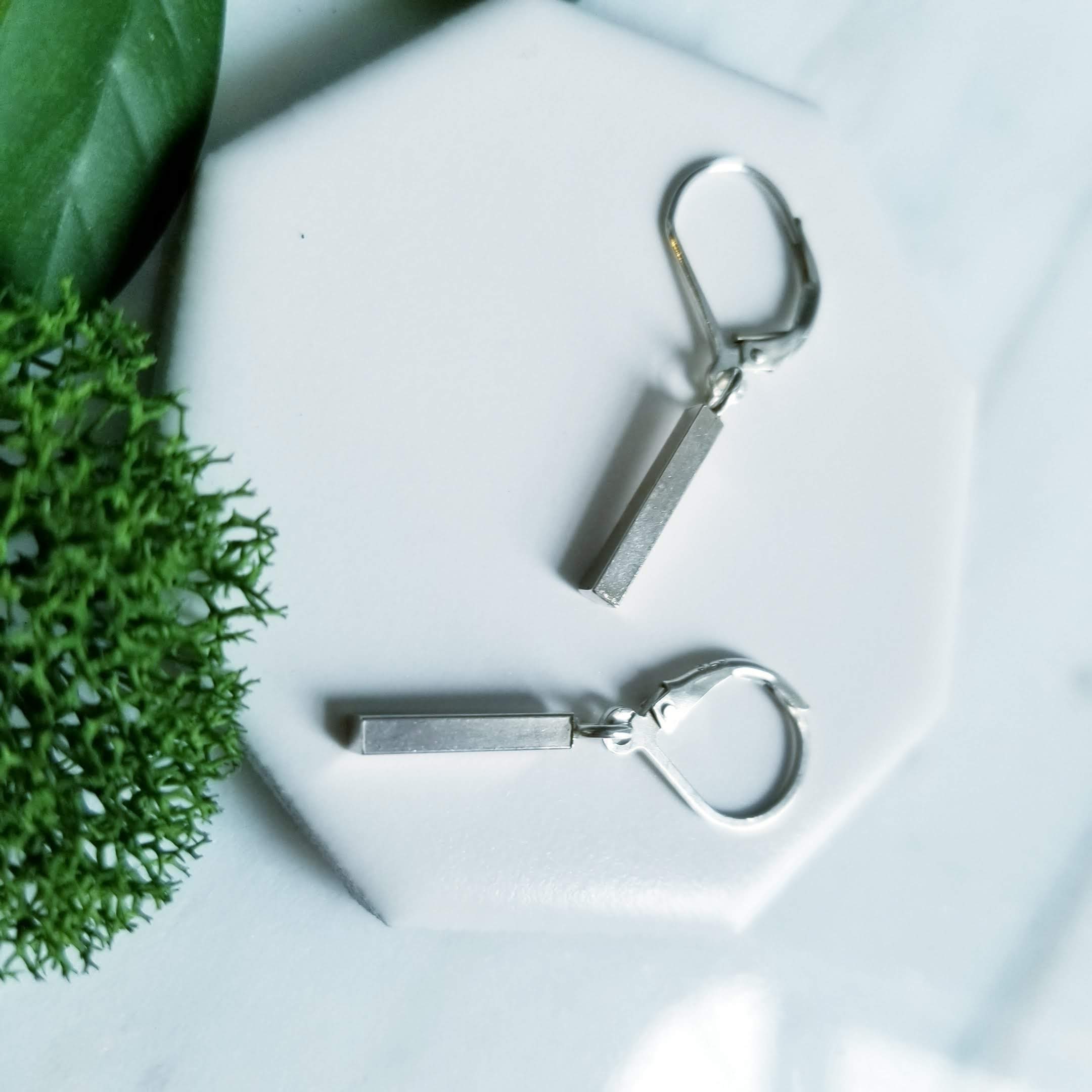 Polished Short square sterling wire has been soldered to small loops and dangle freely from lever back ear wires.