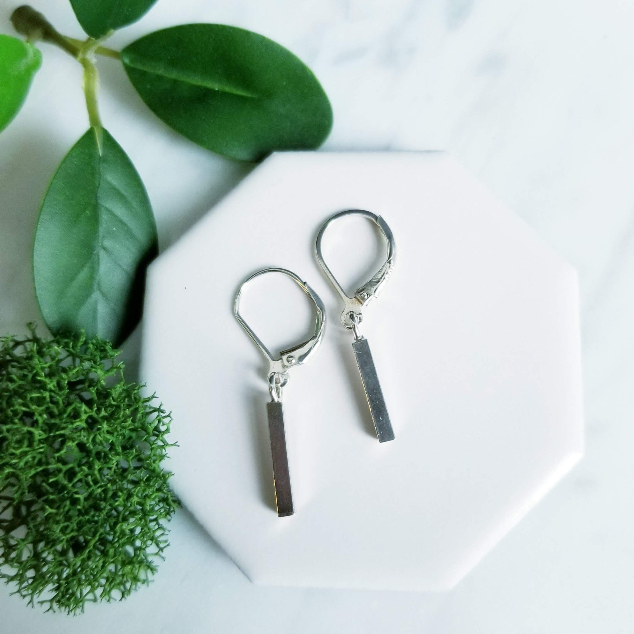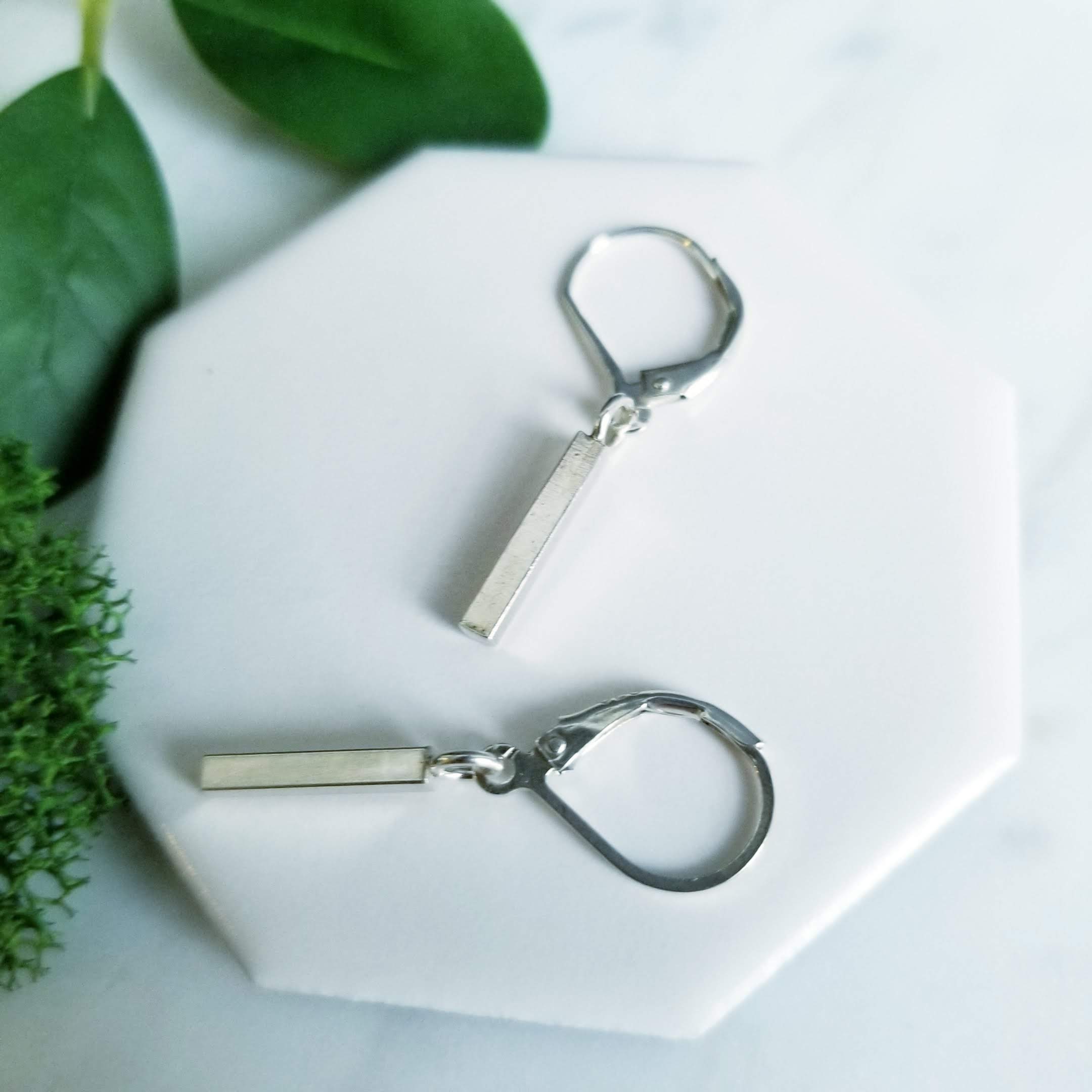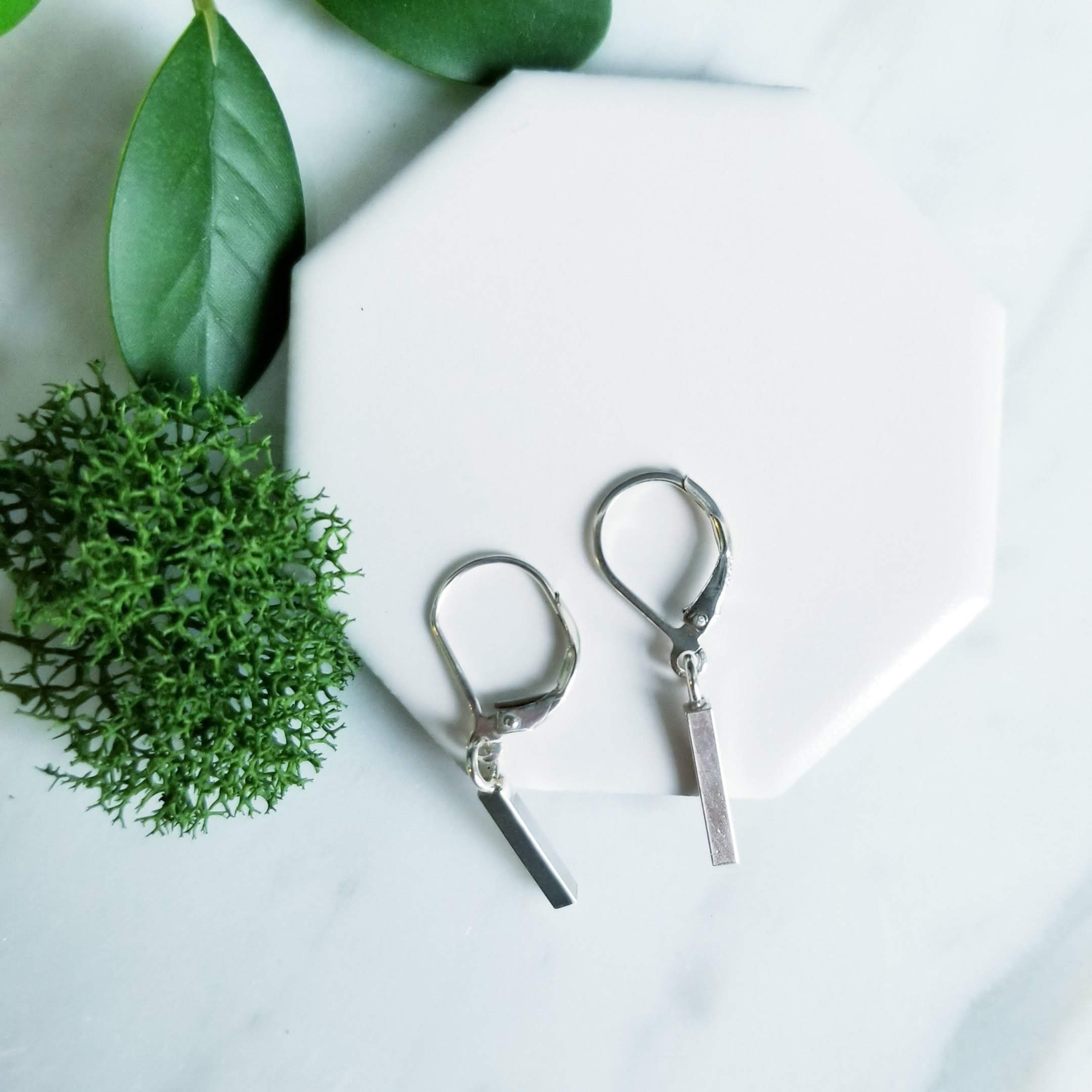 Polished Short square sterling wire has been soldered to small loops and dangle freely from lever back ear wires.