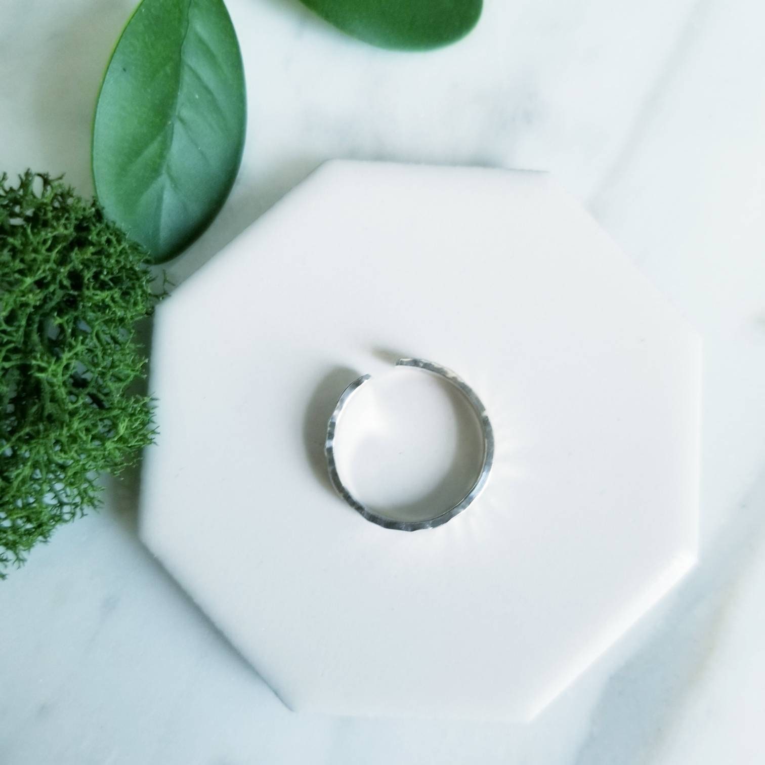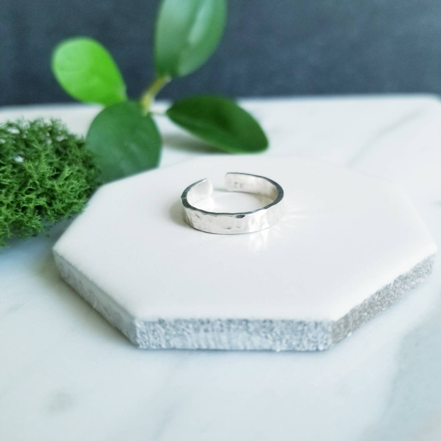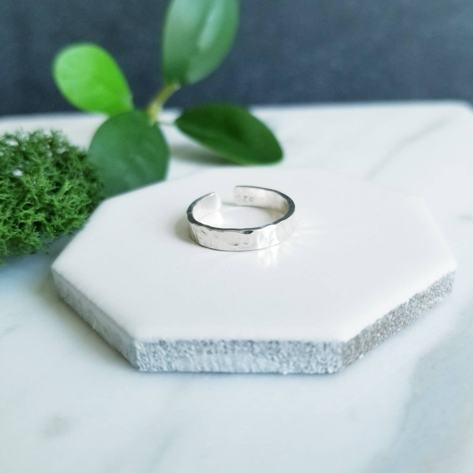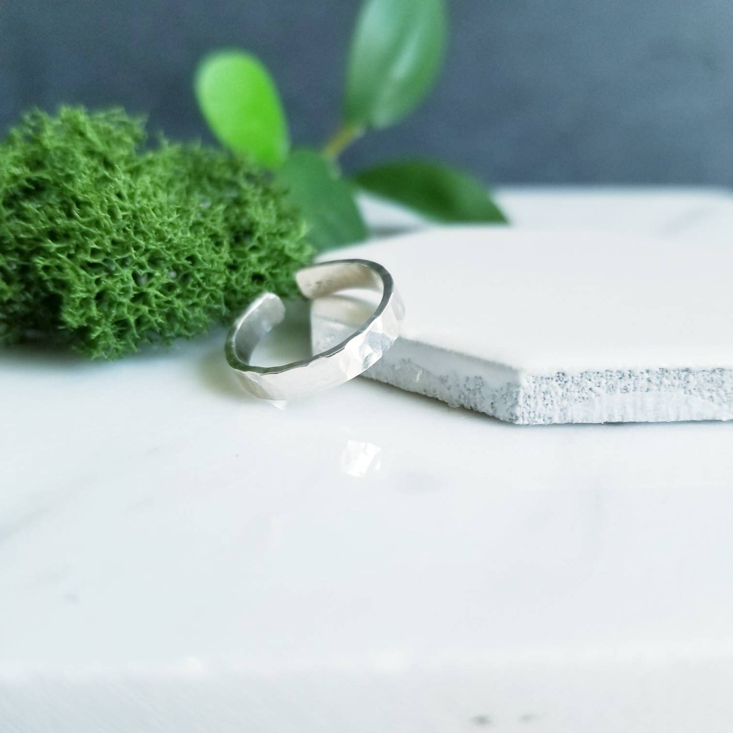 A hammered texture finish comfortable toe ring in 3mm flat wire, polished smooth on the inside. Easily adjusted by gently squeezing it shut or gently expanding the wire.