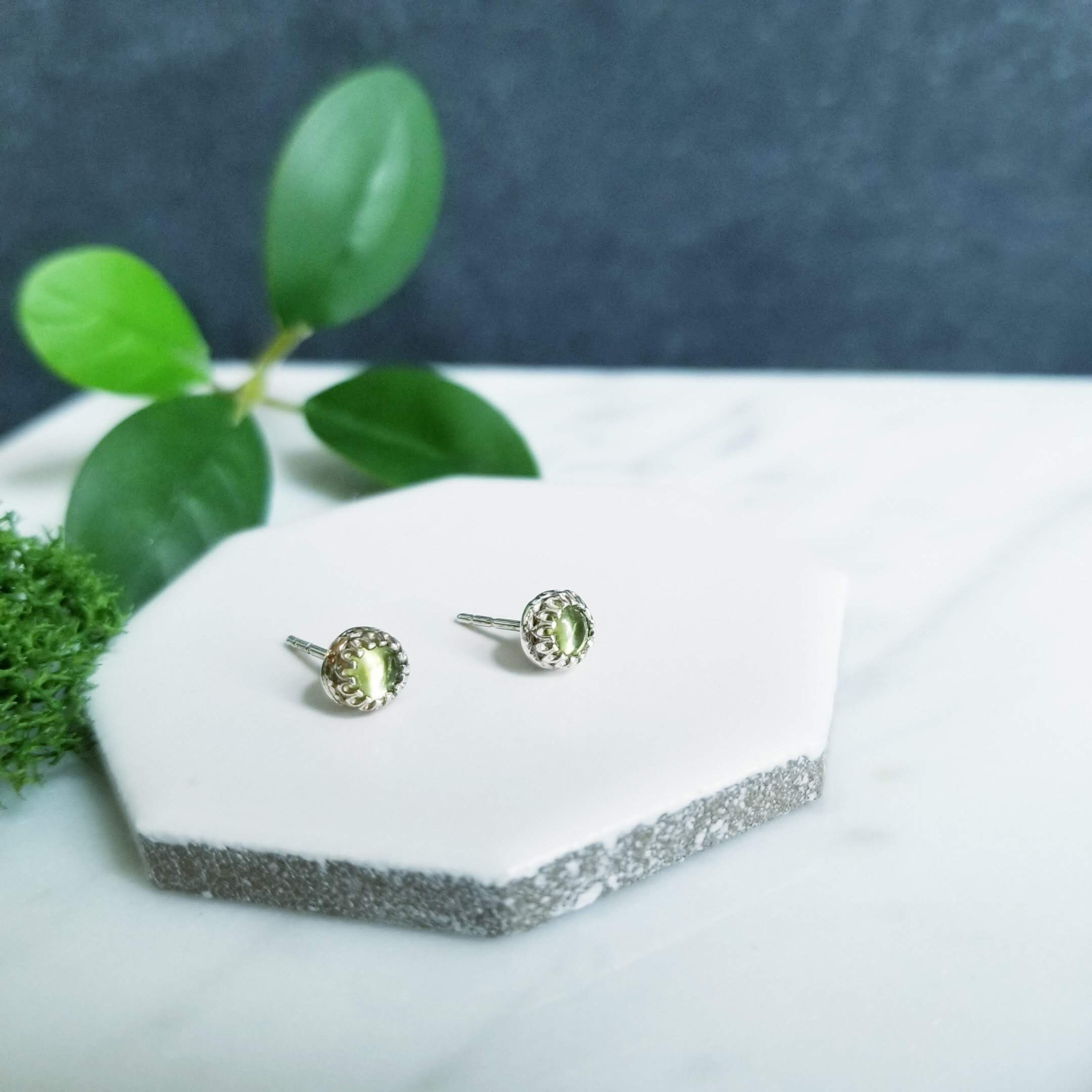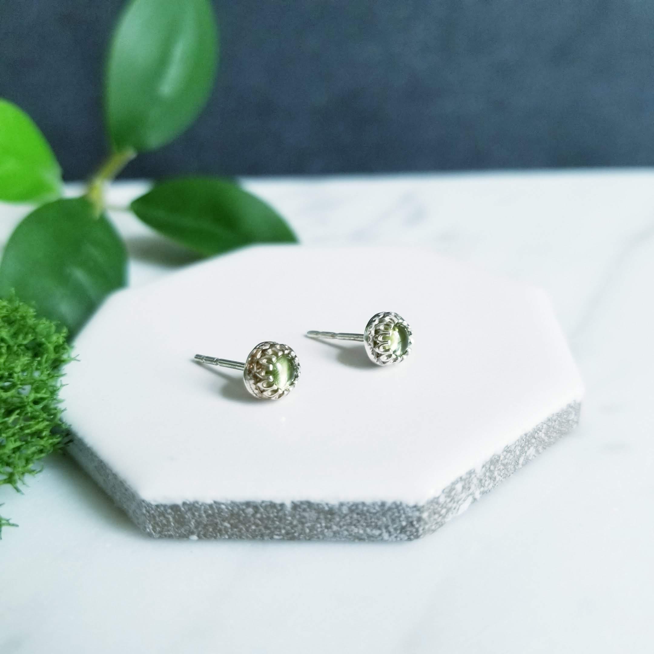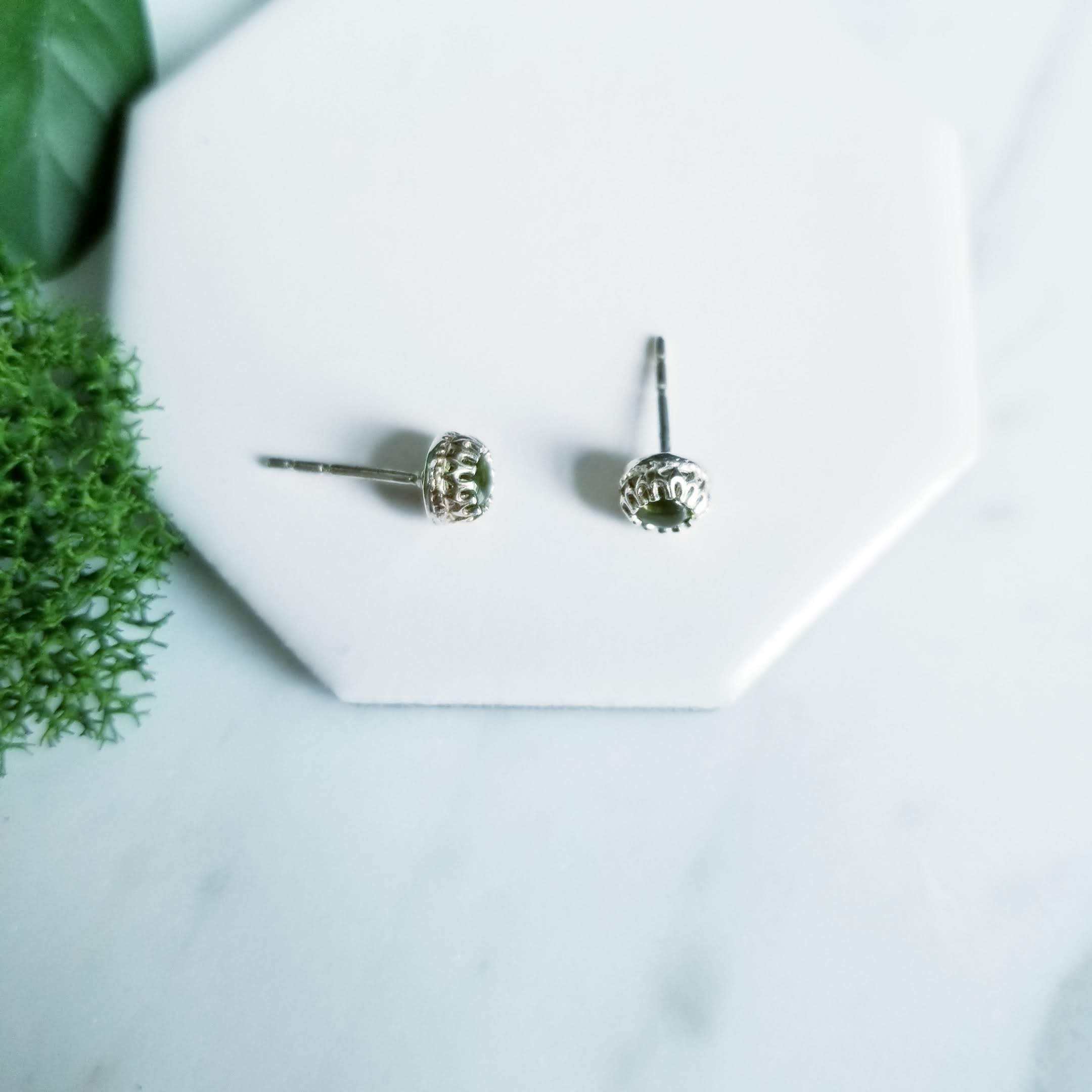 Beautiful Green Peridot cabochons set in a grown cut sterling silver ear post.
