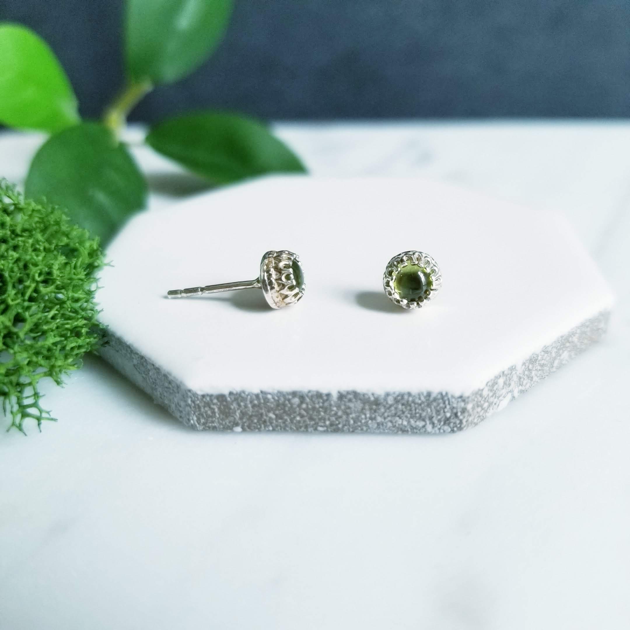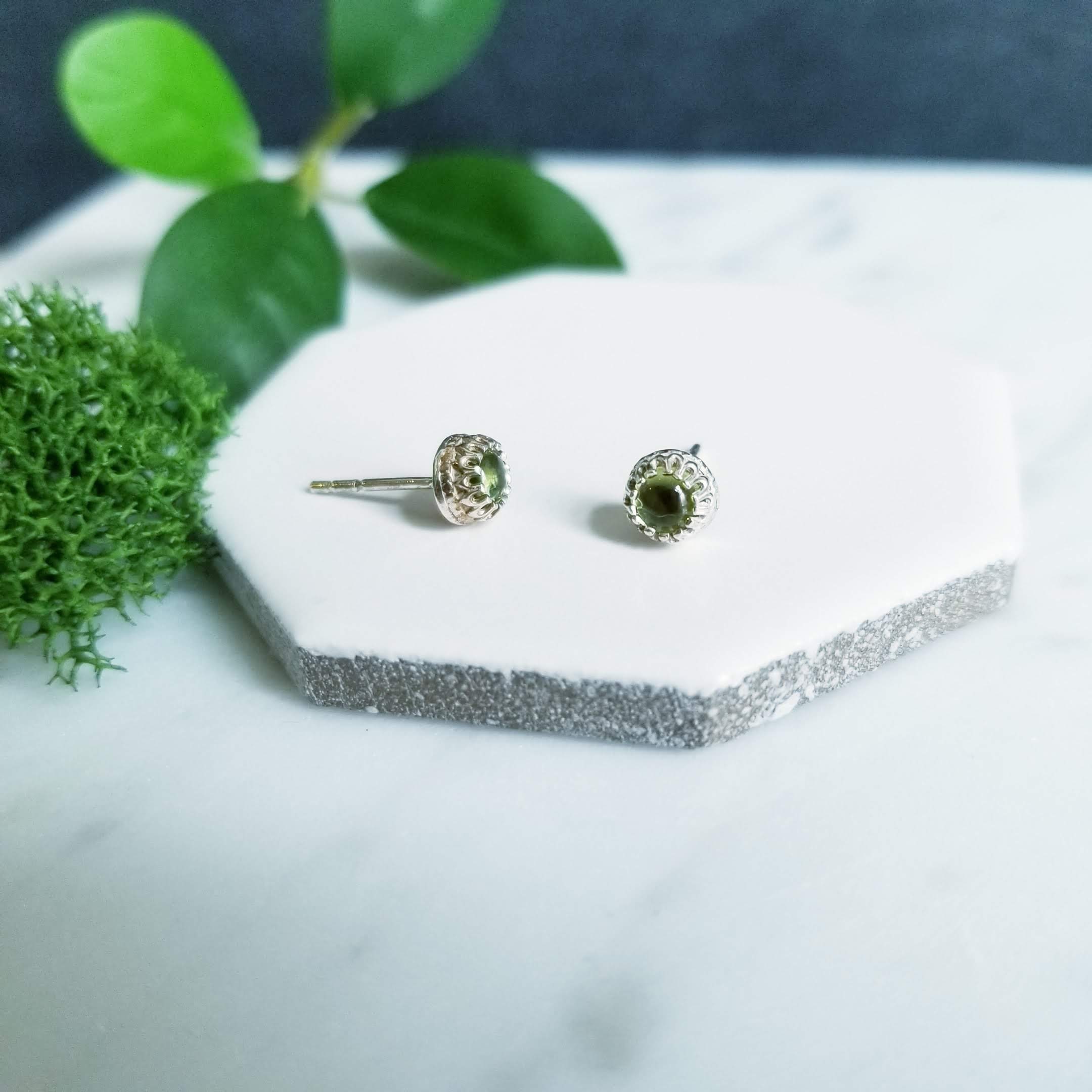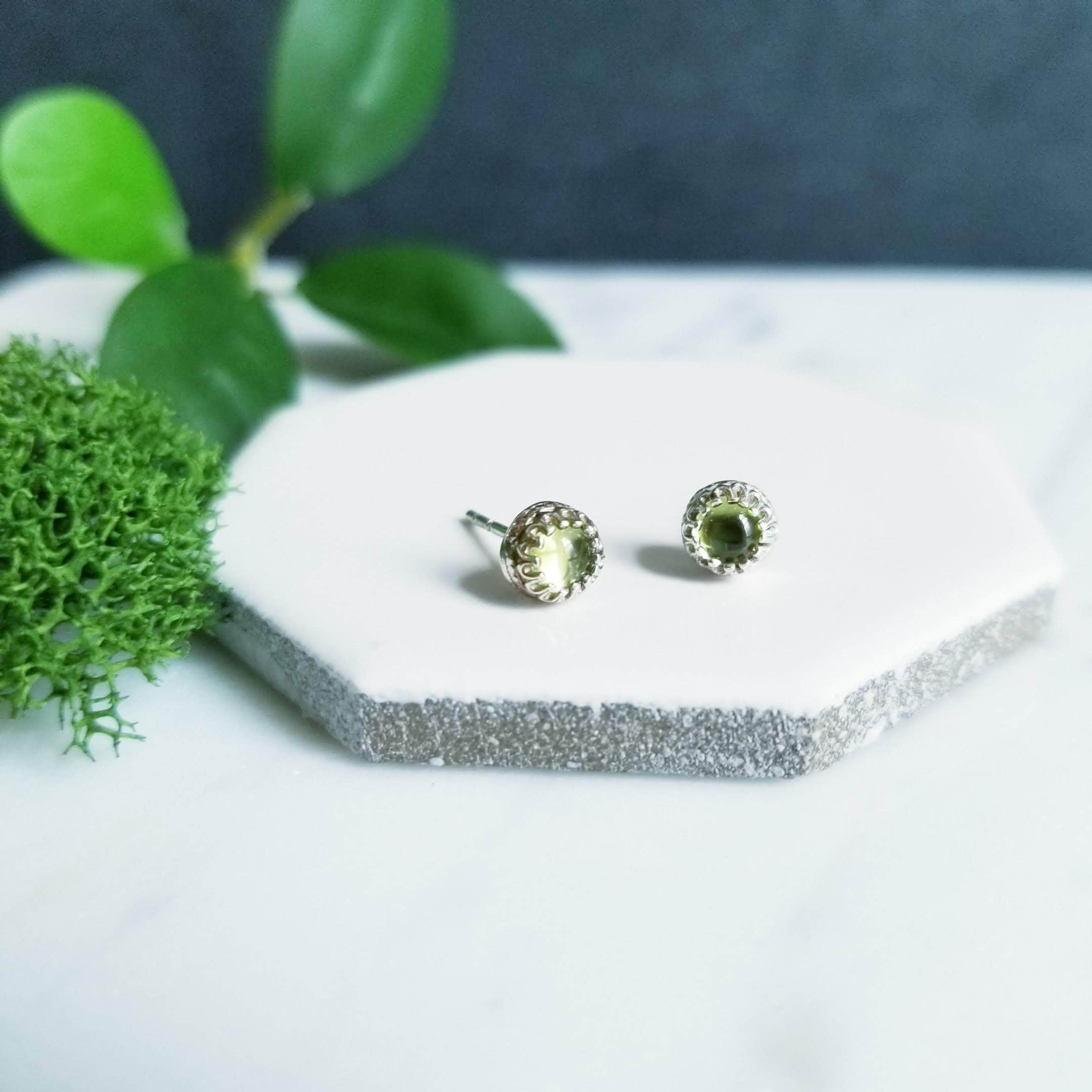 Beautiful Green Peridot cabochons set in a grown cut sterling silver ear post.