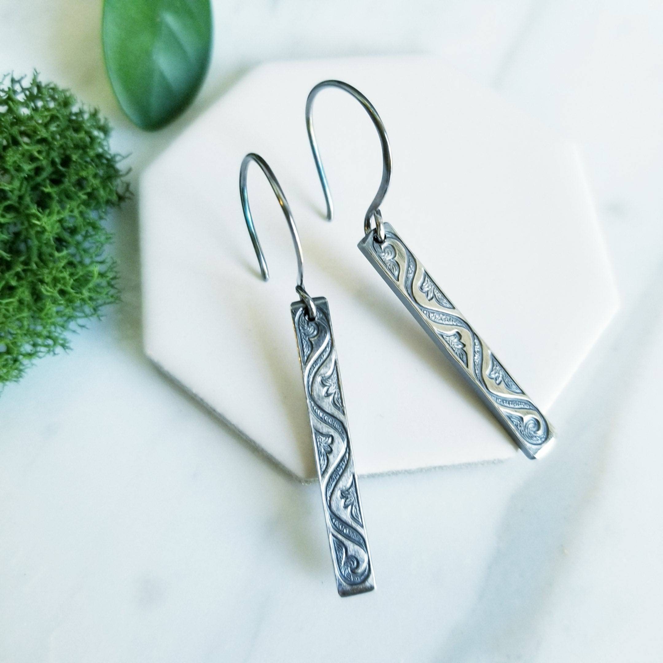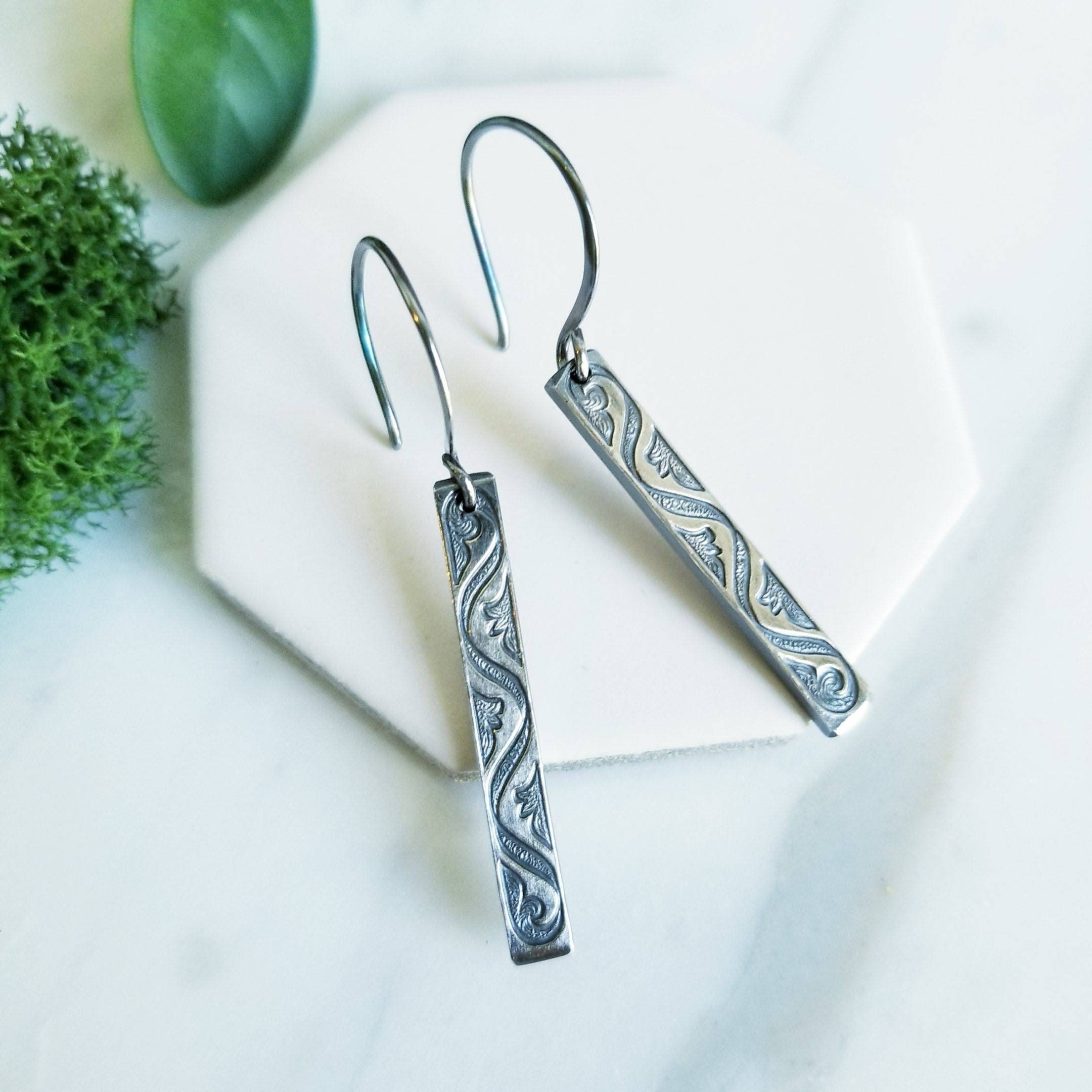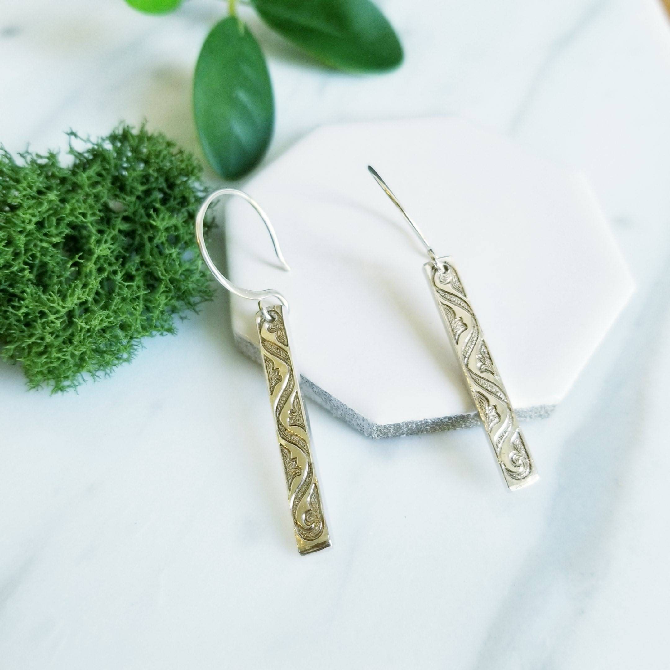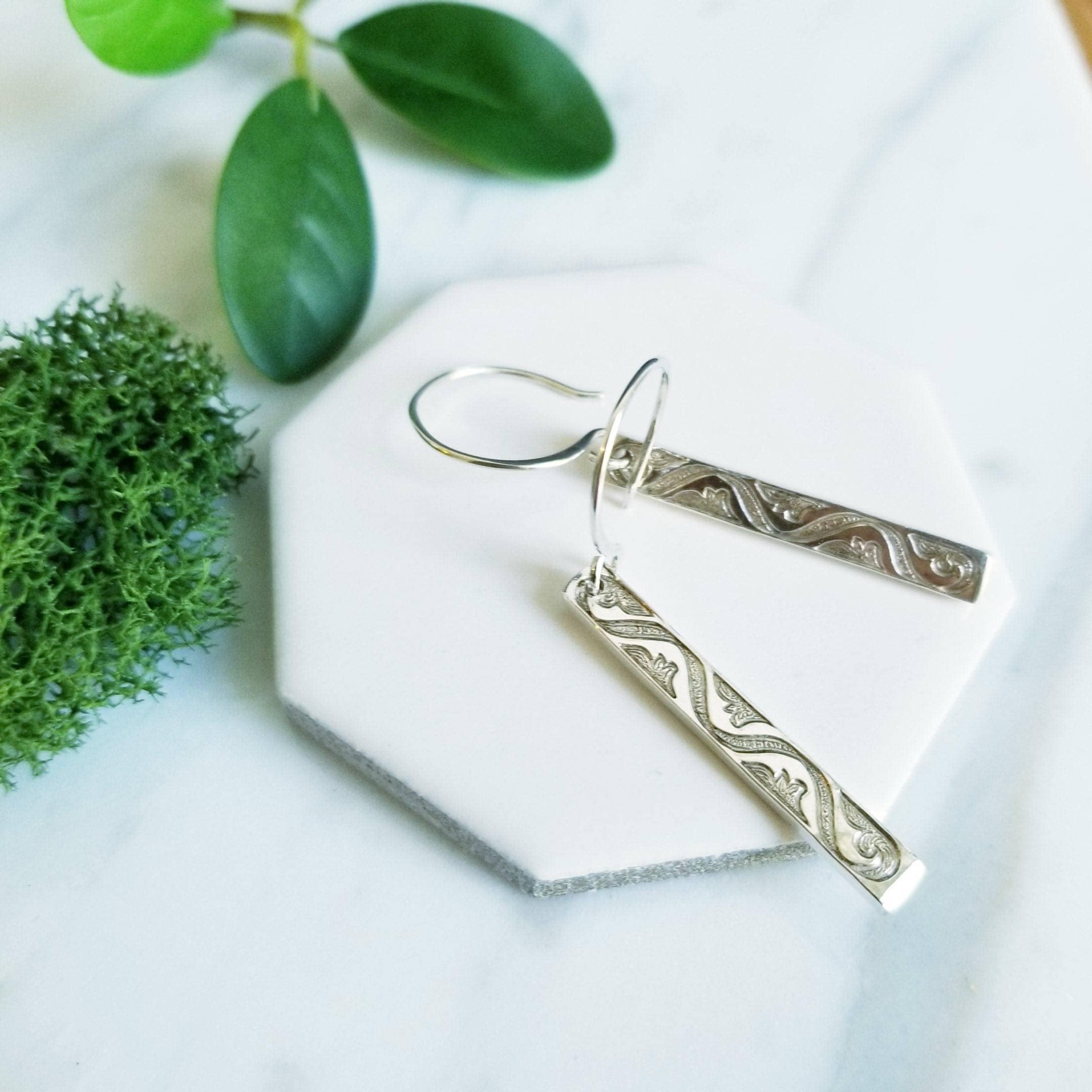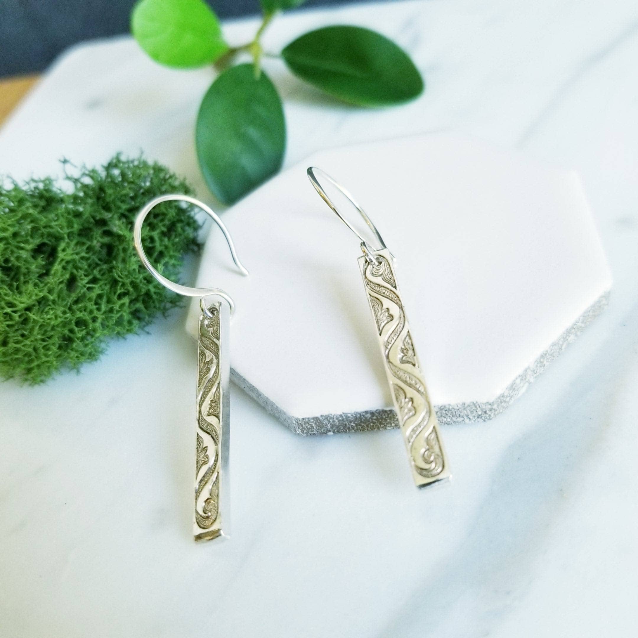 Sterling silver tabs are etched with a floral scroll design, suspended from sterling silver ear wires.