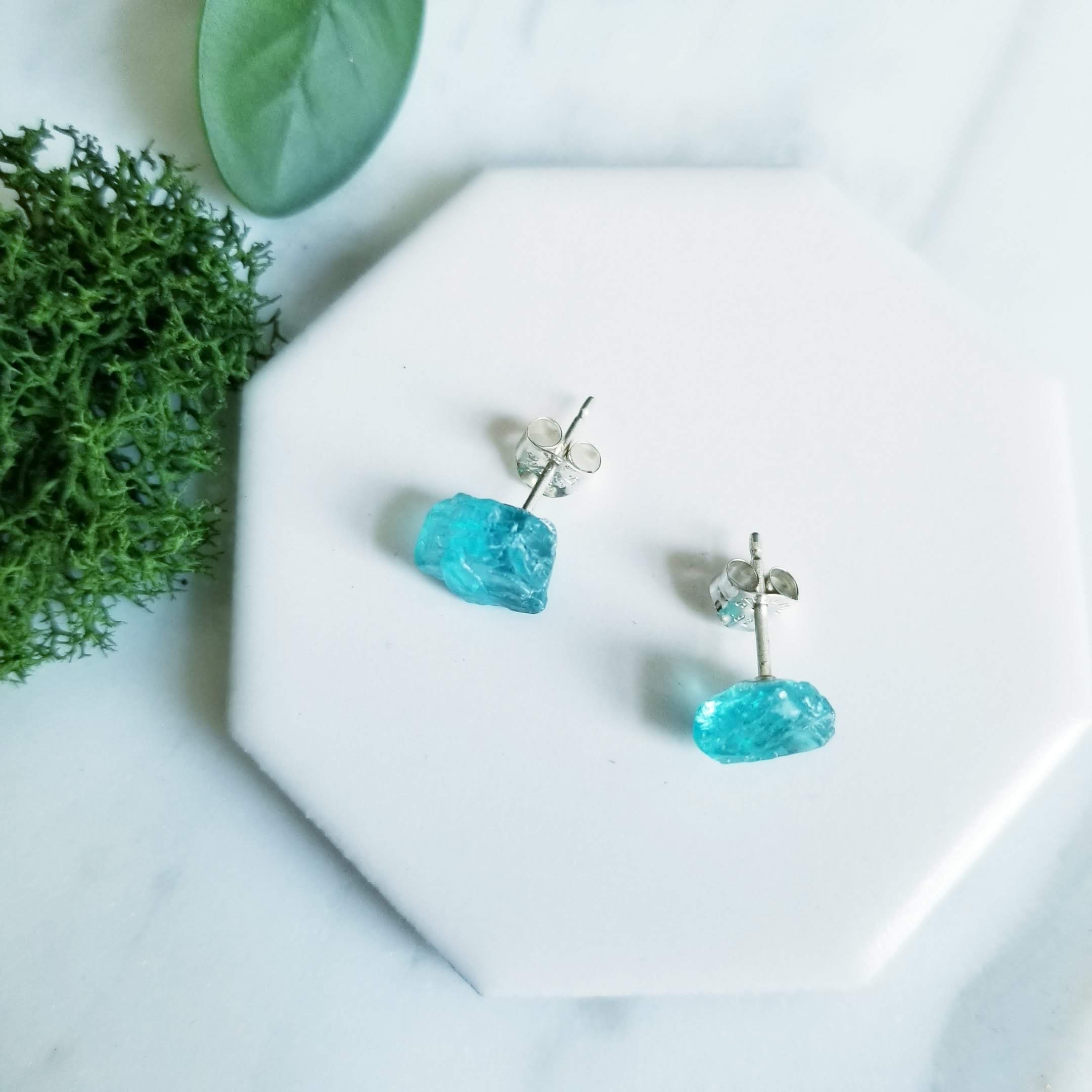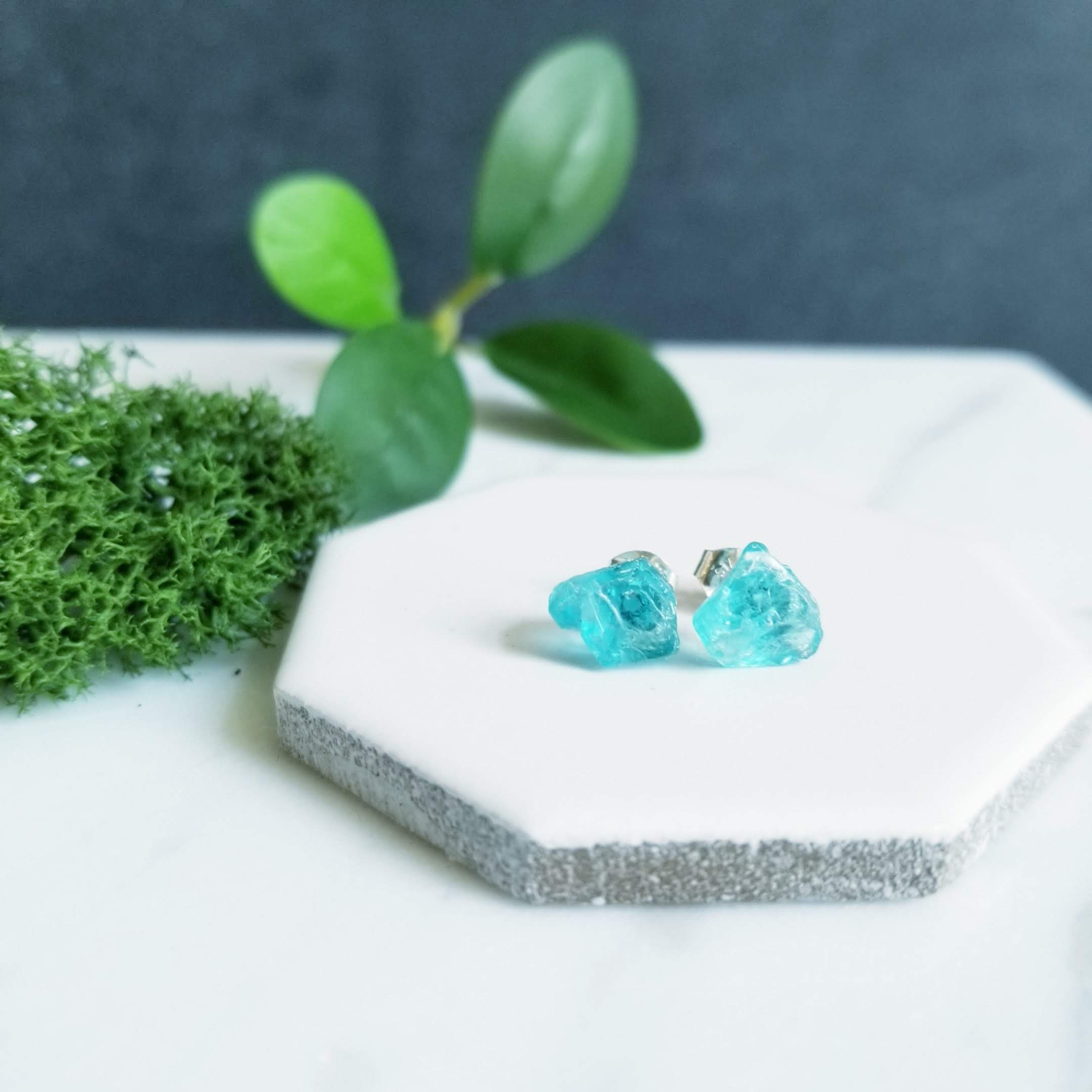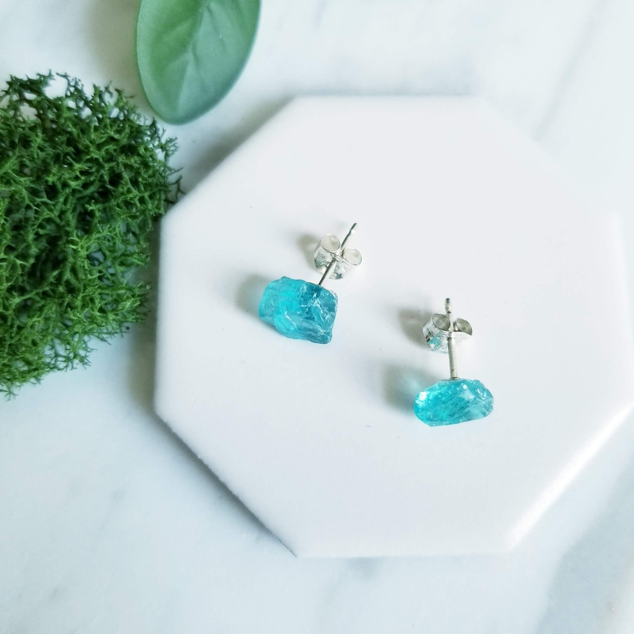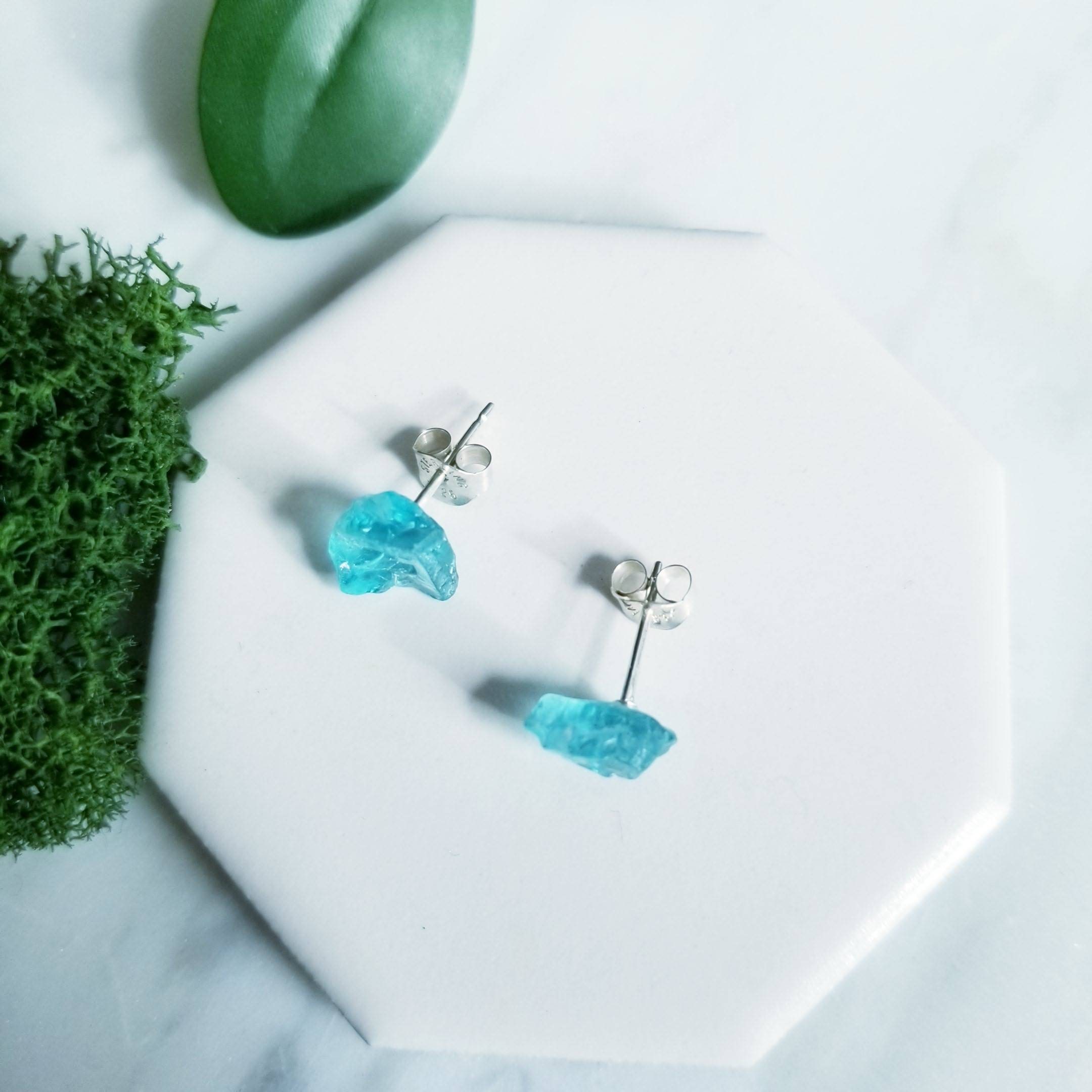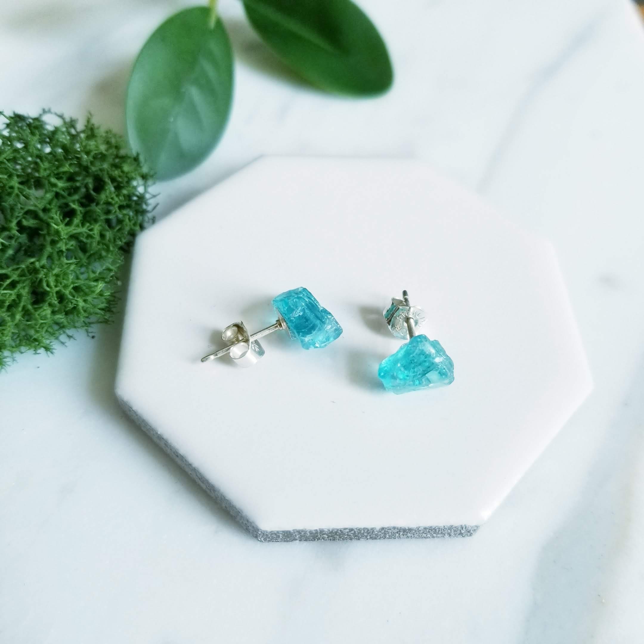 Rough, raw Blue Apatite are glued with jewelry grade cement to sterling silver ear posts to form gorgeous little post stud earrings.