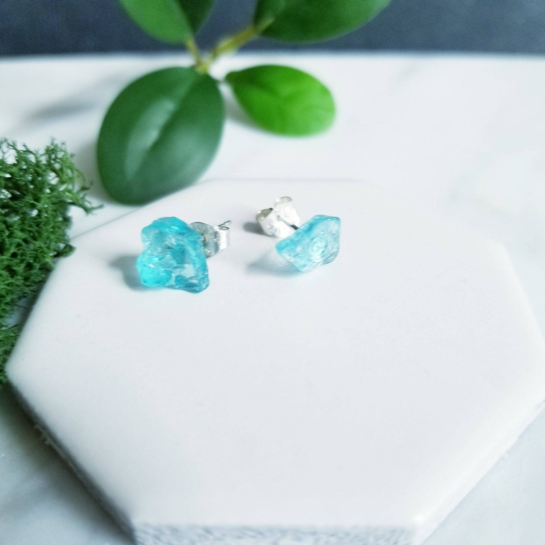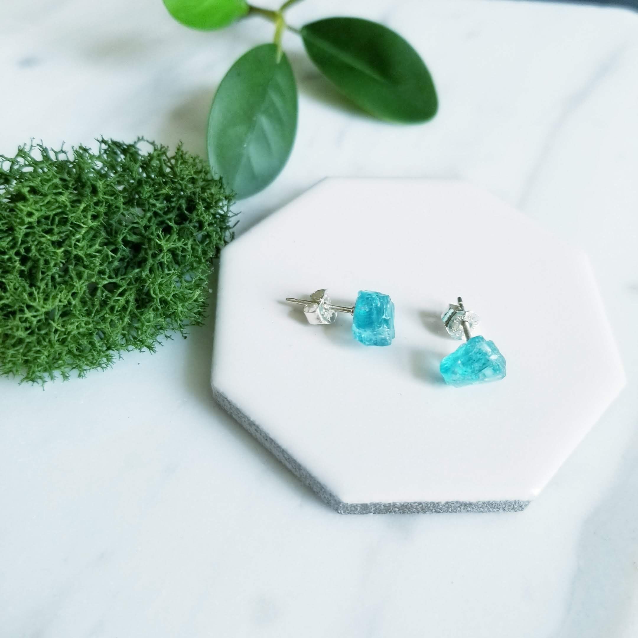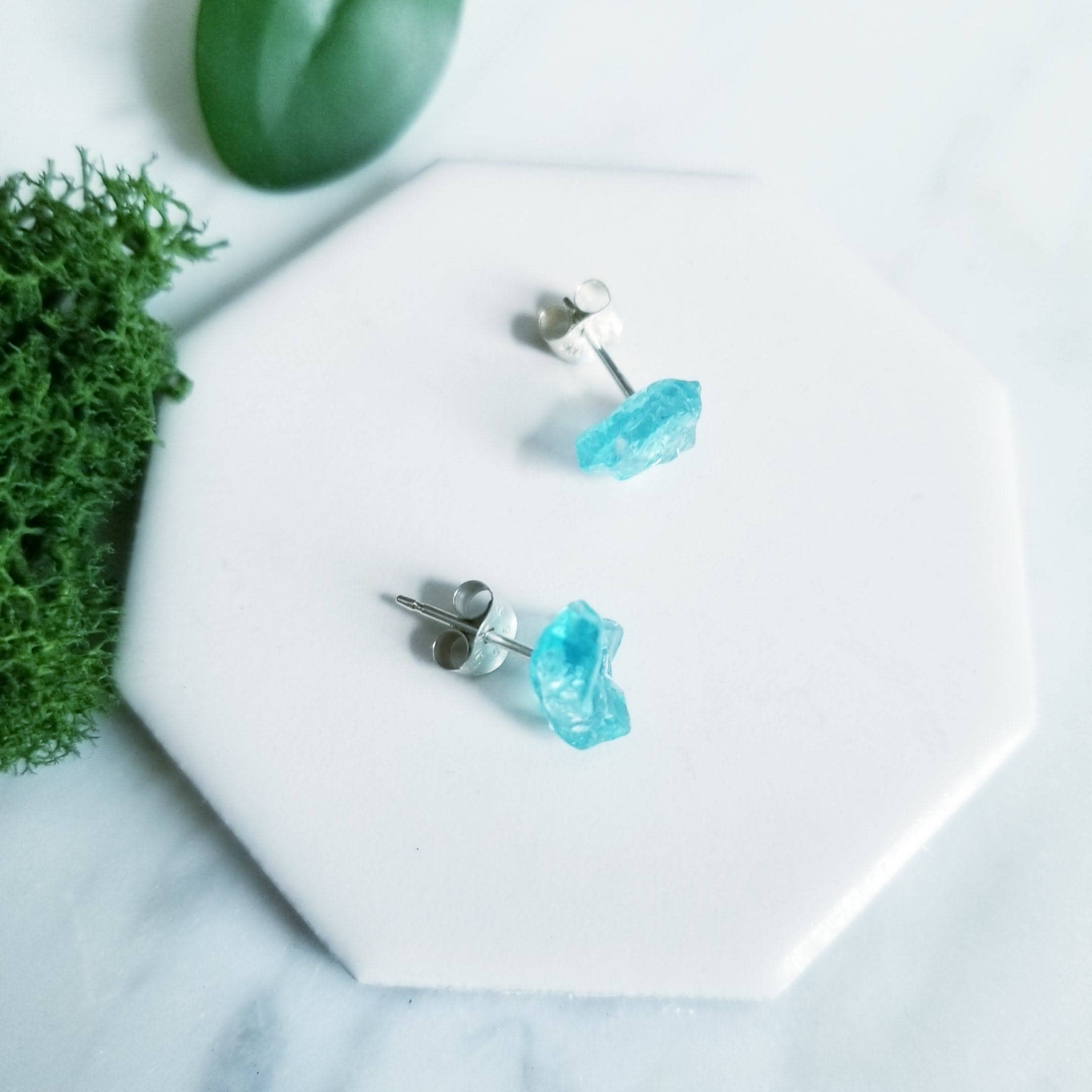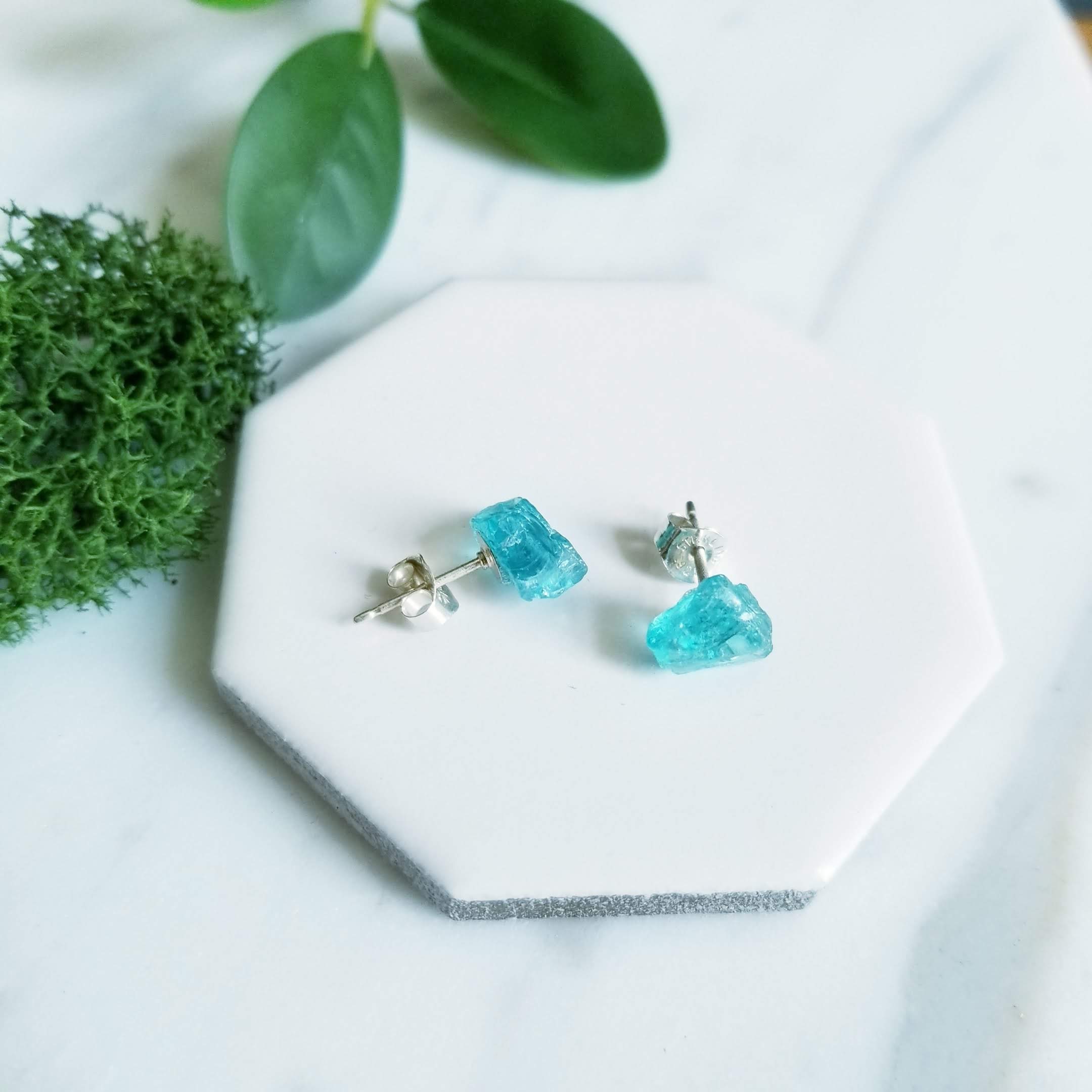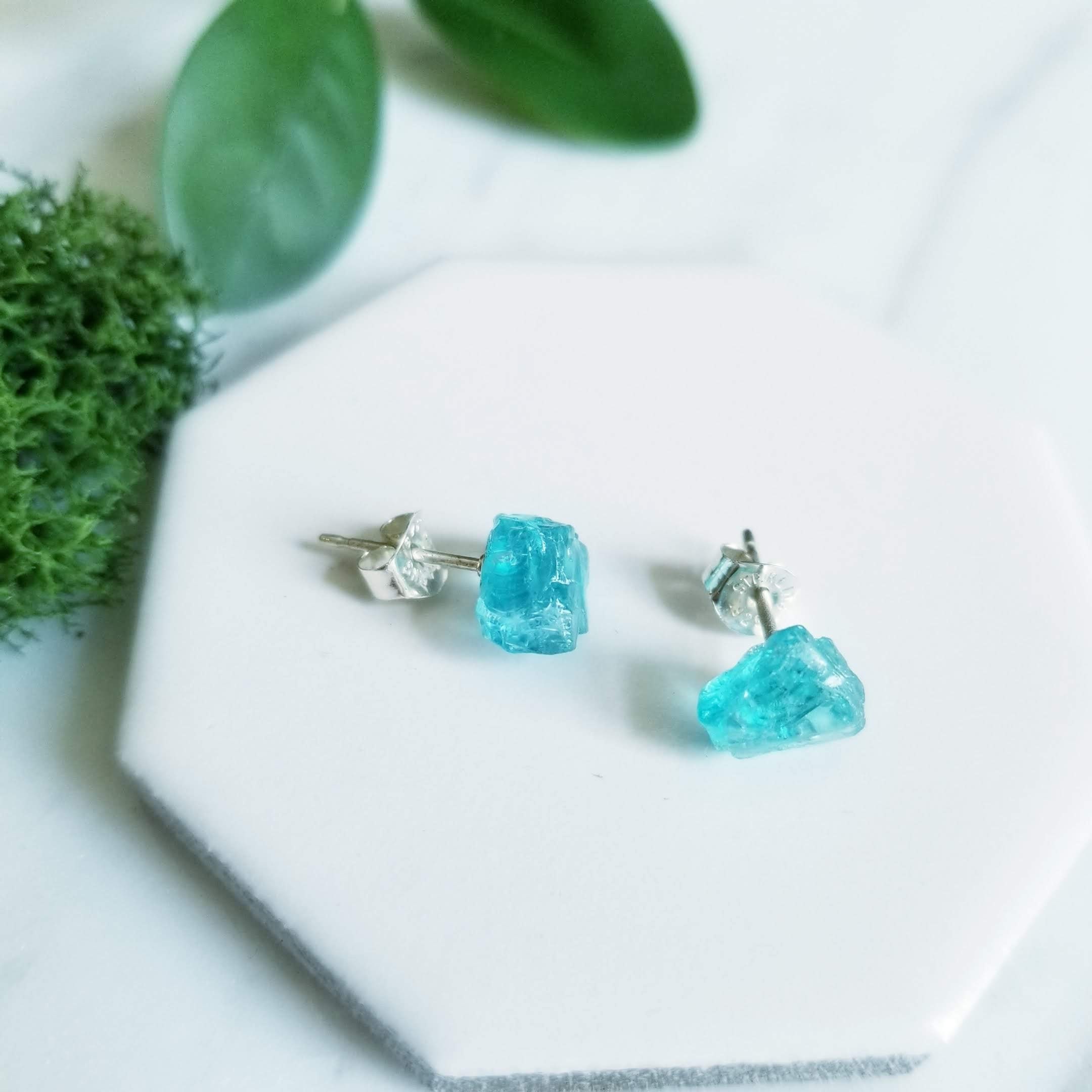 Rough, raw Blue Apatite are glued with jewelry grade cement to sterling silver ear posts to form gorgeous little post stud earrings.