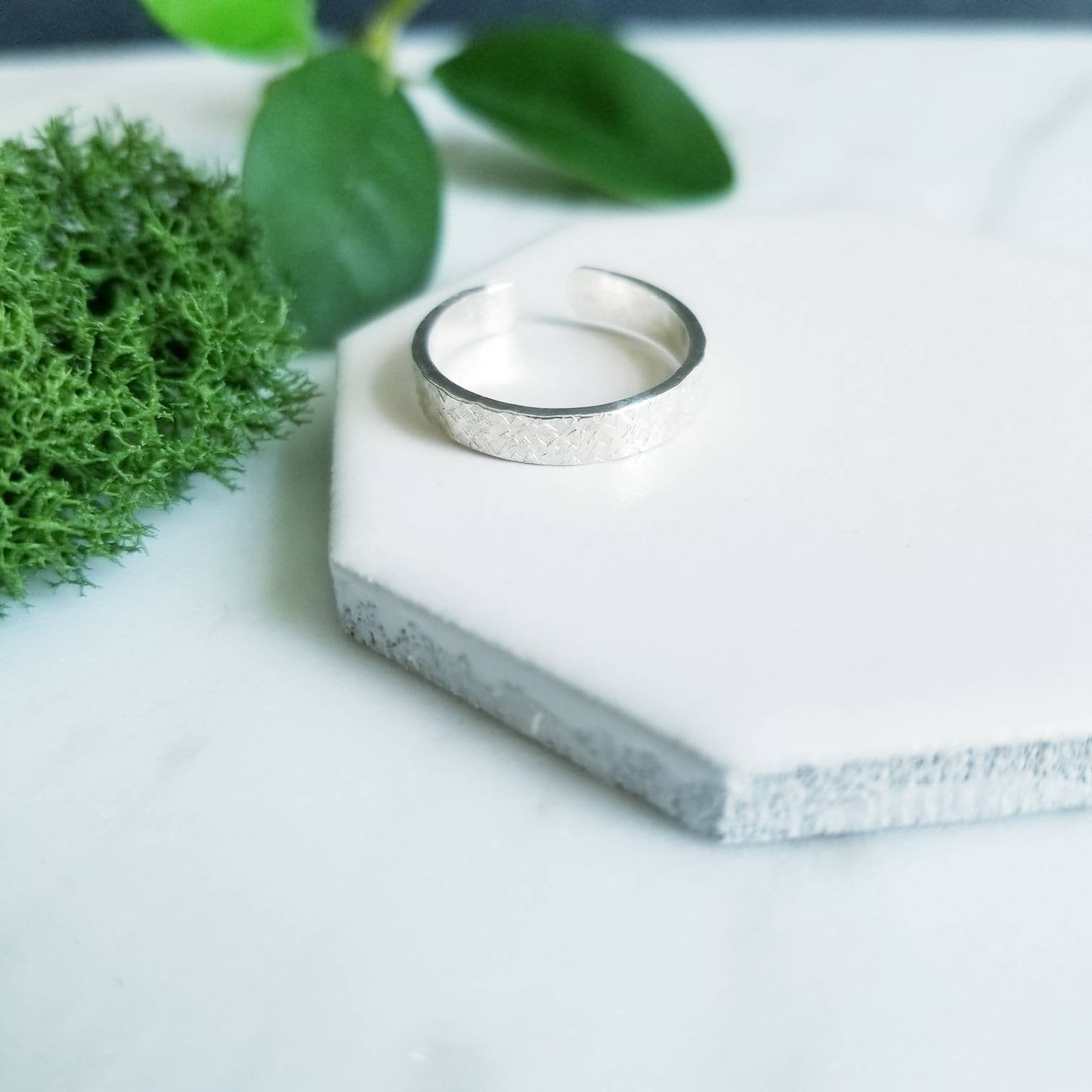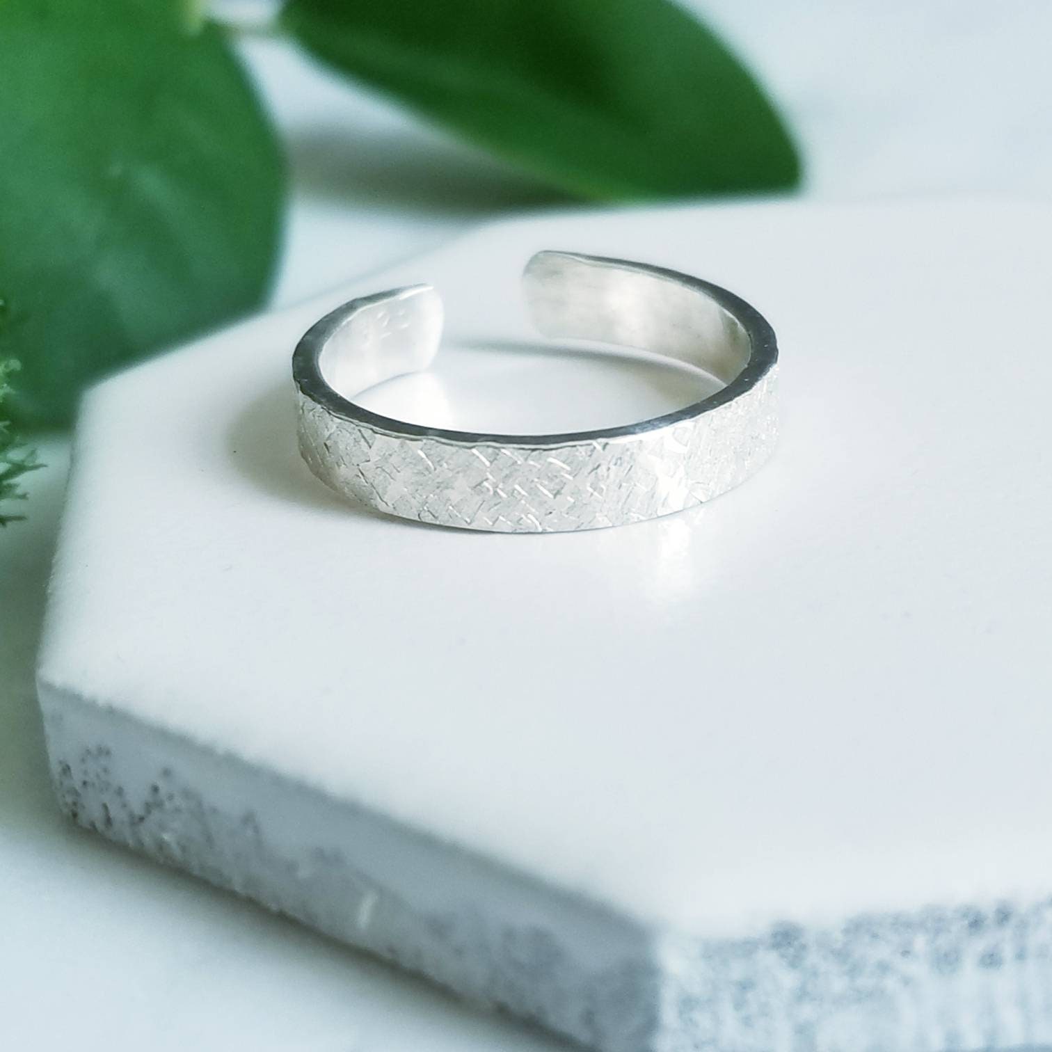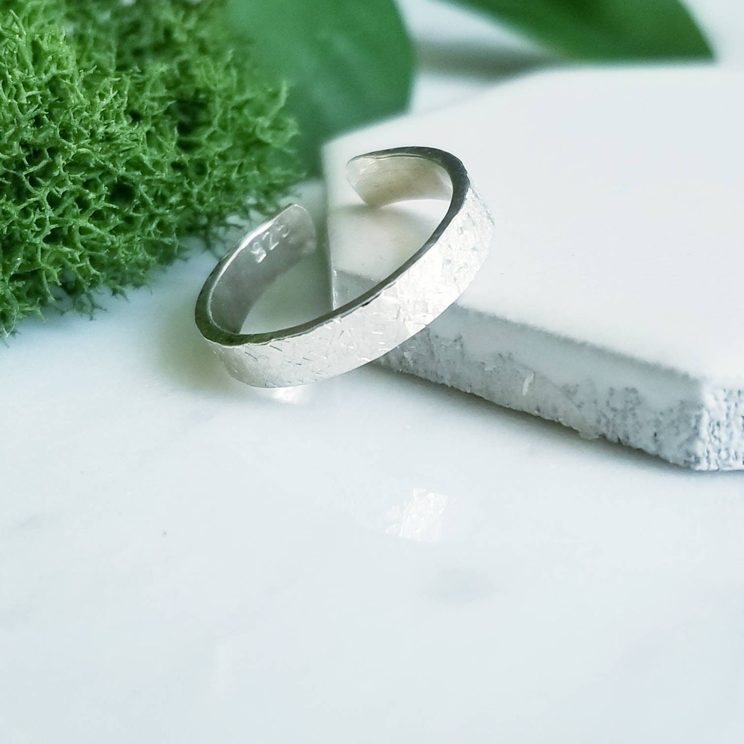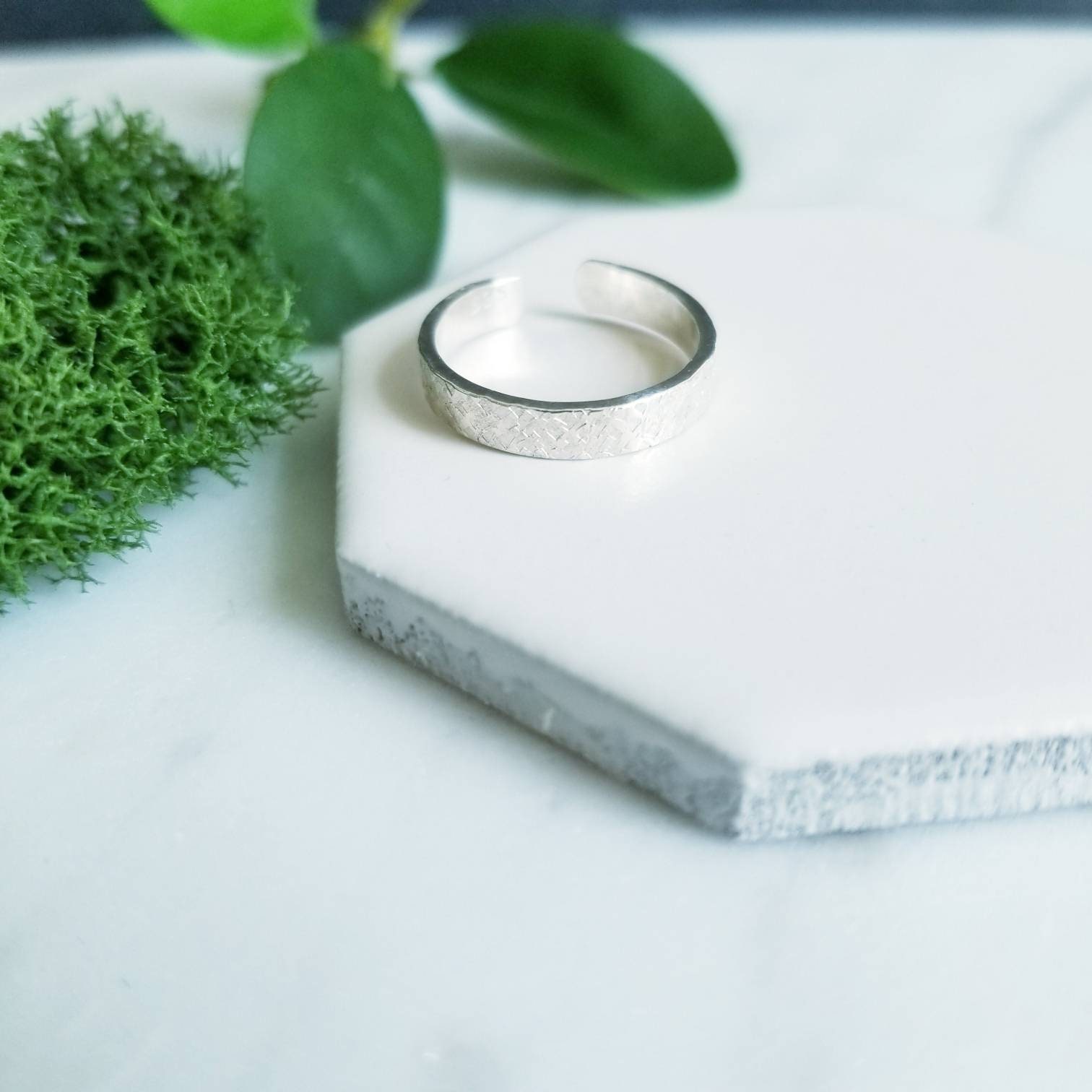 A silk texture finish comfortable toe ring in 3mm flat wire, polished smooth on the inside. Easily adjusted by gently squeezing it shut or gently expanding the wire.