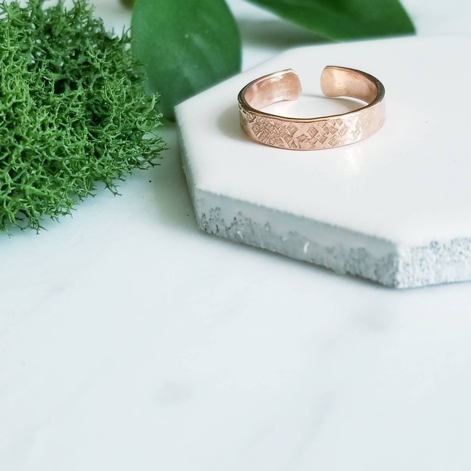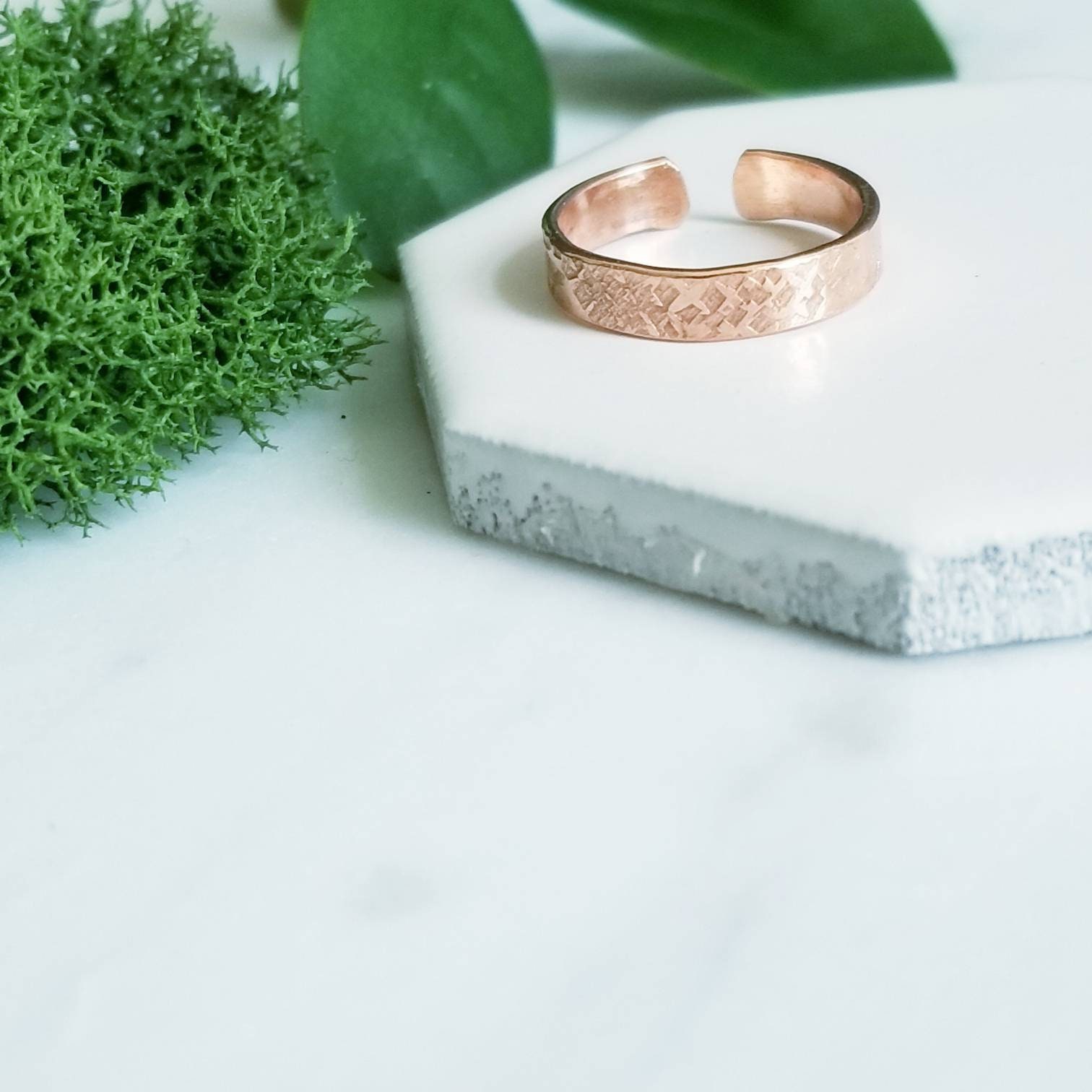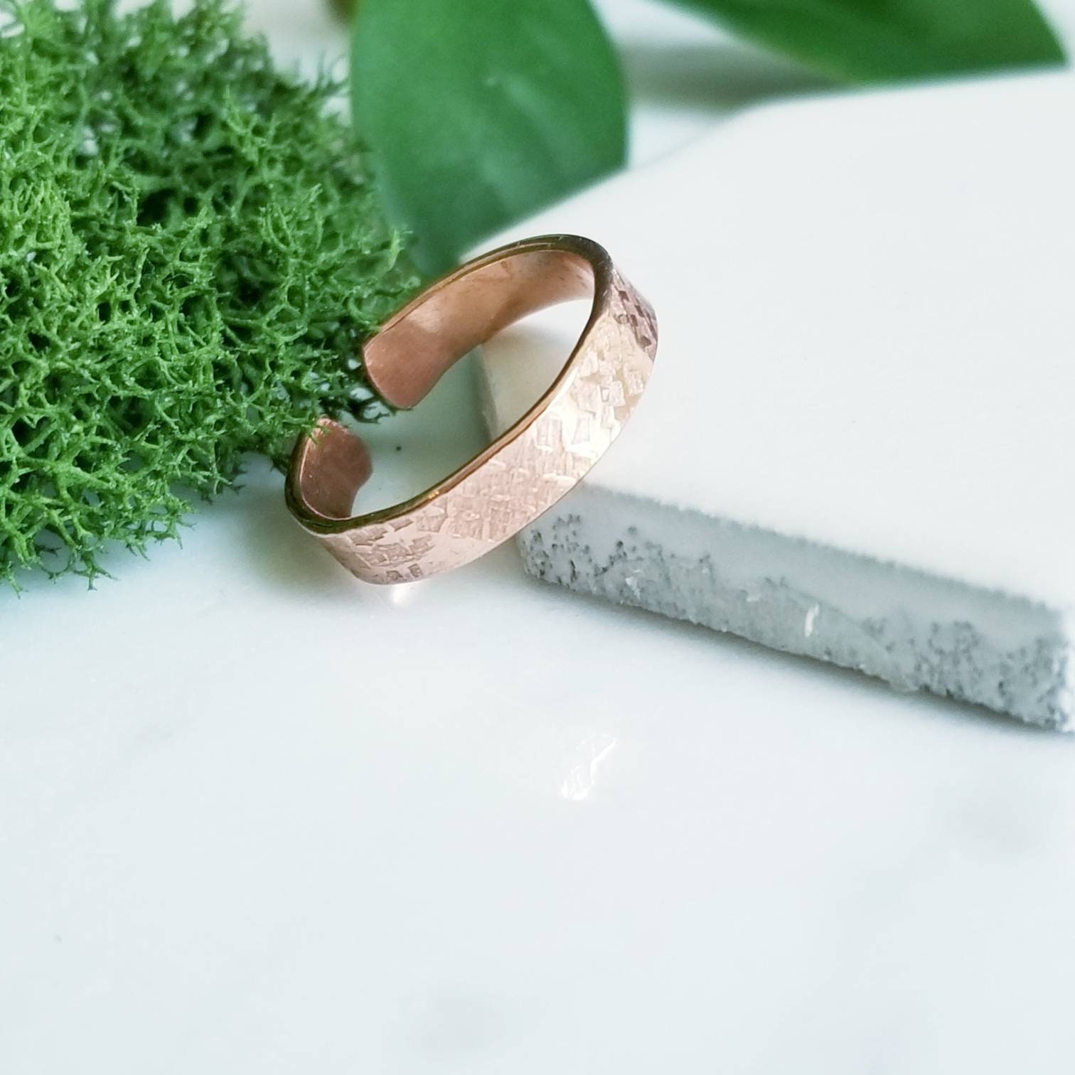 A smooth, comfortable ring in 3mm wide flat copper wire hammered with a silk texture.