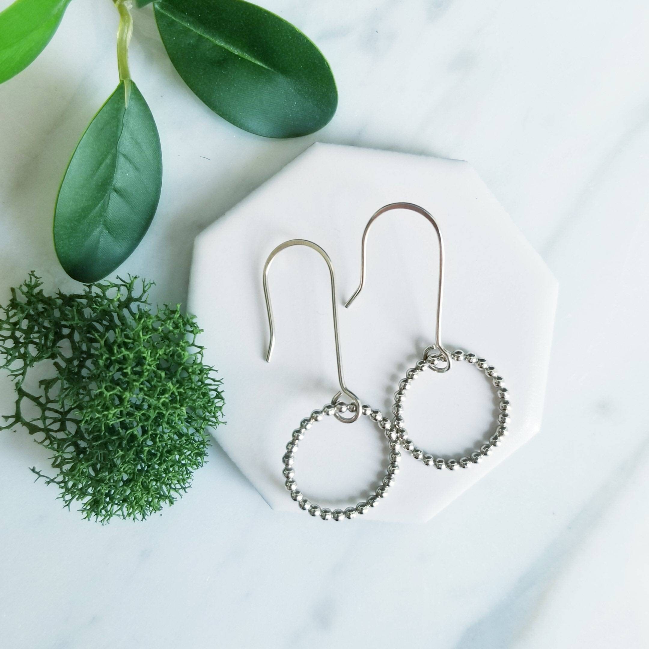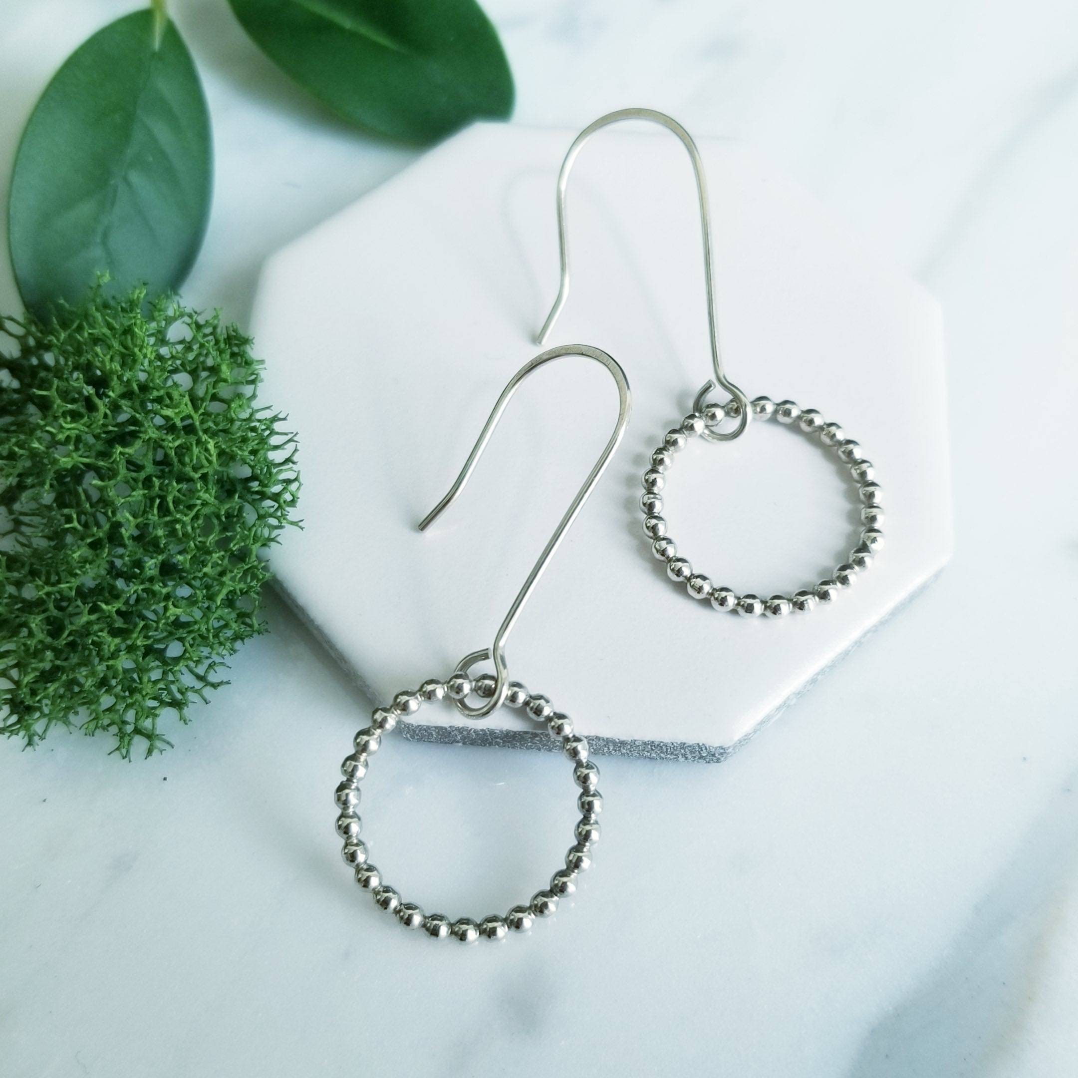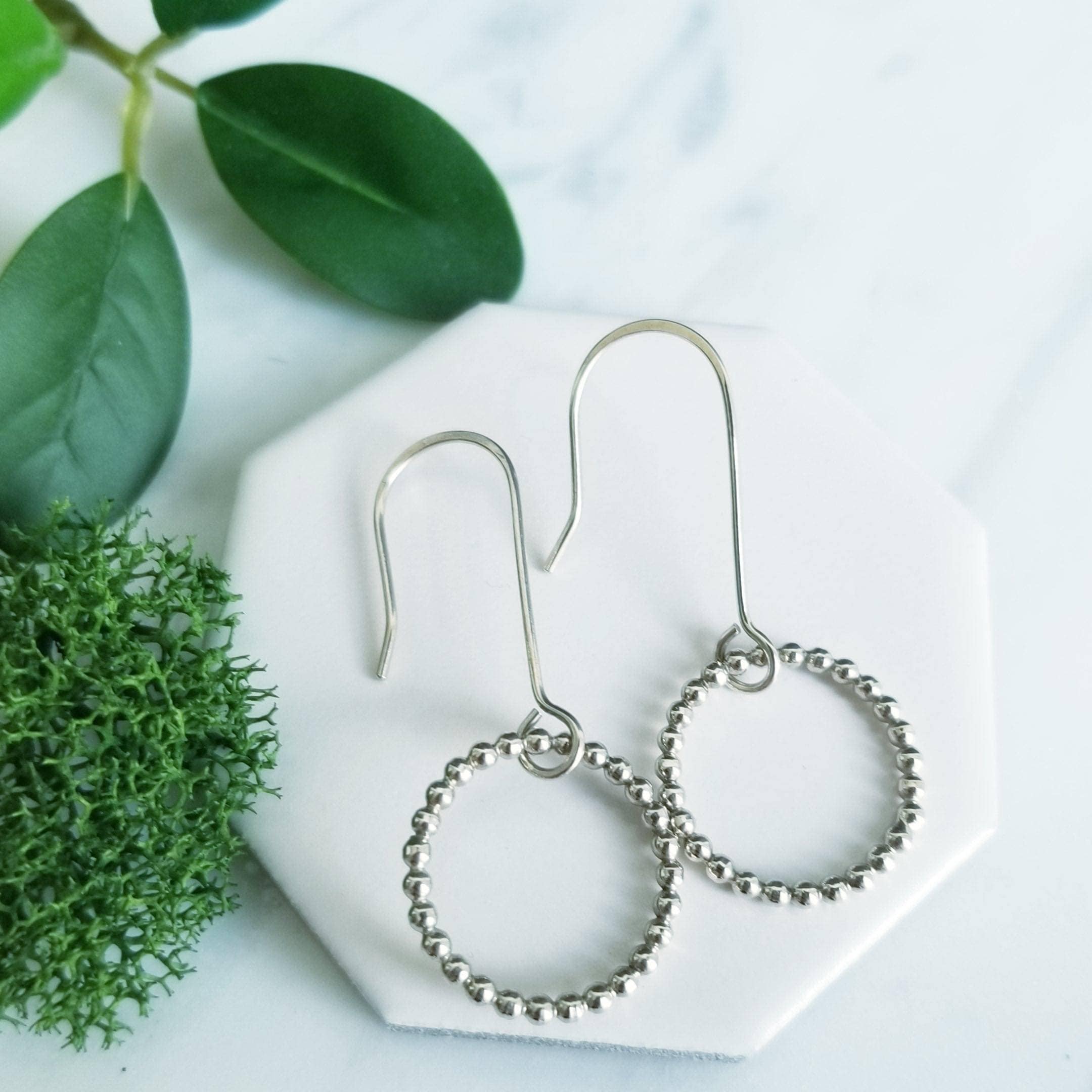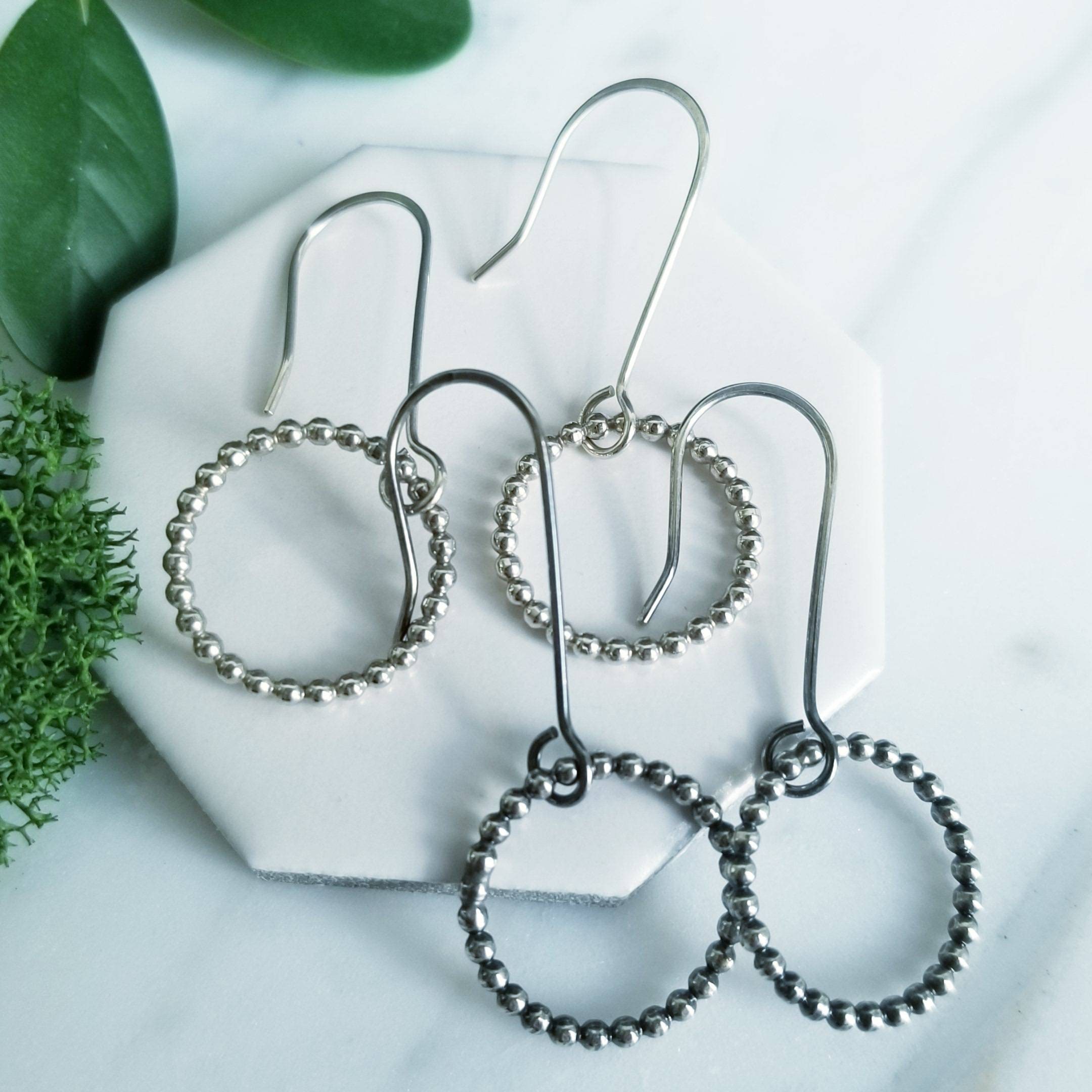 Your go-to earrings, simple circles of beaded sterling silver suspended on sterling silver earwires.