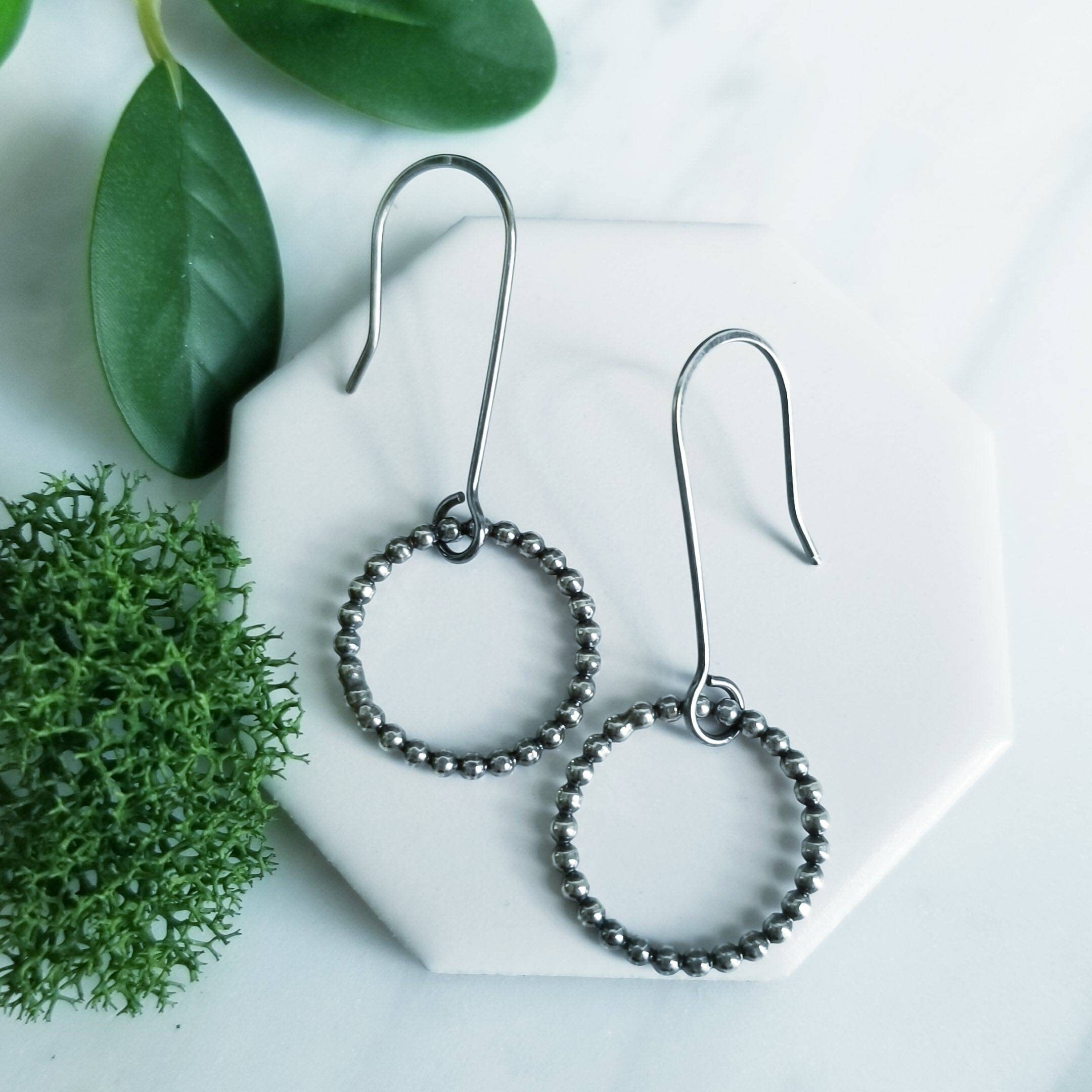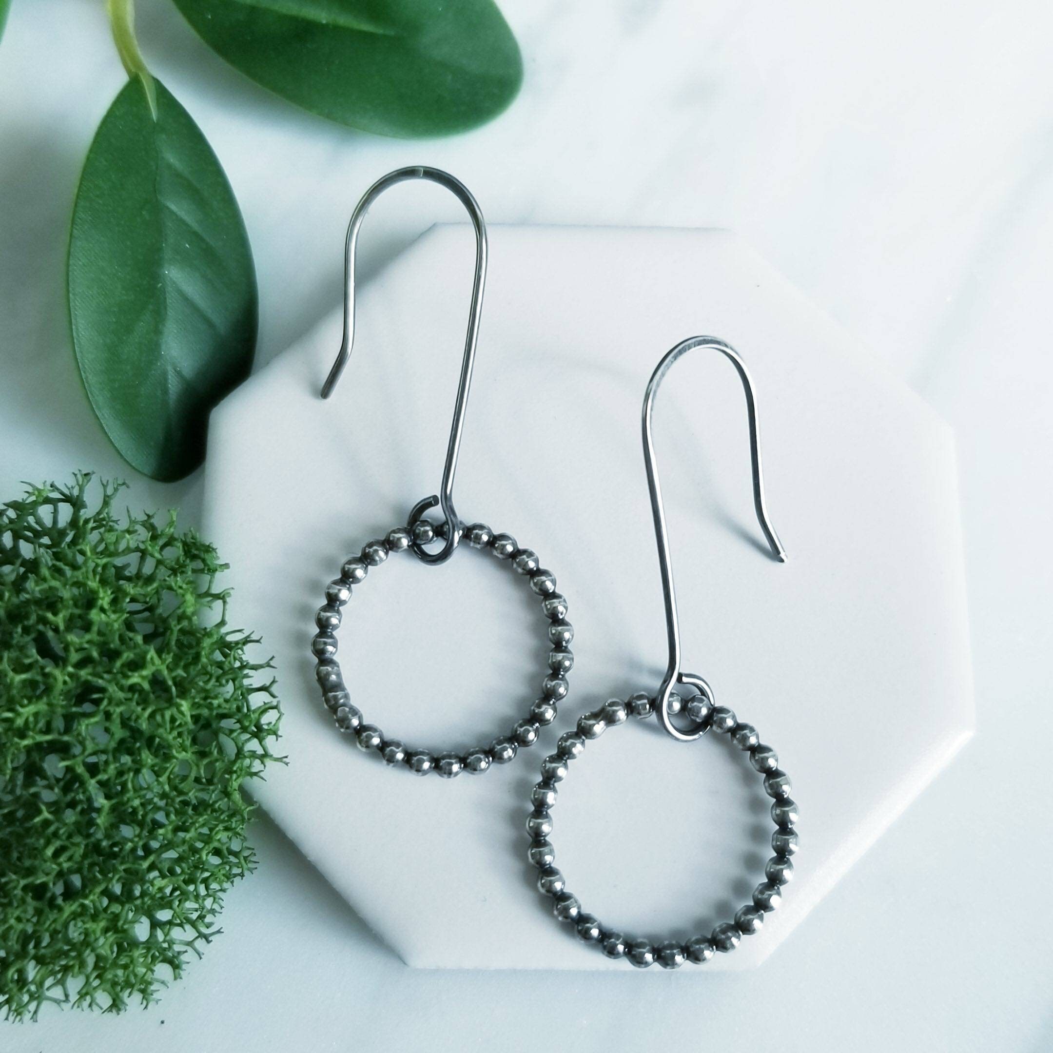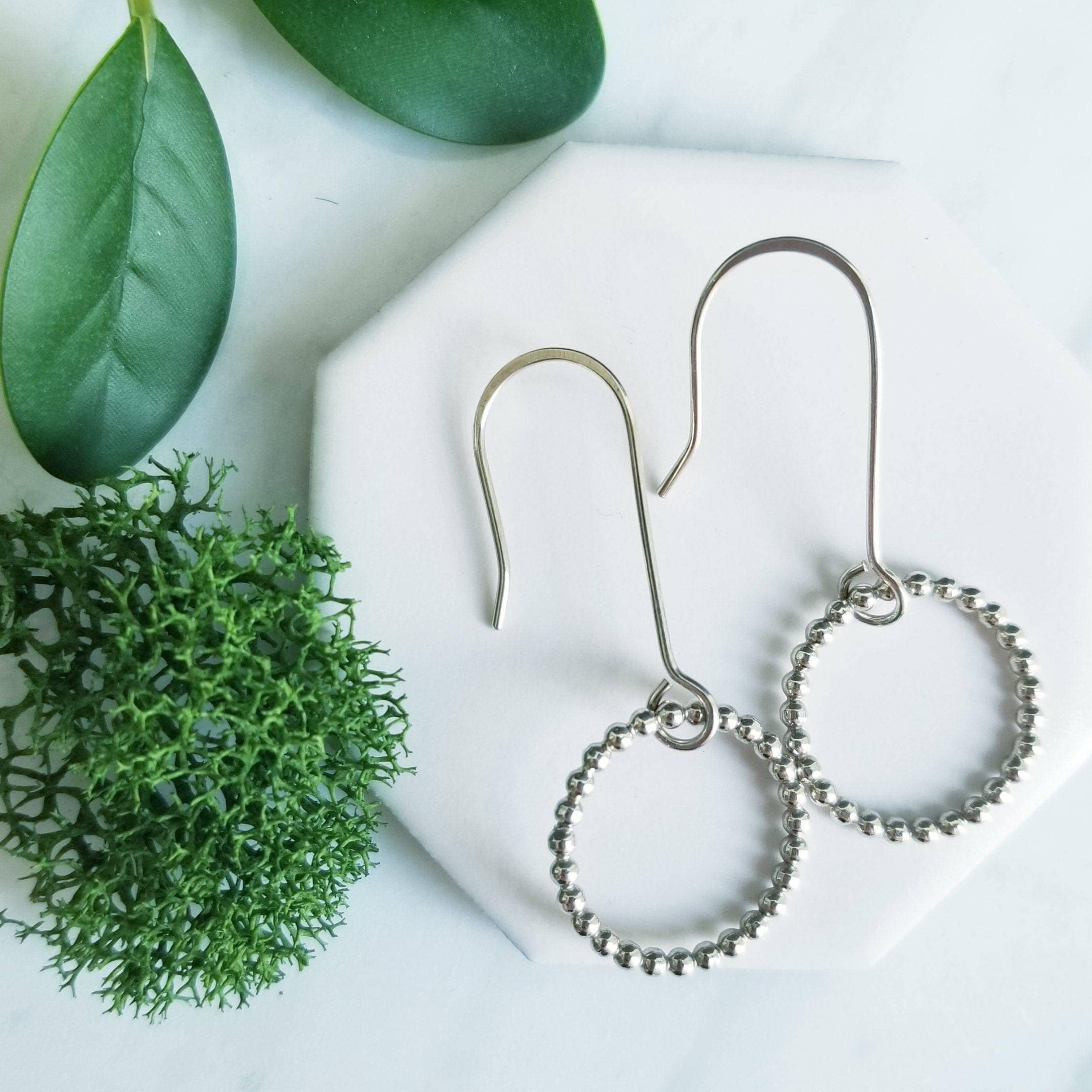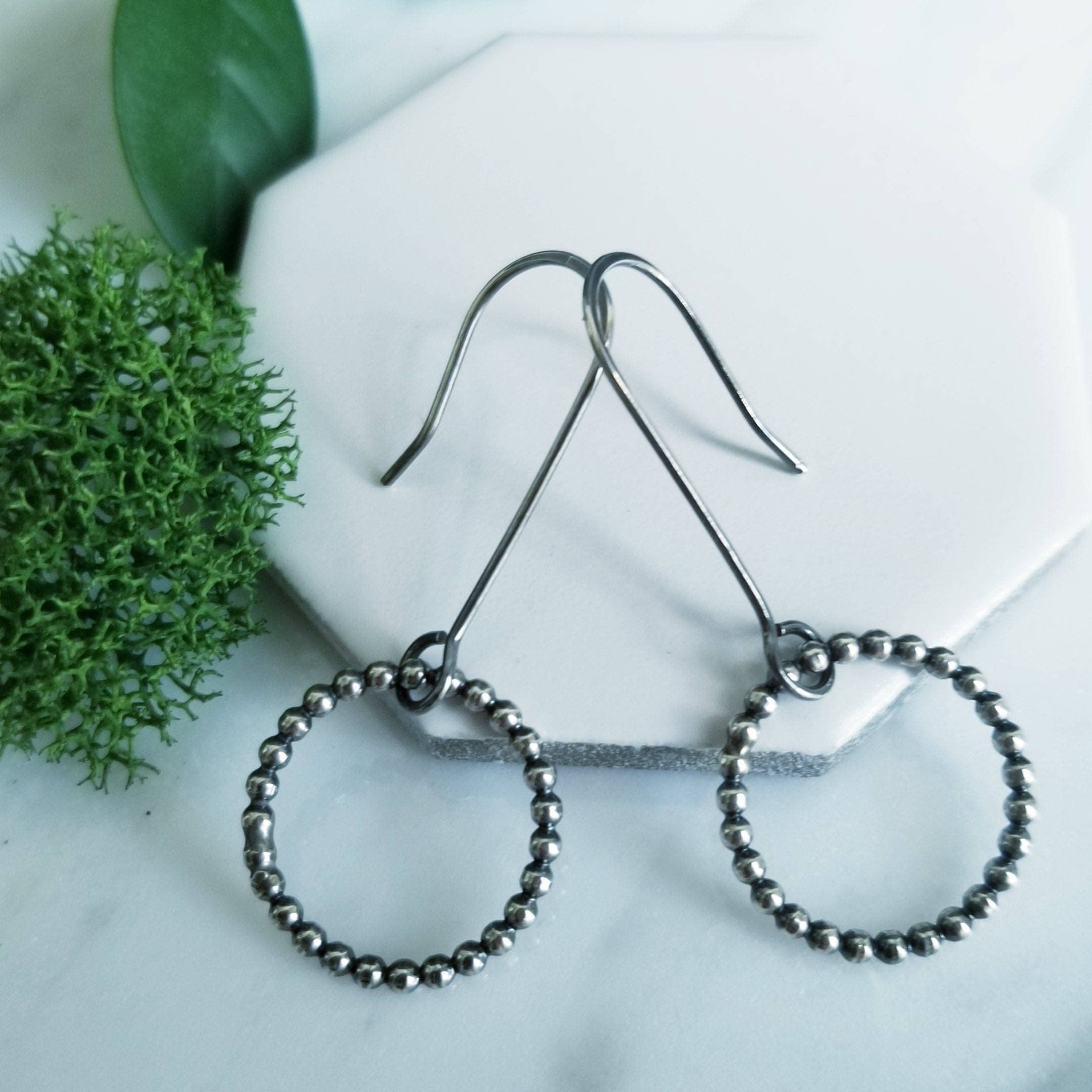 Your go-to earrings, simple circles of beaded sterling silver suspended on sterling silver earwires.
