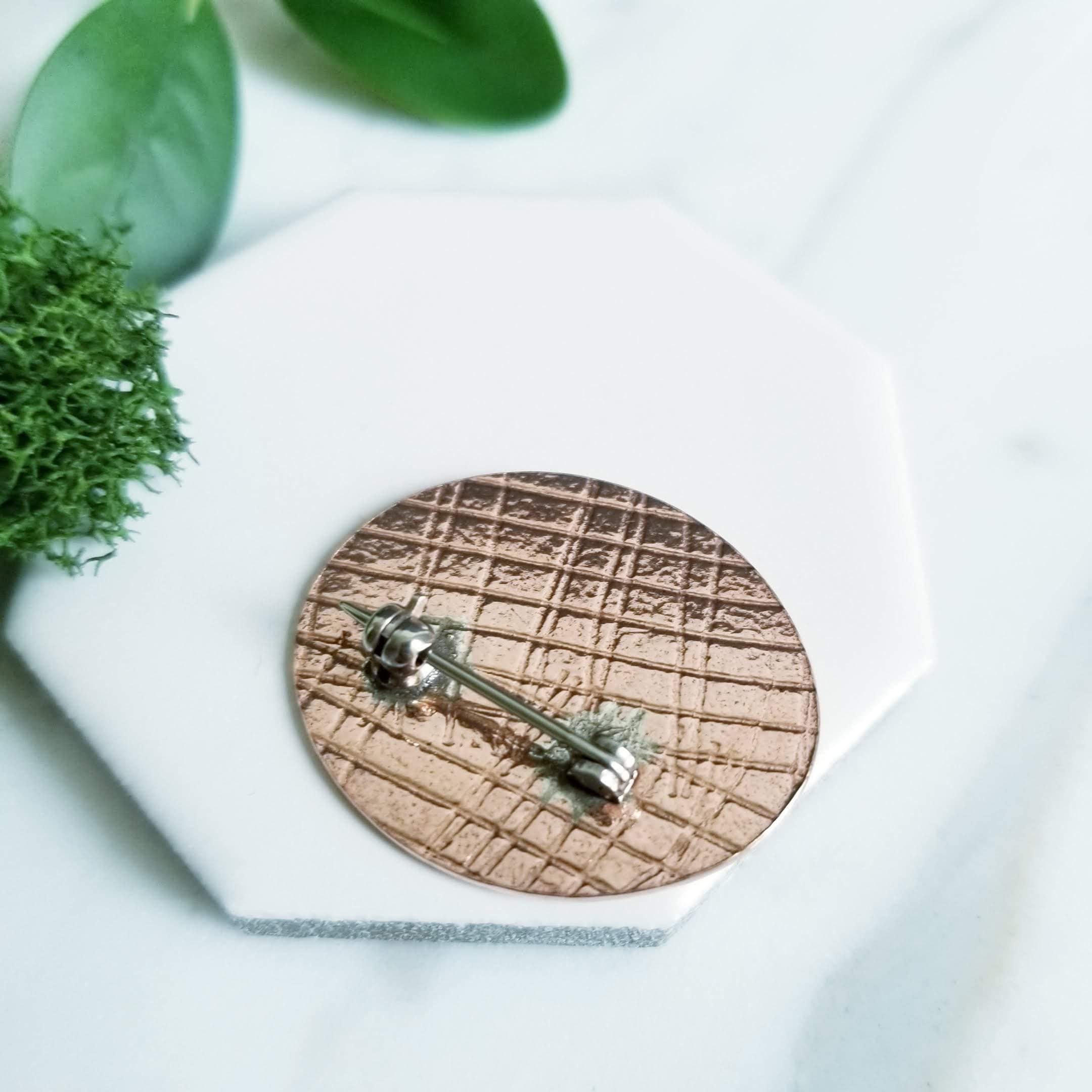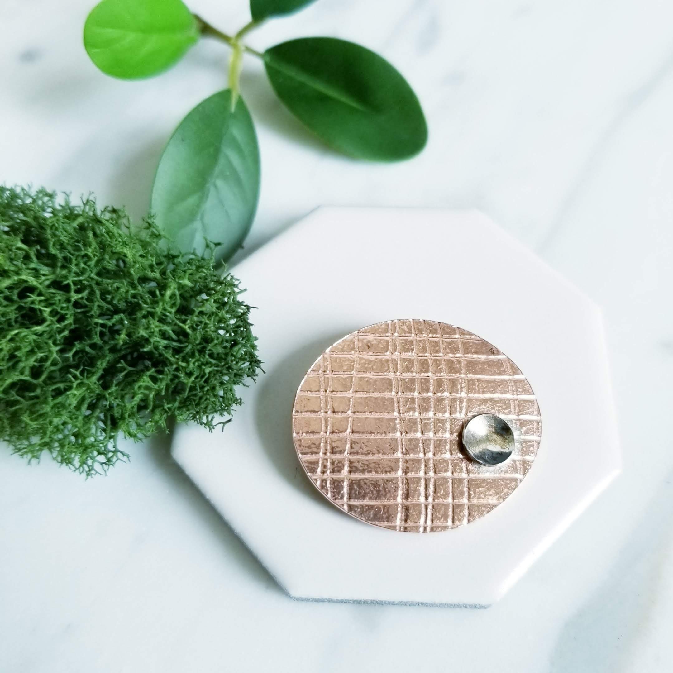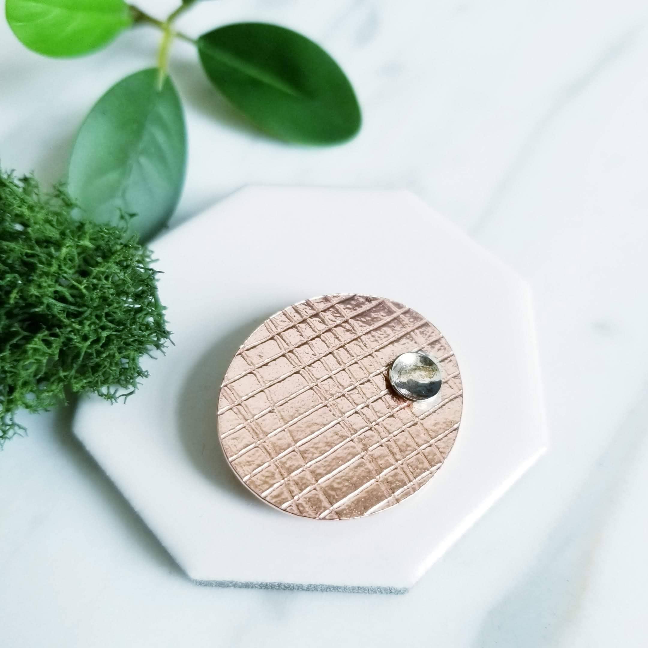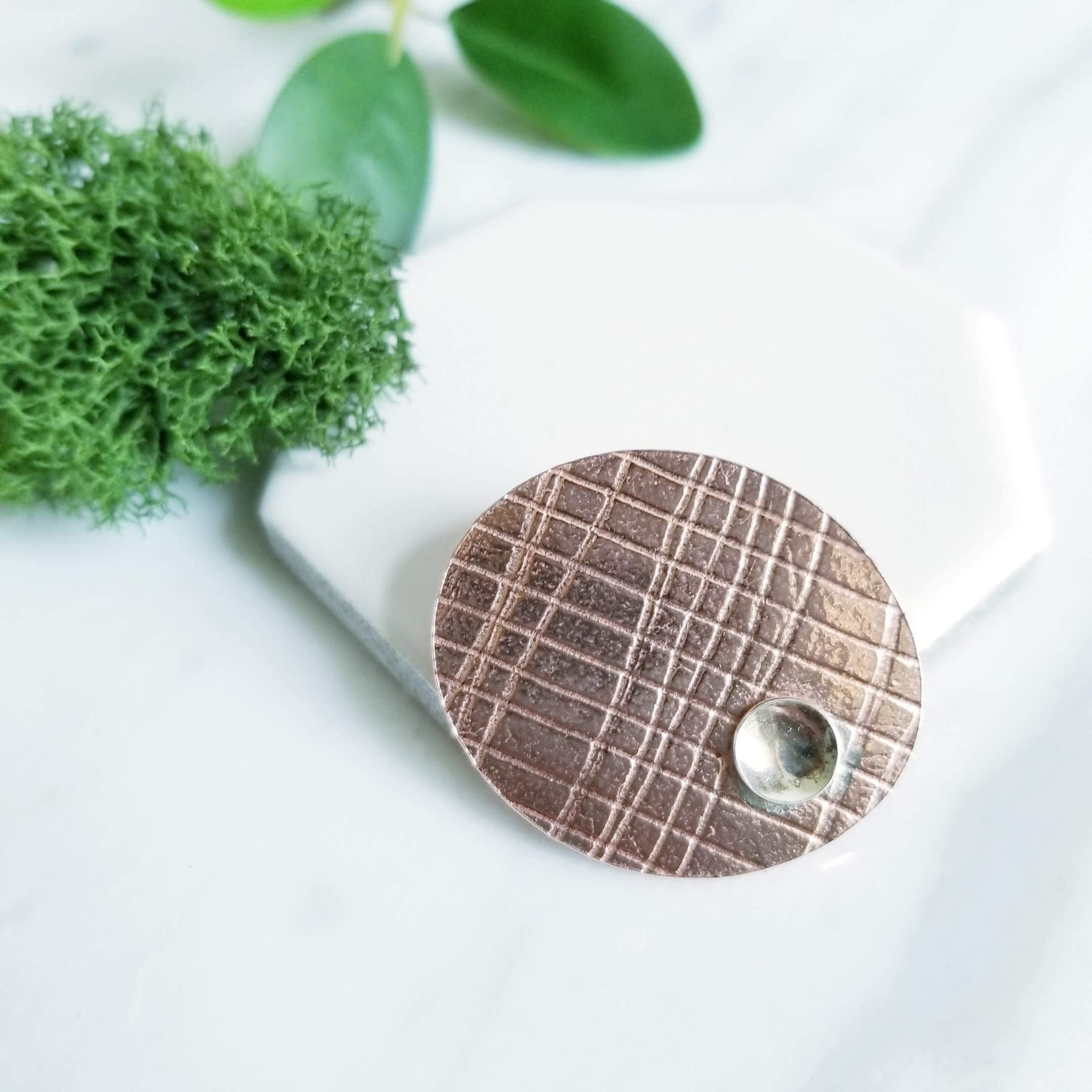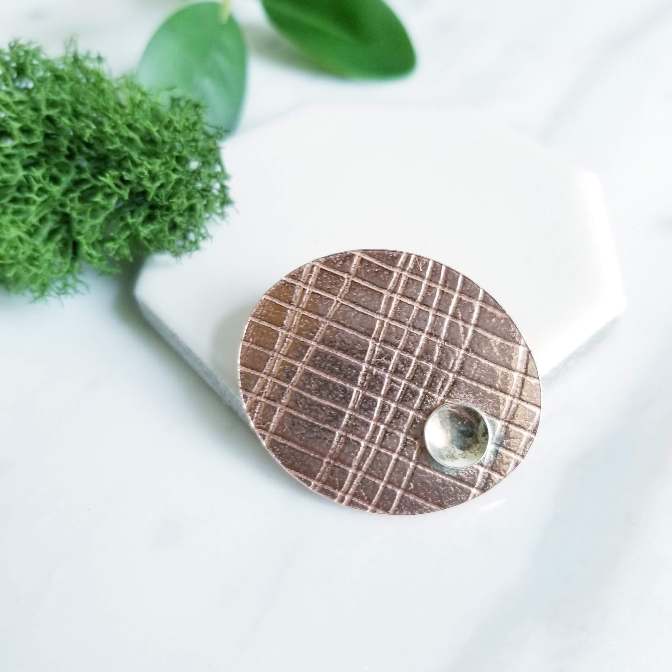 Abstract embossed copper oval brooch, I've soldered a small dish shaped sterling silver to one side of the oval copper. Embossed with the imprint of mesh paper.