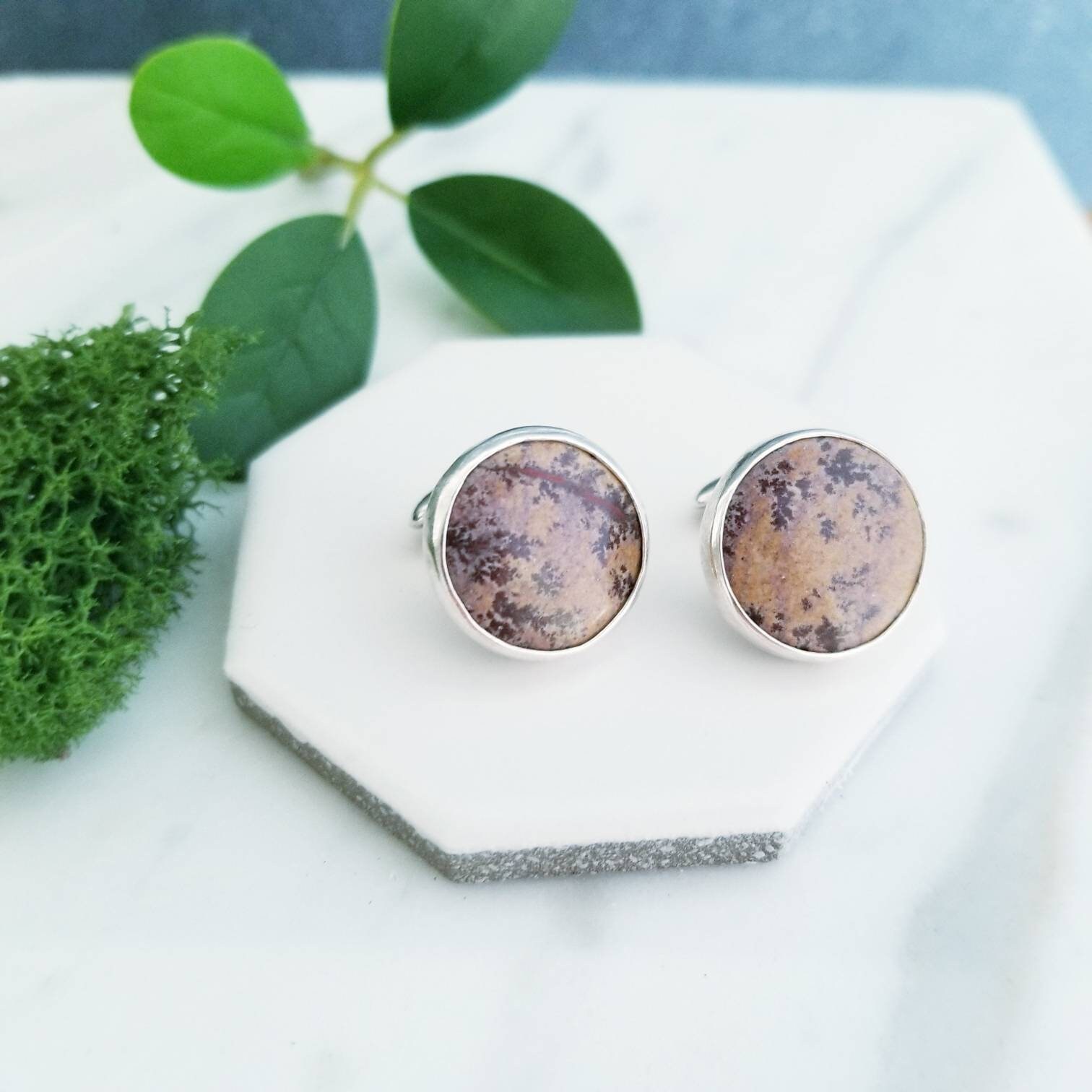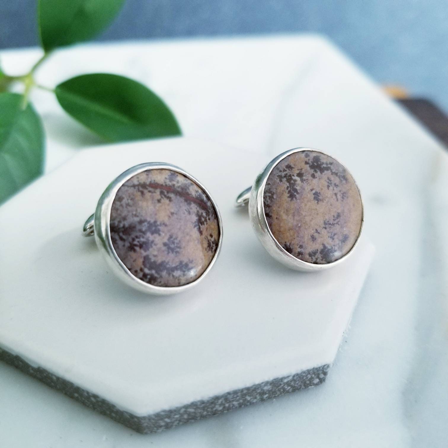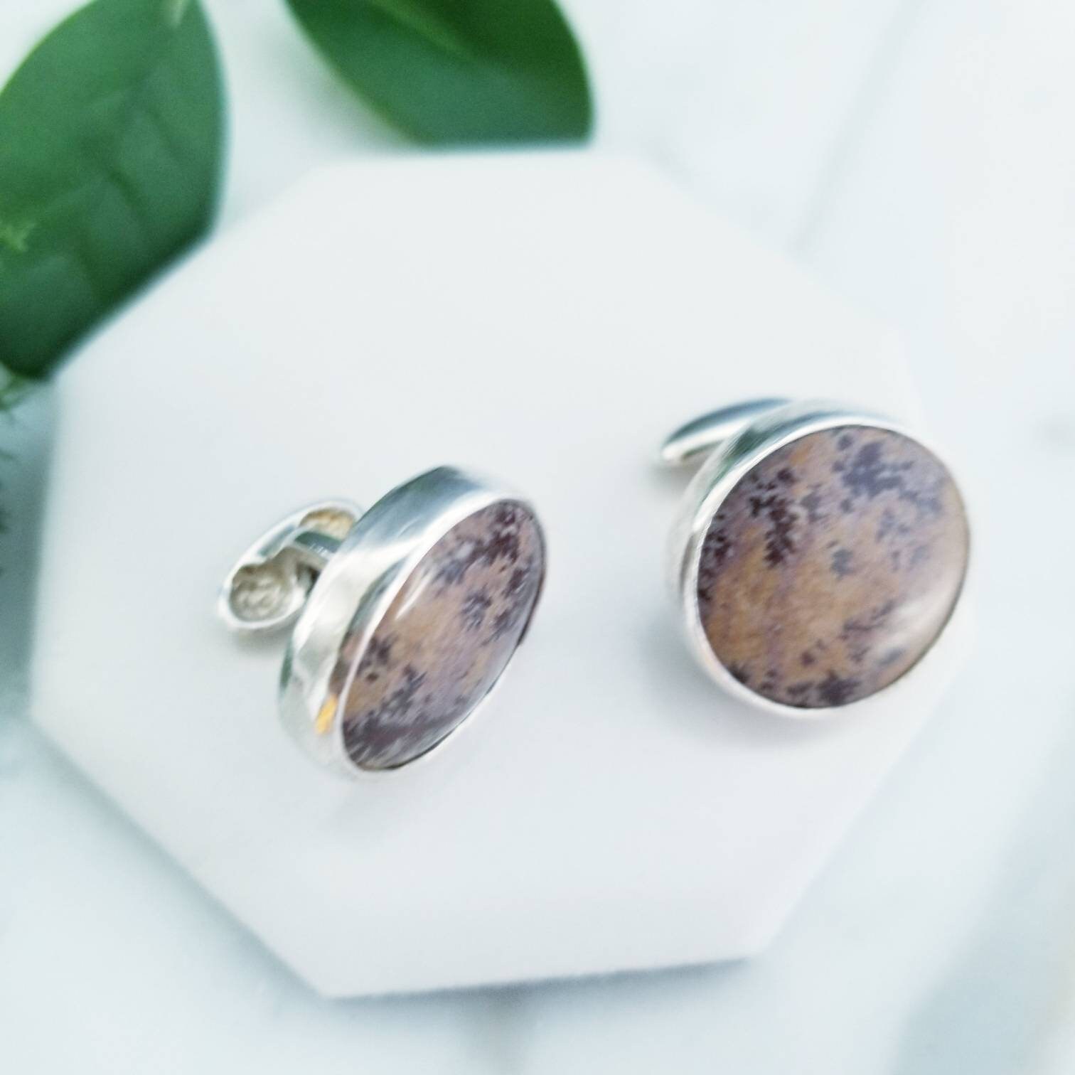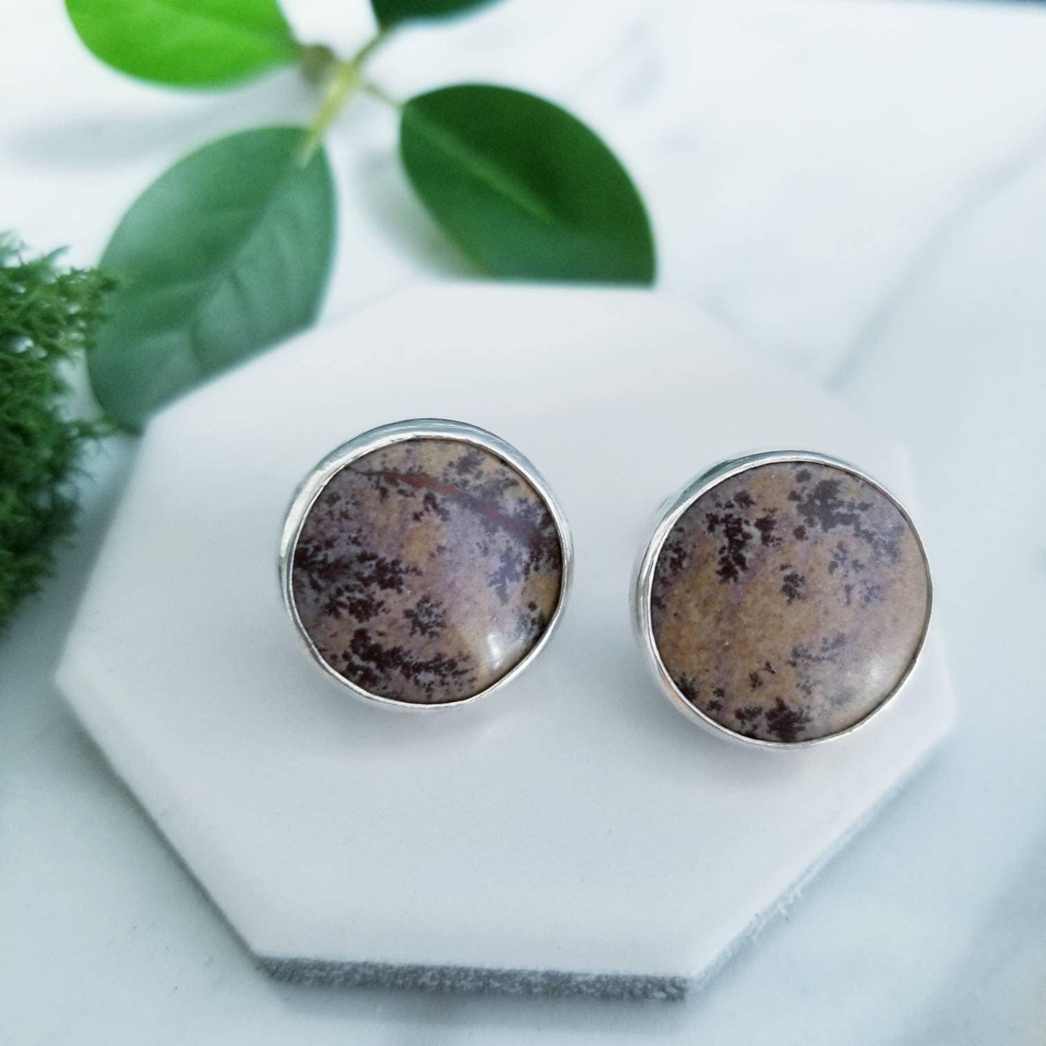 Beautiful stones from Mexico are set in fine & sterling silver. The round stones are in shades of deep tan & chocolate brown. The stones are 15mm across and the sterling silver is given a brushed finish.