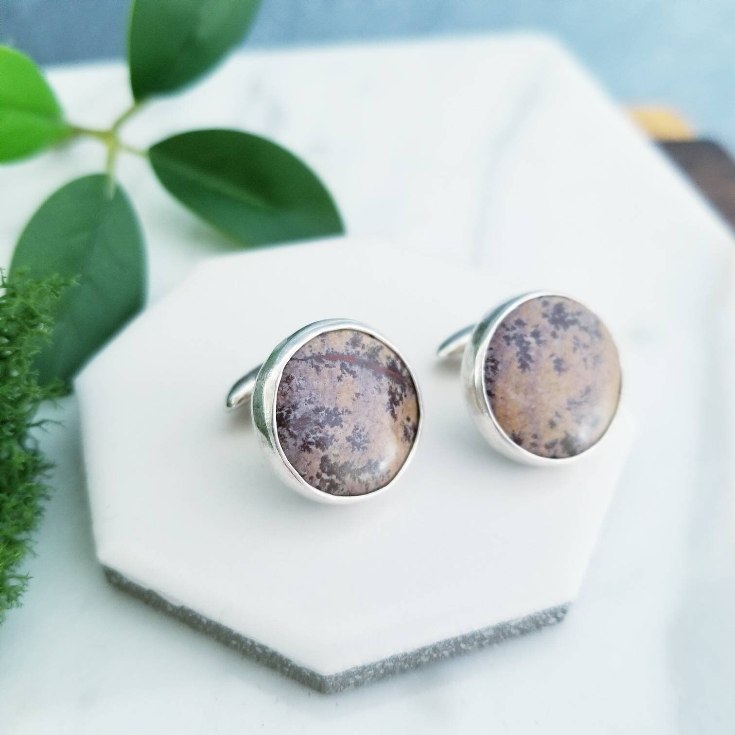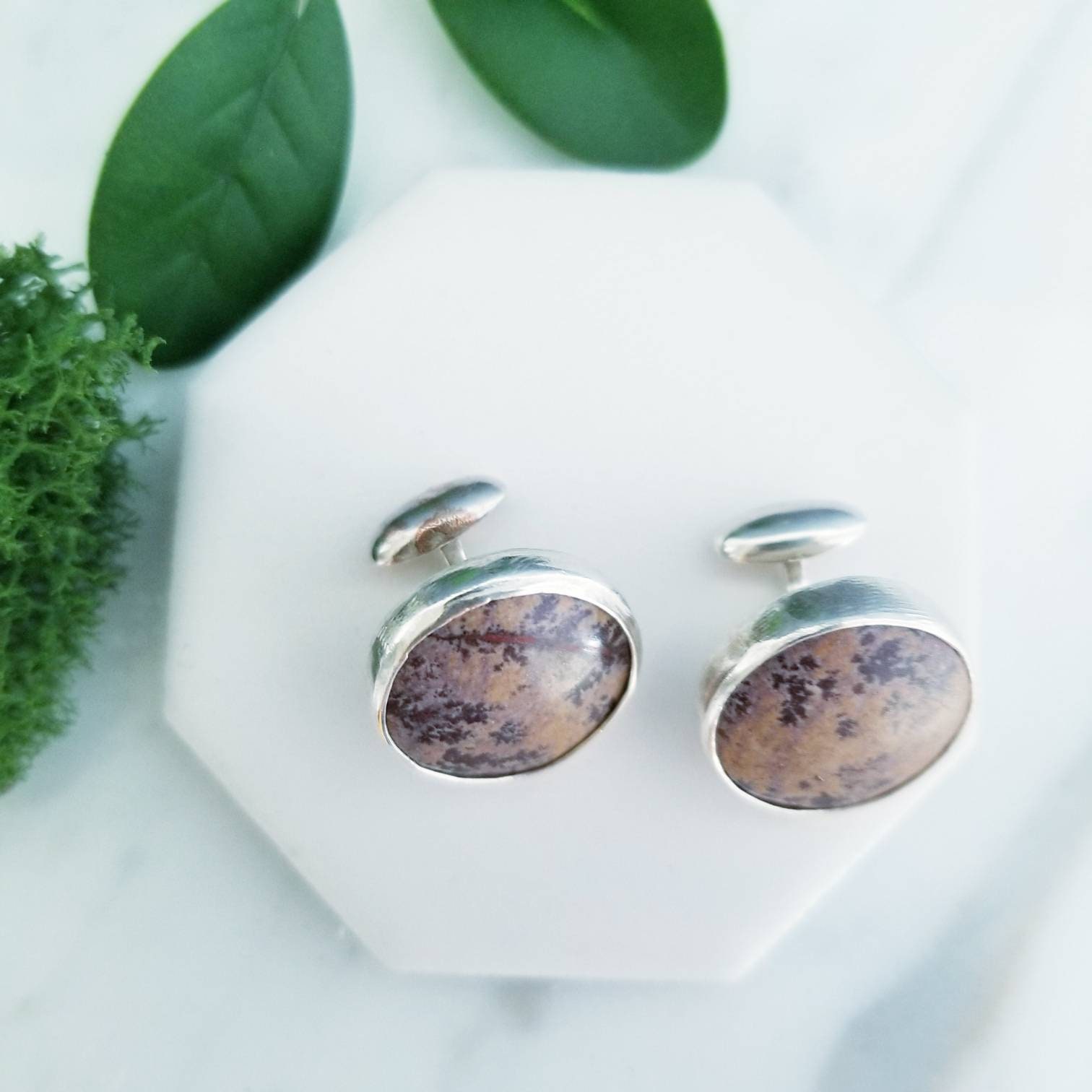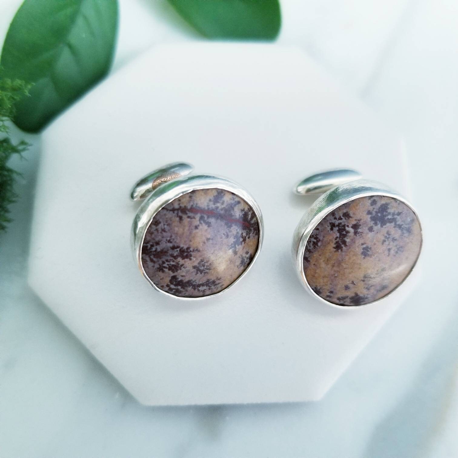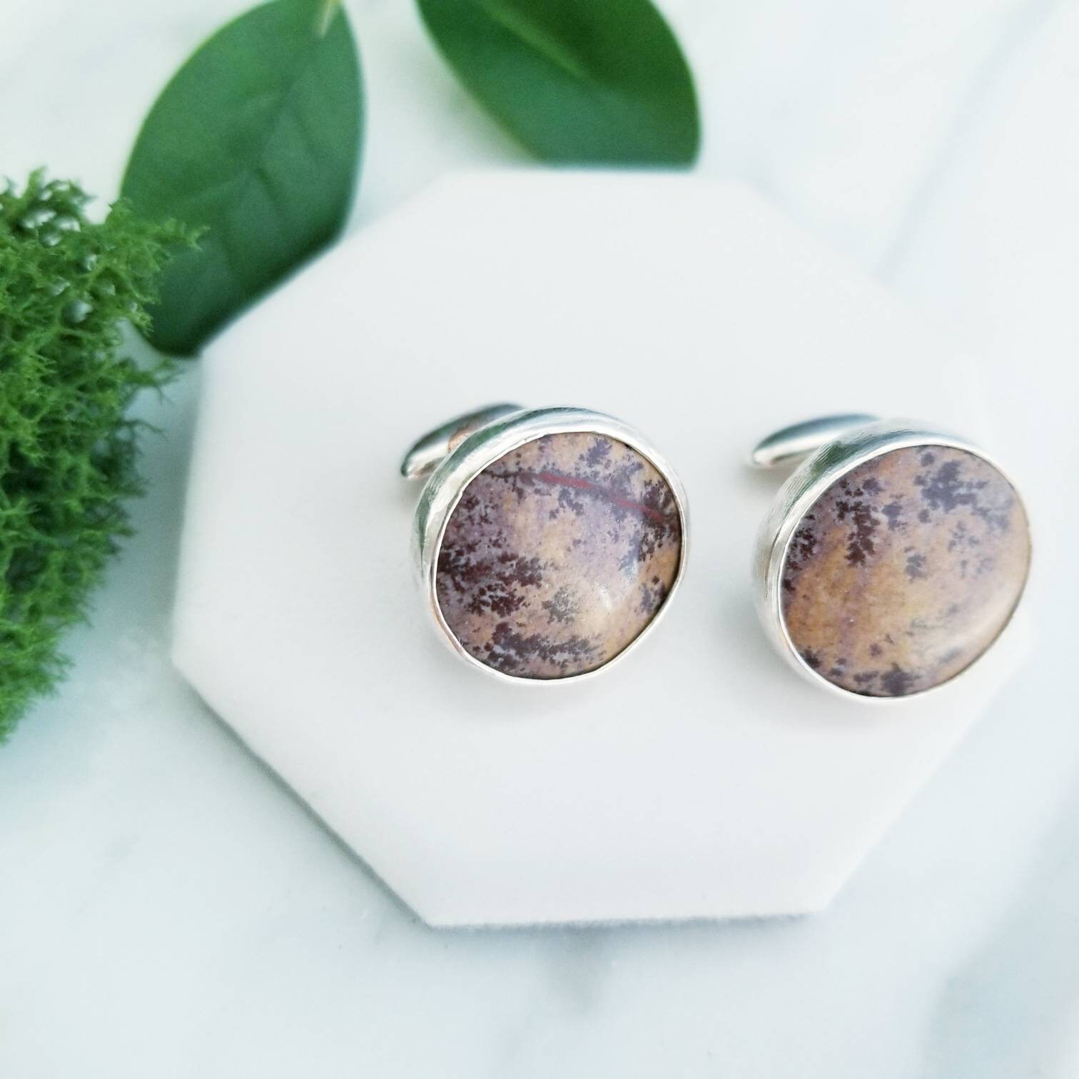 Beautiful stones from Mexico are set in fine & sterling silver. The round stones are in shades of deep tan & chocolate brown. The stones are 15mm across and the sterling silver is given a brushed finish.