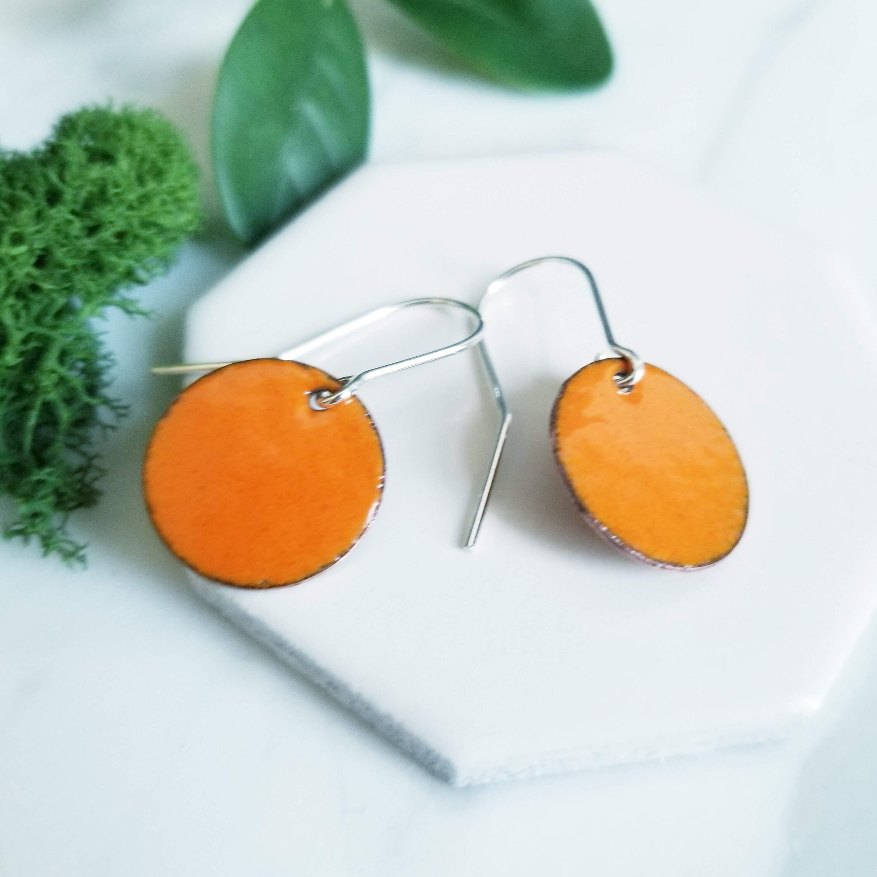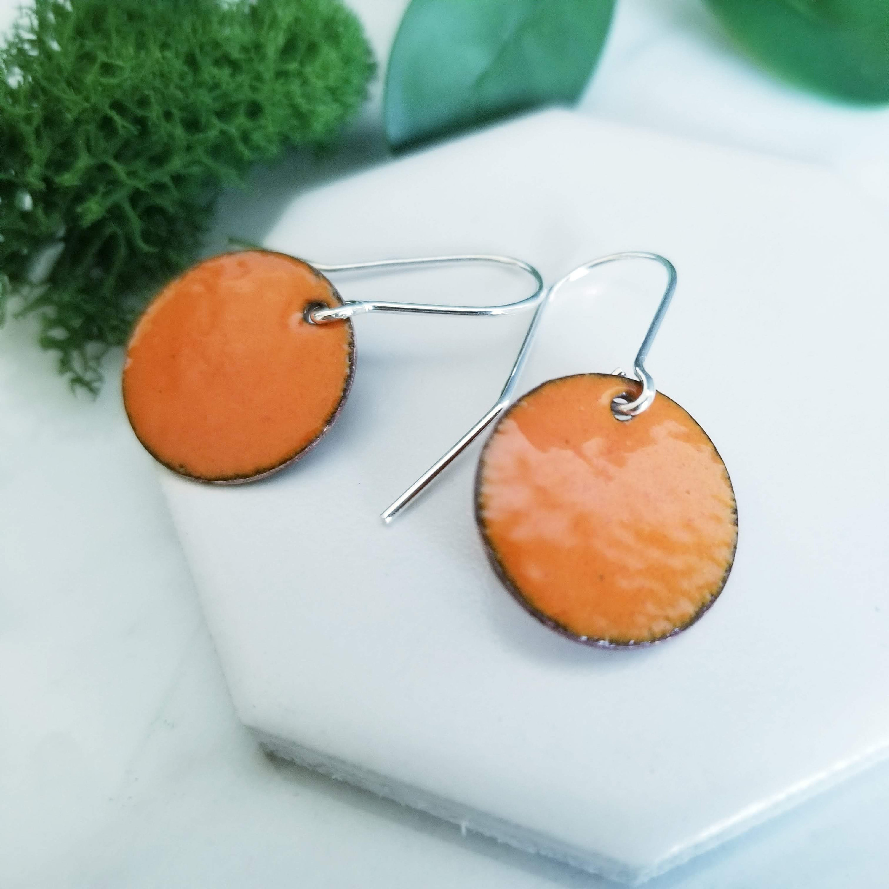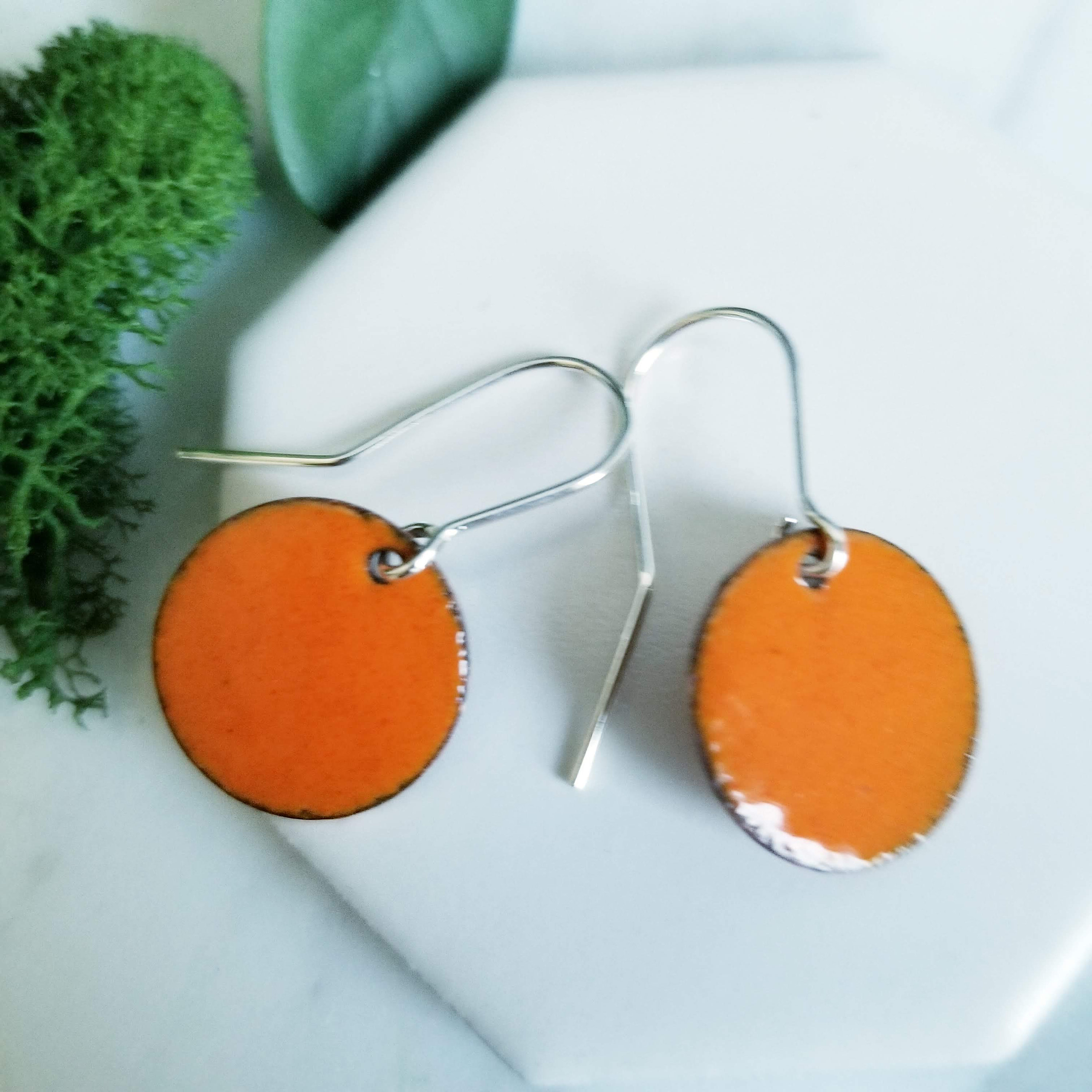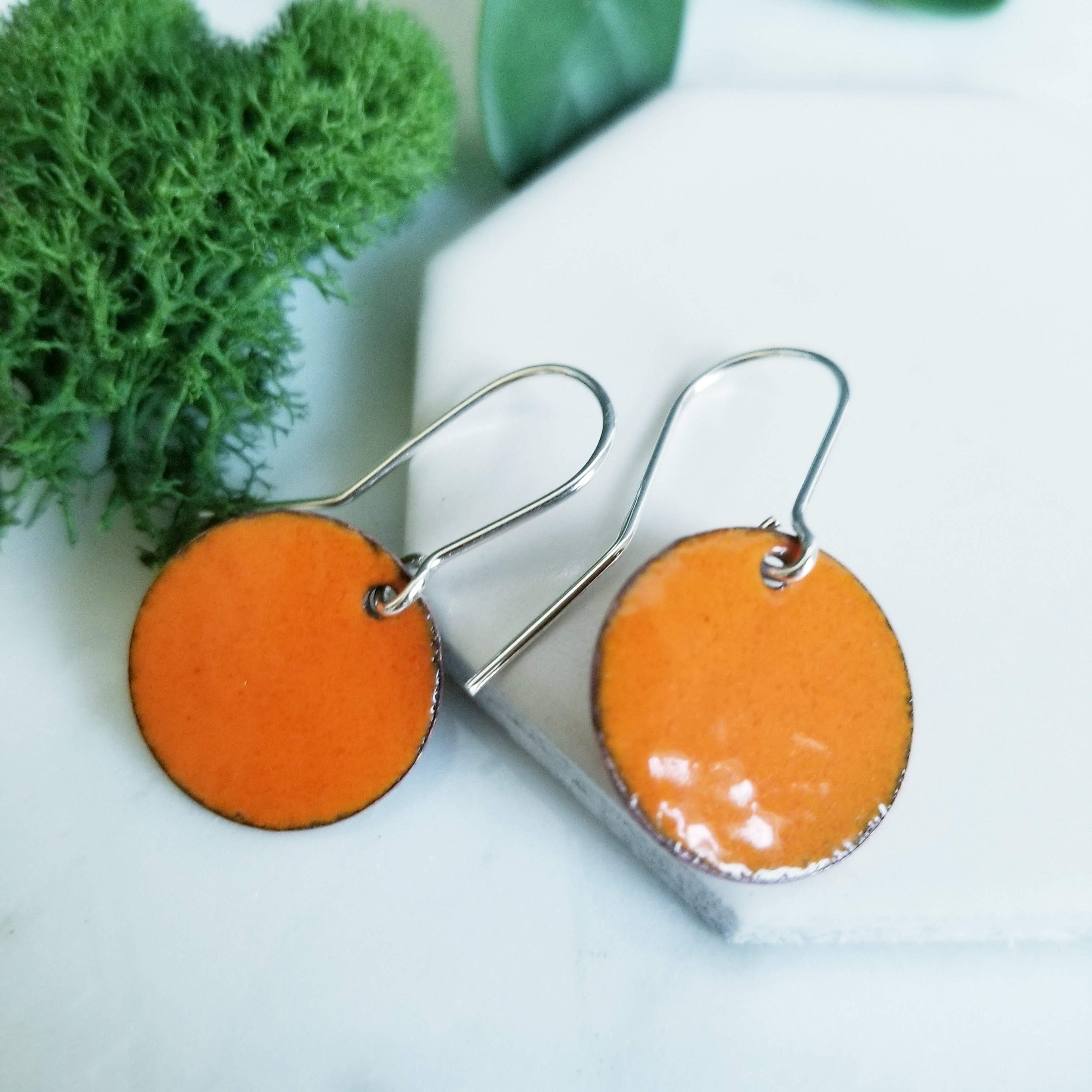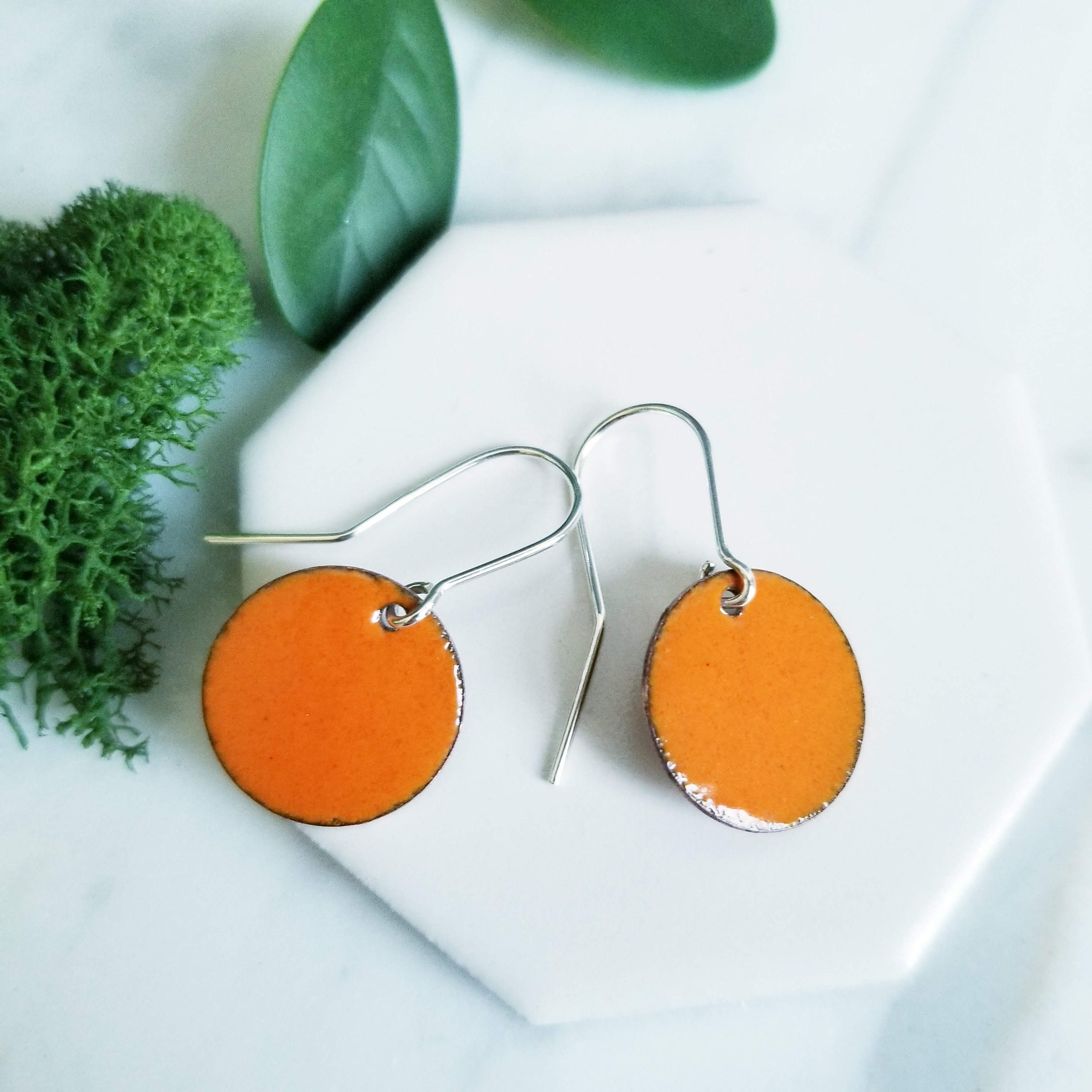 Orange Tangerine Glass Enamel Round Disk Earrings.