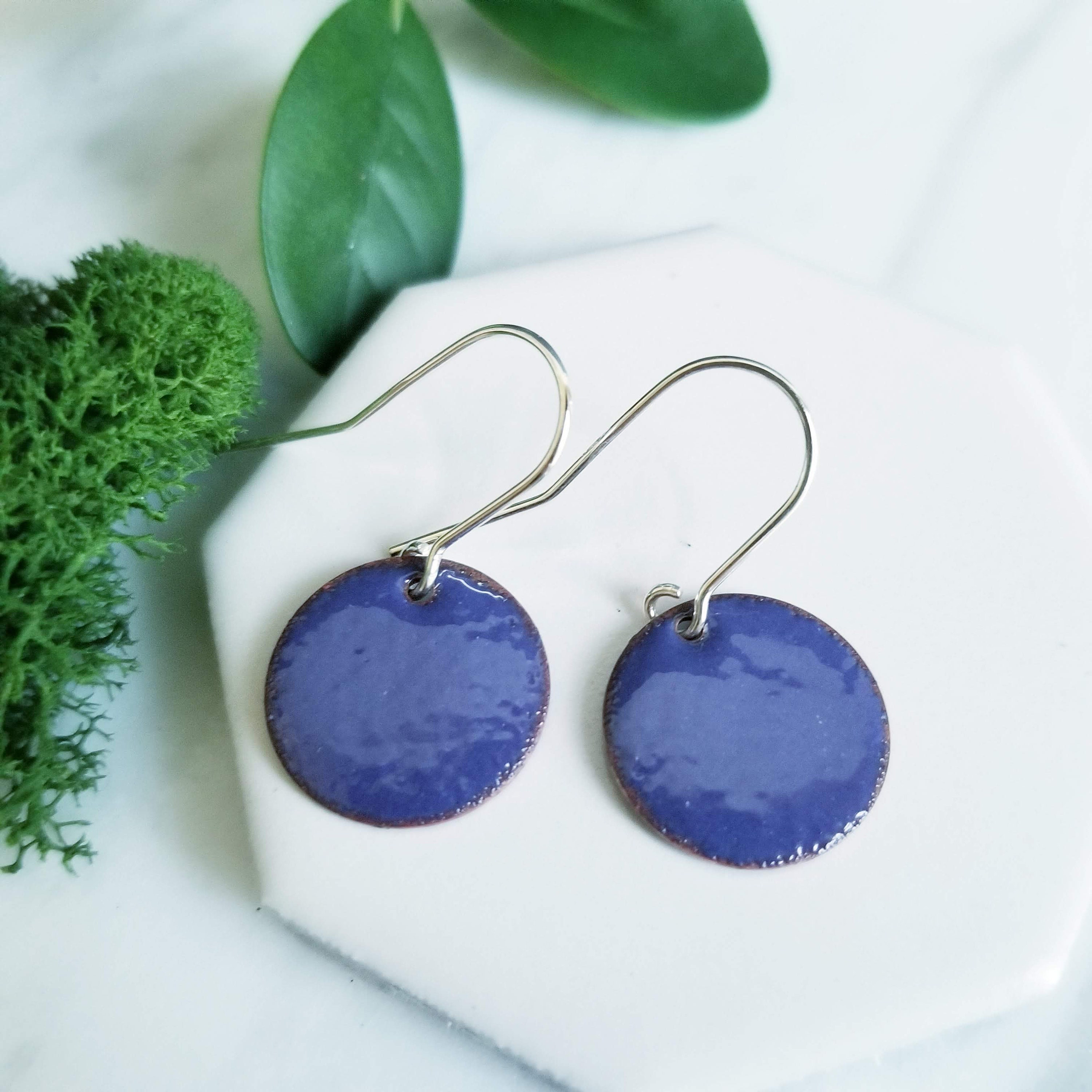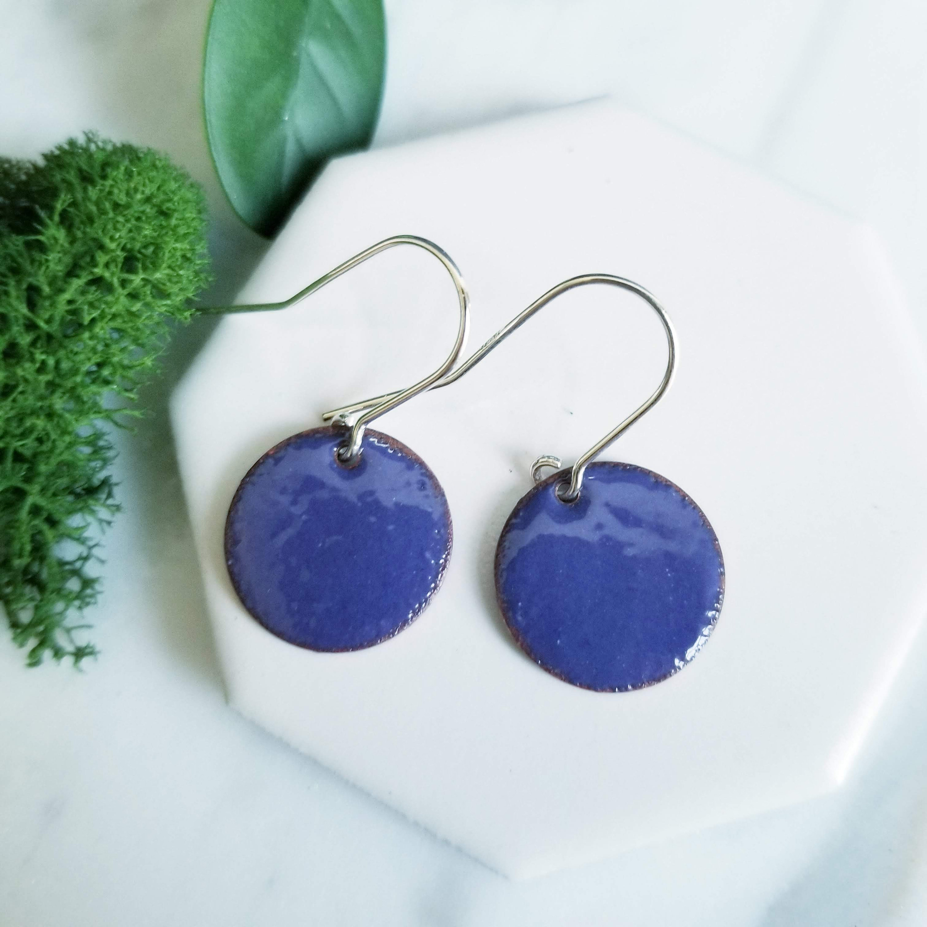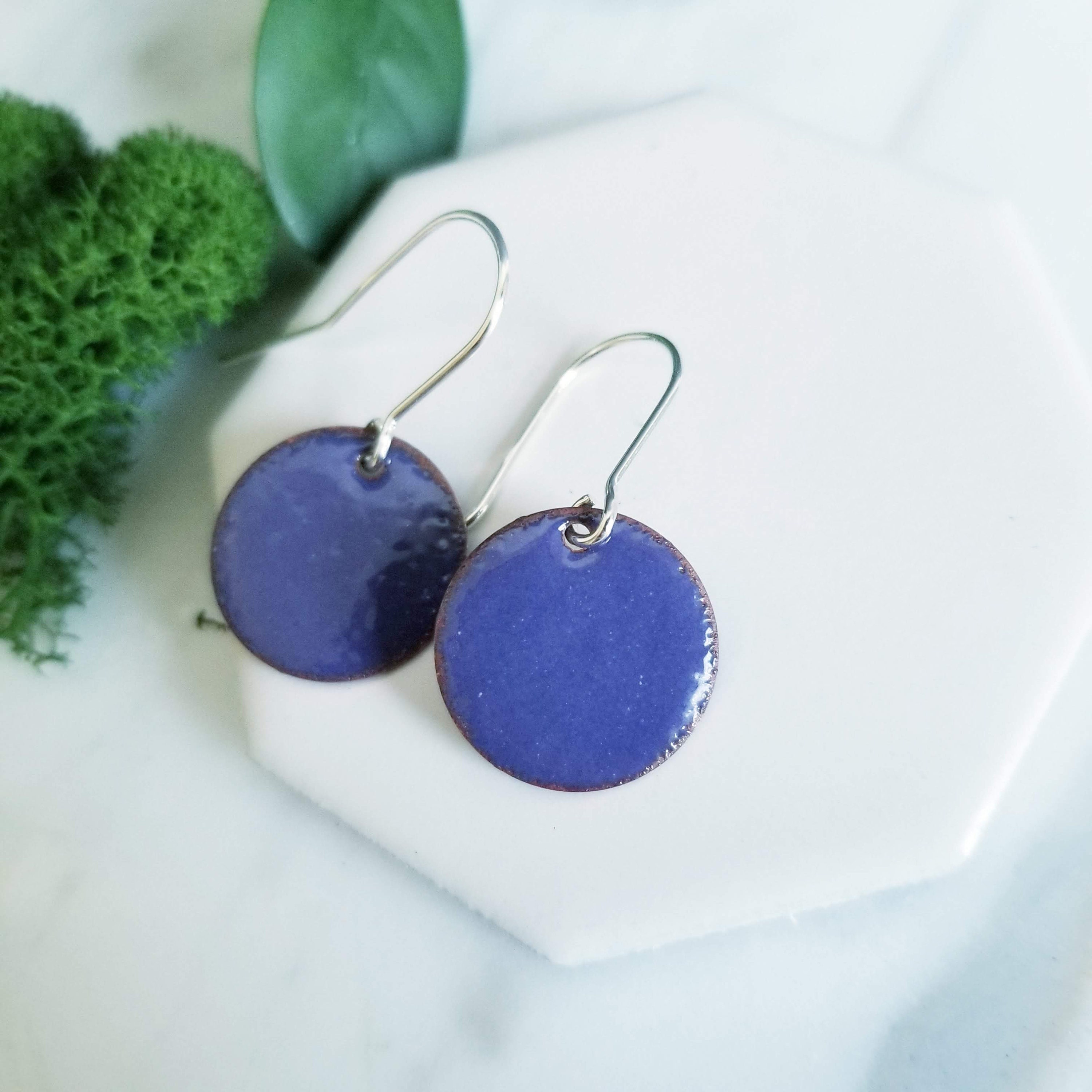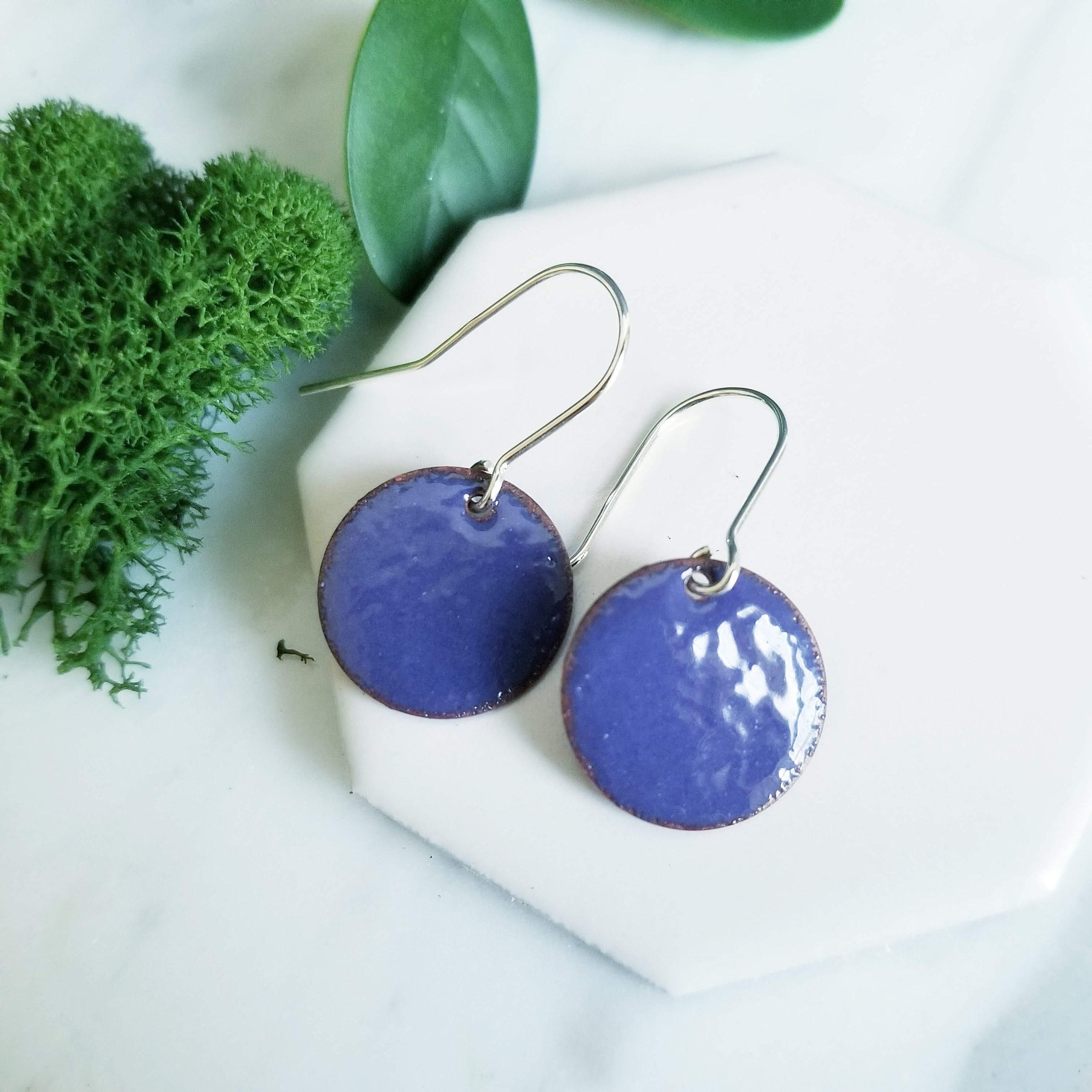 Dark Grape Purple Glass Enamel Round Disk Earrings.