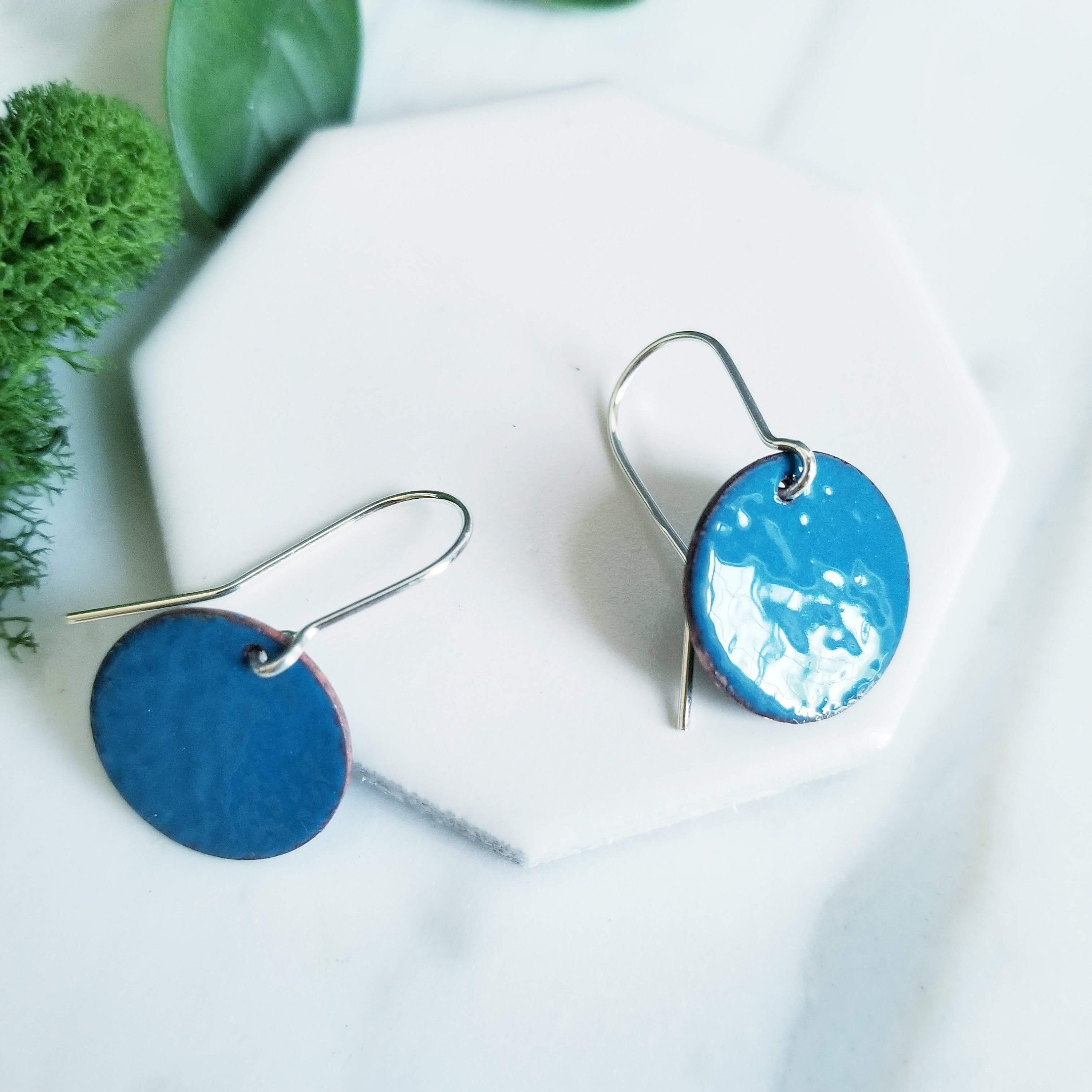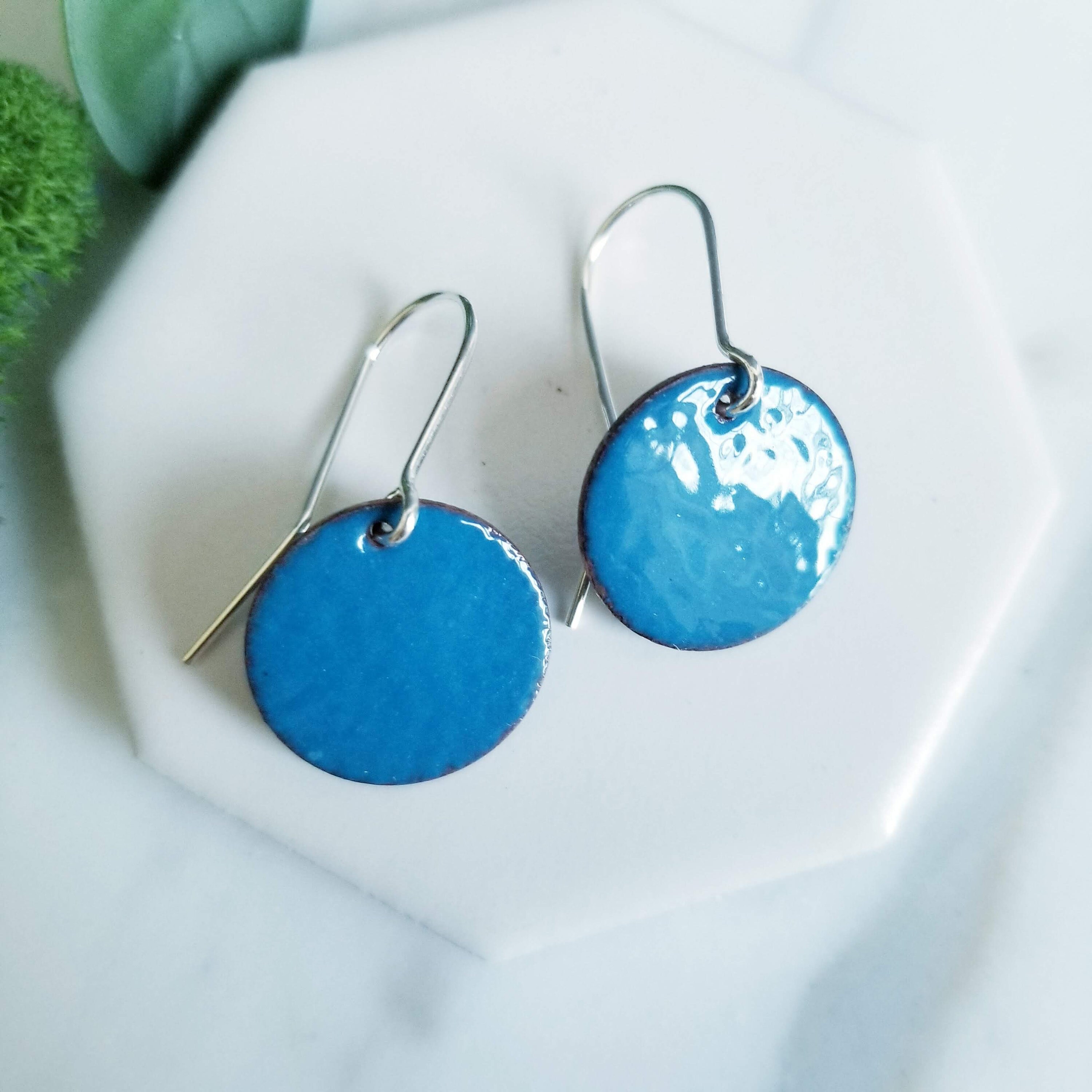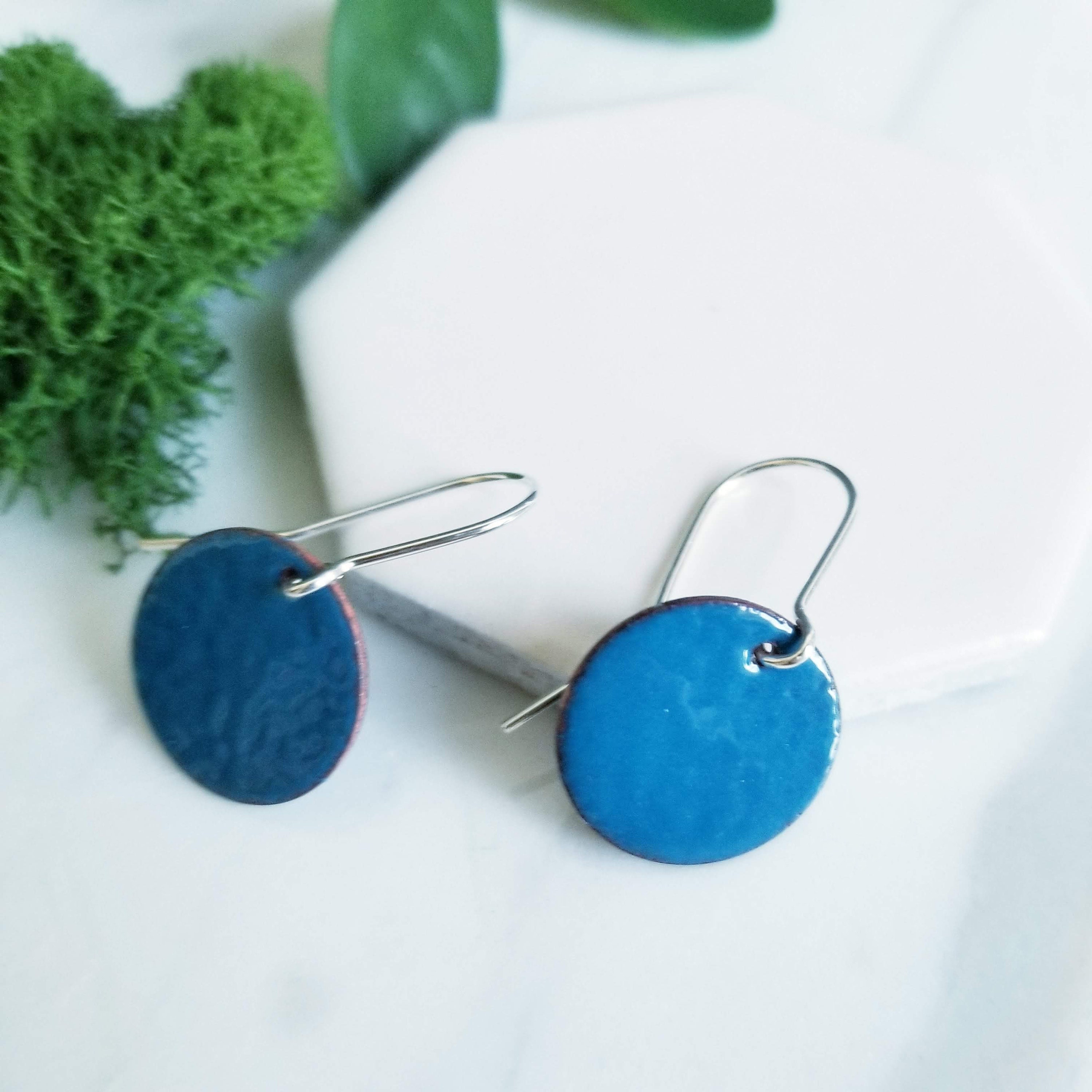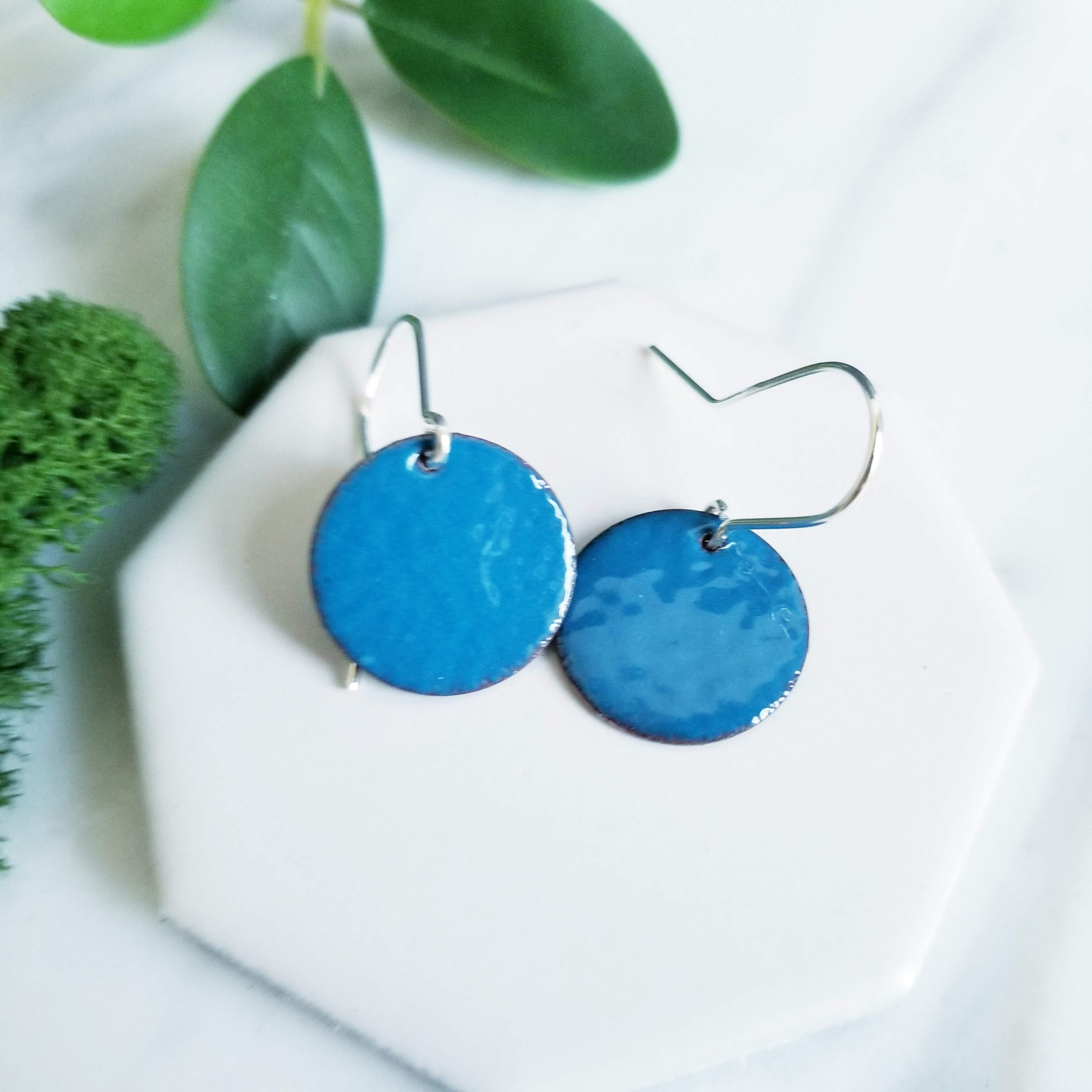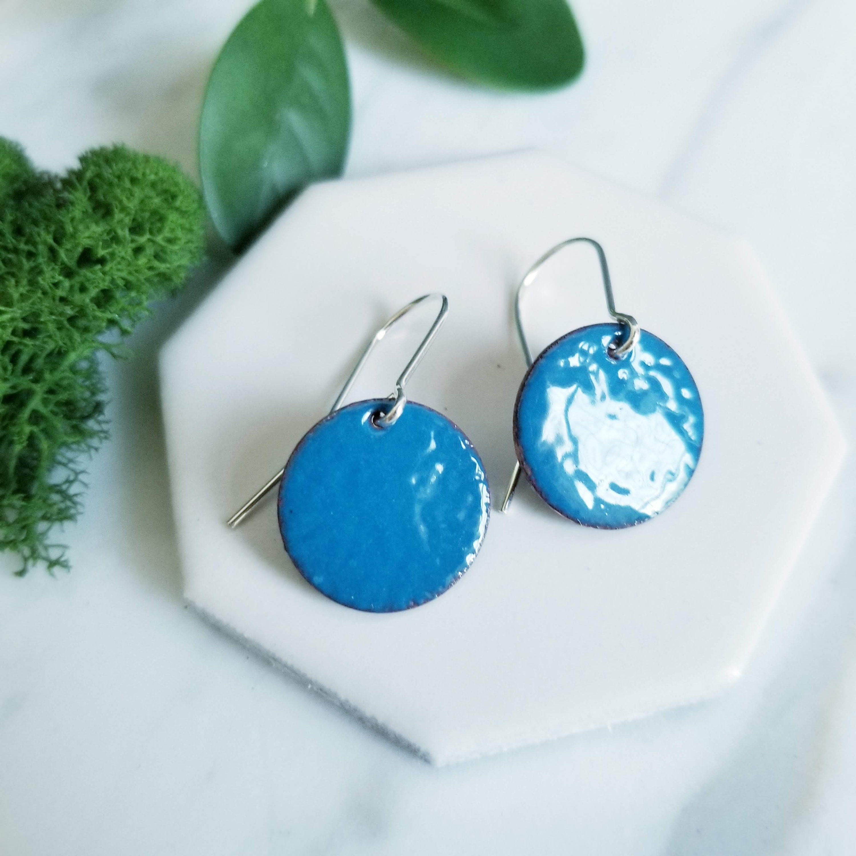 Bright Blue Glass Enamel Round Disk Earrings.