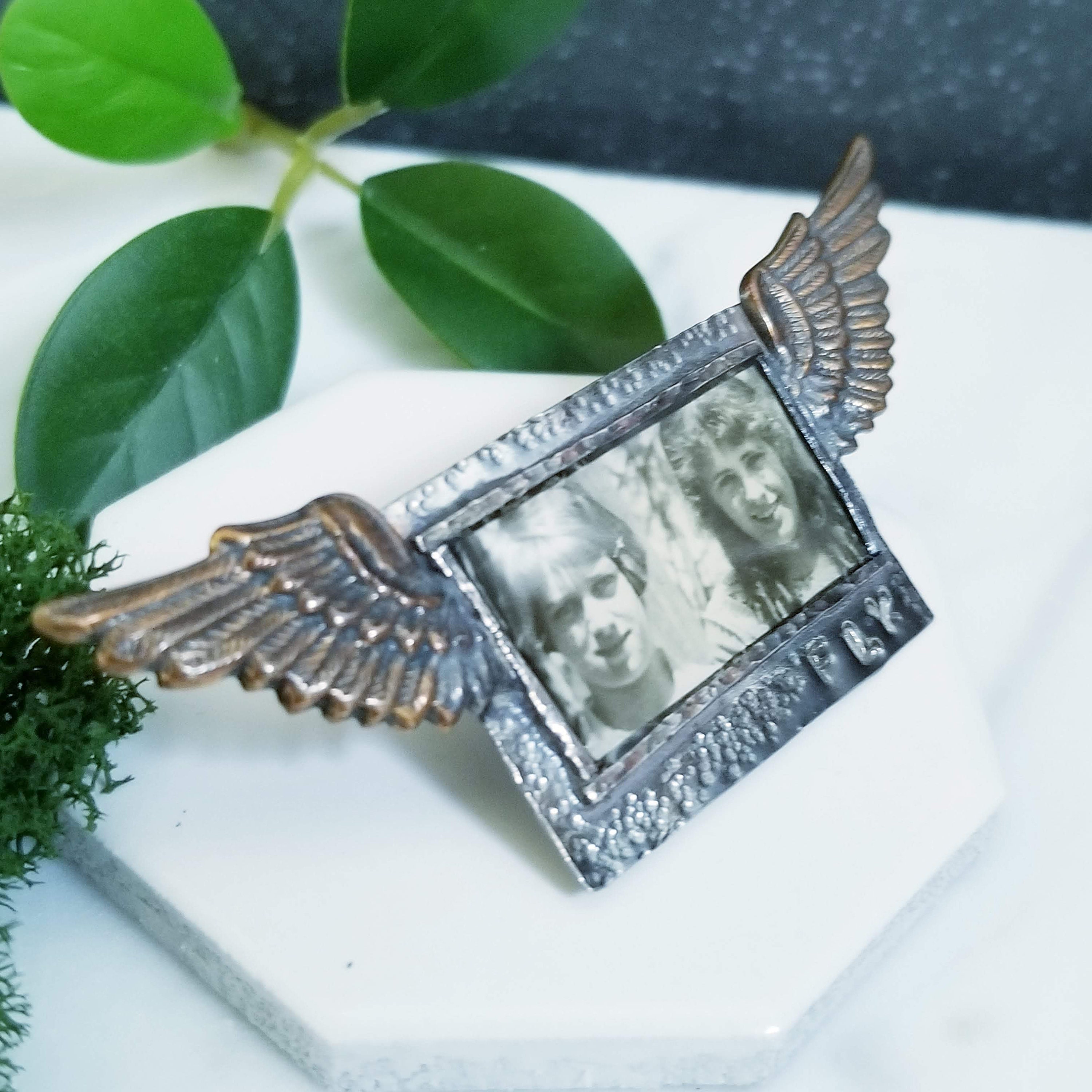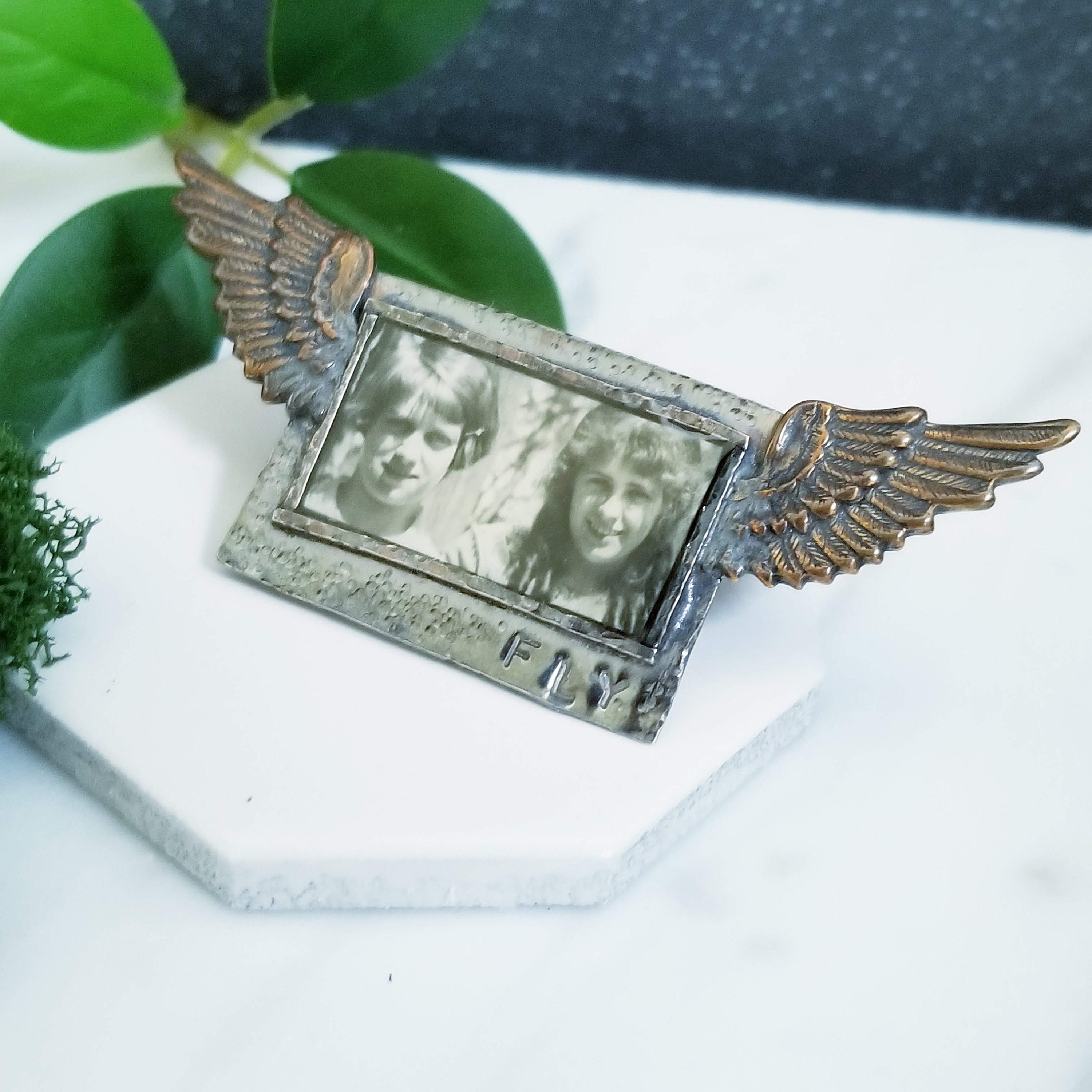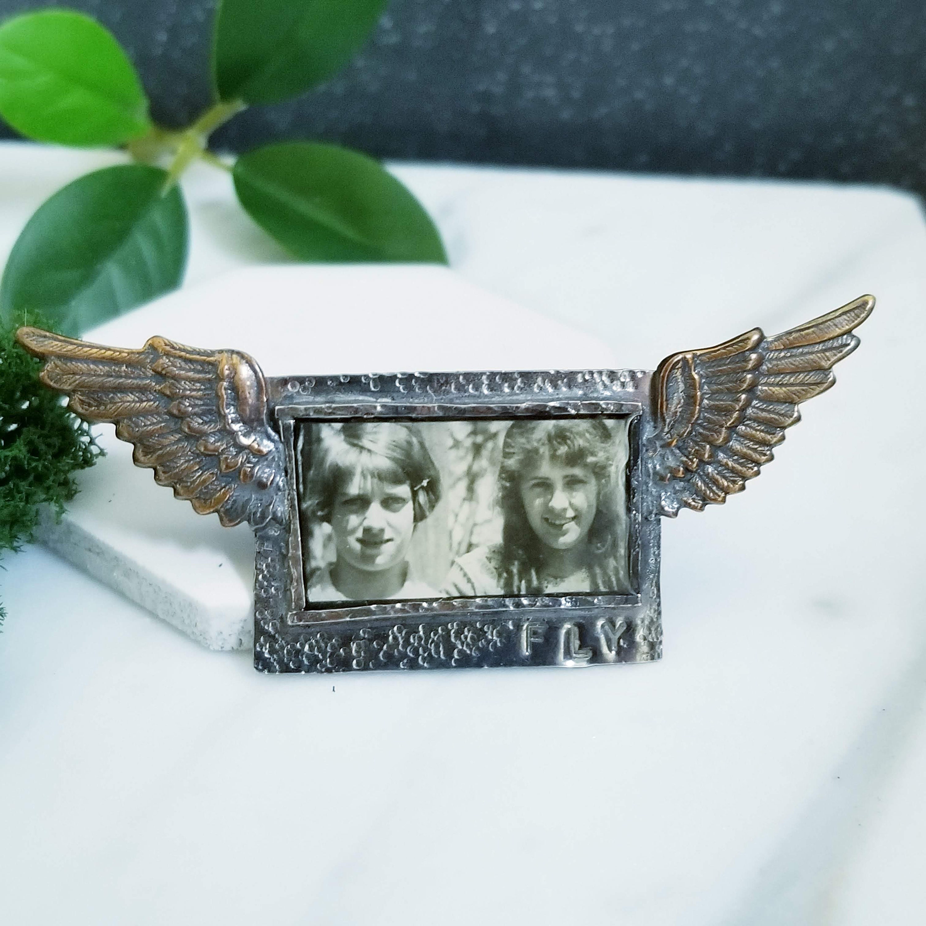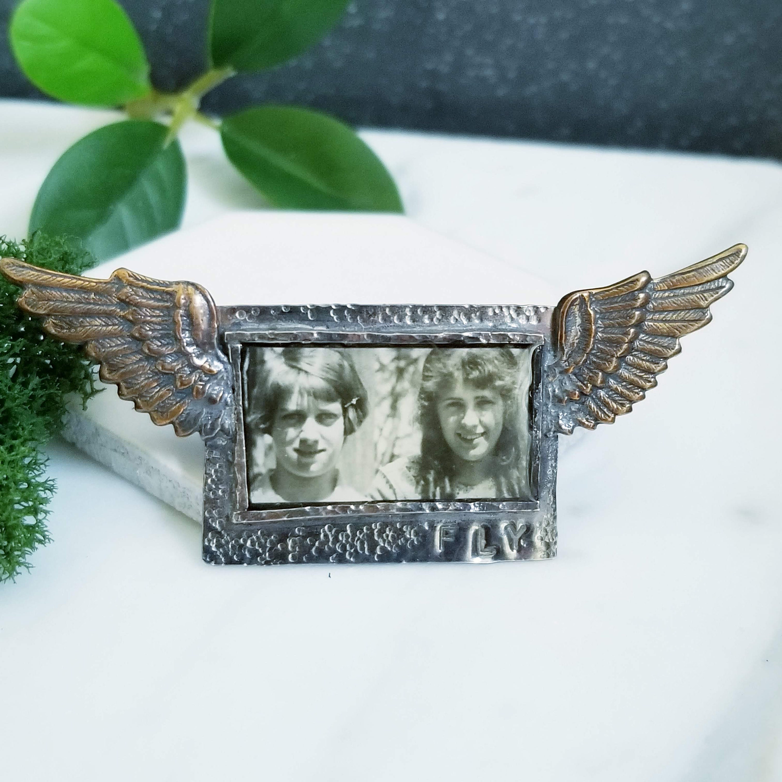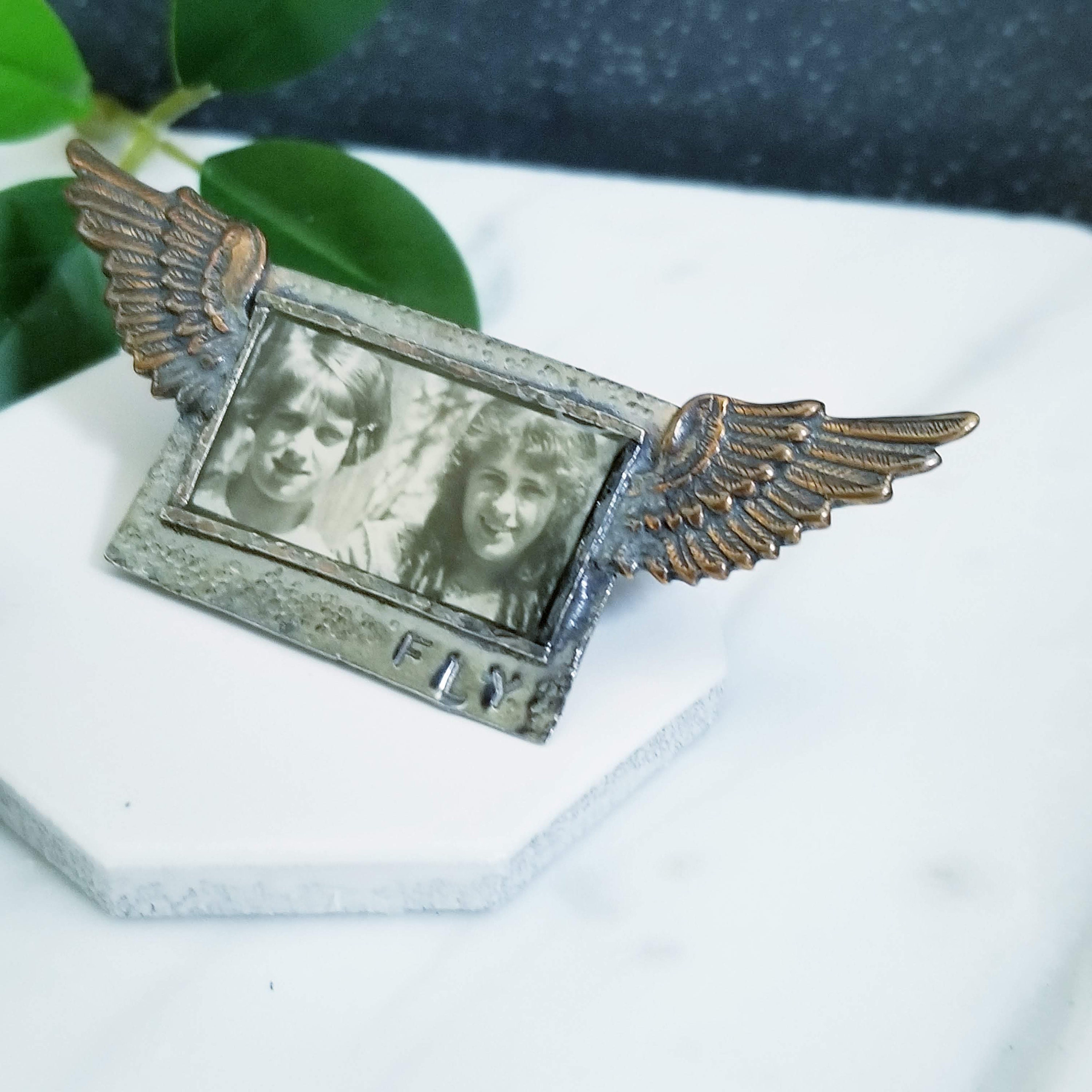 Collaged art jewelry piece, a vintage photograph of a couple young girls is layered under clear resin in a sterling silver rectangle frame. FLY is stamped on the lower right. 2 Brass wings accent each side. A double post with friction clutches are on the back.
