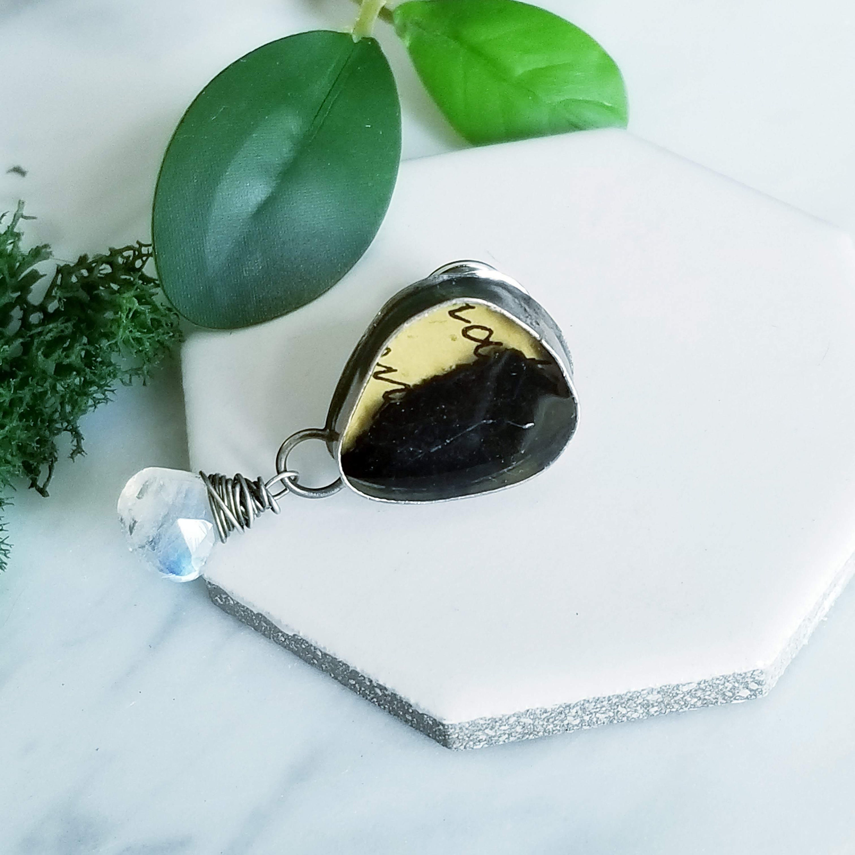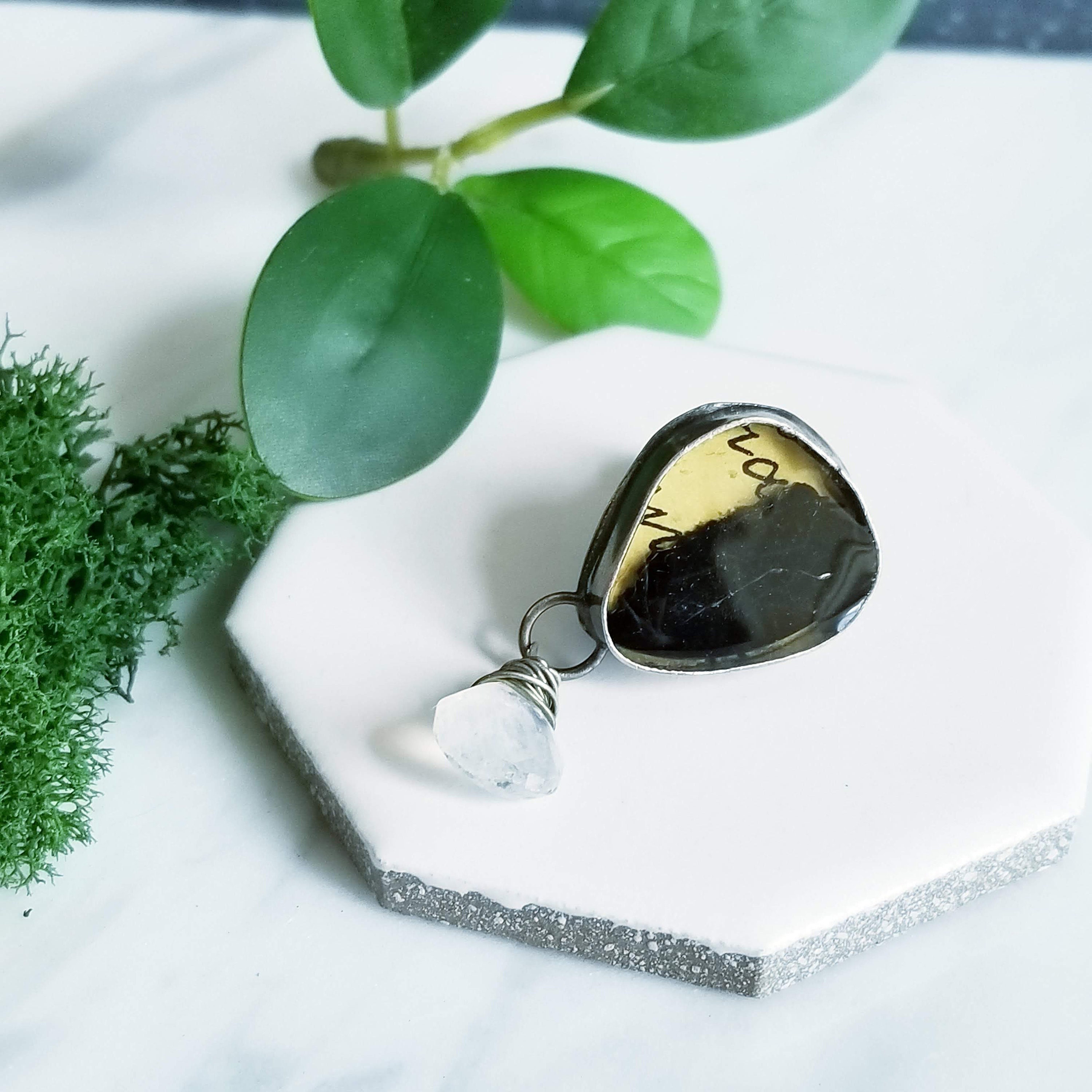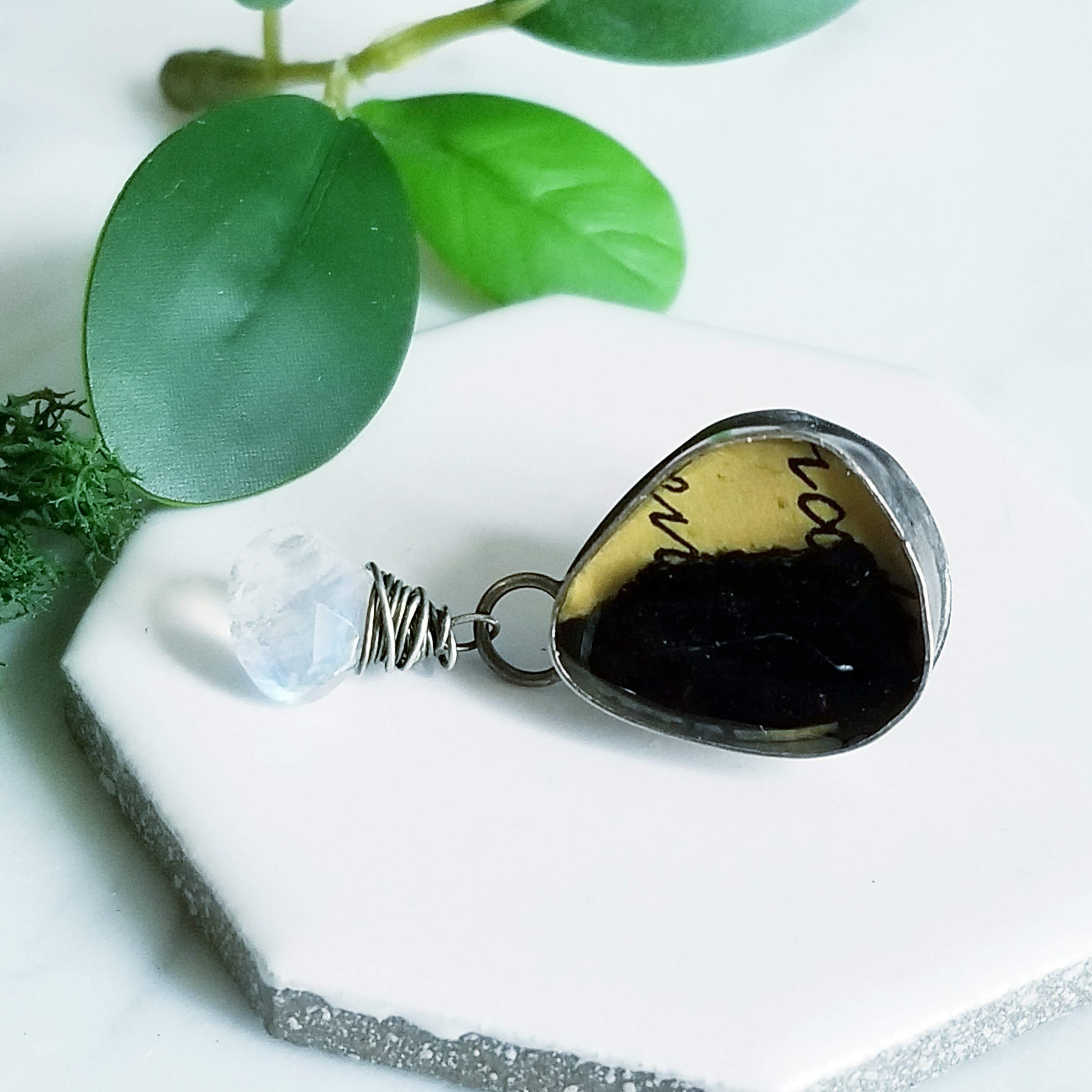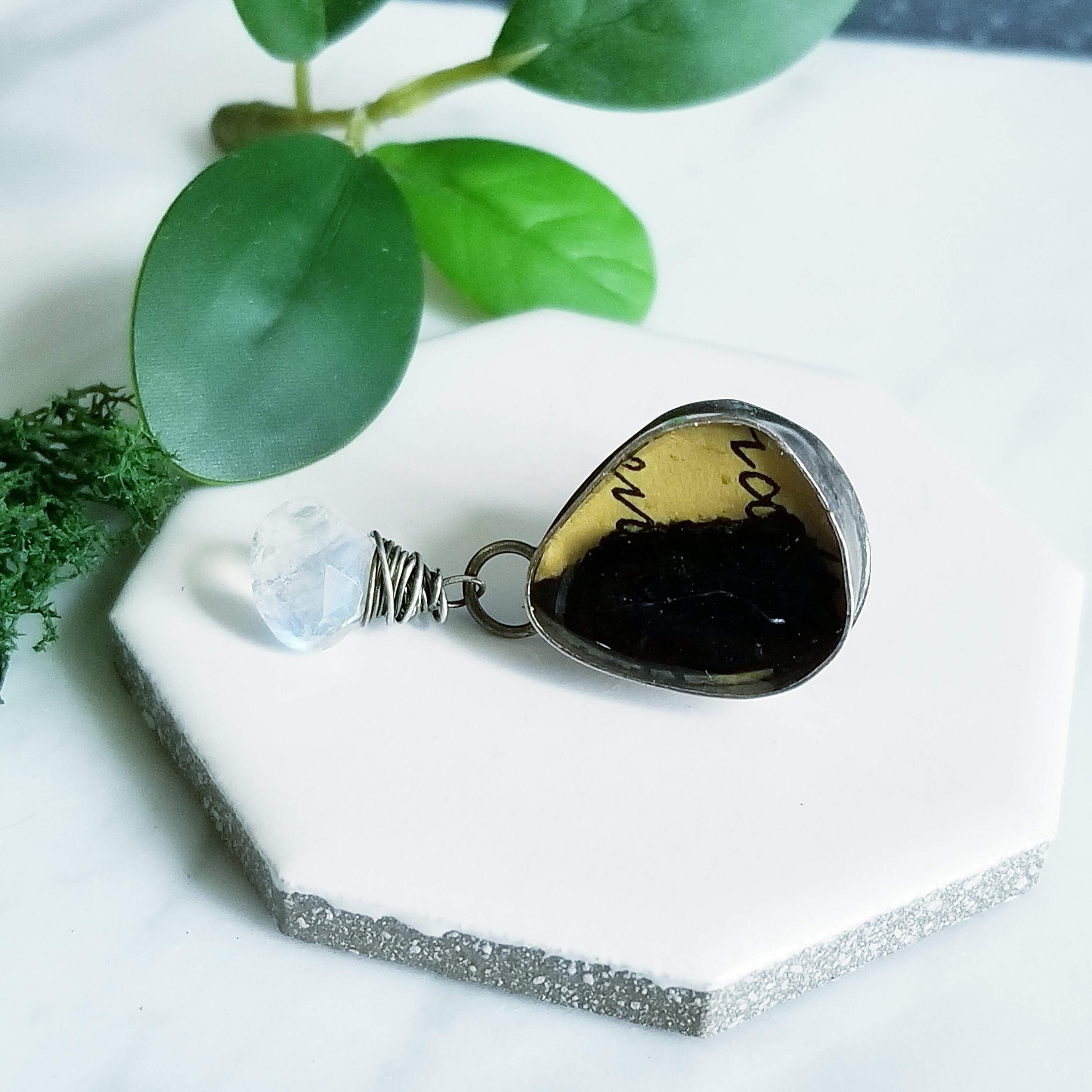 Collaged art jewelry piece, a scrap of handwritten letter sealed with a scrap of black jet beads under clear resin inside a sterling silver bezel. Below the bezel hangs a wire wrapped moonstone bead.