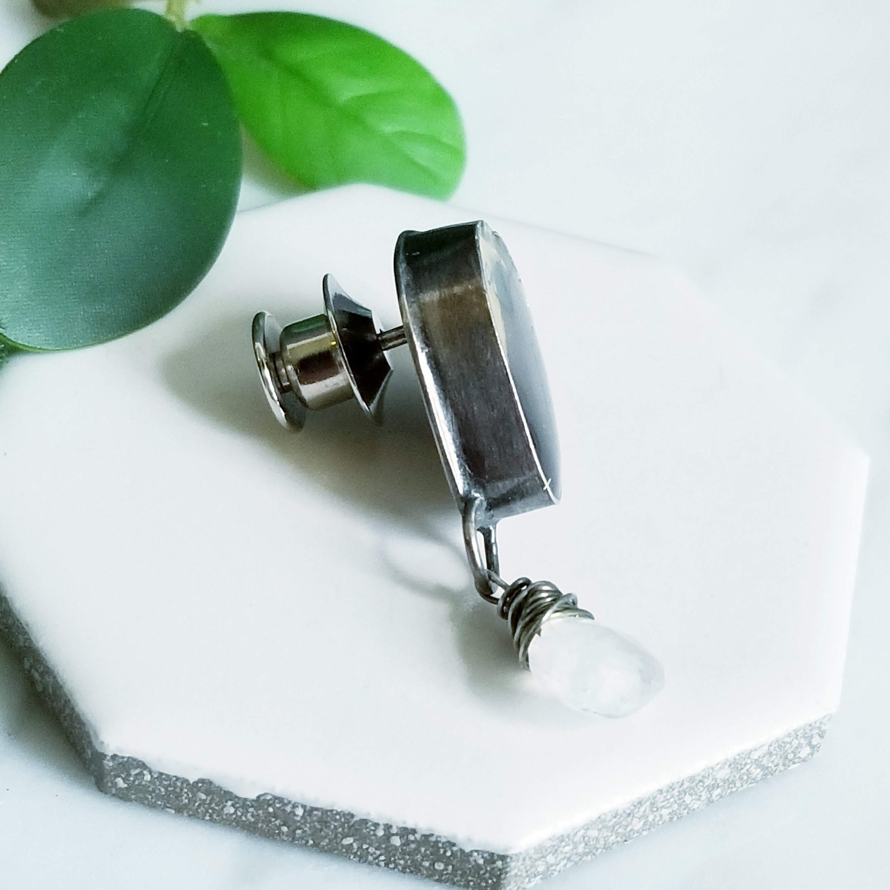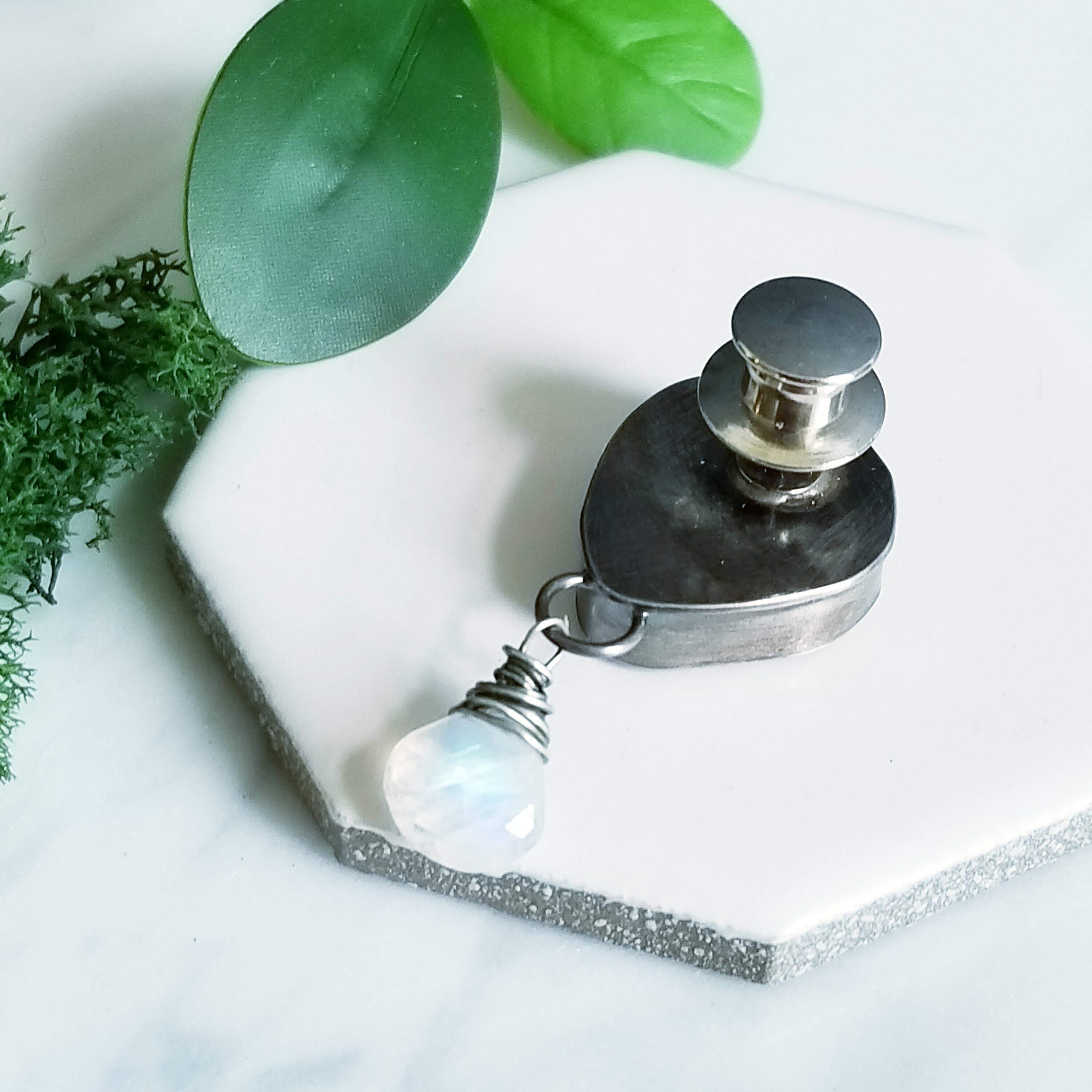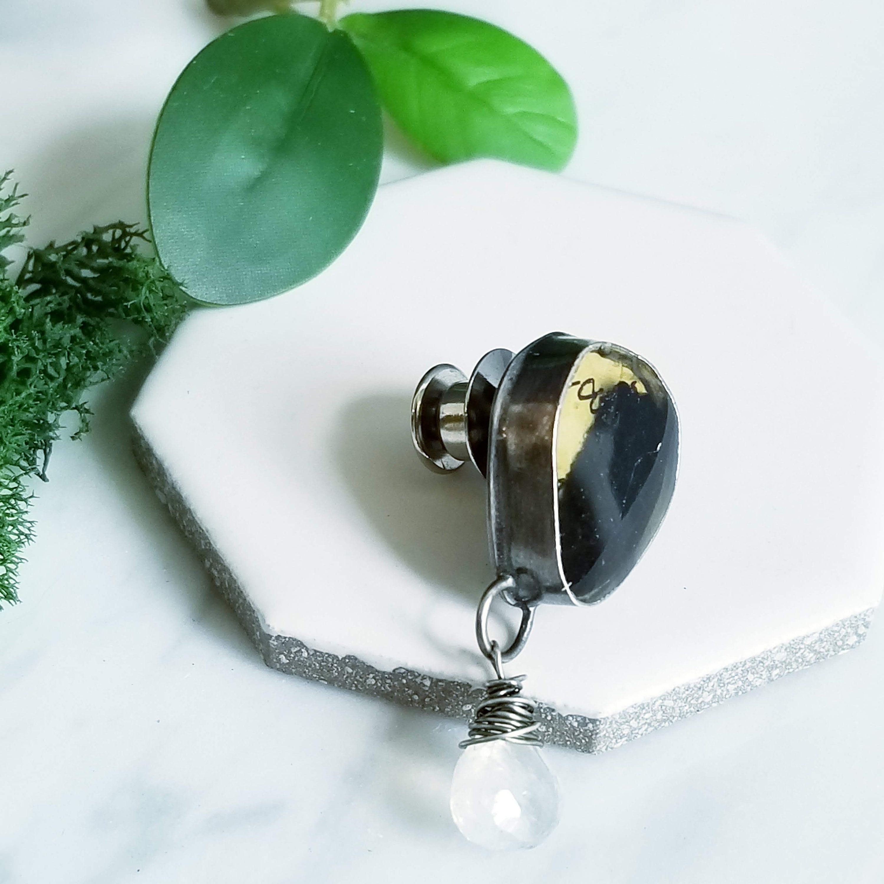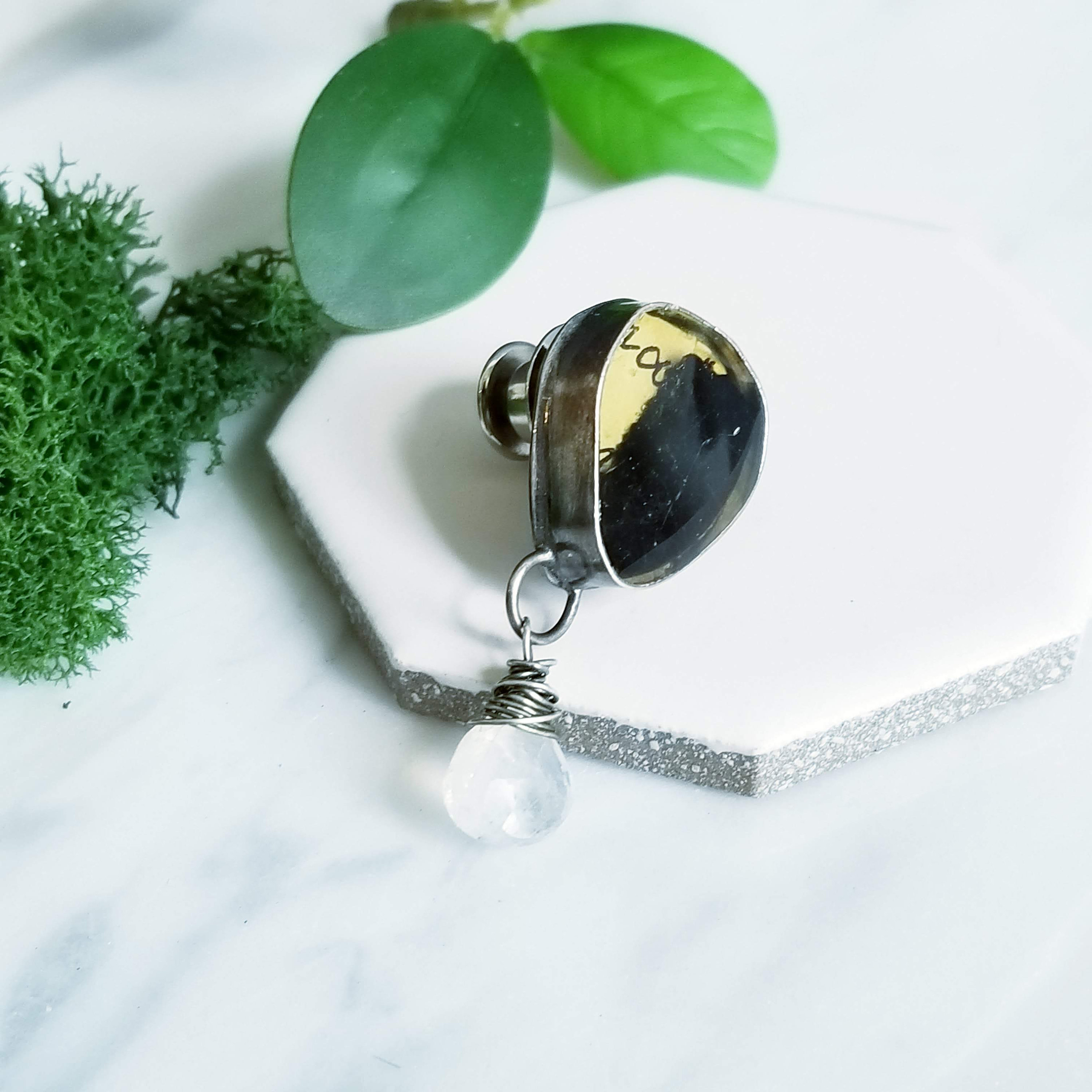 Collaged art jewelry piece, a scrap of handwritten letter sealed with a scrap of black jet beads under clear resin inside a sterling silver bezel. Below the bezel hangs a wire wrapped moonstone bead.