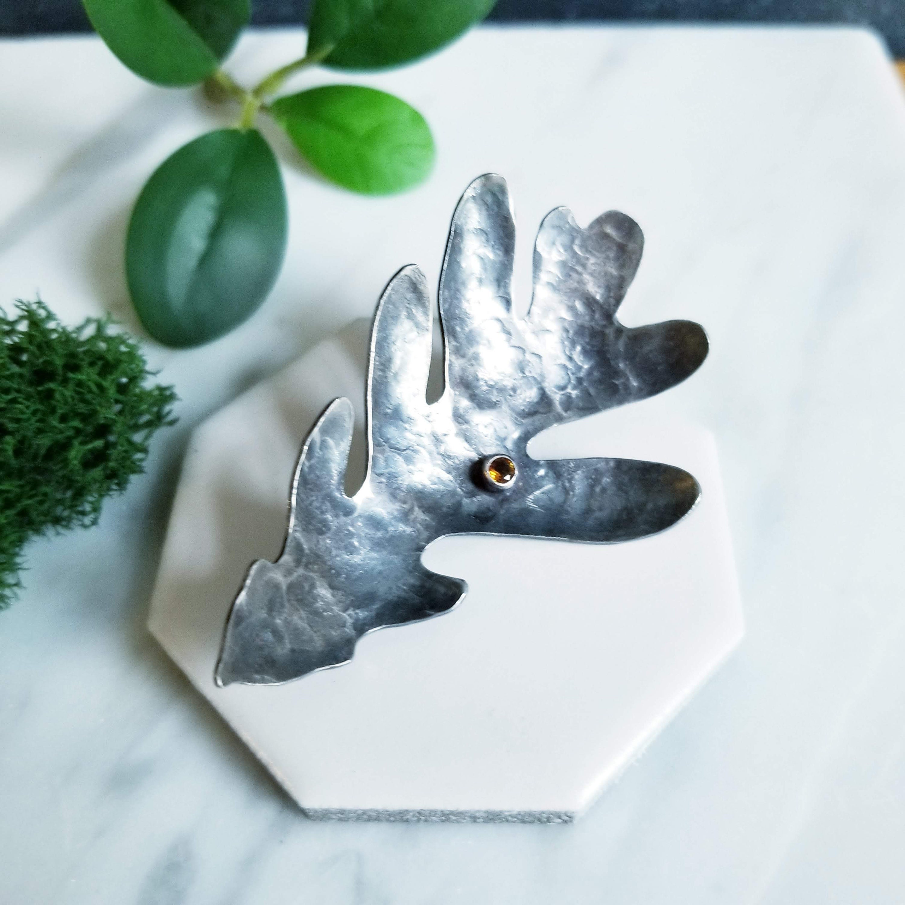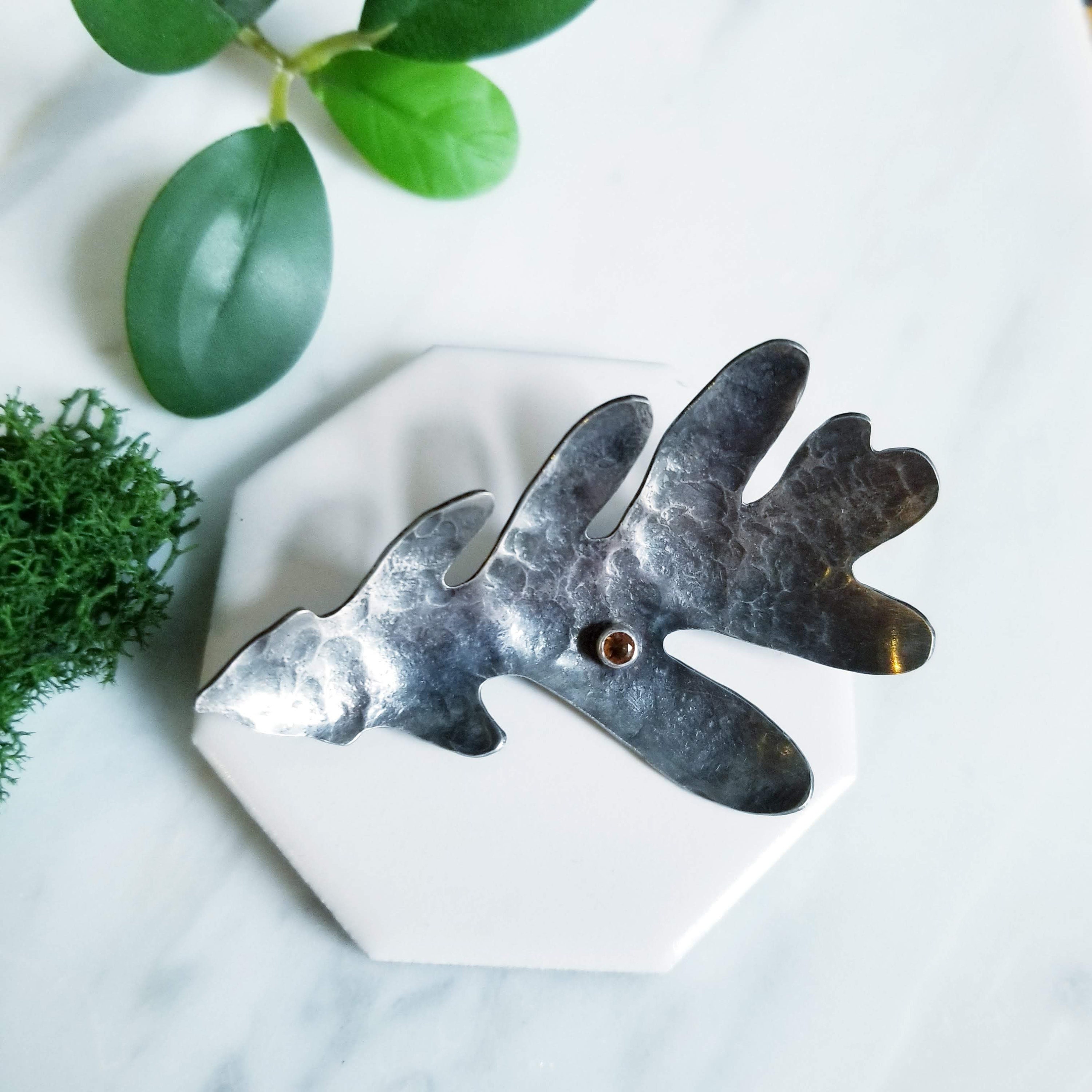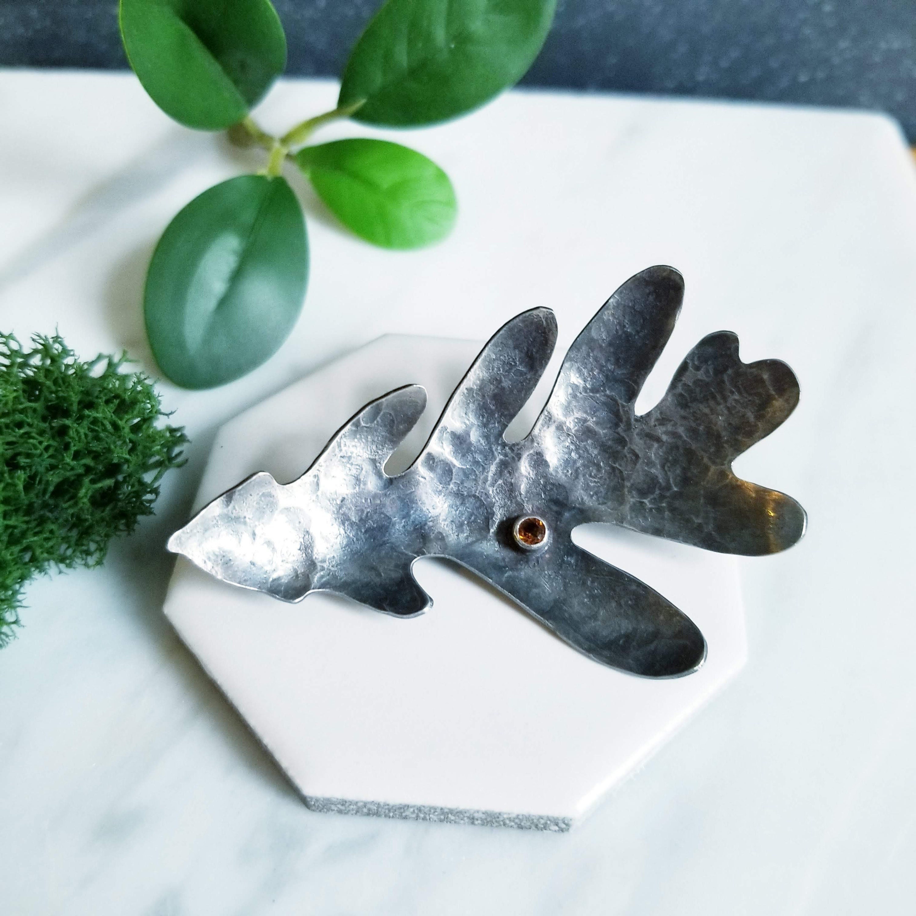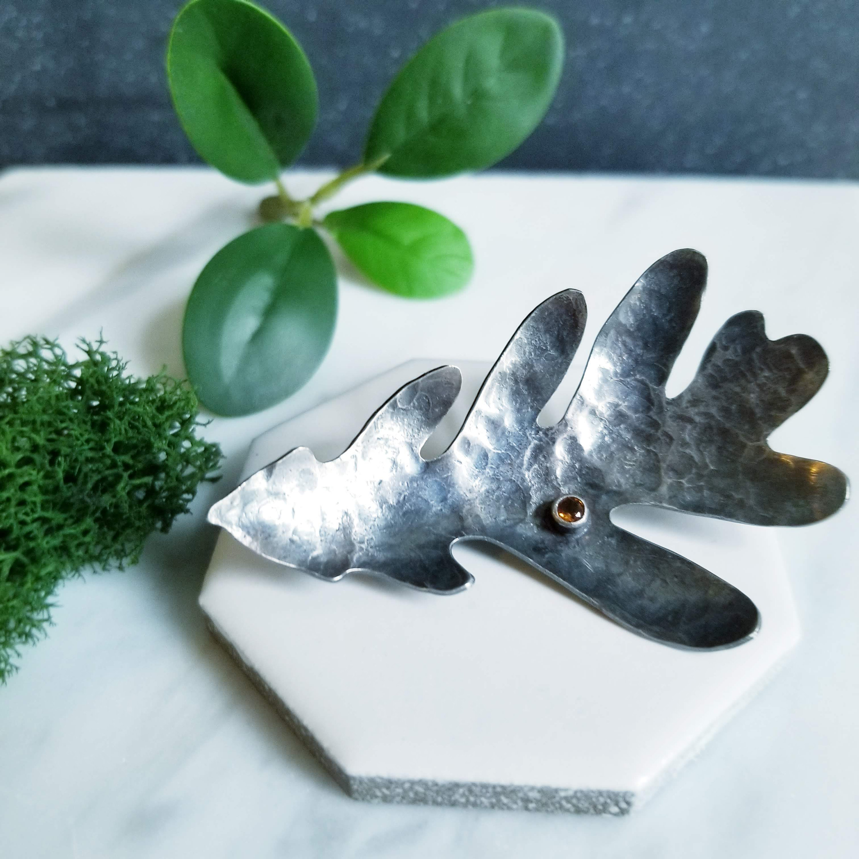 A beautiful fall leaf is forged from sterling silver, set with a small 3mm faceted citrine gemstone.