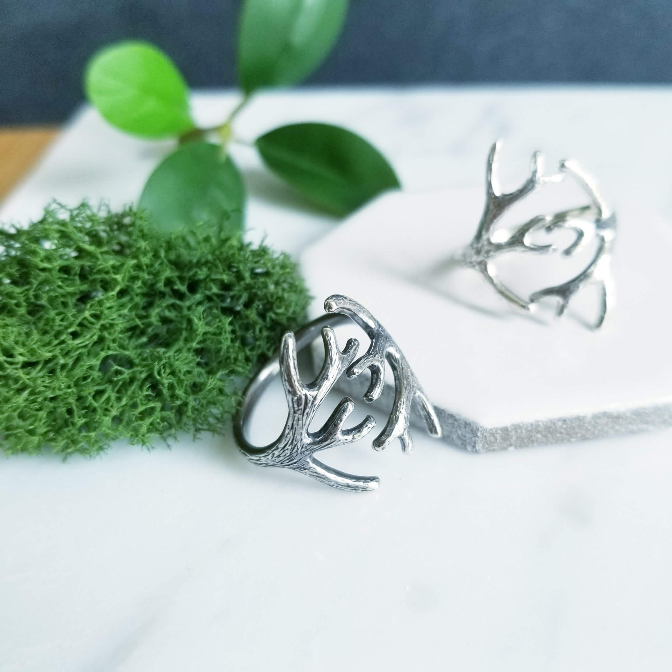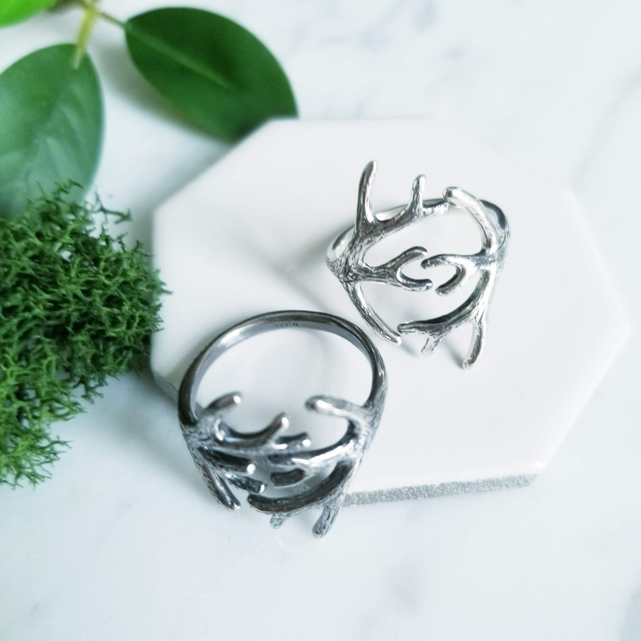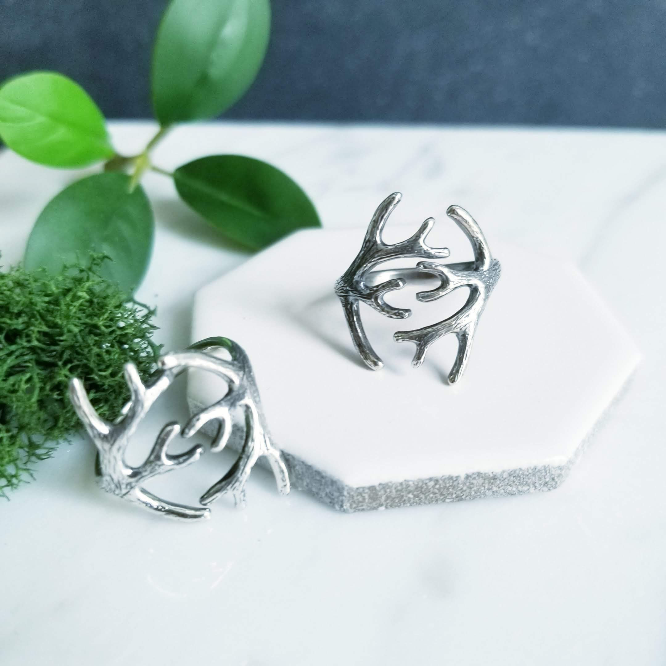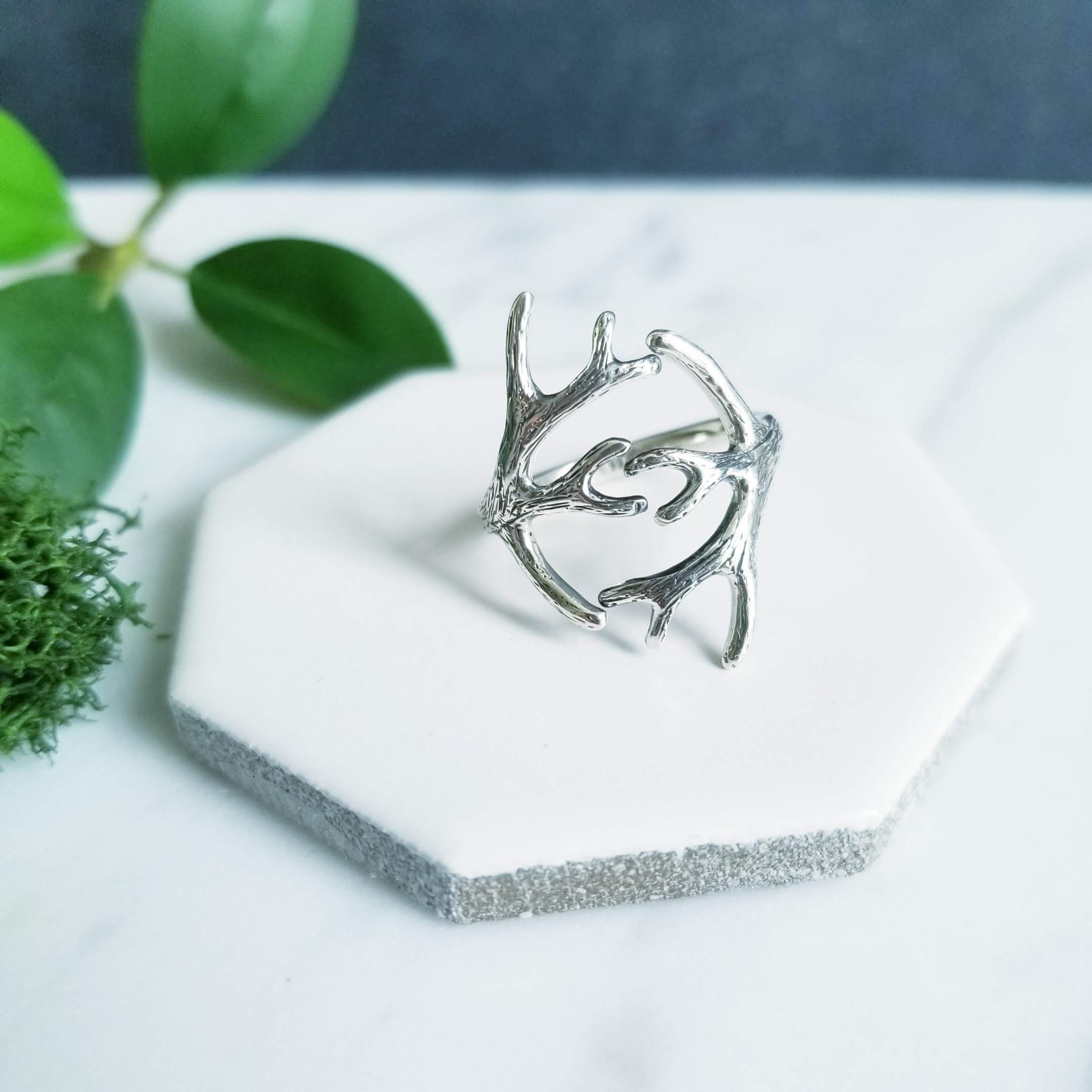 Bypass ring in sterling silver, cast antler tips wrap around your finger.