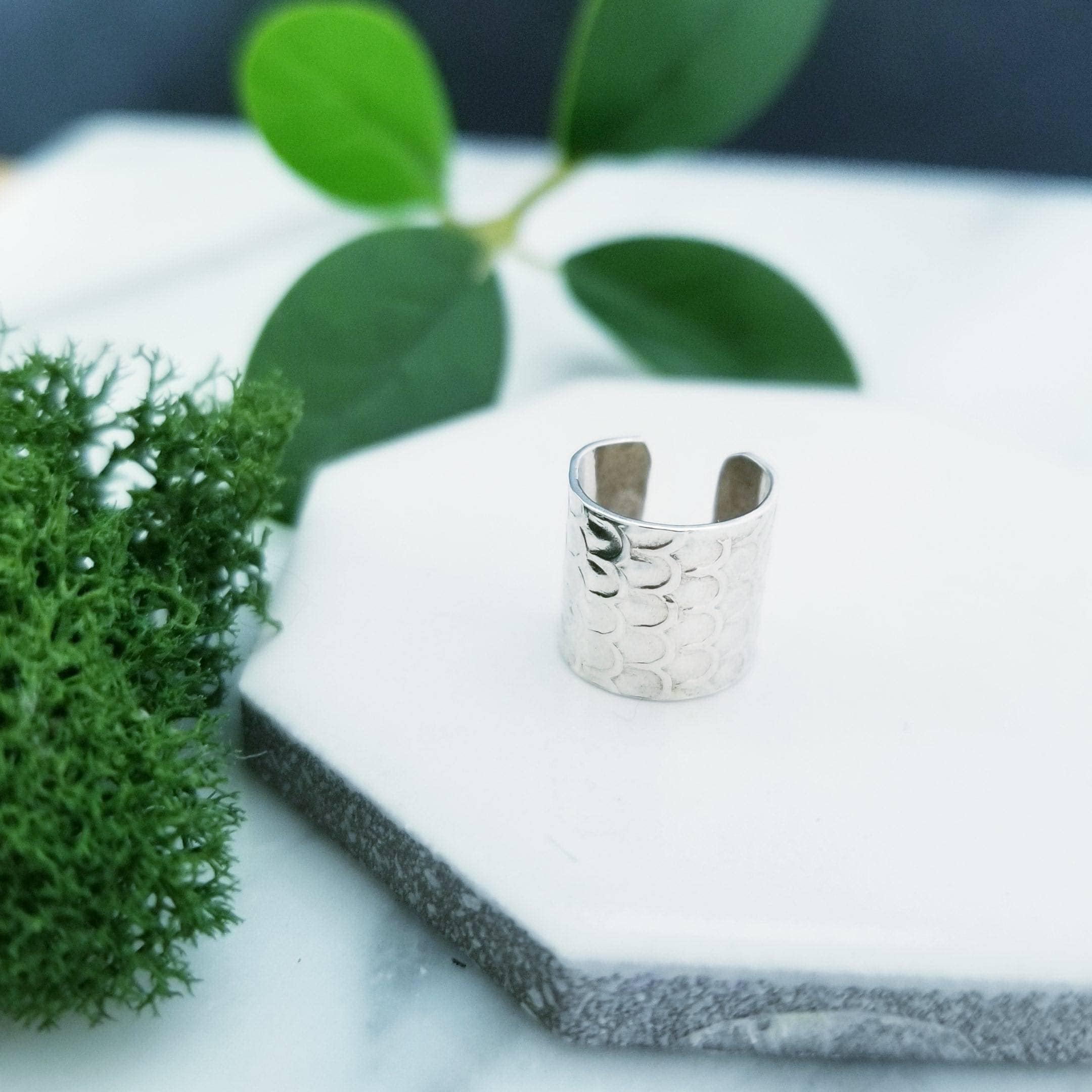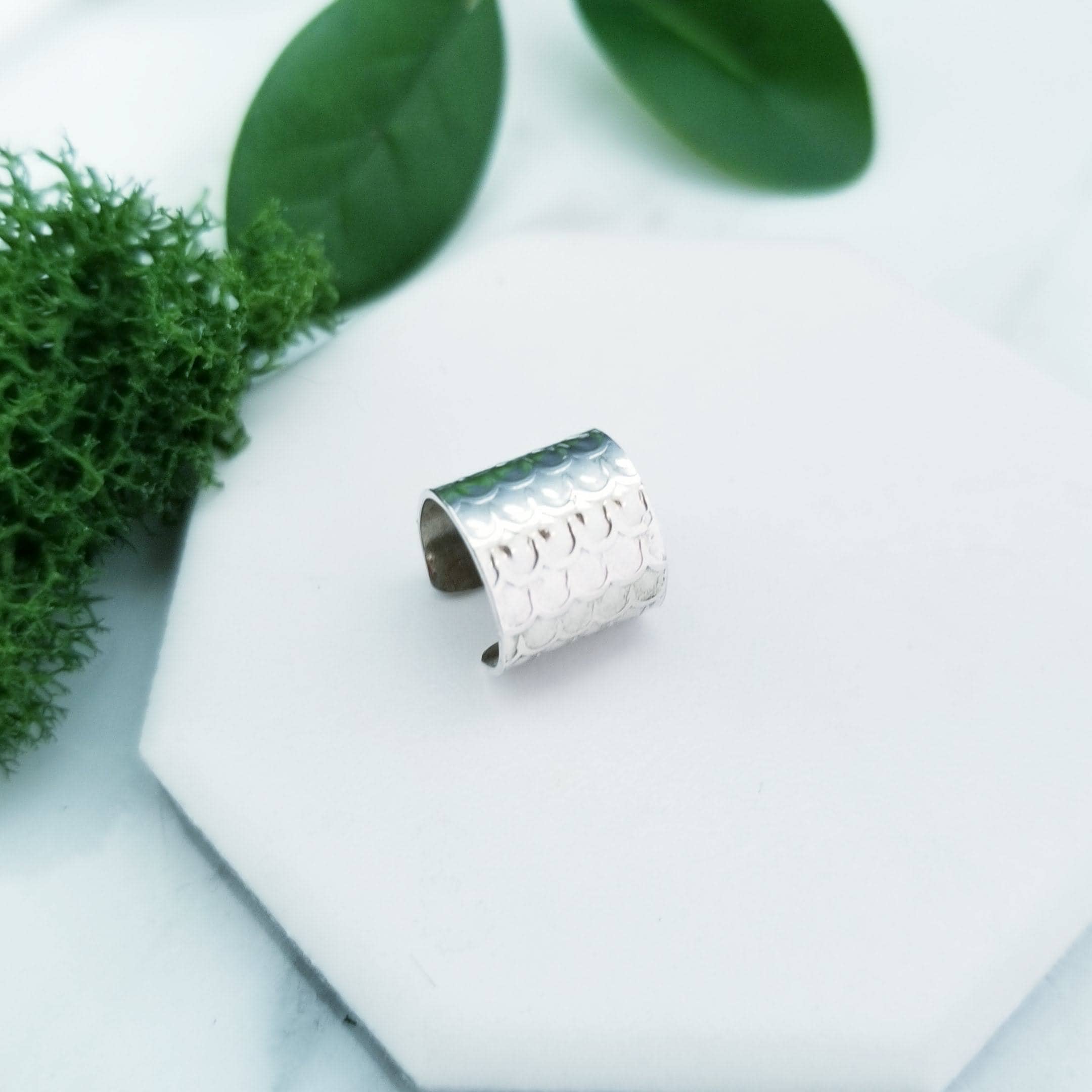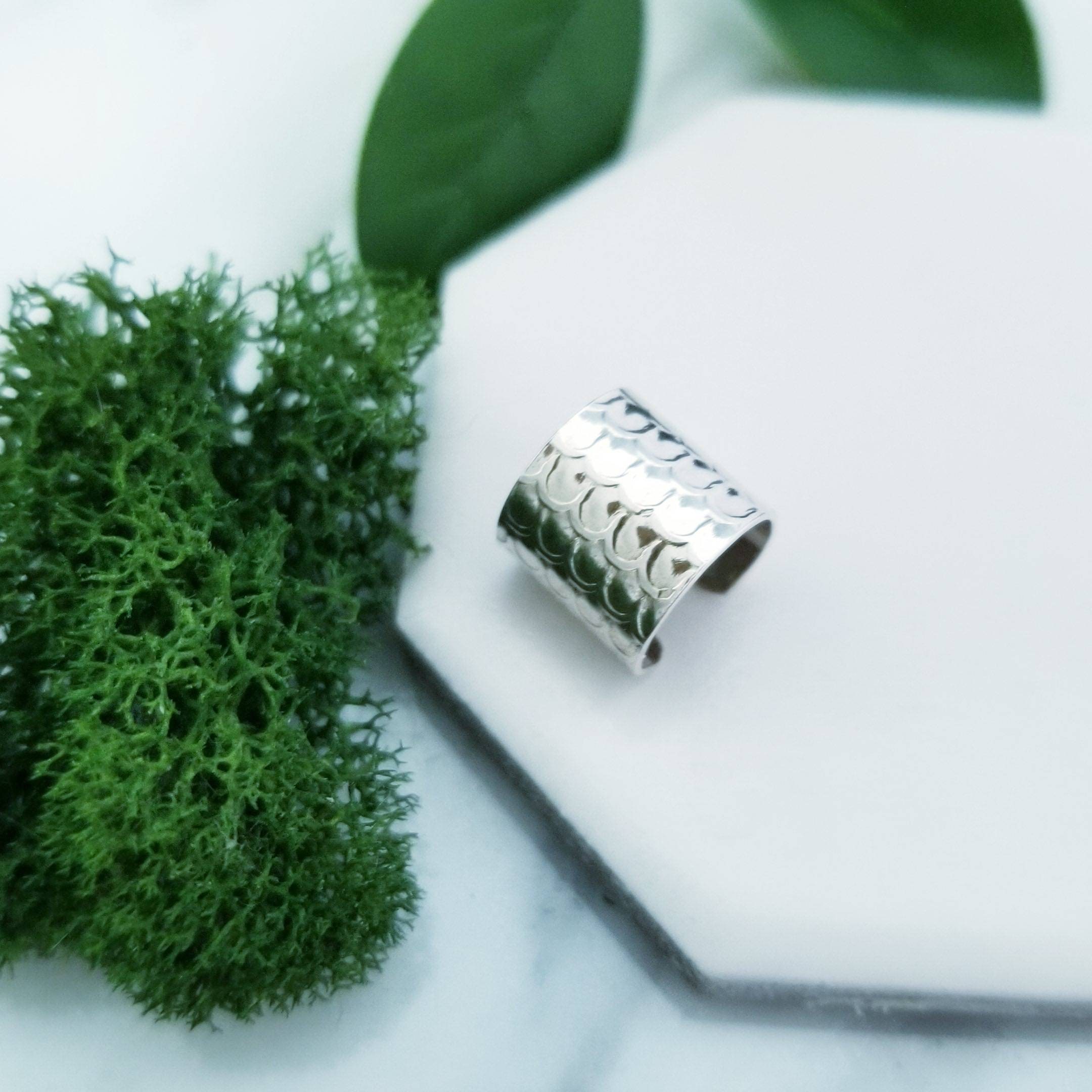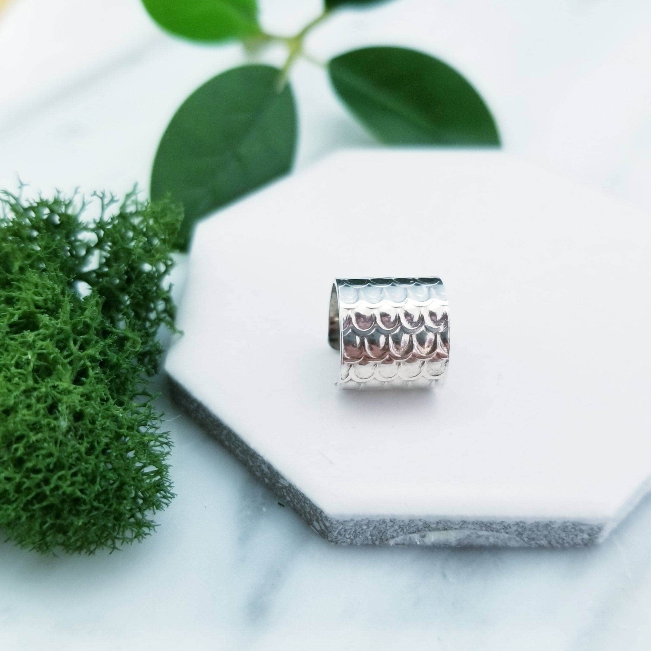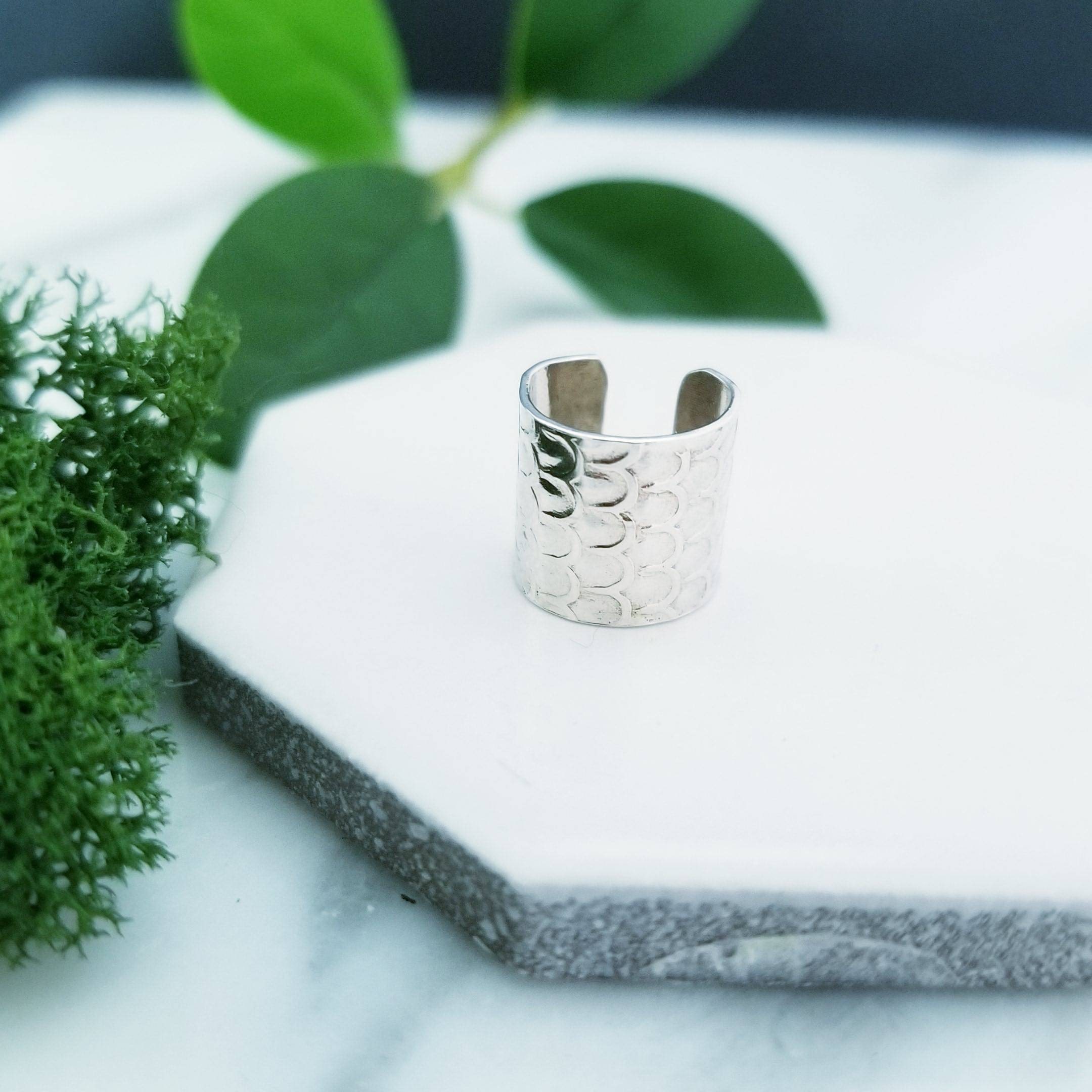 Still light & comfortable, 10mm wide sterling silver wire has been embossed in a dragon scale pattern and is formed into a small hoop, simply slide onto your upper ear at the top.