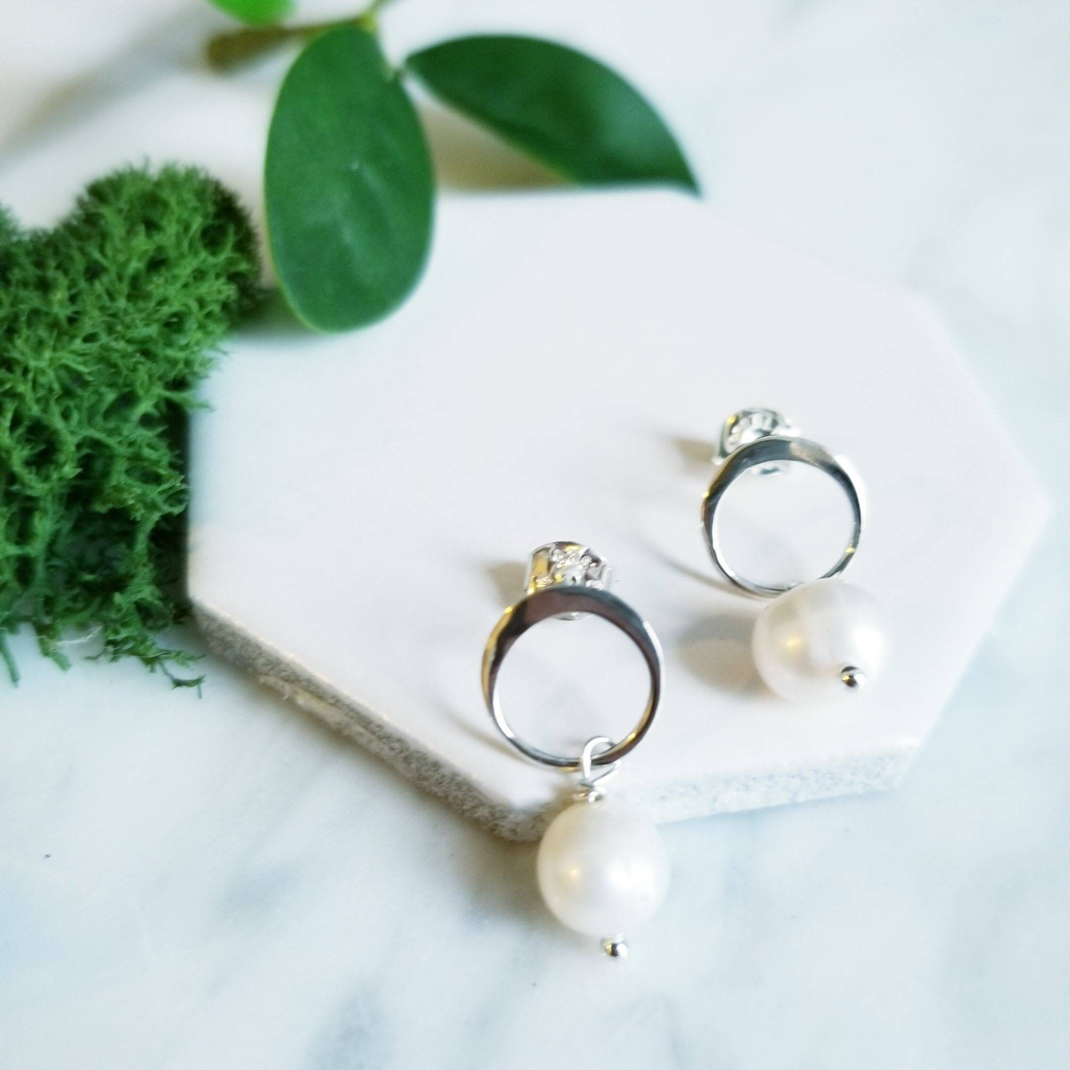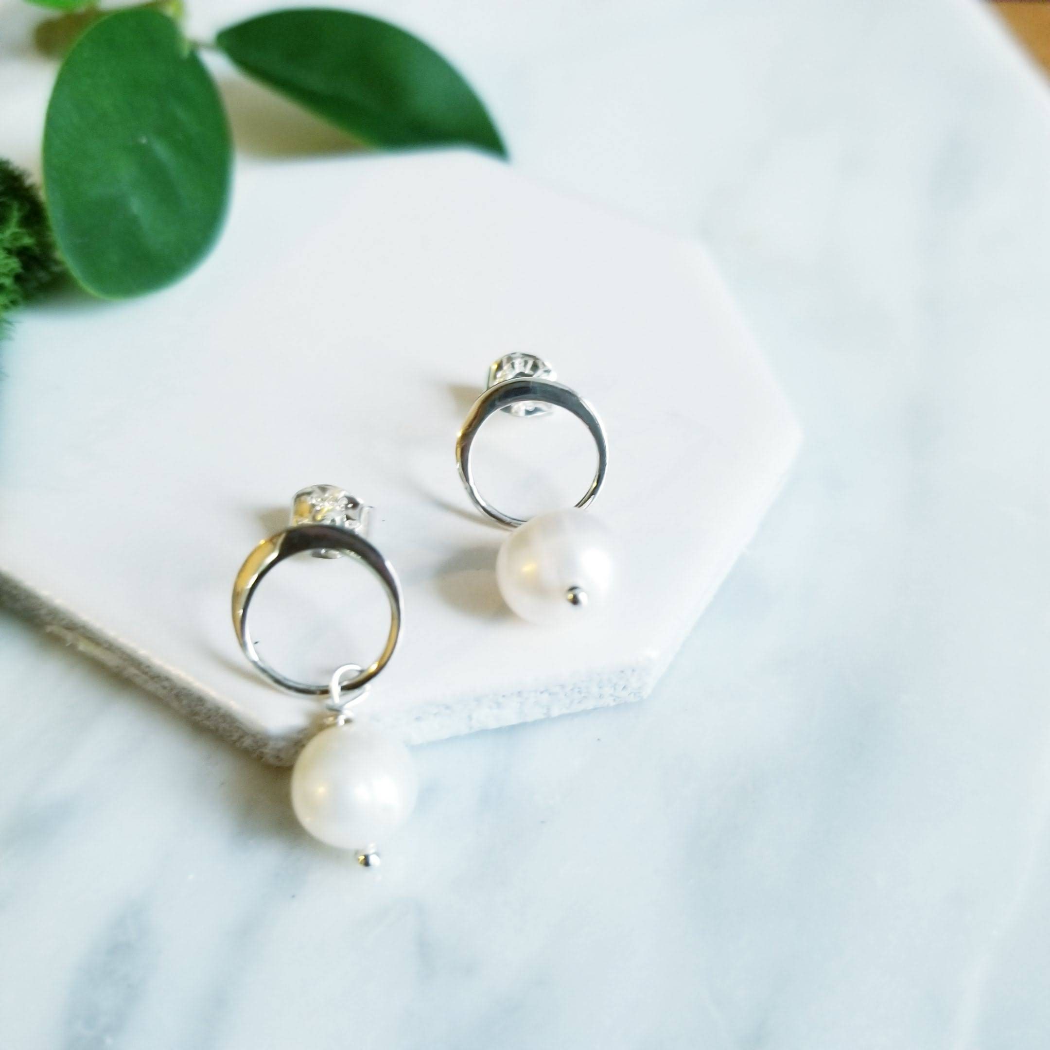 Pretty large pearls are wire-wrapped to a circle post sterling silver earring.