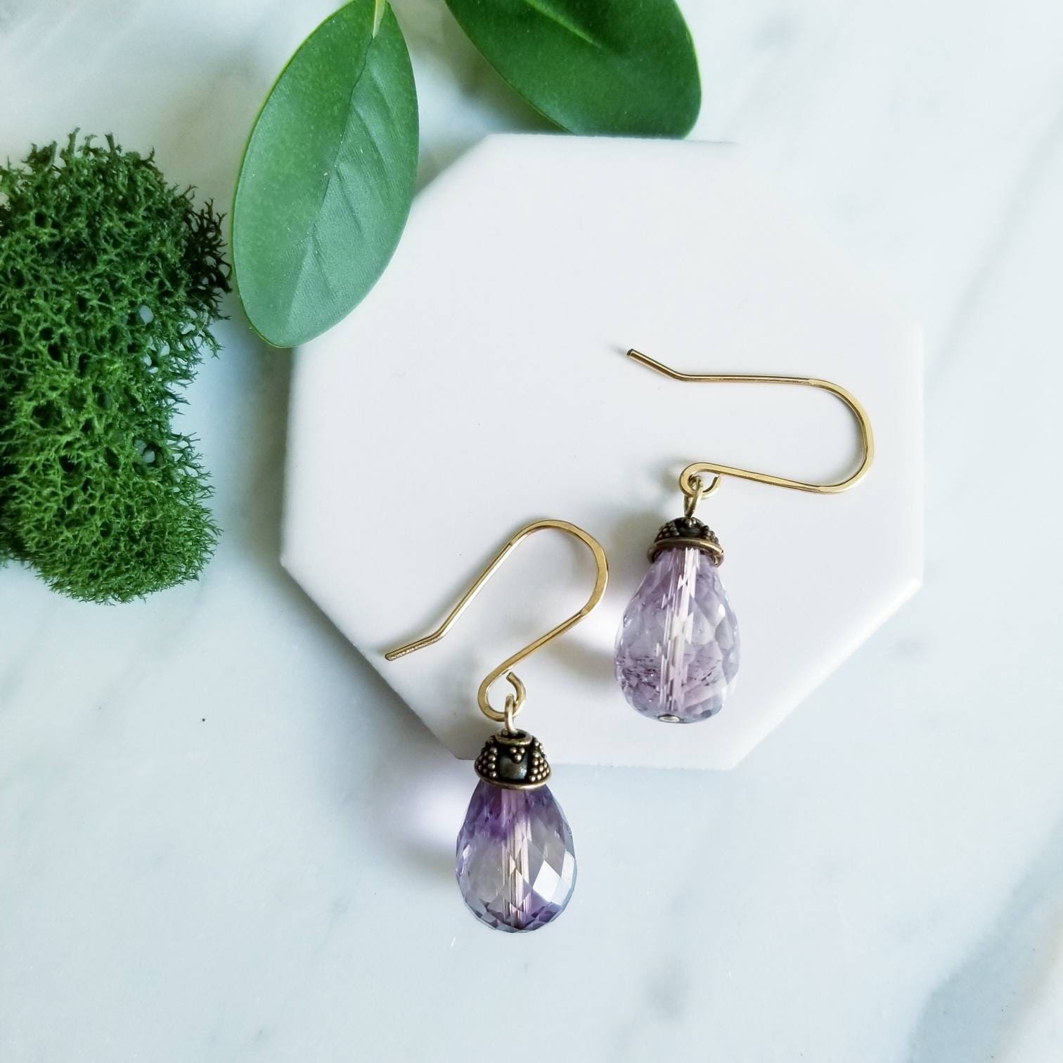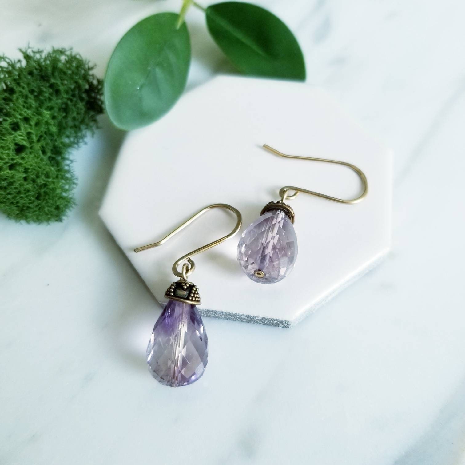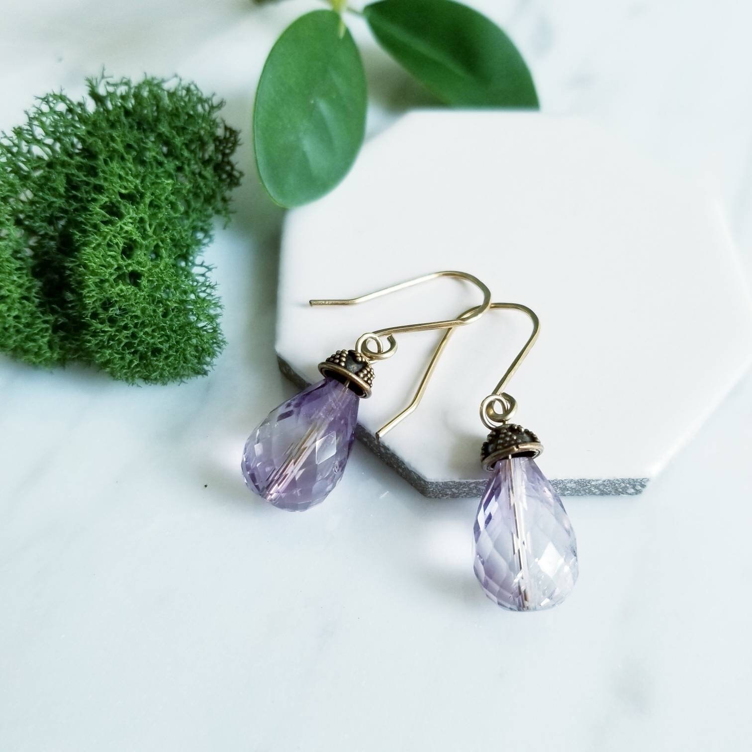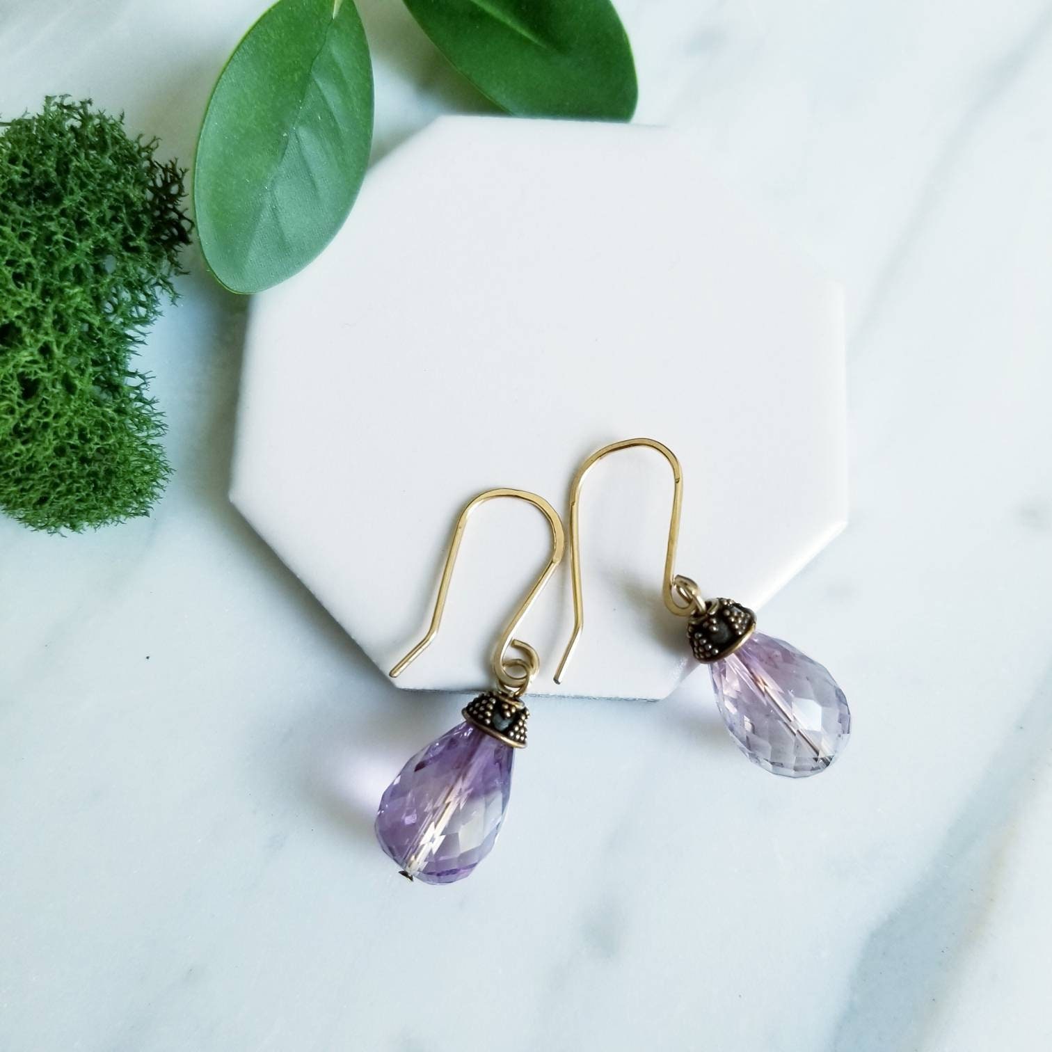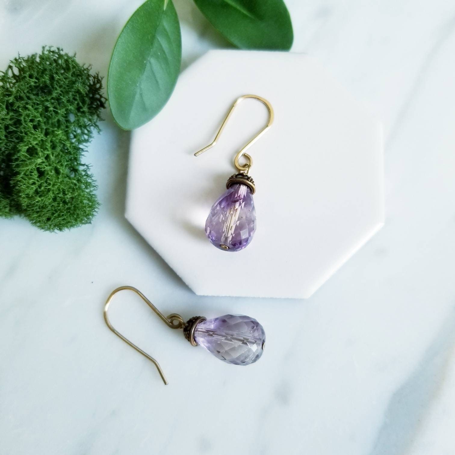 Beautiful droplets of faceted amethyst stones are suspended from all 14K Gold Filled earrings. A small antiqued 14K Goldfill cap & hand forged ear wires.