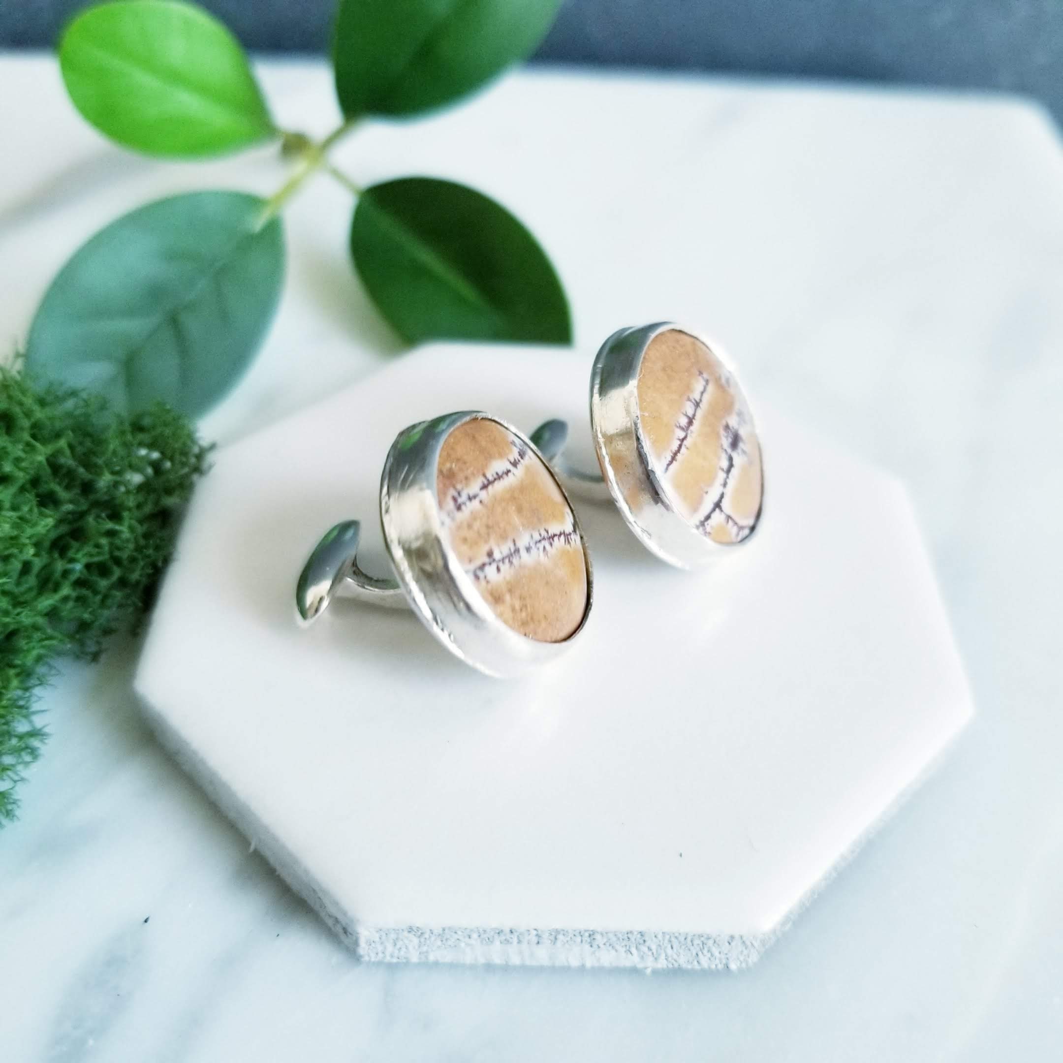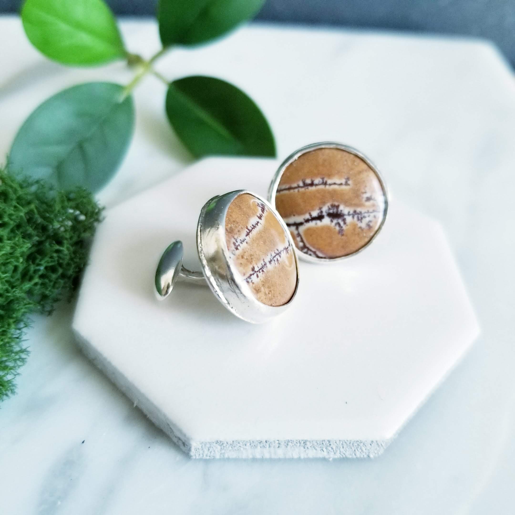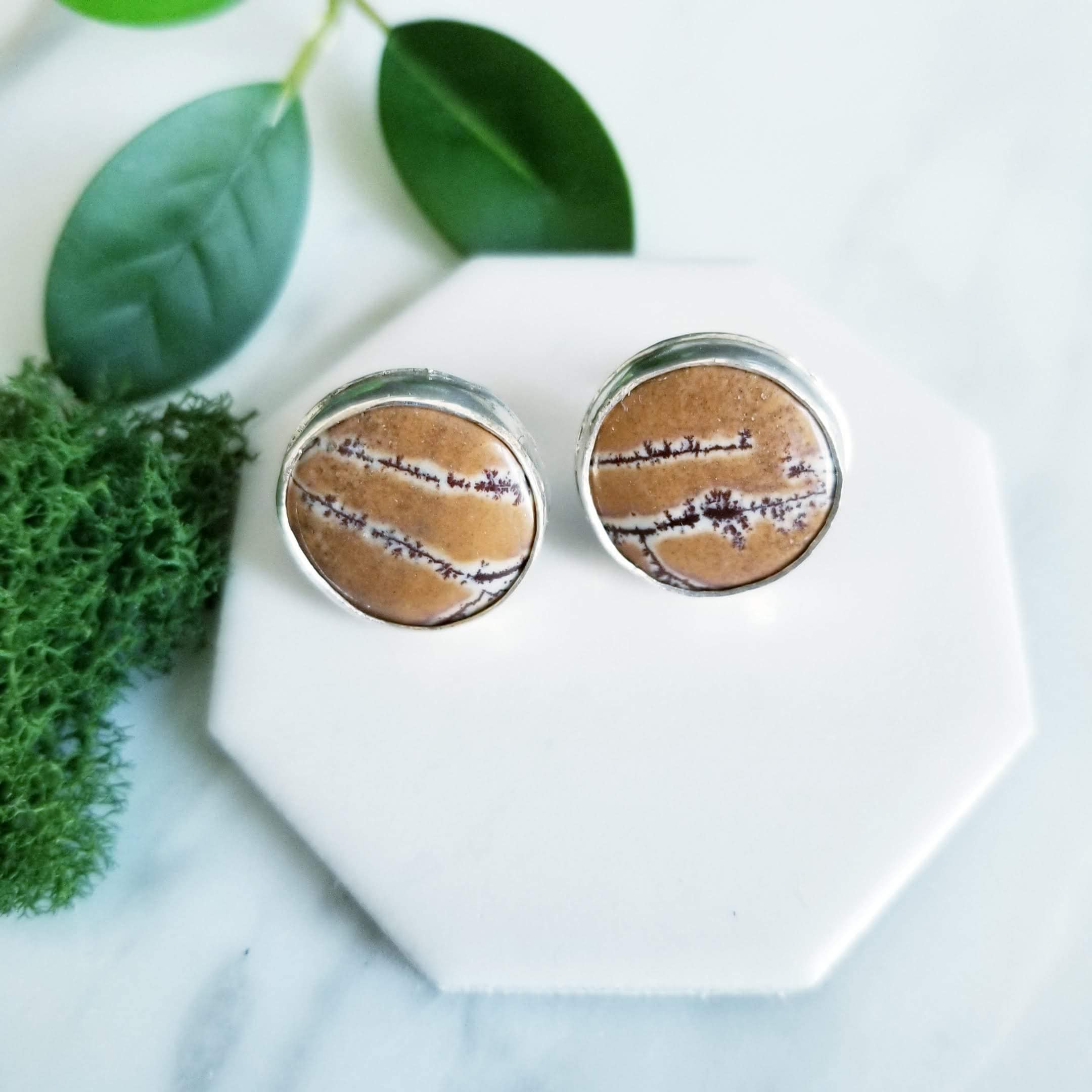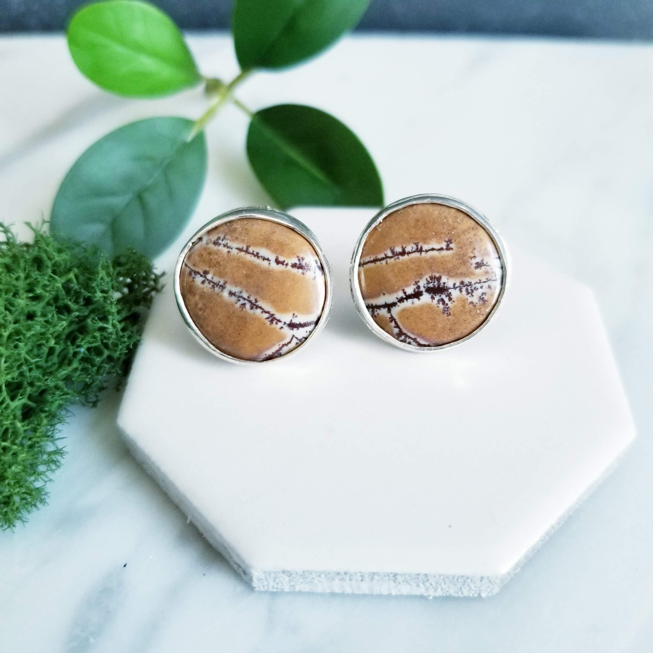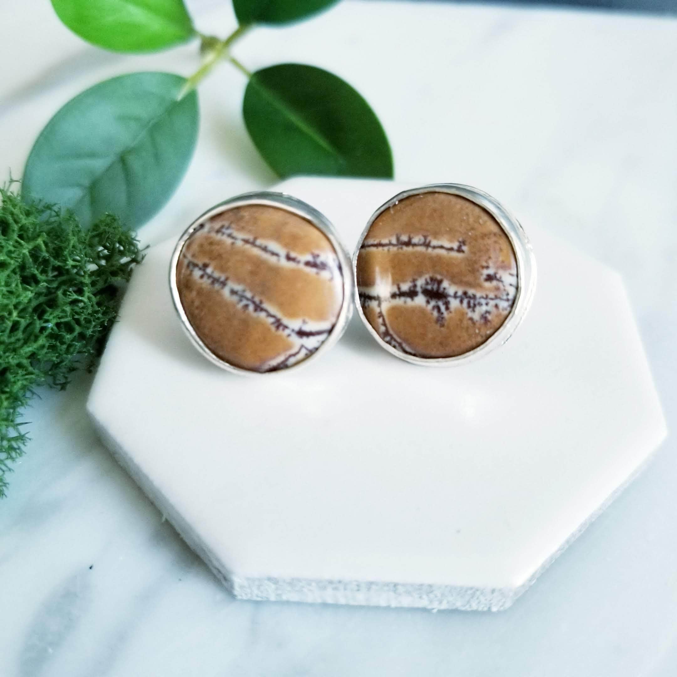 Beautiful stones from Mexico are set in fine & sterling silver. The round stones are in shades of orange, deep tan & chocolate brown. The stones are 15mm across and the sterling silver is given a brushed finish.