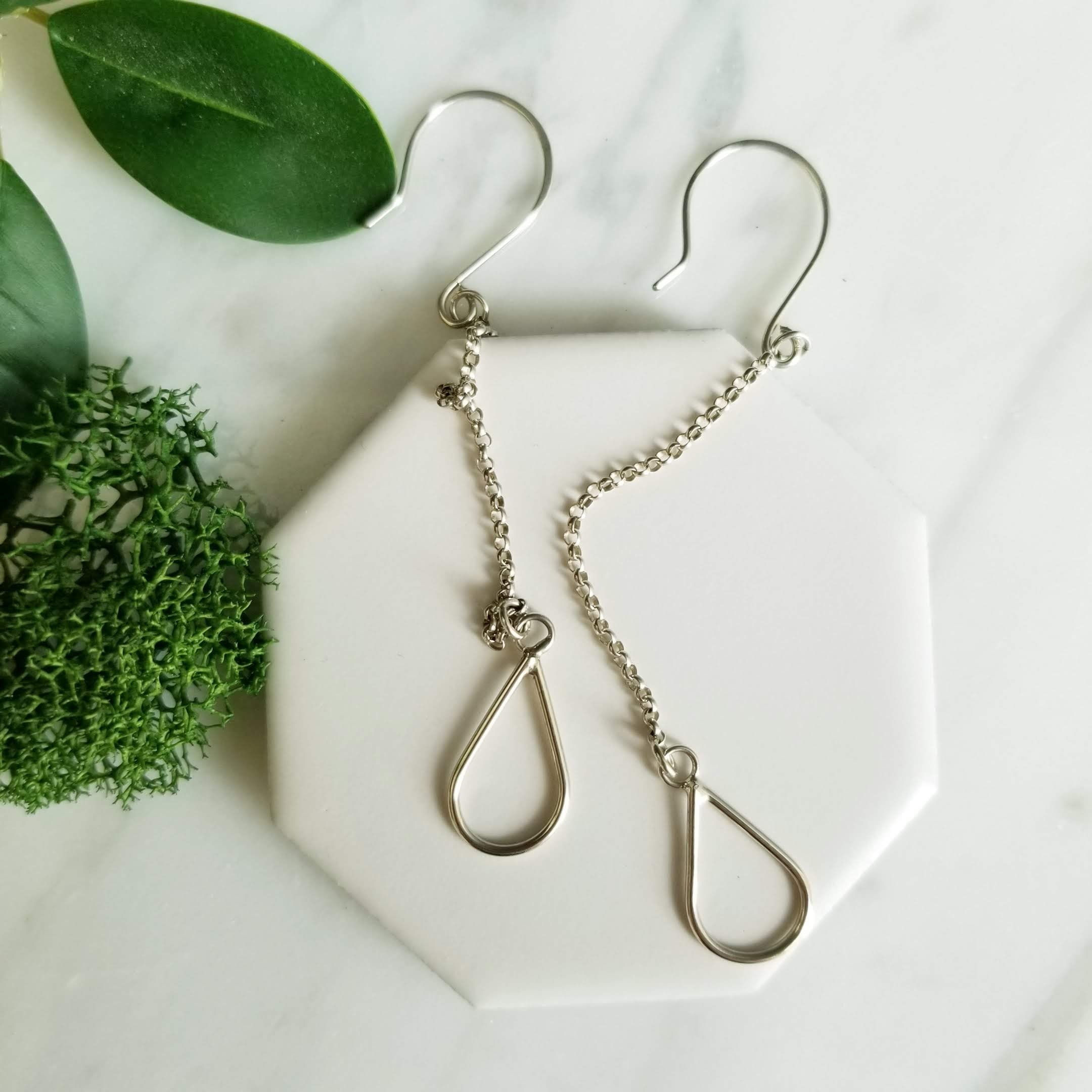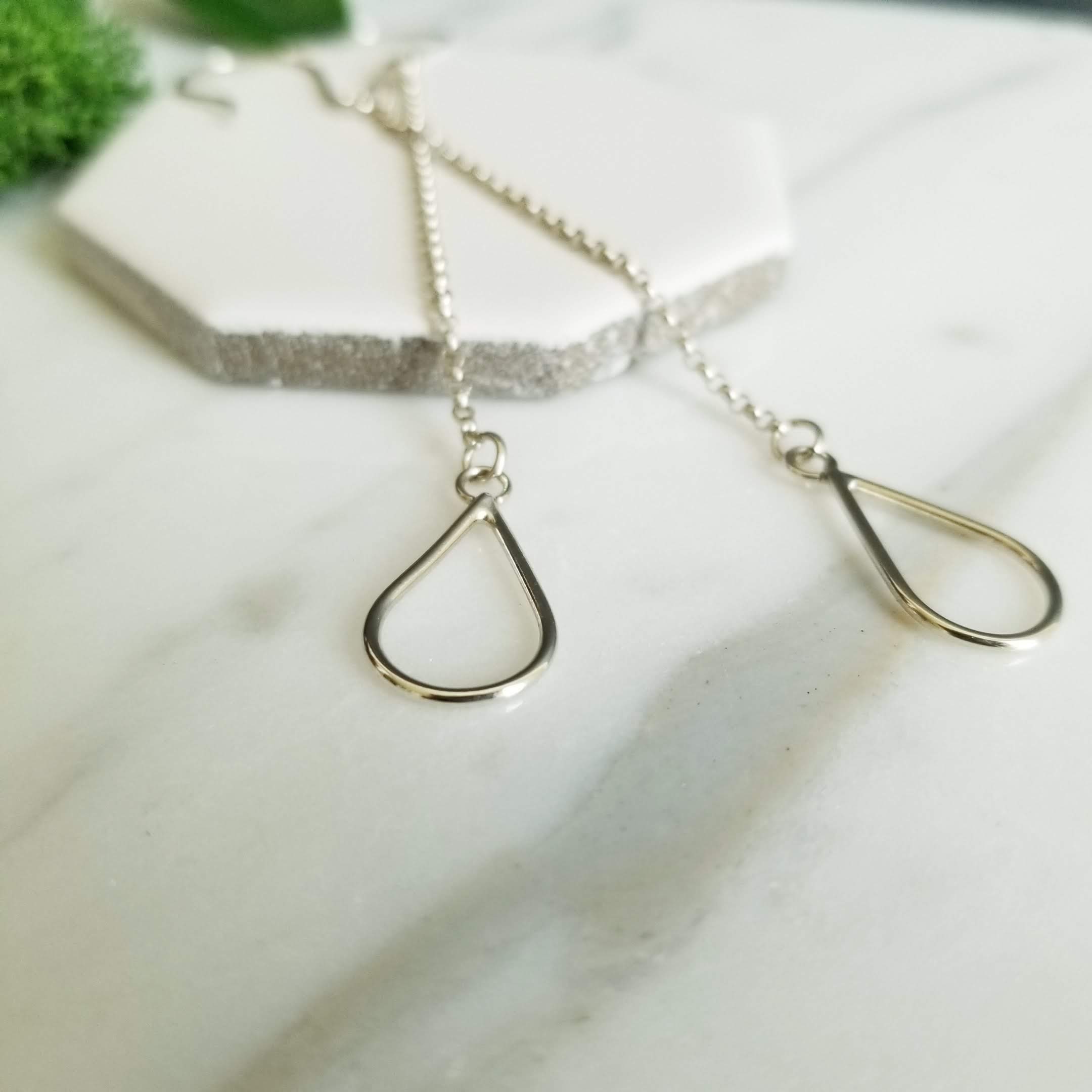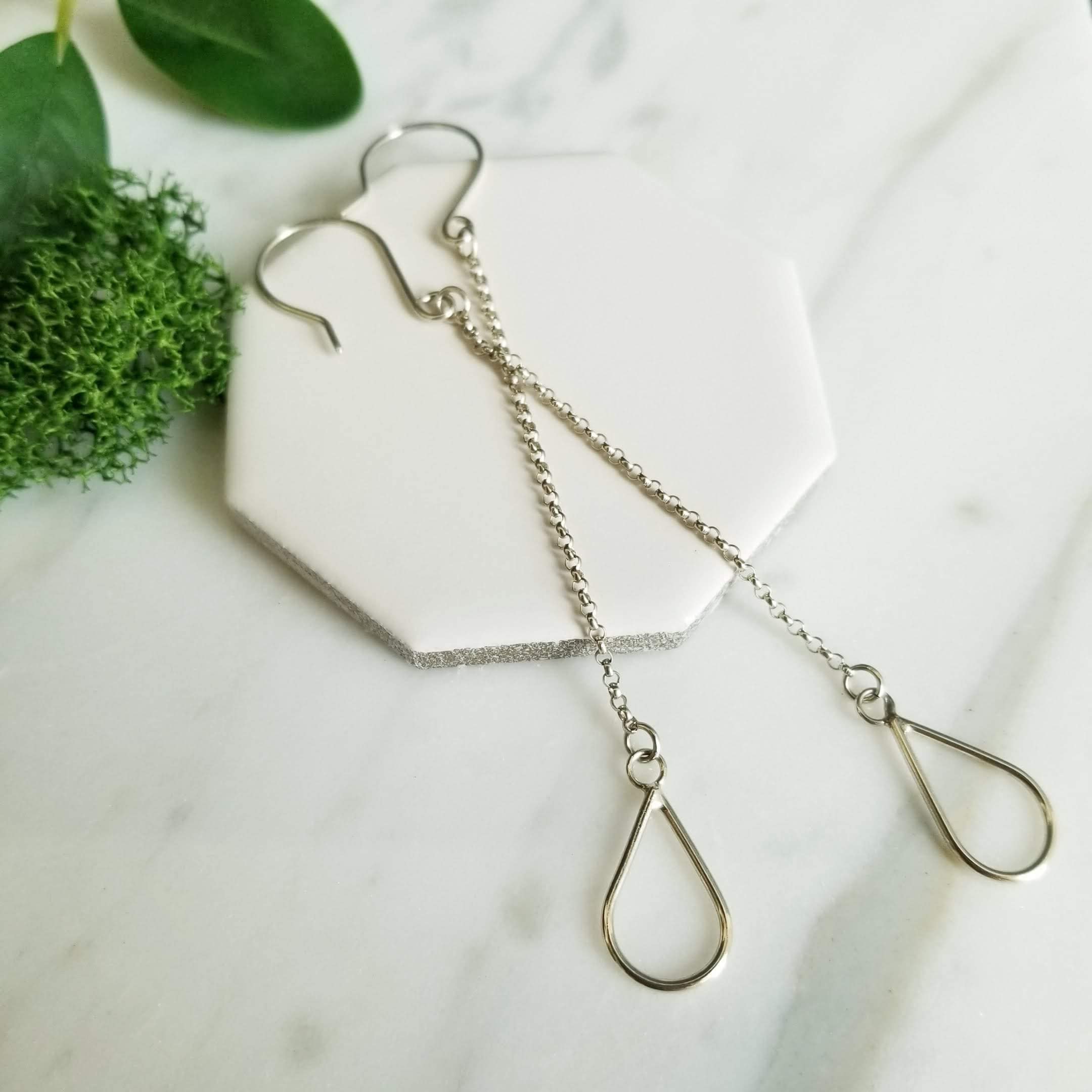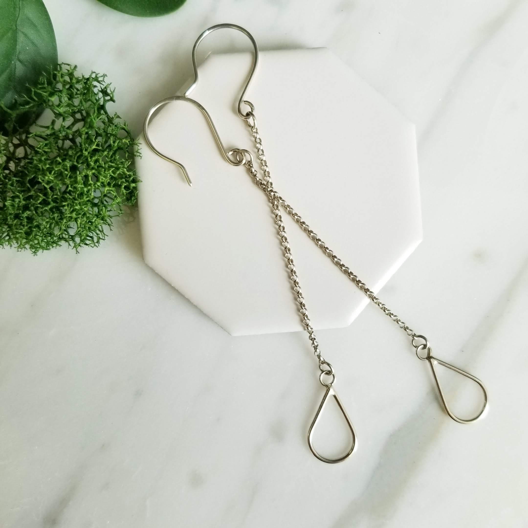 Sterling Silver Tear drop or Rain Drop Long Shoulder Duster Chain Earrings, modern minimalist earrings in a fresh teardrop shape.