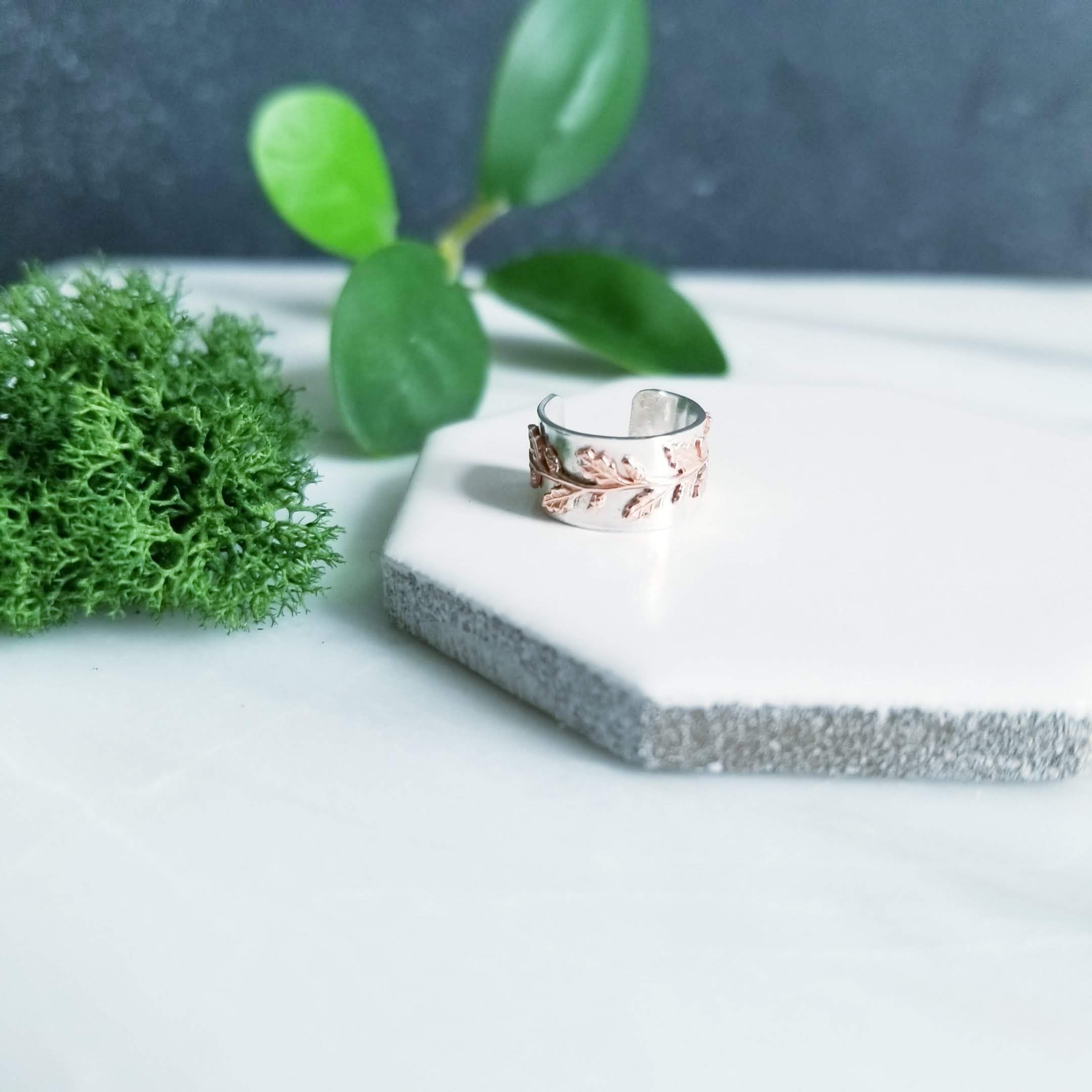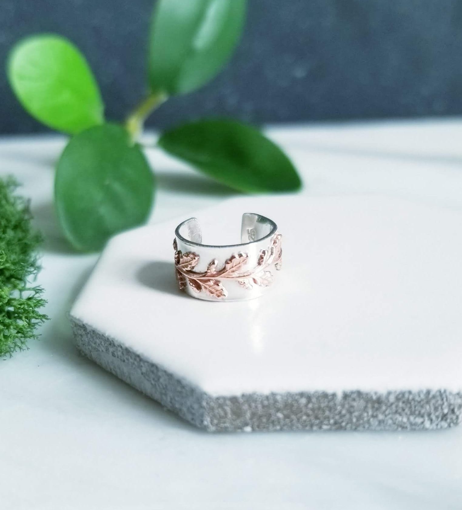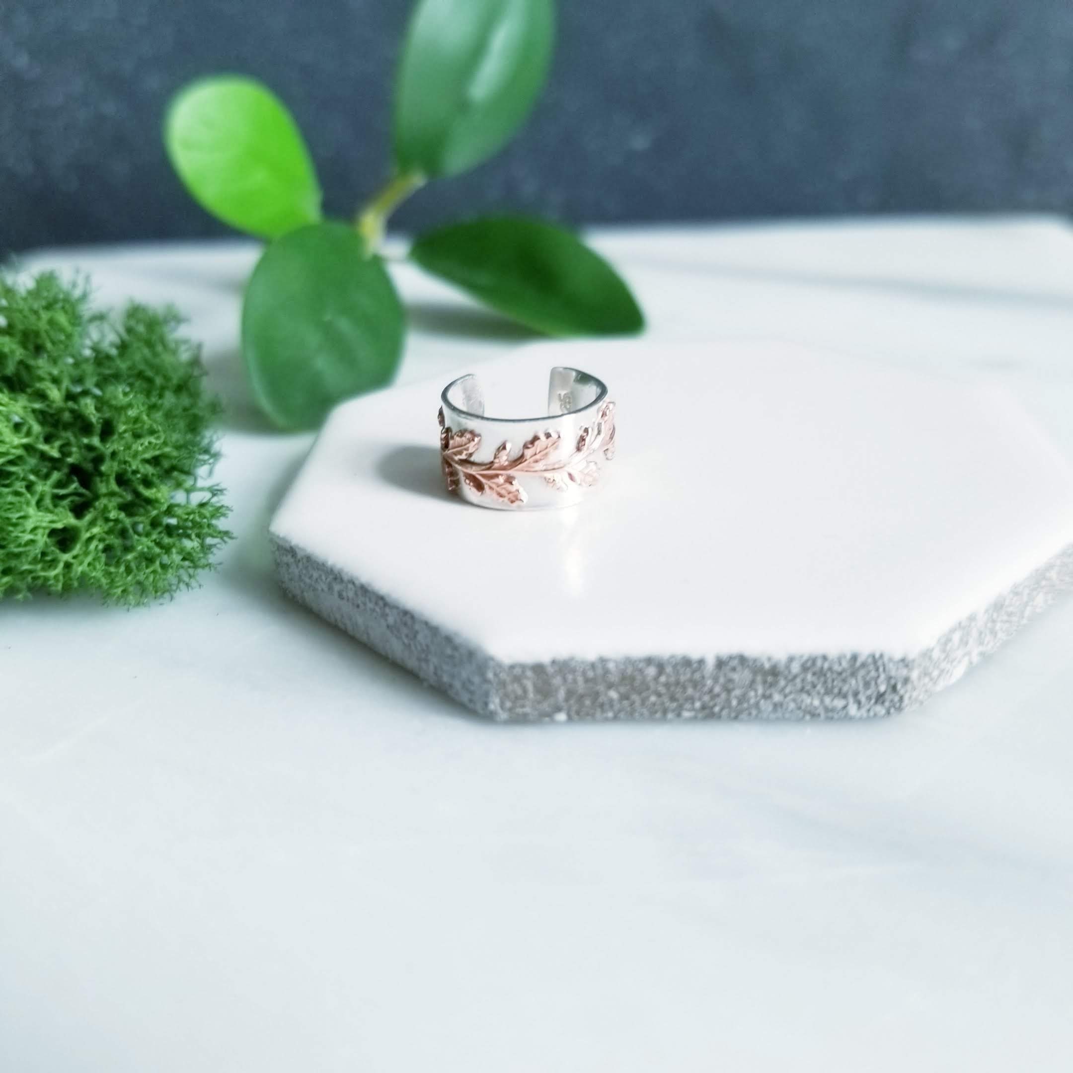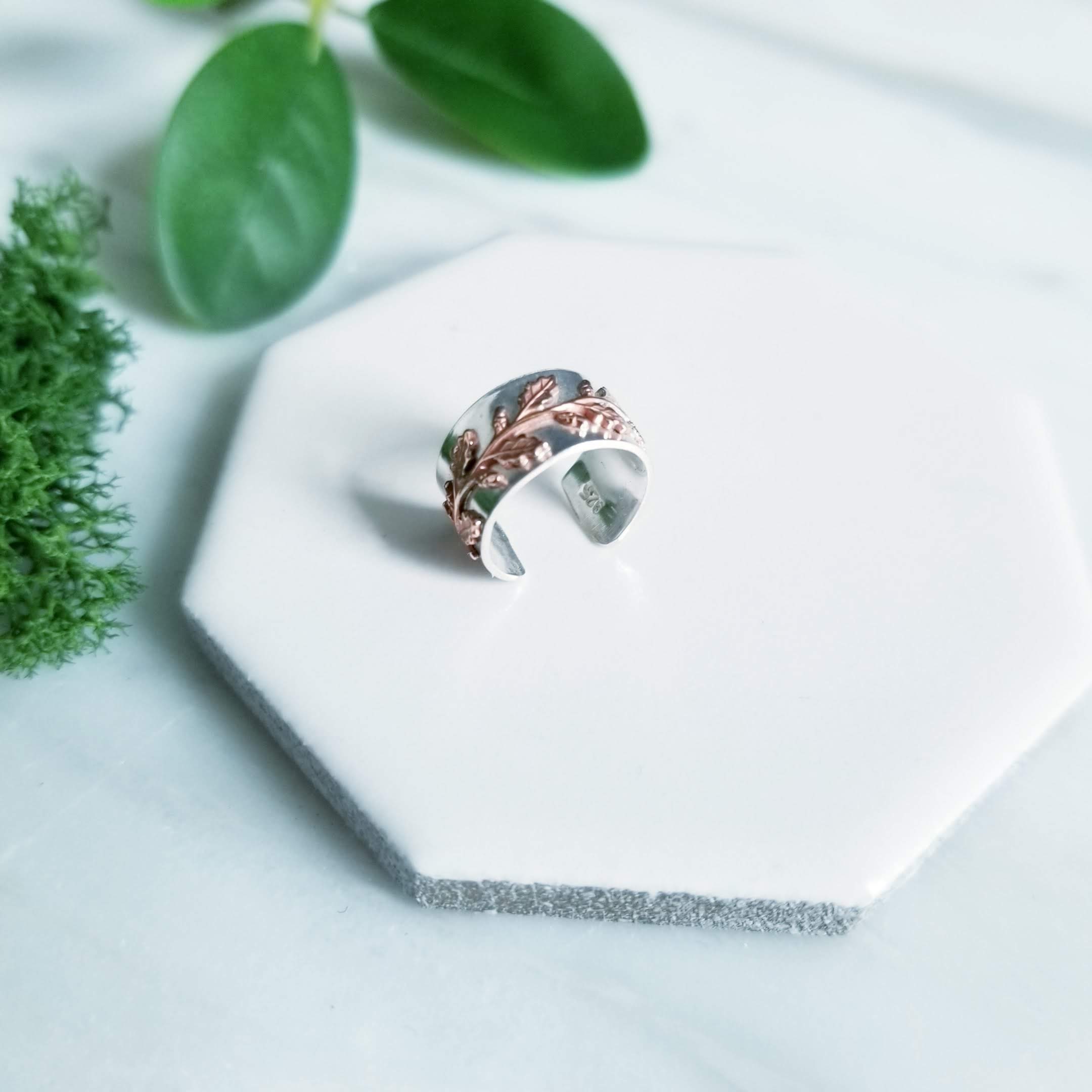 Sterling silver ear cuff base with a soldered on copper leaf branch garland soldered on and formed into a small circle, simply slide onto your upper ear at the top. 6mm wide.