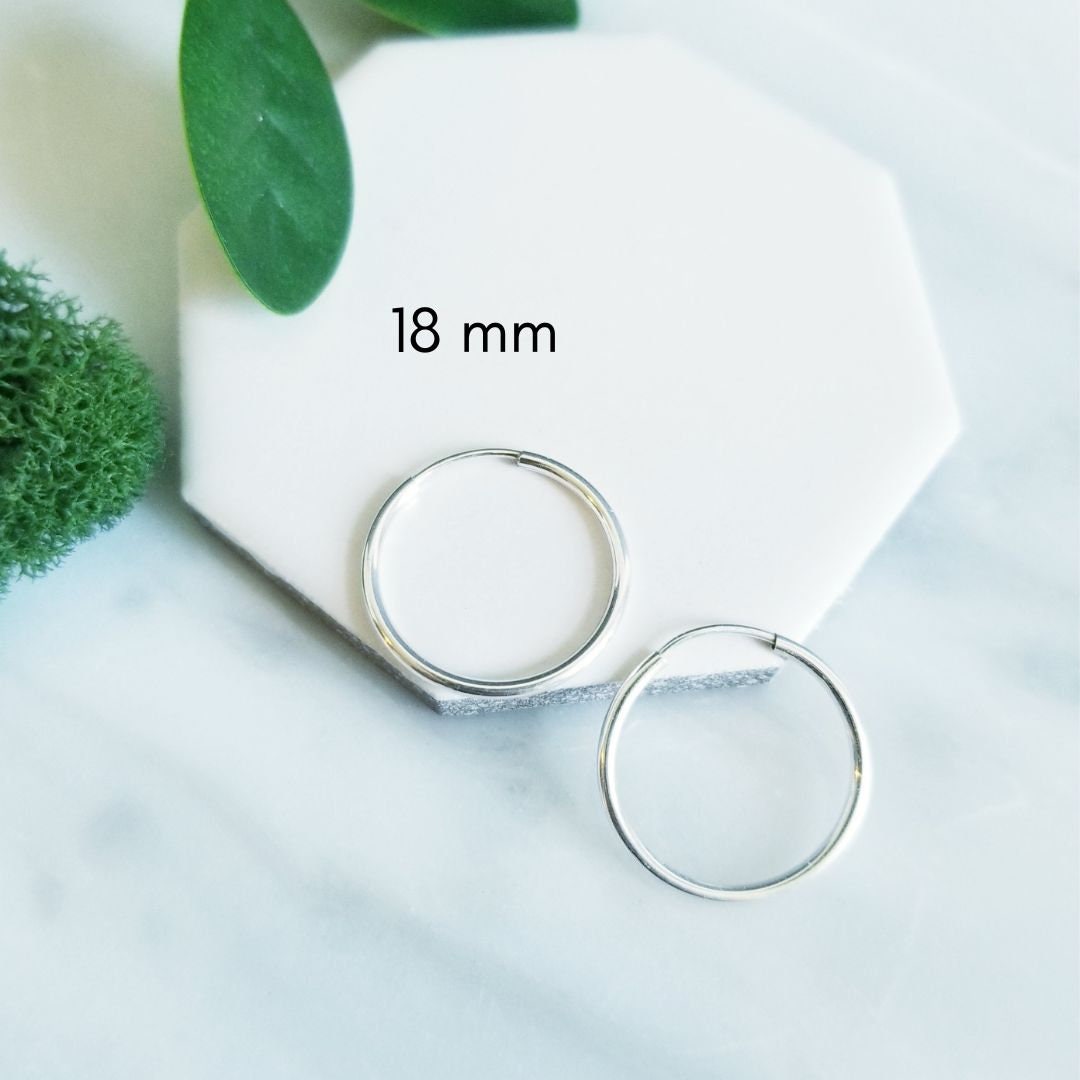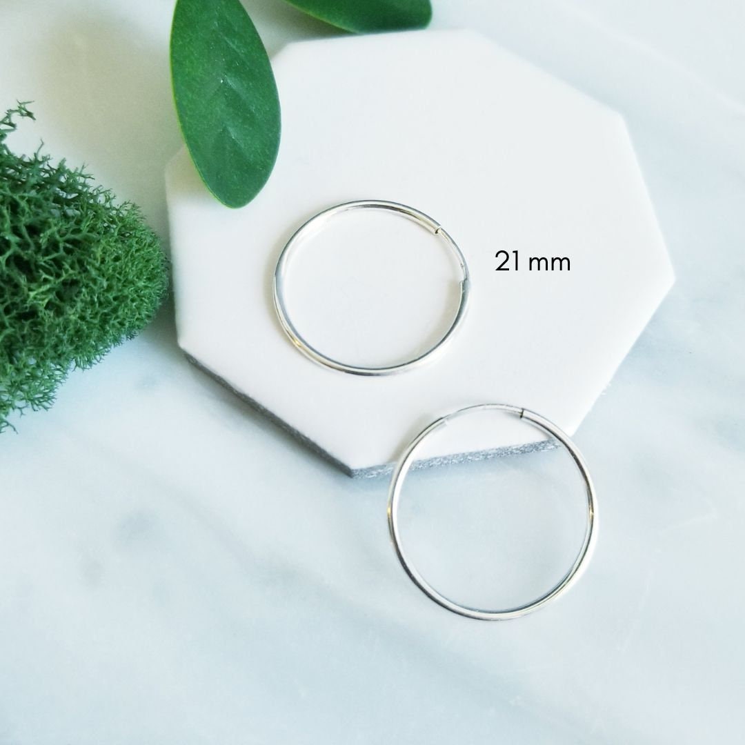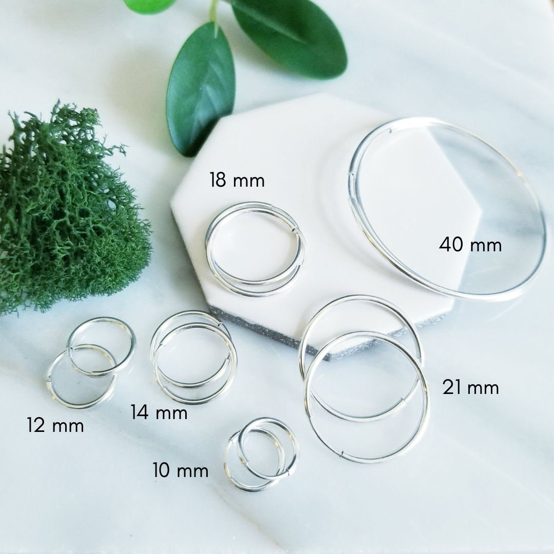 Endless hoop earrings in sterling silver, classic hoop earrings in the size of your choice. Sizes represent the exterior diameter of the earrings, please make sure that the distance between your piercing and the edge of your ear lobe will fit the hoop size.