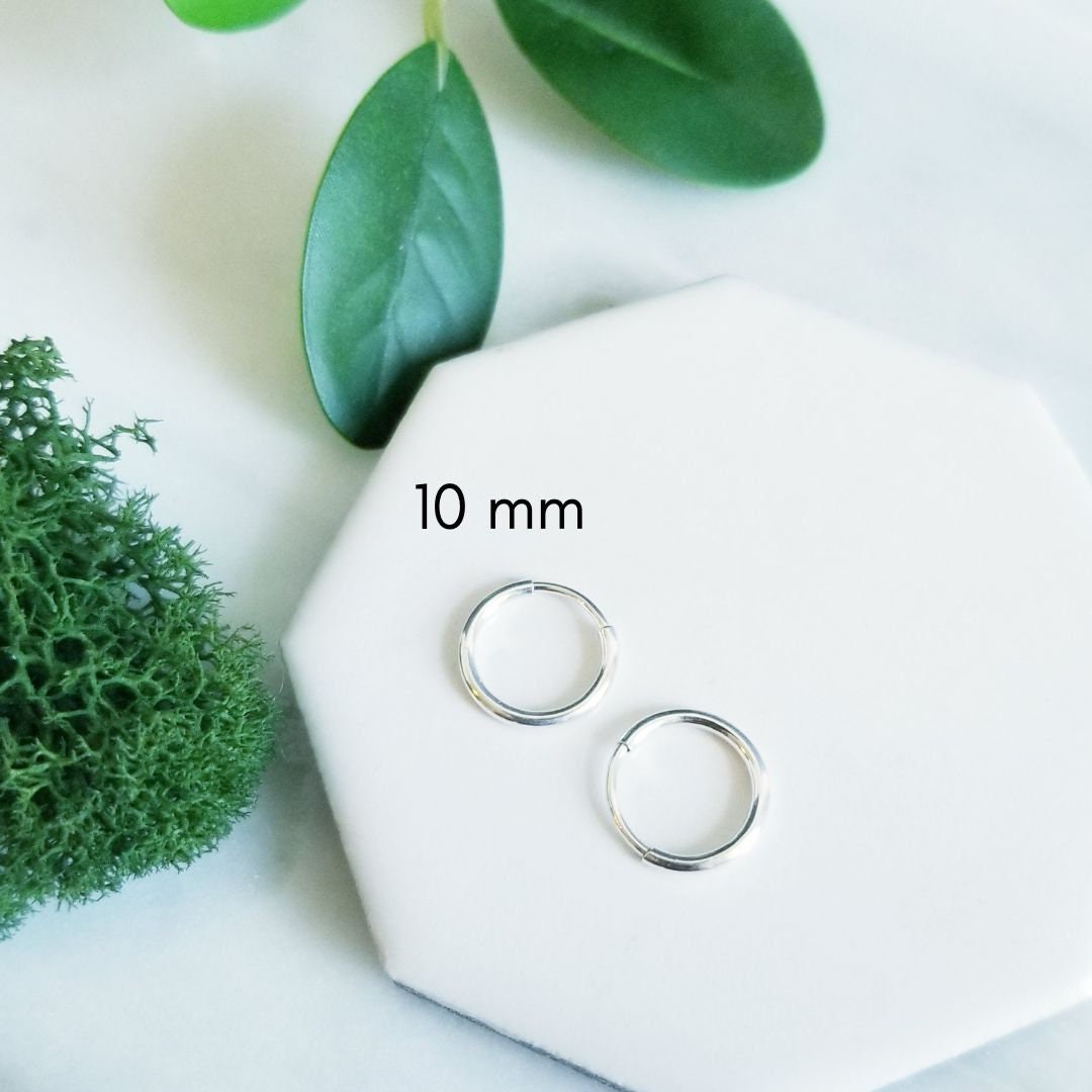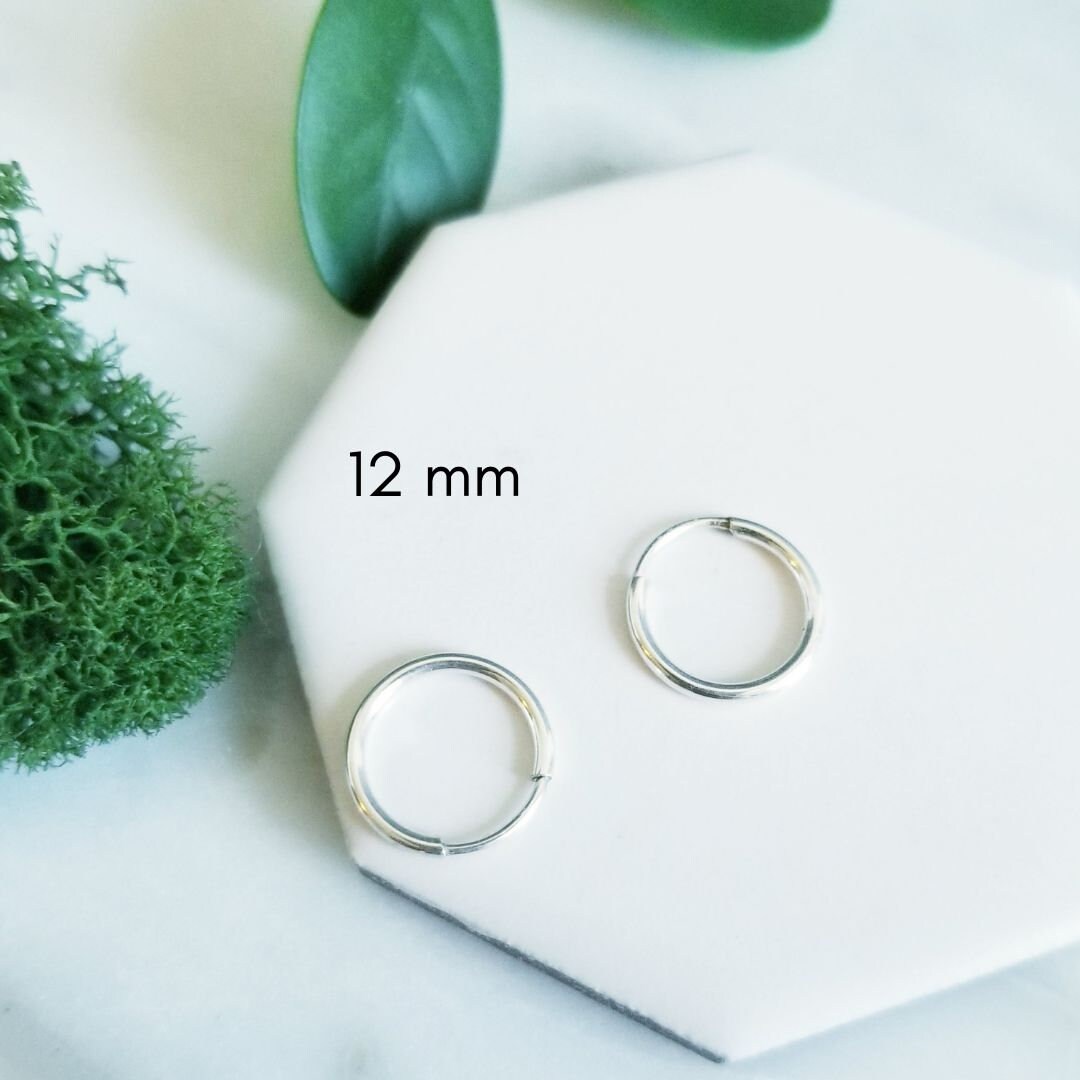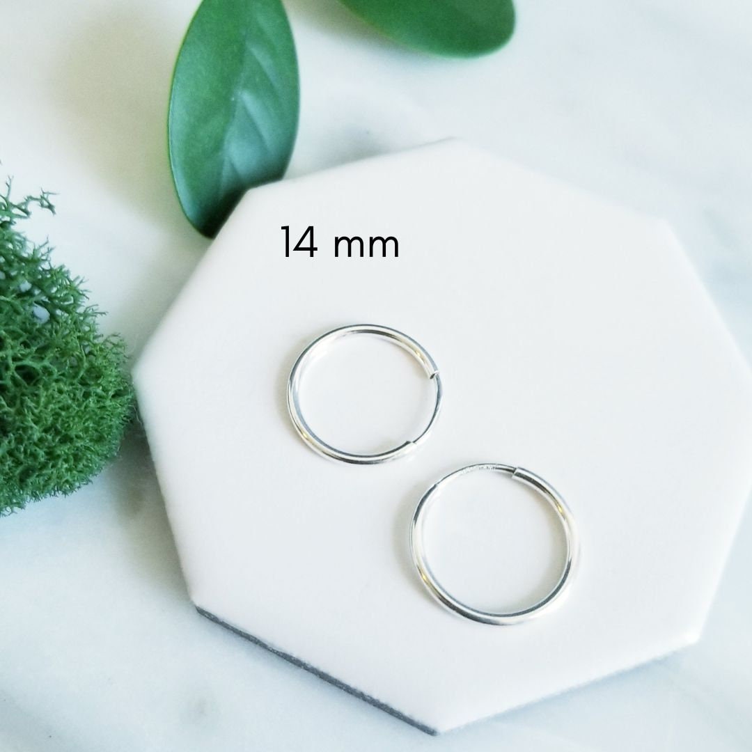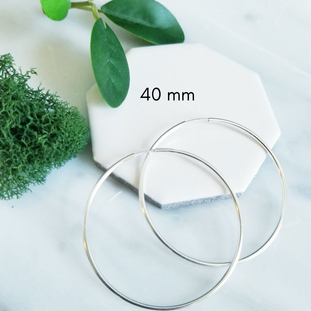 Endless hoop earrings in sterling silver, classic hoop earrings in the size of your choice. Sizes represent the exterior diameter of the earrings, please make sure that the distance between your piercing and the edge of your ear lobe will fit the hoop size.