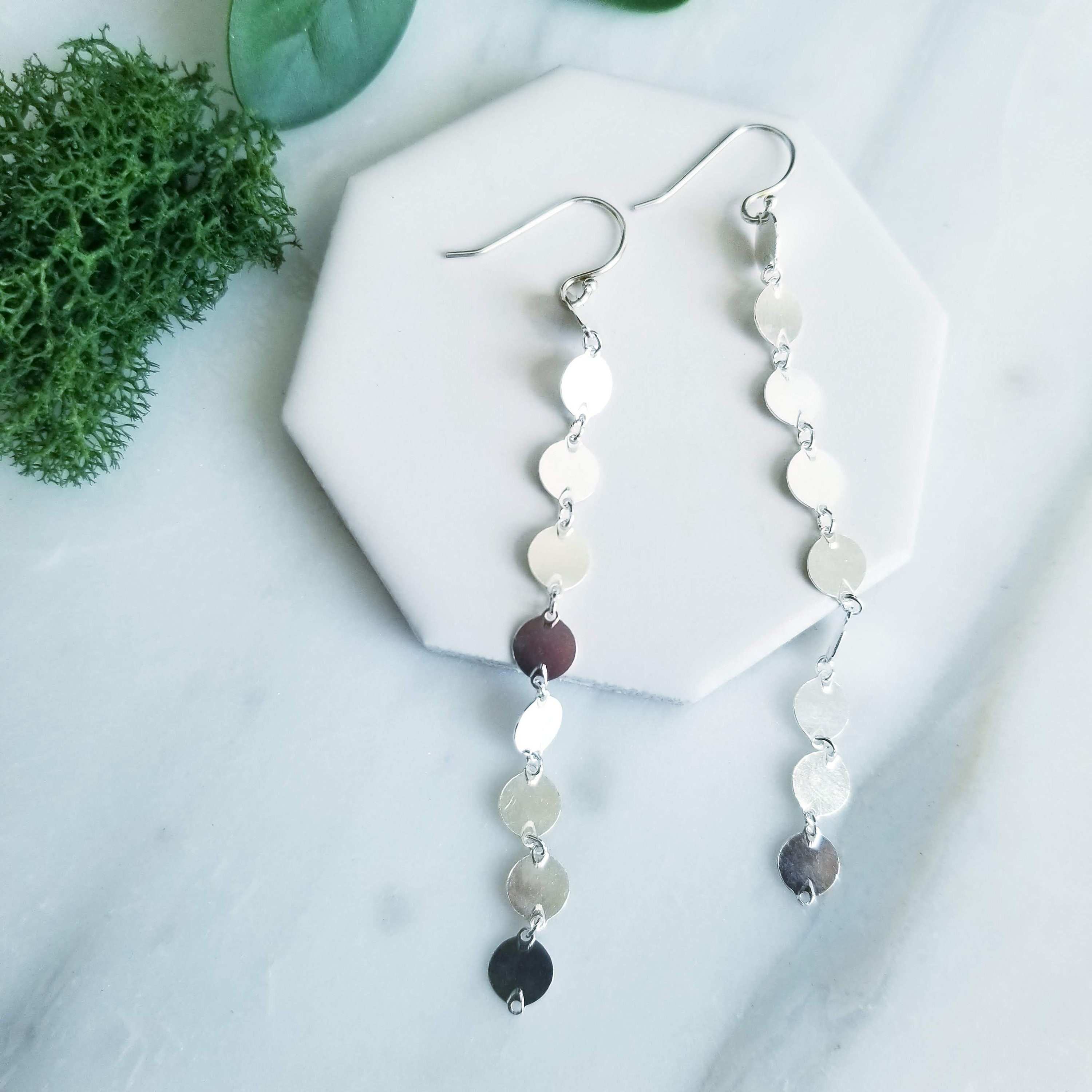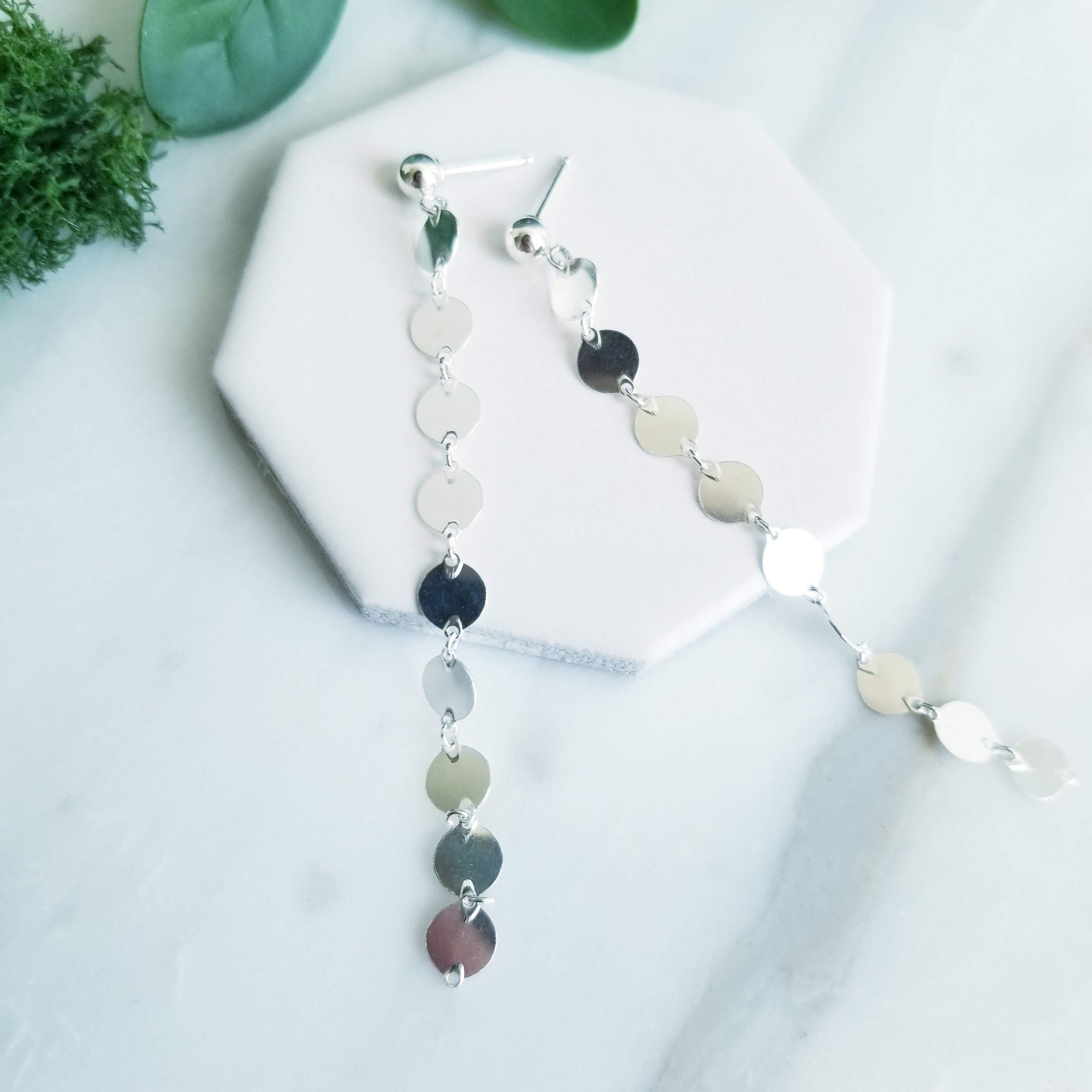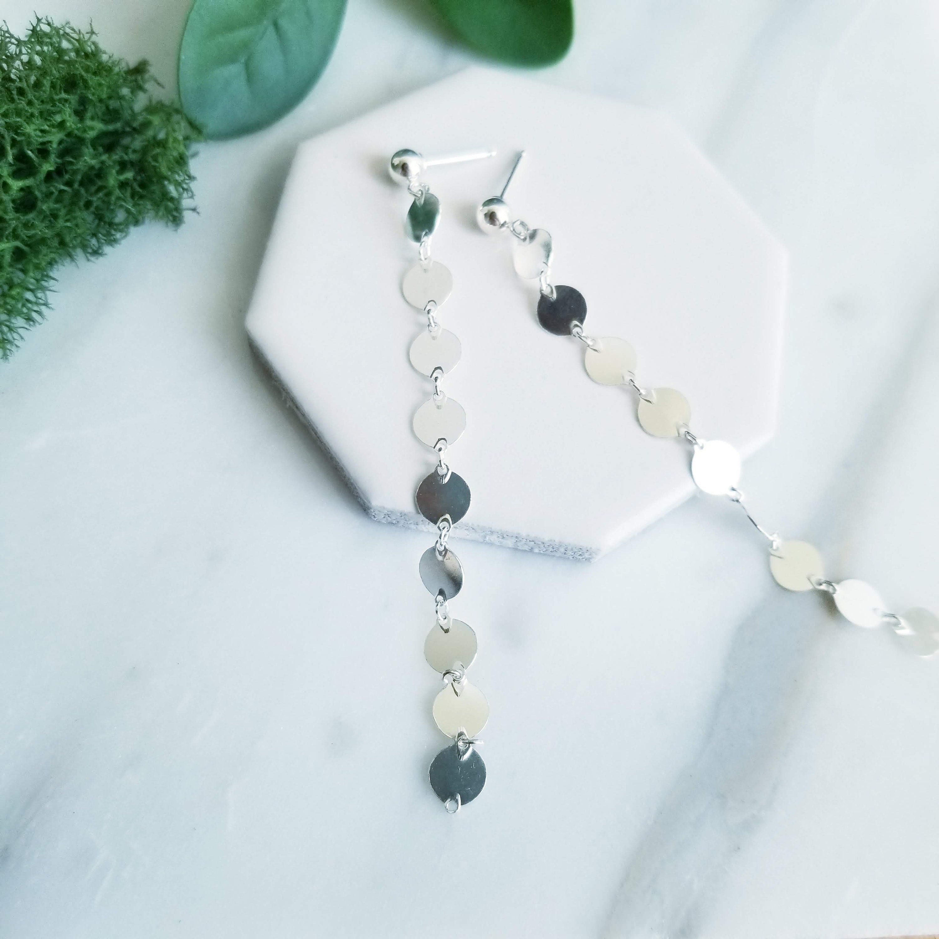Lovely sparkly pair of dainty dangle earrings made of sterling silver. The use of a shiny and sleek sterling silver chain with connected 4mm polished discs adds a touch of elegance.