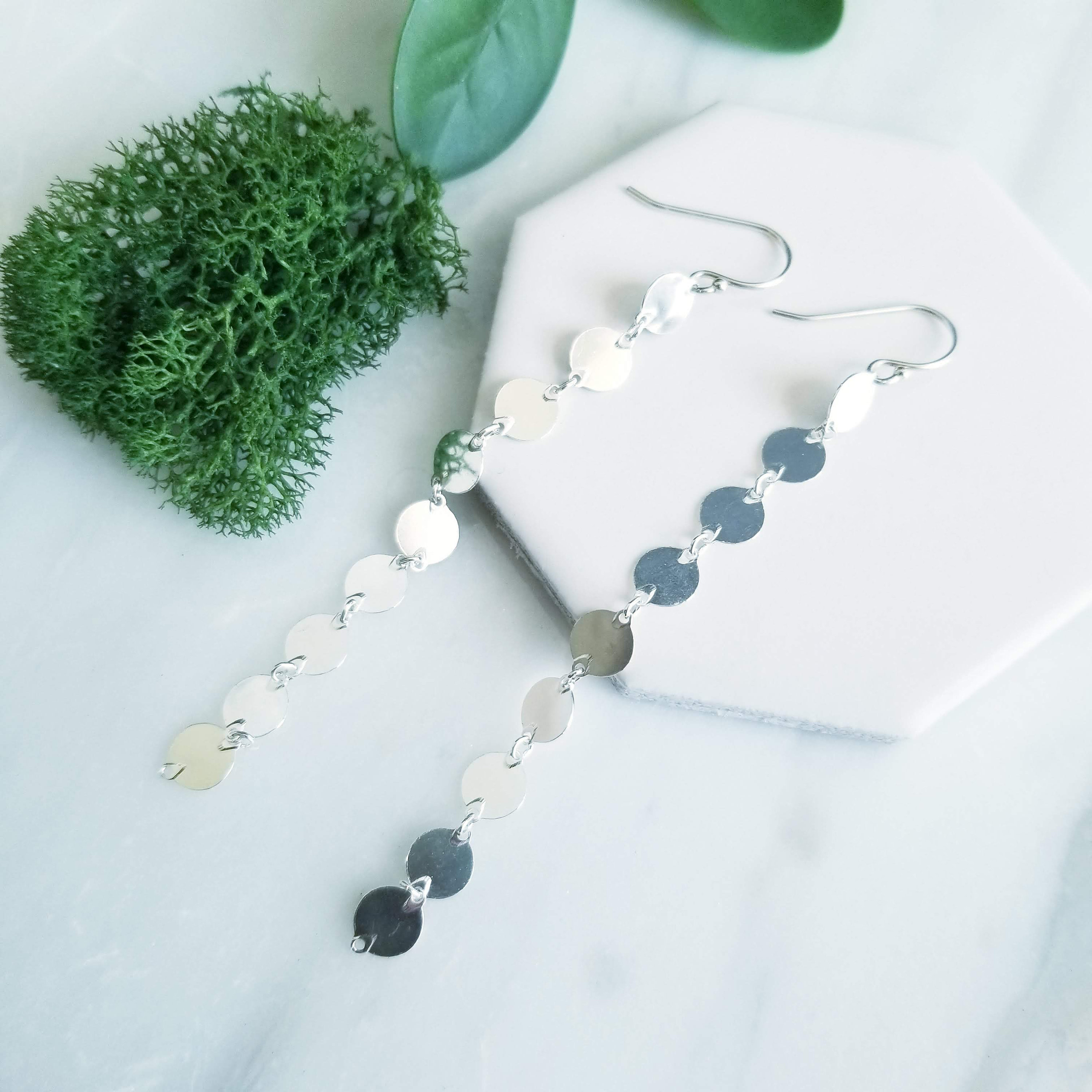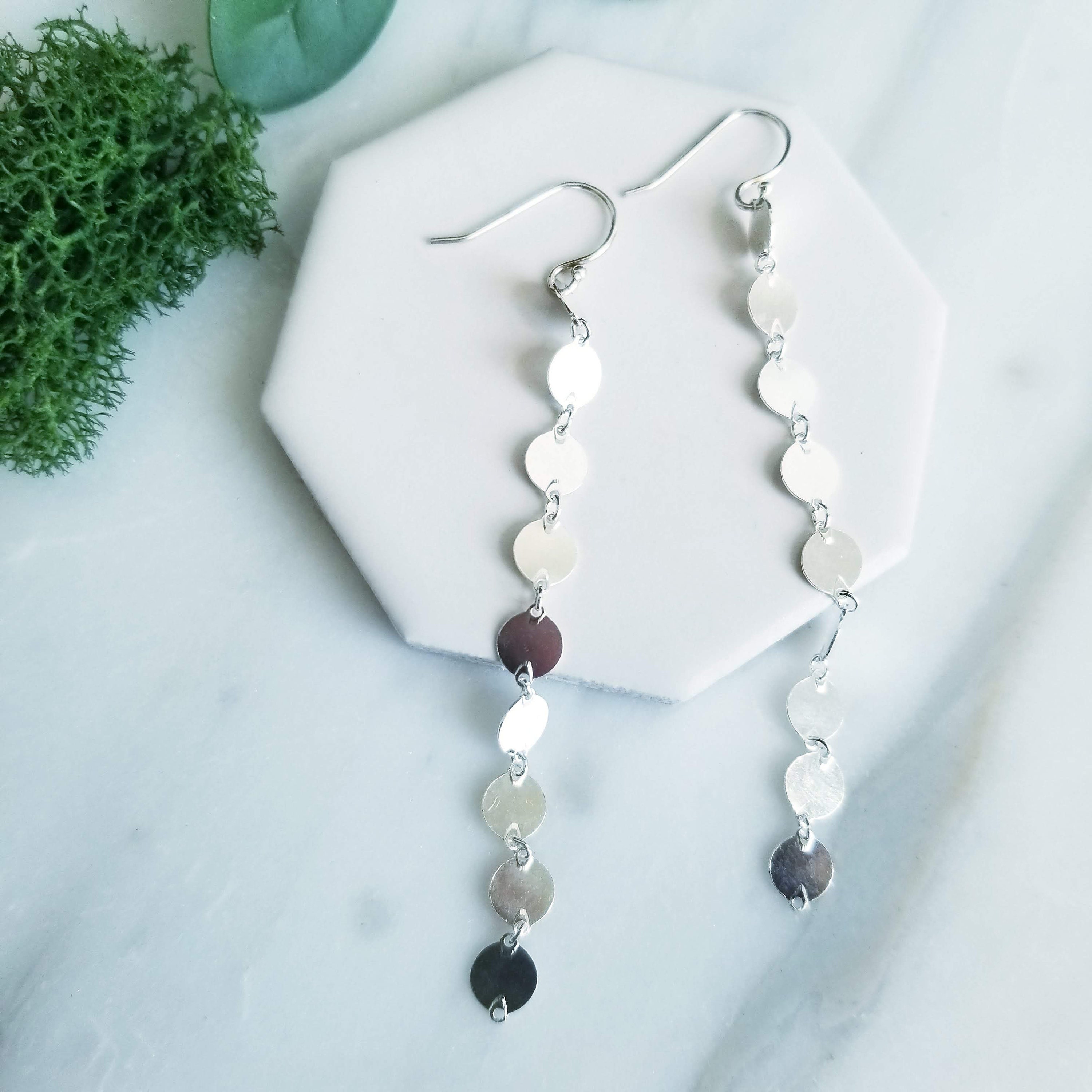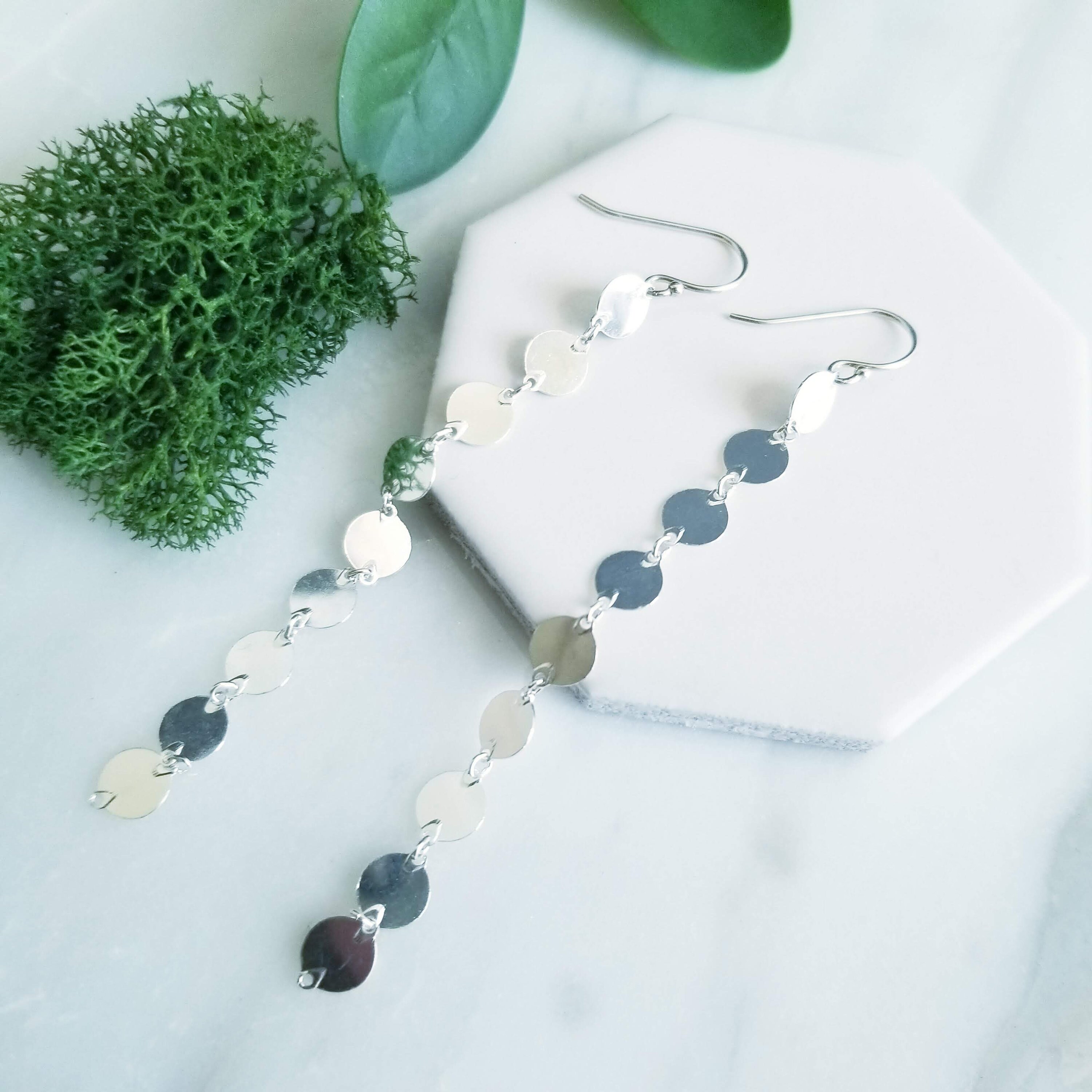 Lovely sparkly pair of dainty dangle earrings made of sterling silver. The use of a shiny and sleek sterling silver chain with connected 4mm polished discs adds a touch of elegance.