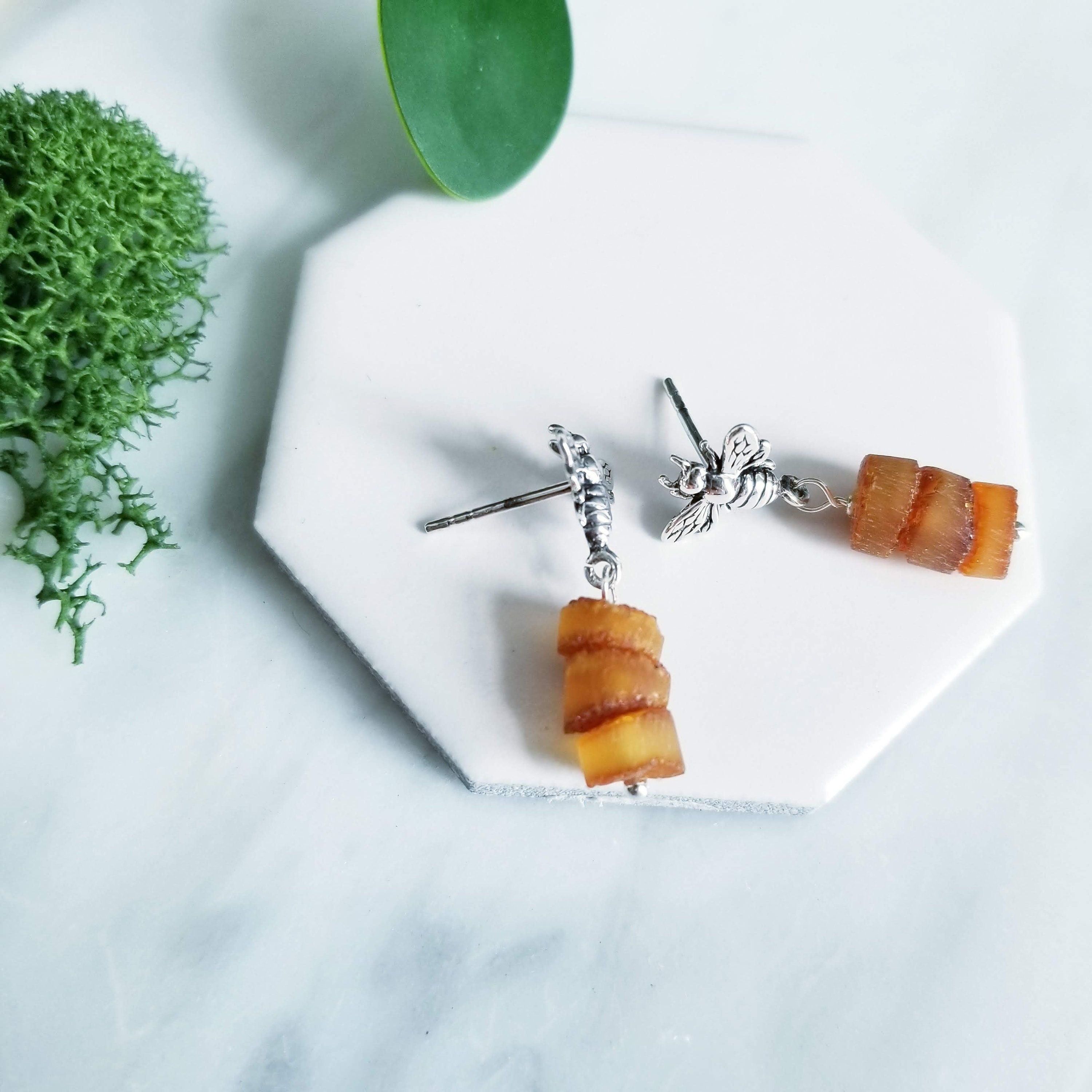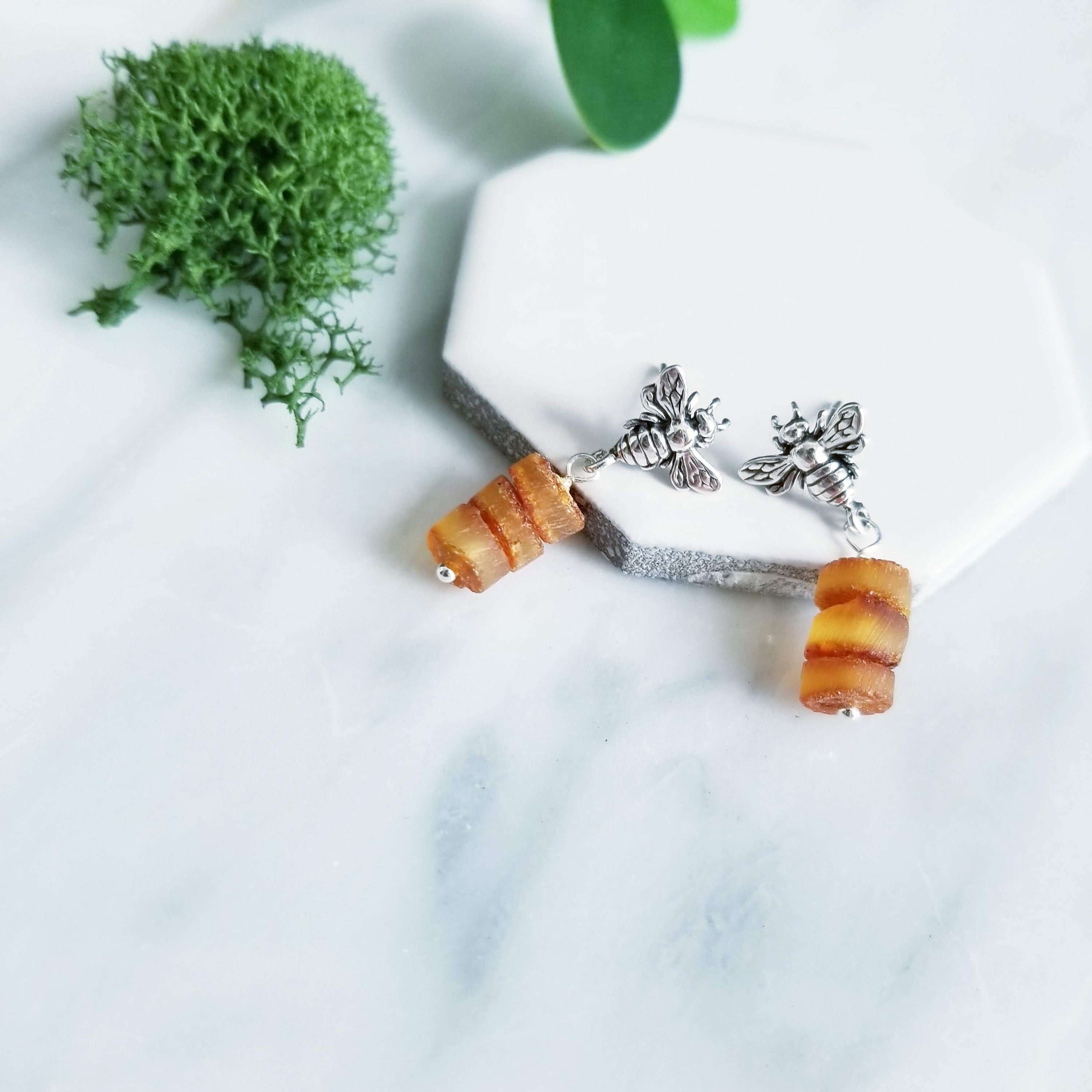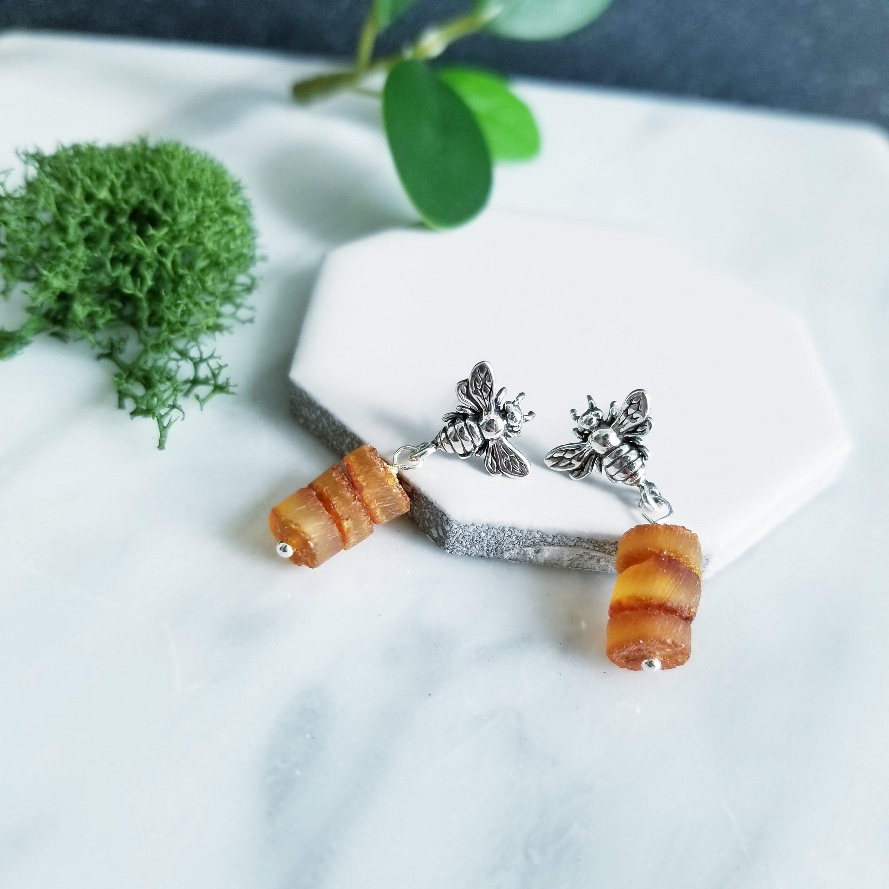 These stunning earrings are made with Honey Bees, Sterling Silver, and glimmering Amber.