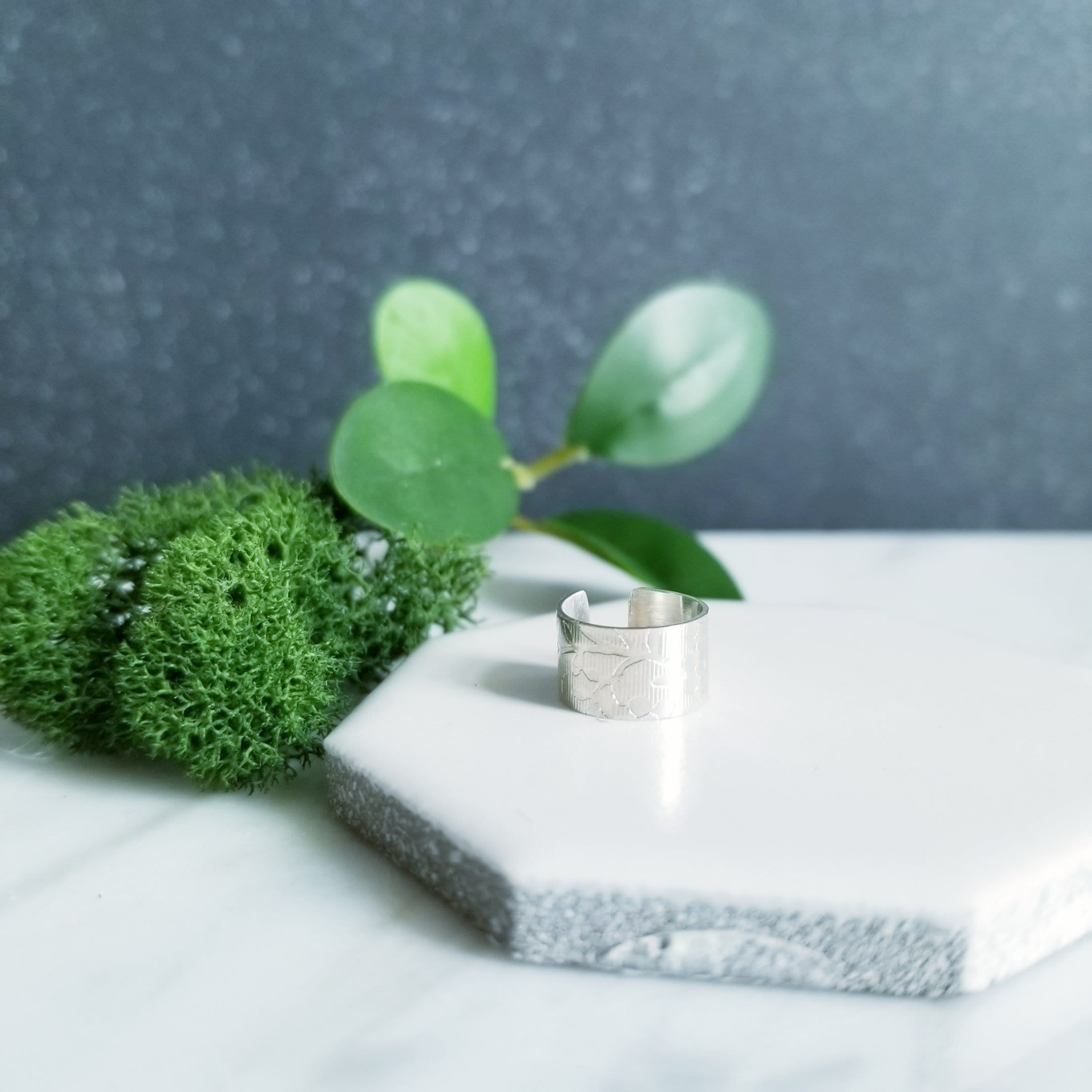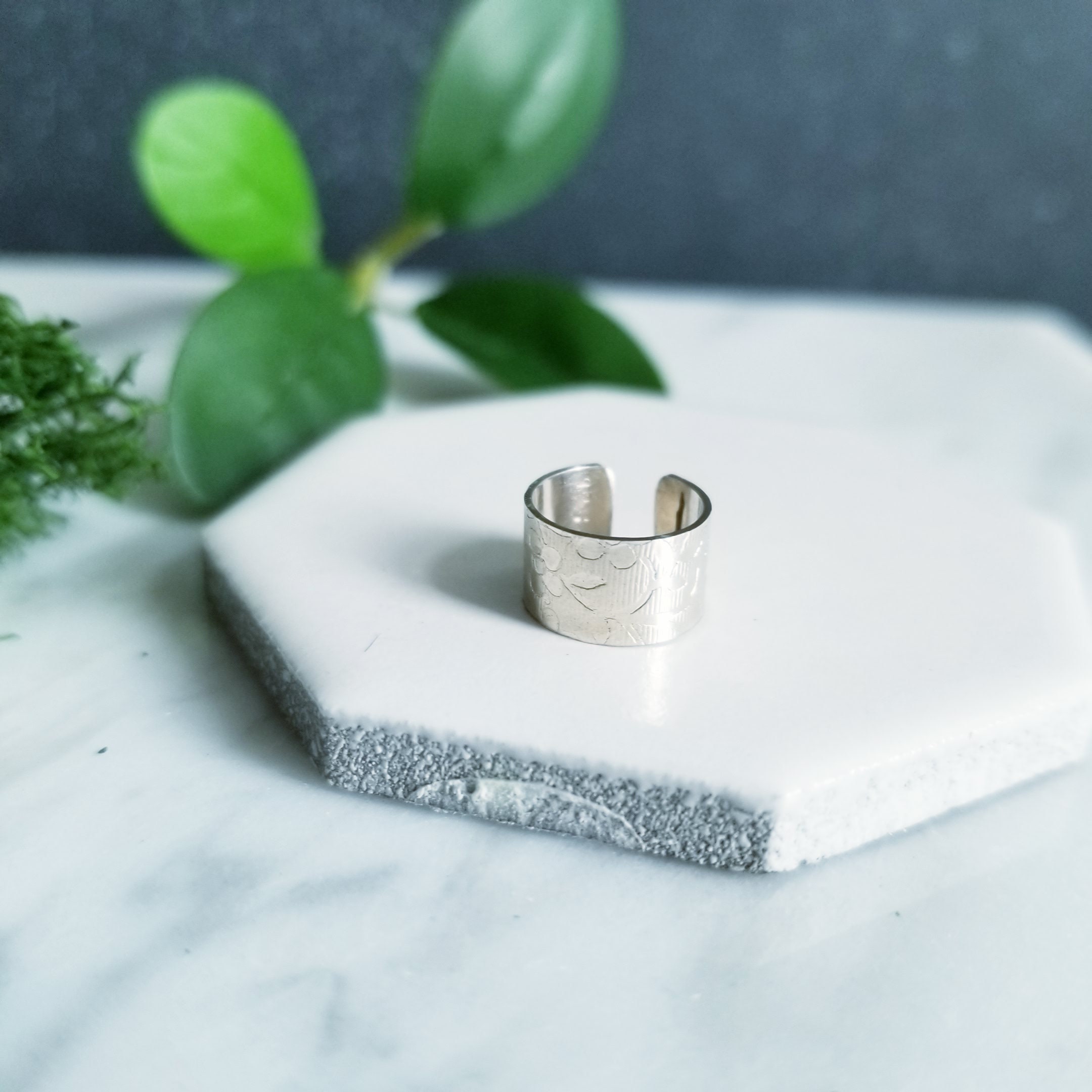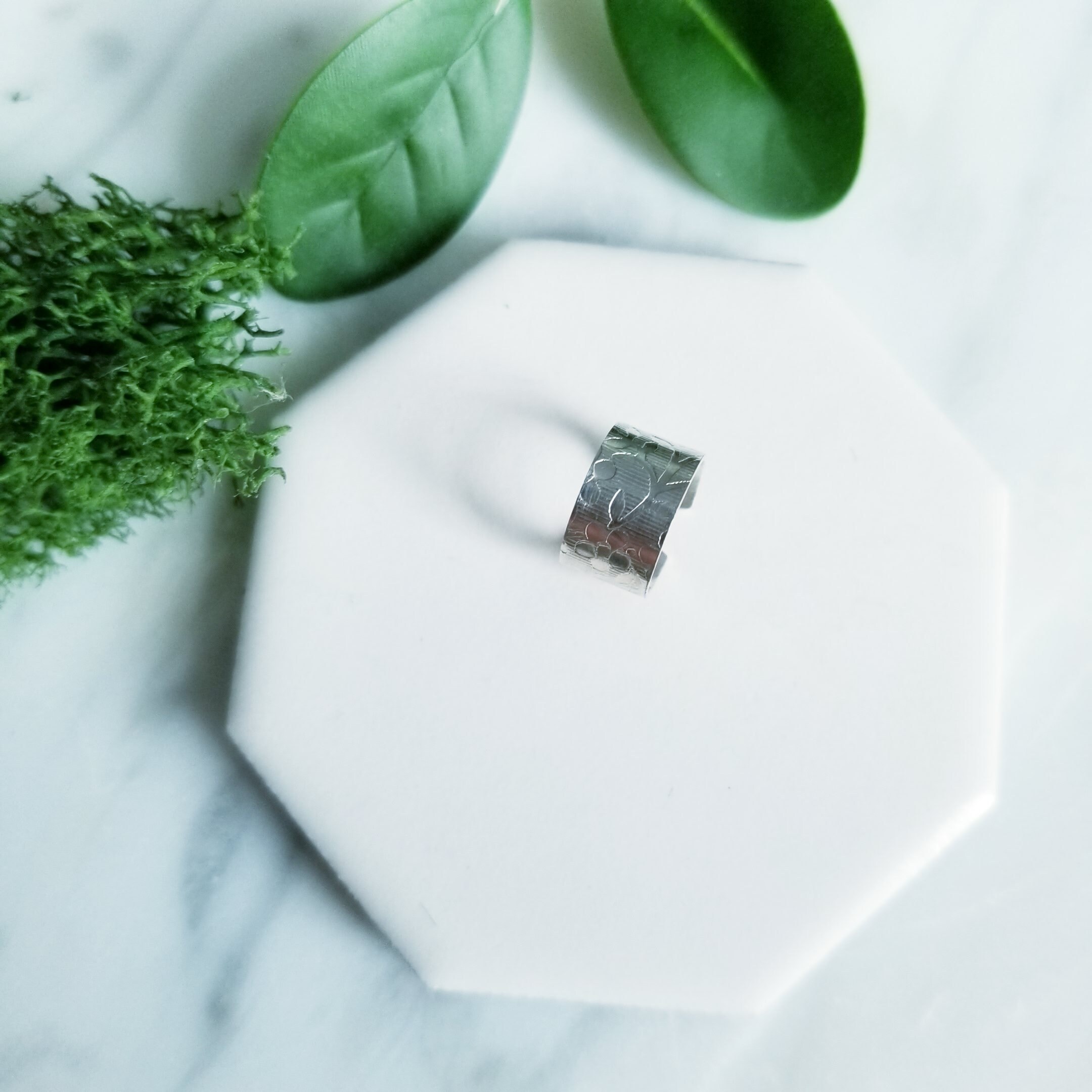Light & Comfortable , 6mm wide sterling silver wire is imprinted in a small flower pattern on a striped background then formed into a small hoop, simply slide onto your upper ear at the top.