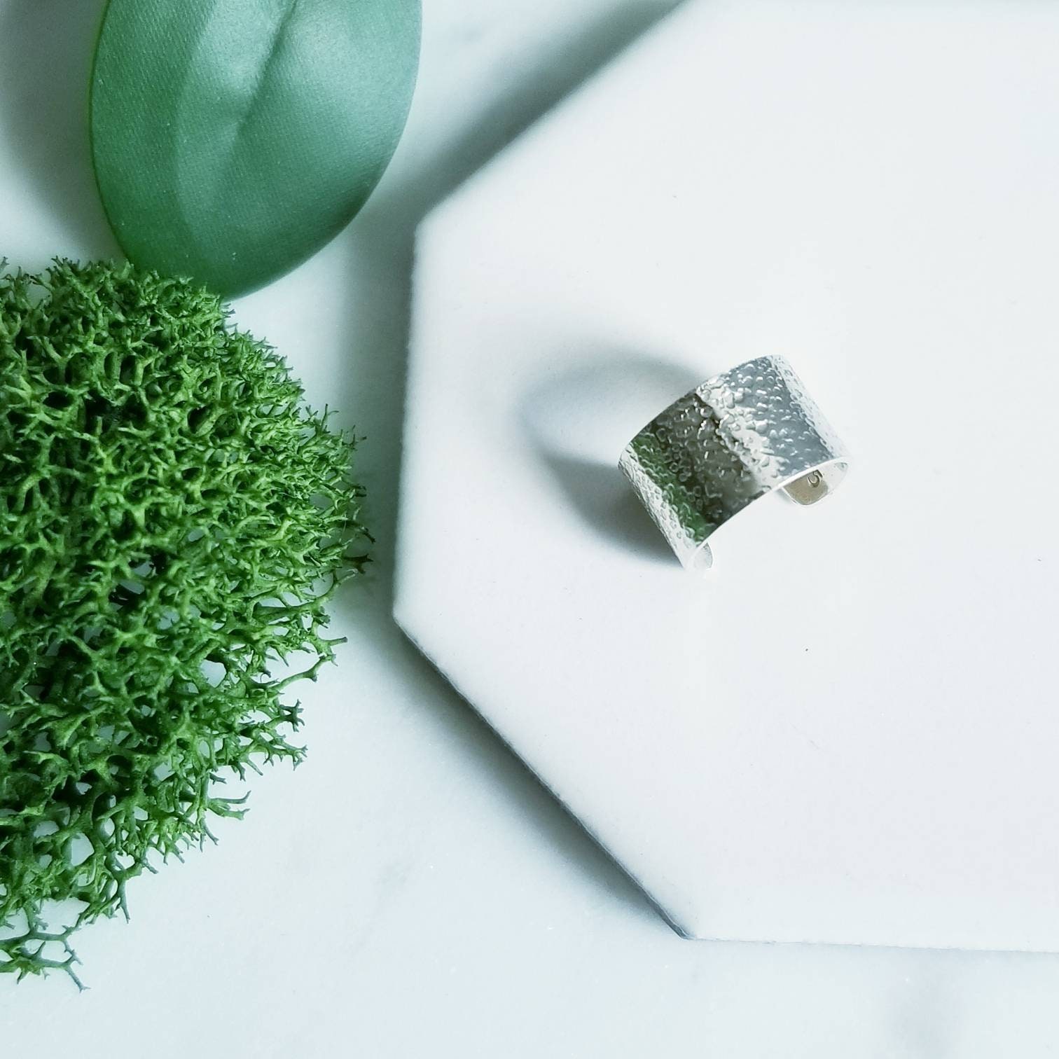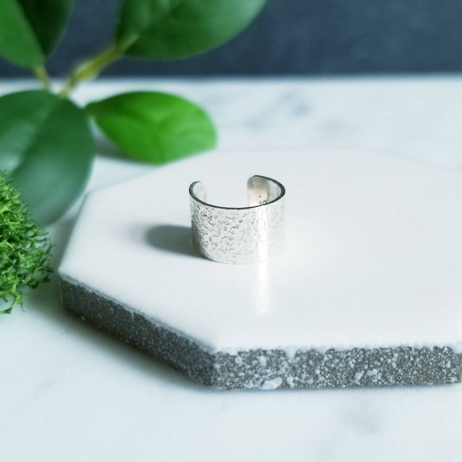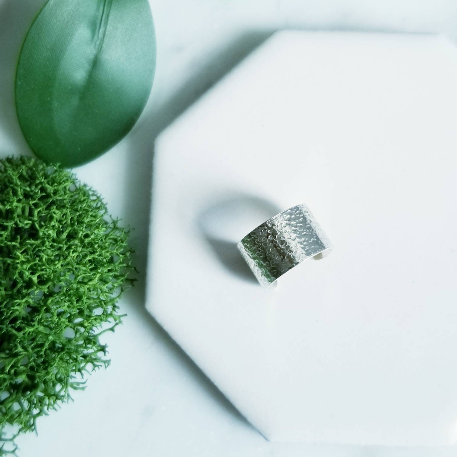 Light & Comfortable , 6mm wide sterling silver wire is imprinted in a softly speckled texture then formed into a small hoop, simply slide onto your upper ear at the top.