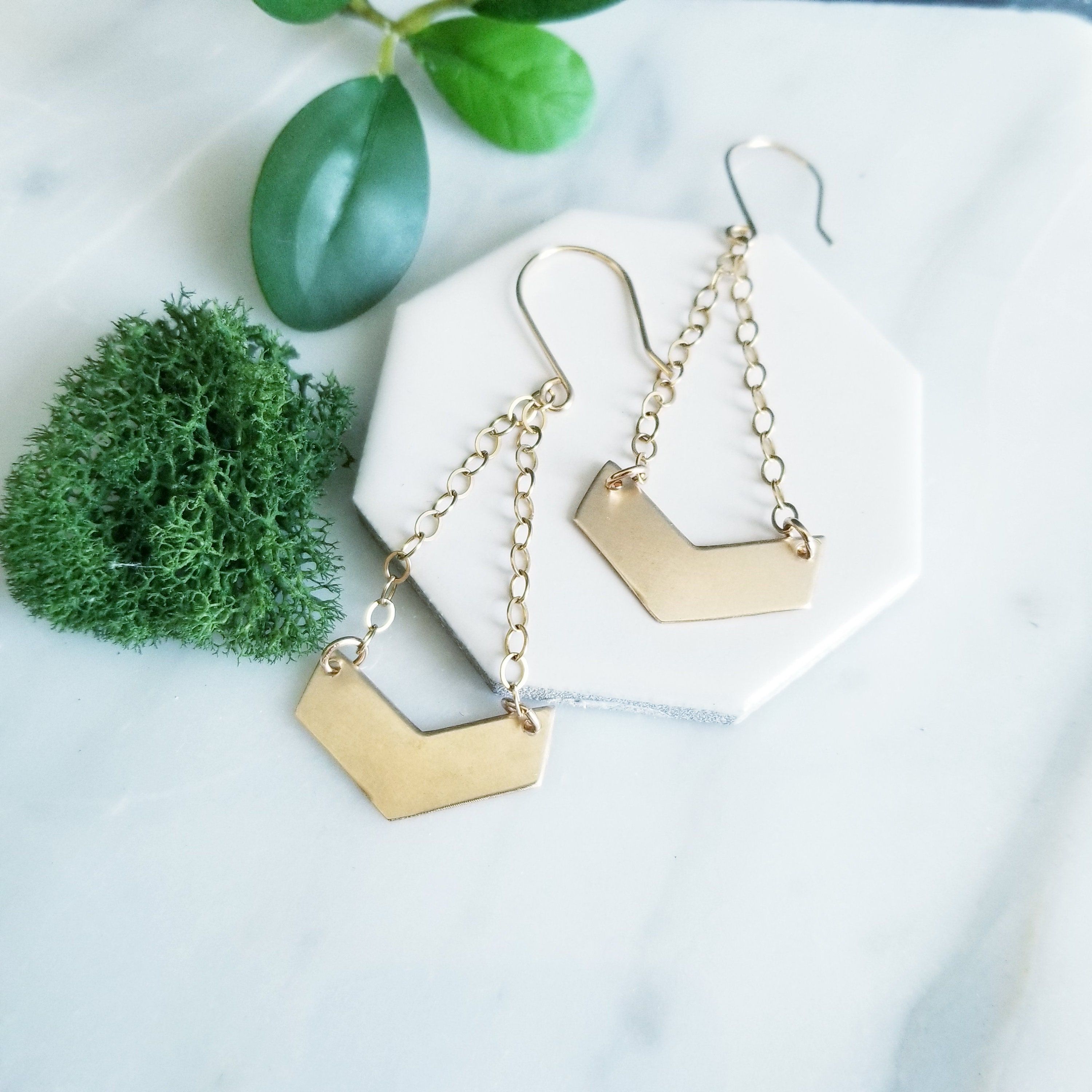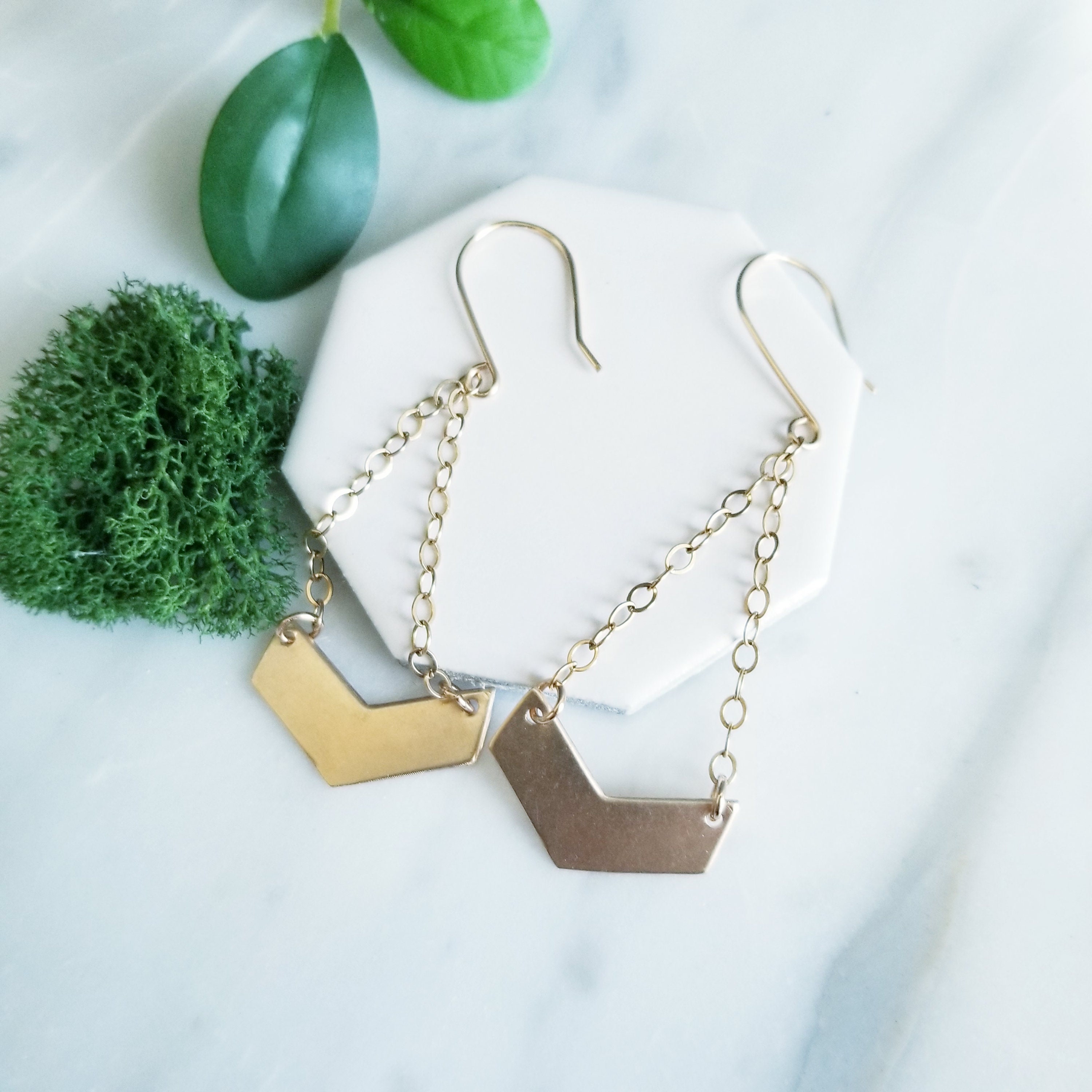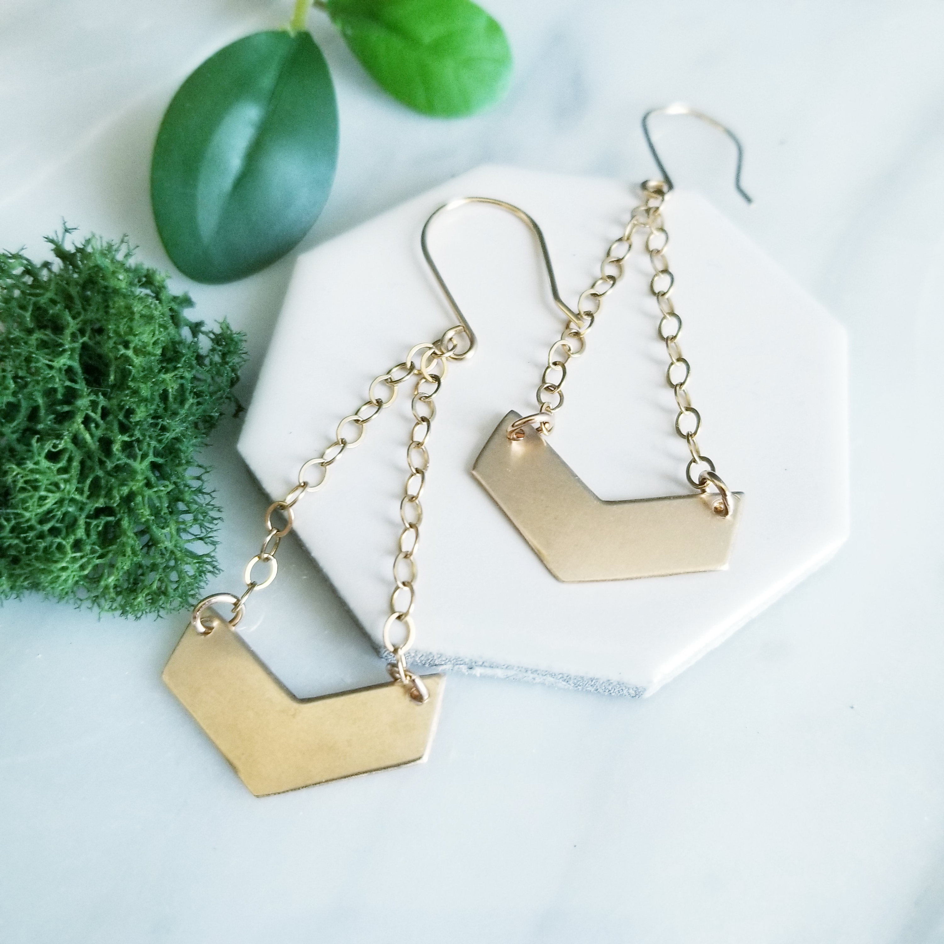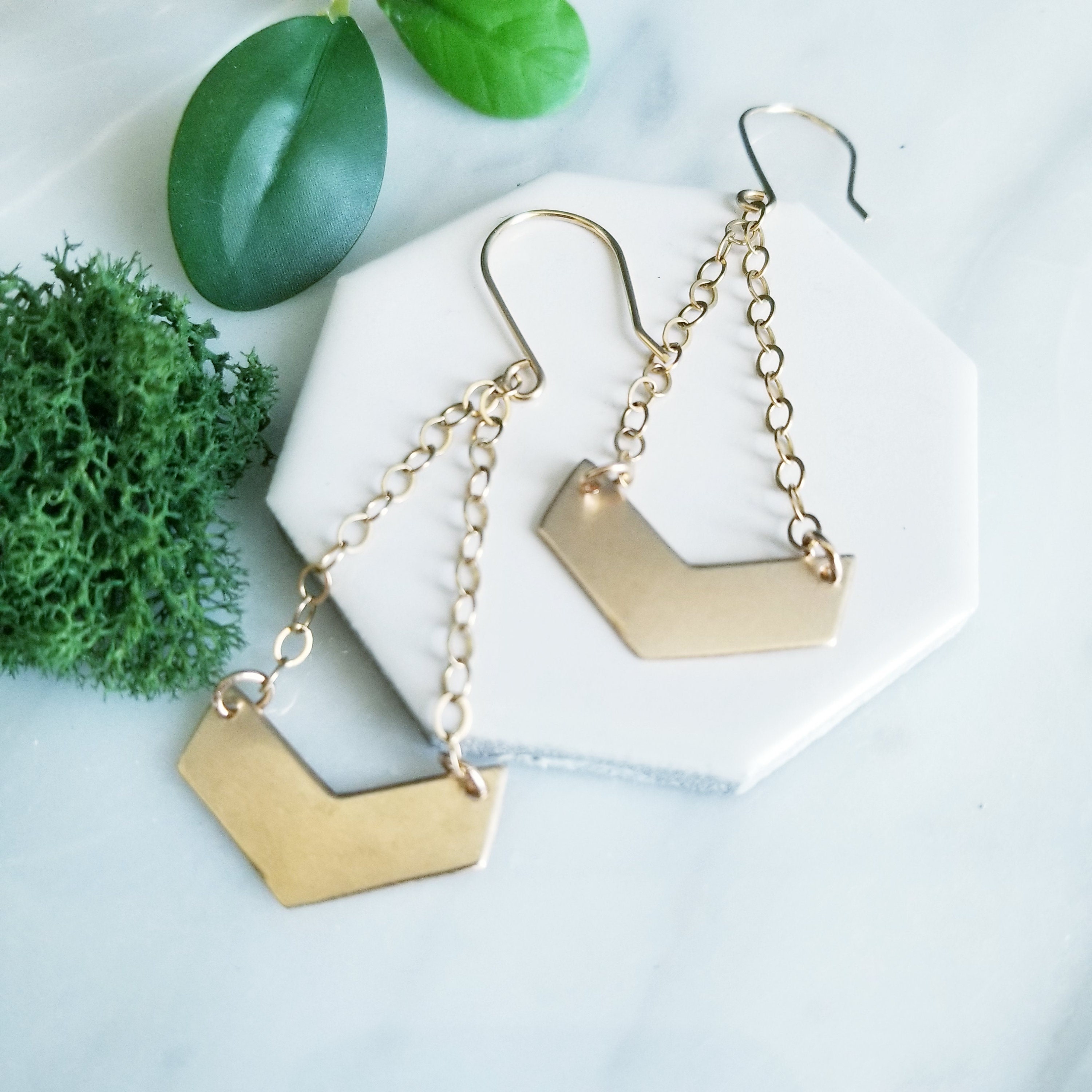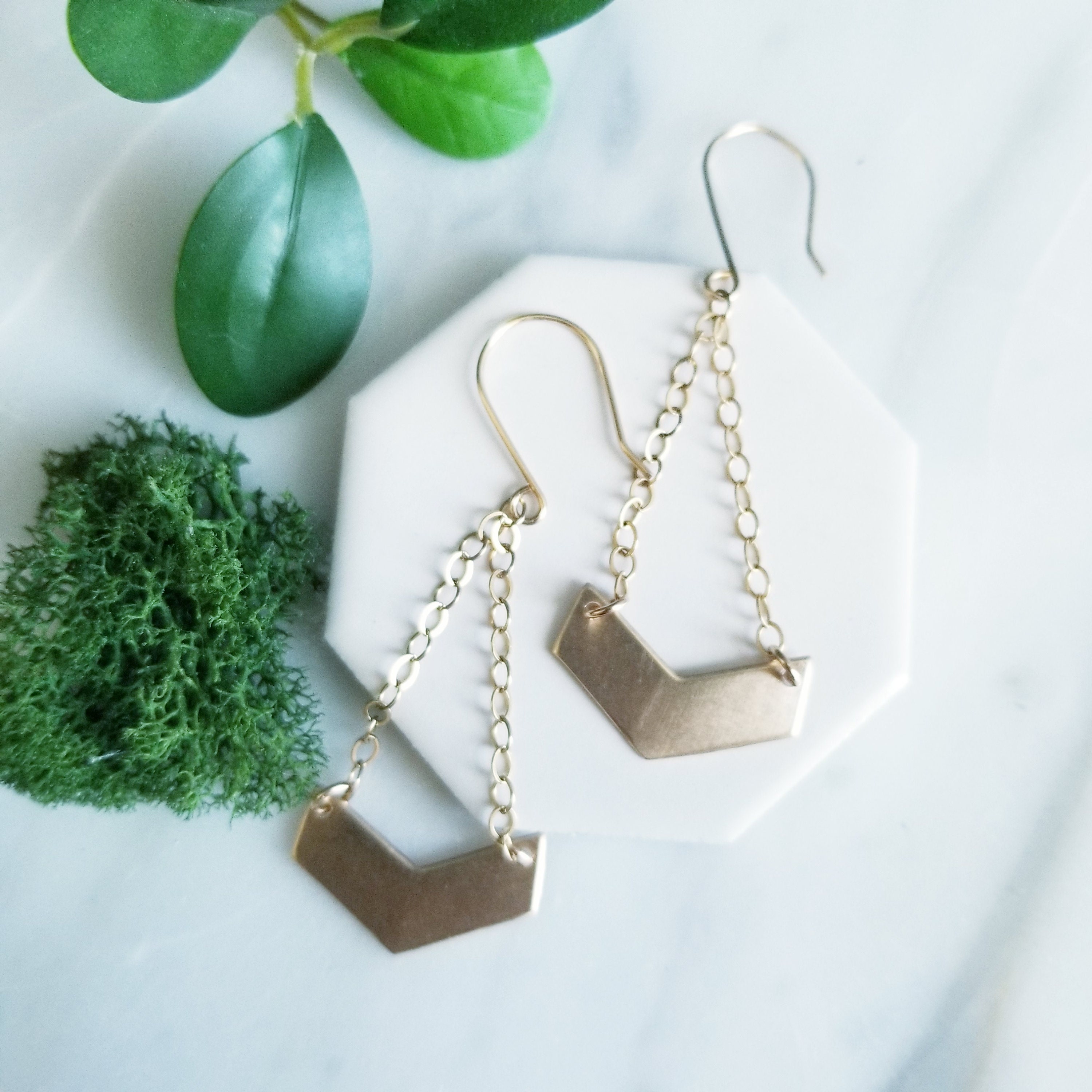 Long swingy yellow gold fill chevron earrings, sleek with a softly matte finish chevron shape.