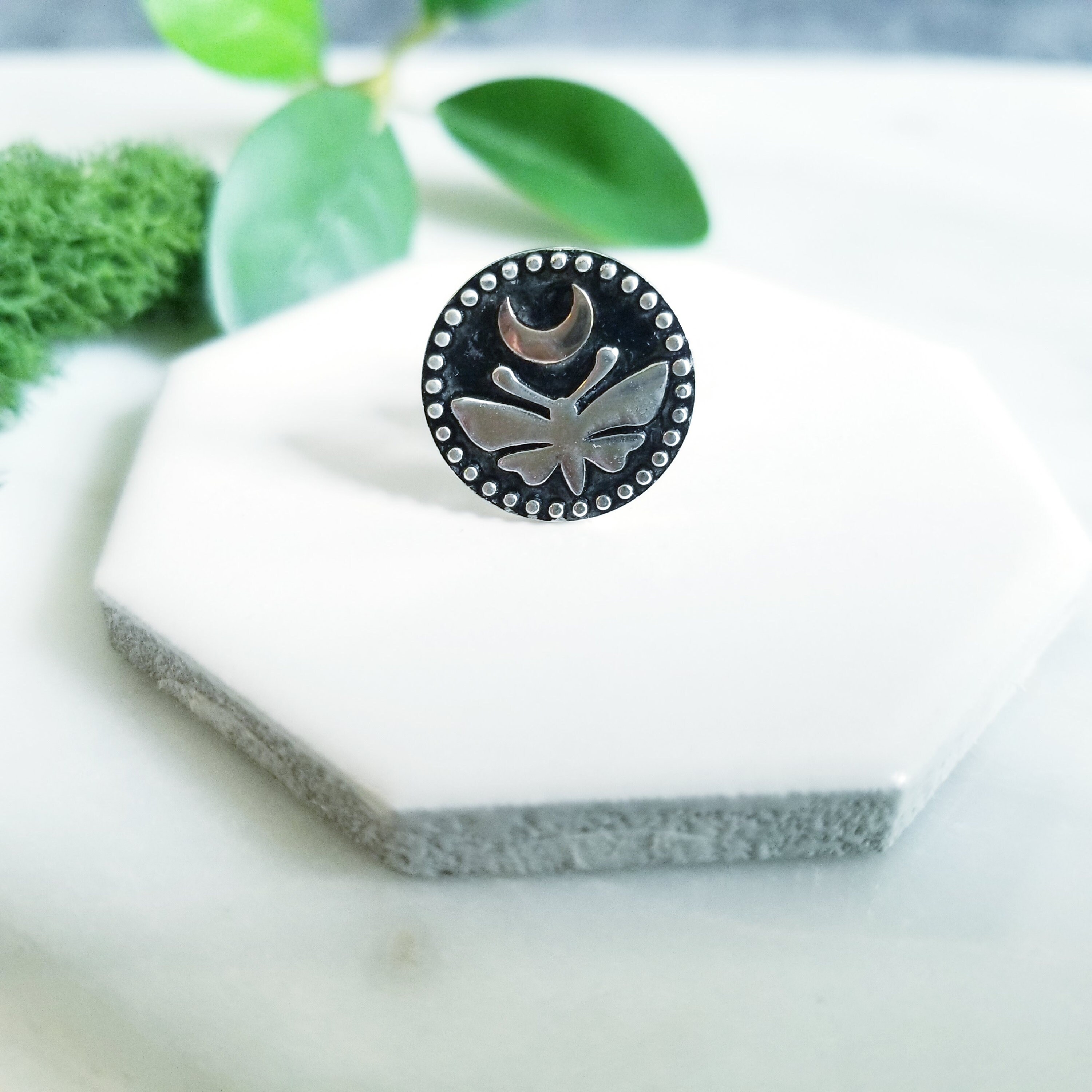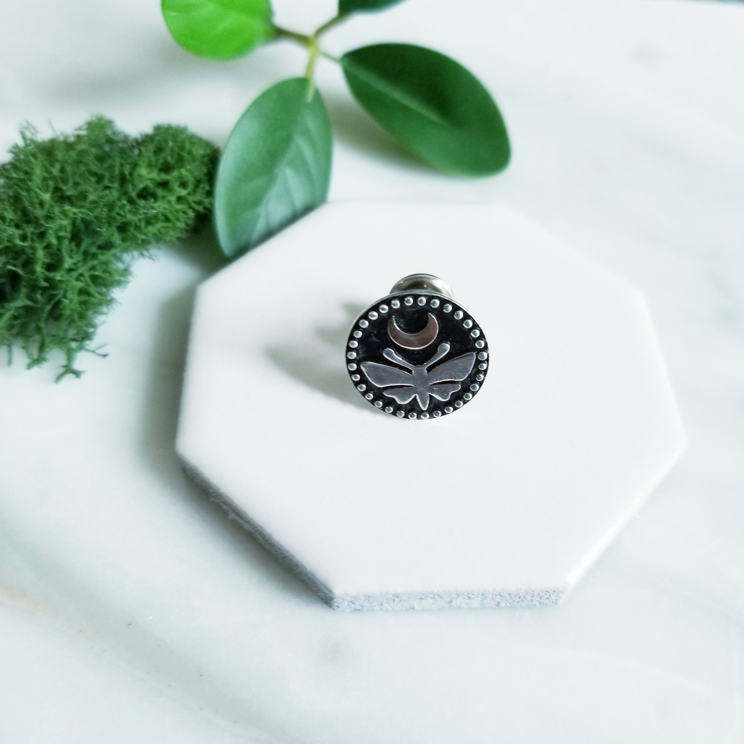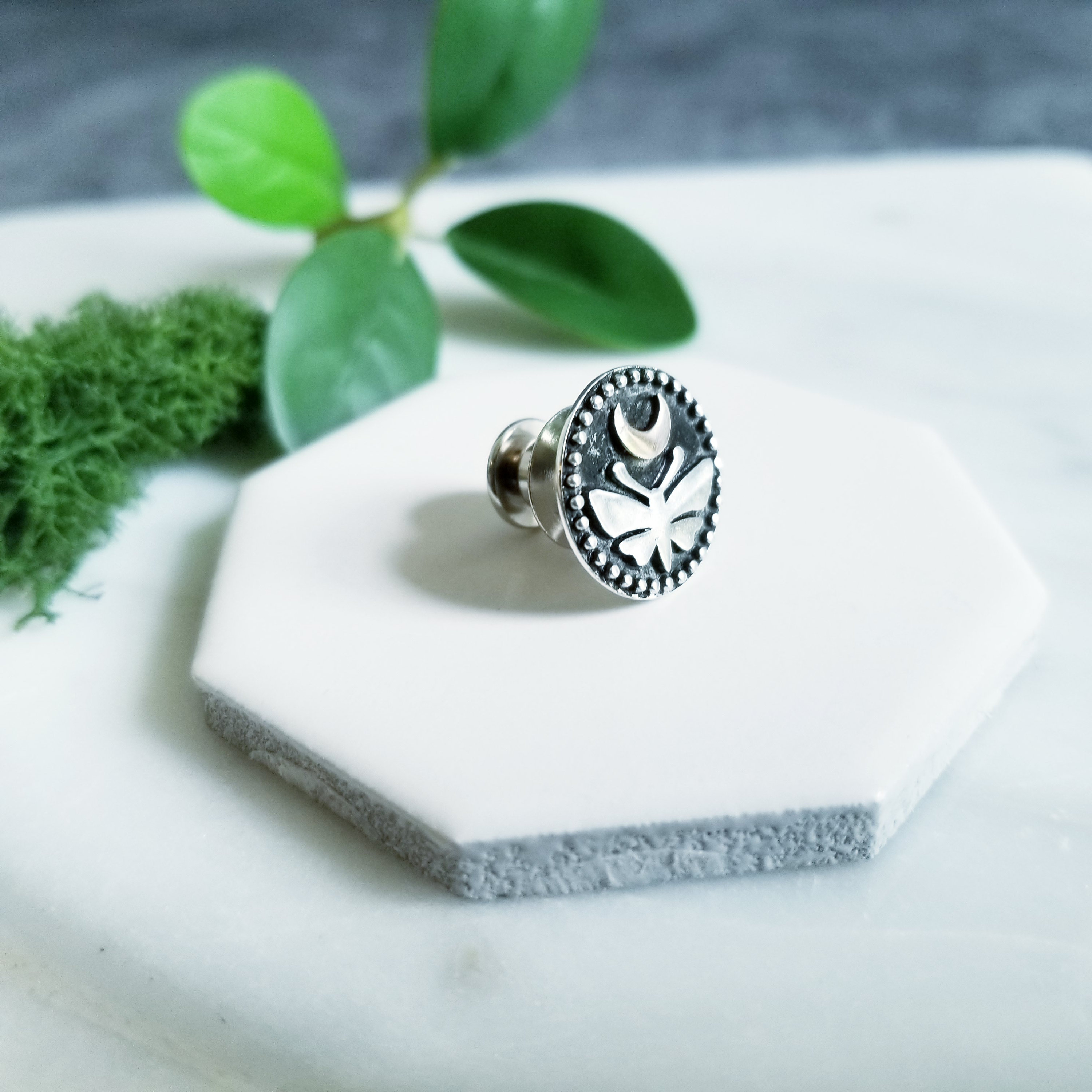 Sterling silver tie tack or lapel pin featuring a moth under a bronze crescent moon, all accentuated with a dark patina and textured highlights.