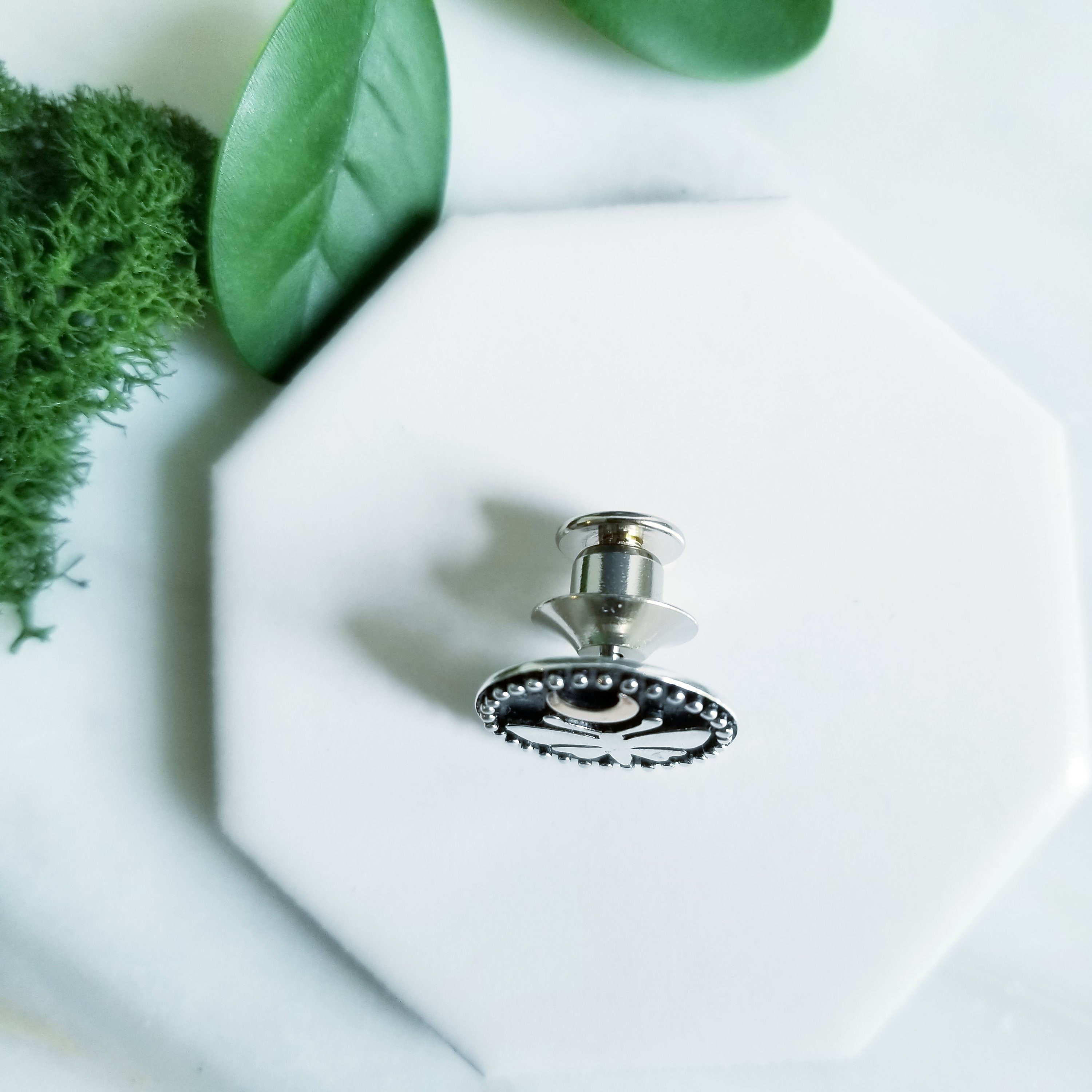 Approximately 15 mm, sterling silver fern and mushroom component, single tie tack on the back is steel with a pressure fit clutch.
