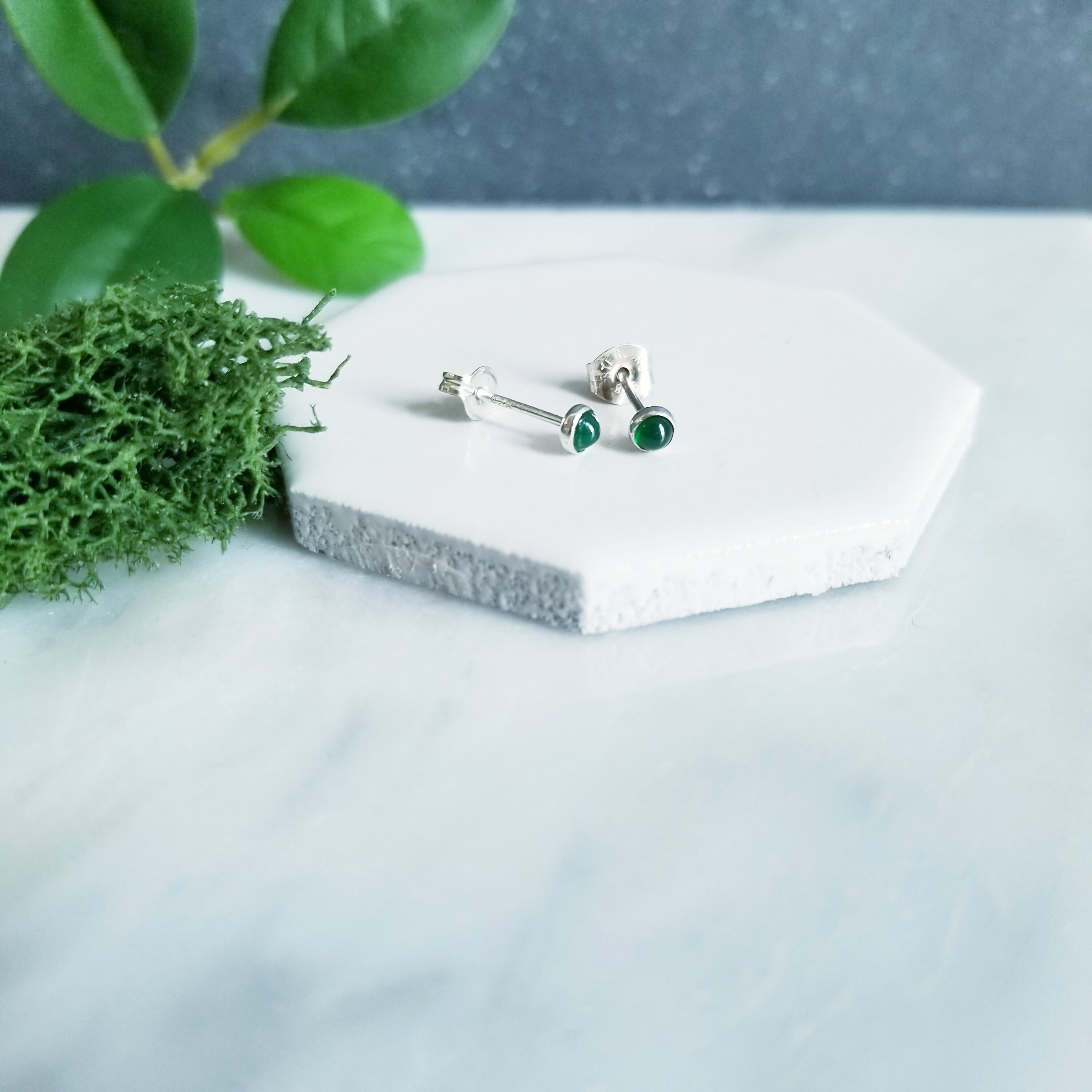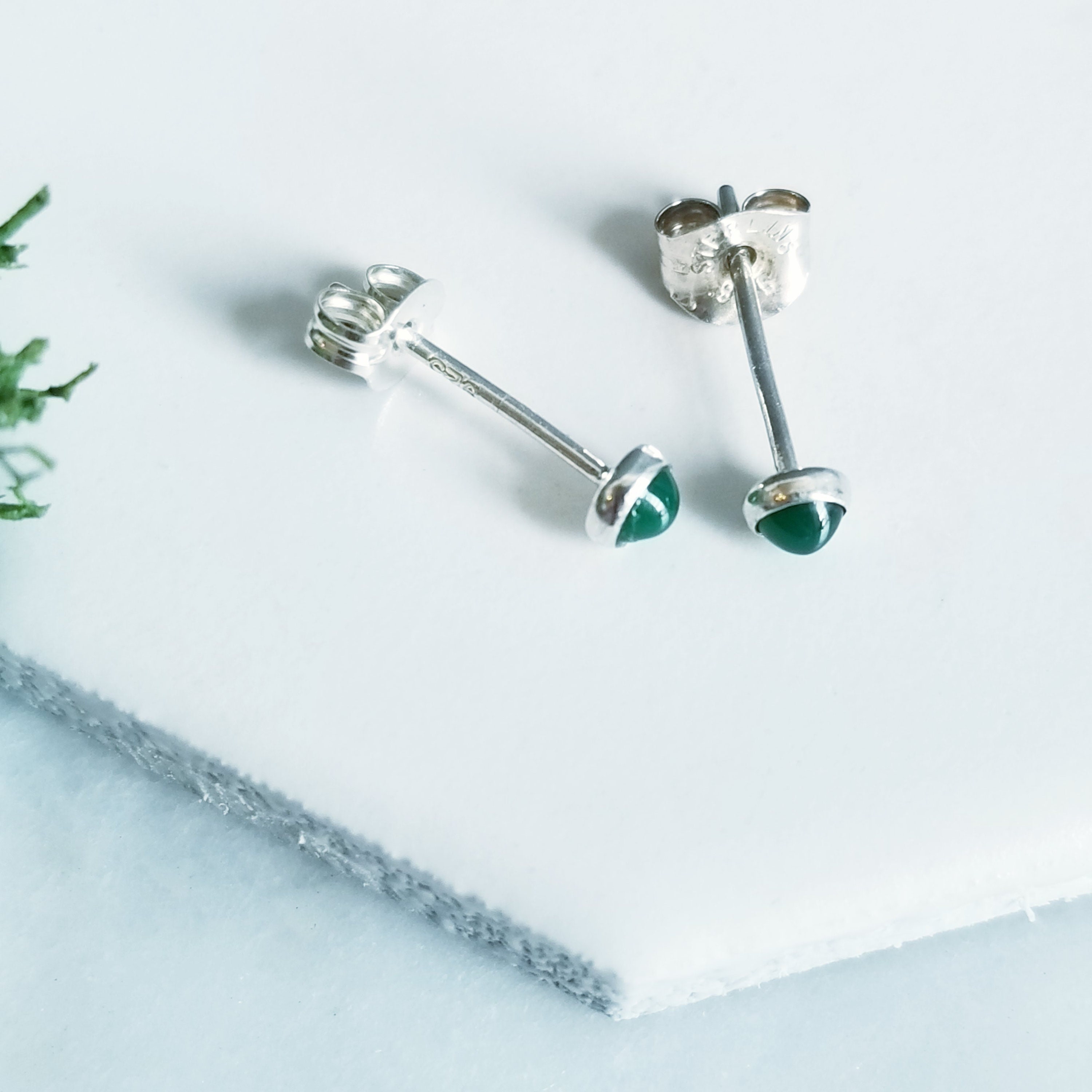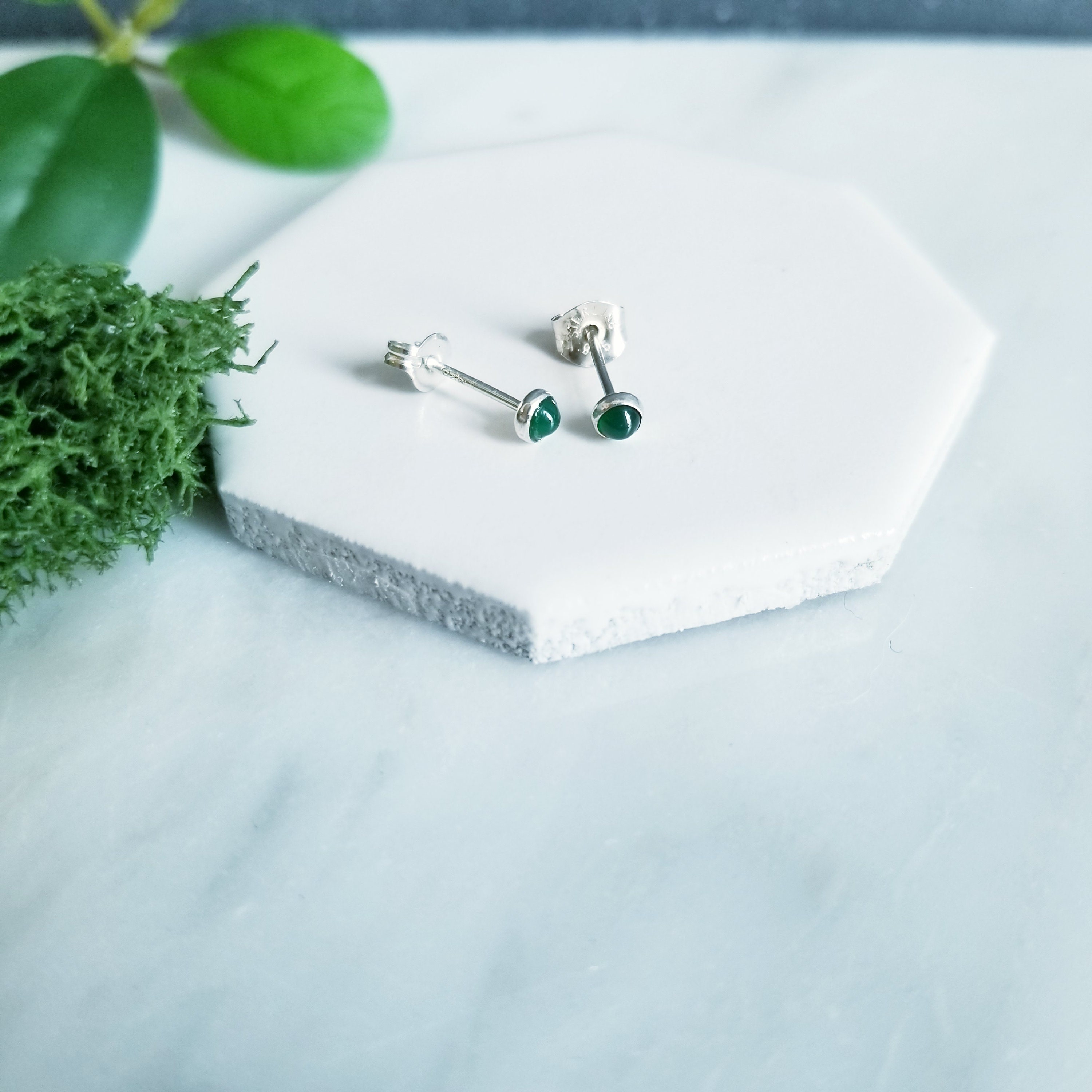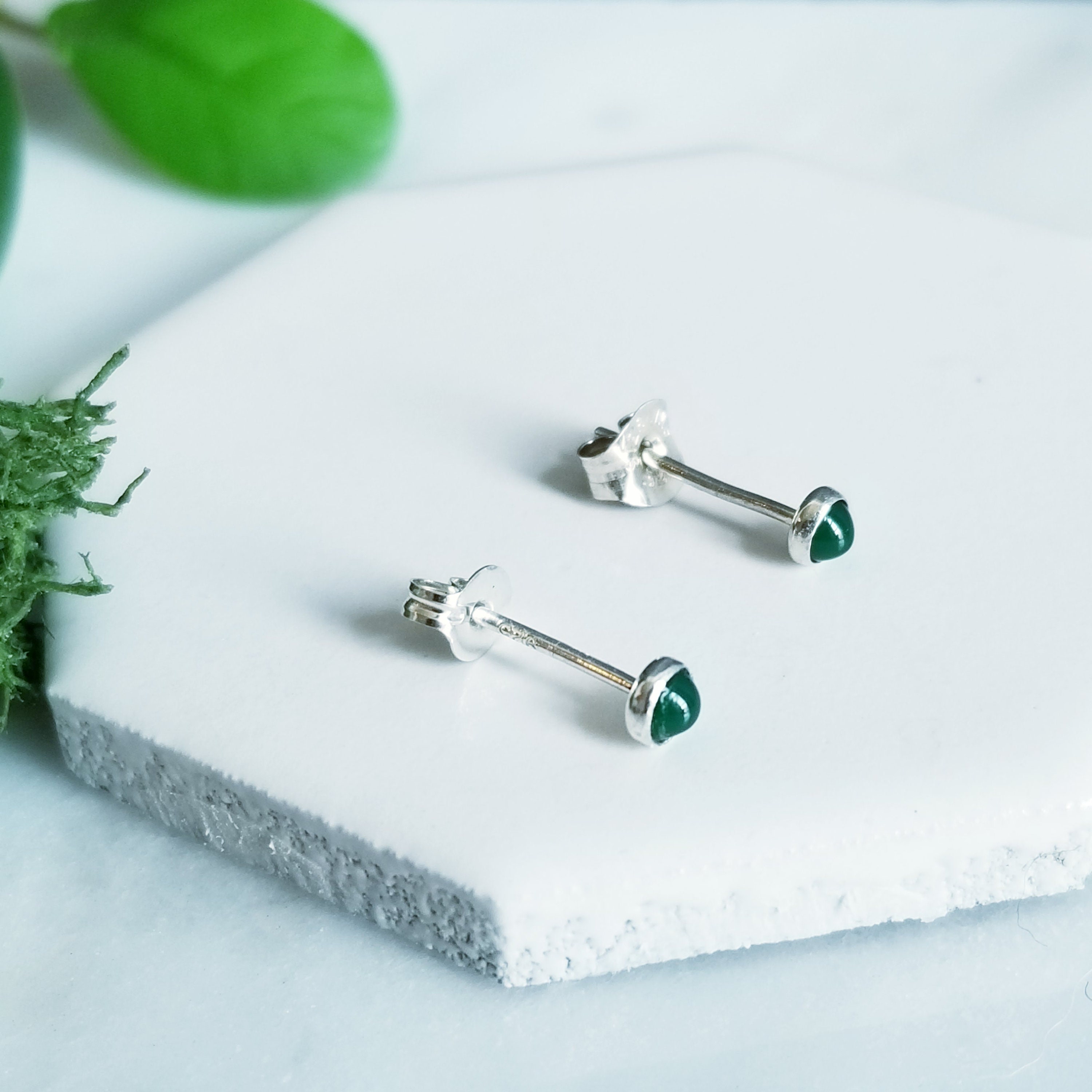 3mm bullet shaped Green Nephrite Jade gems are set in sterling silver post earrings with sterling silver butterfly backs.