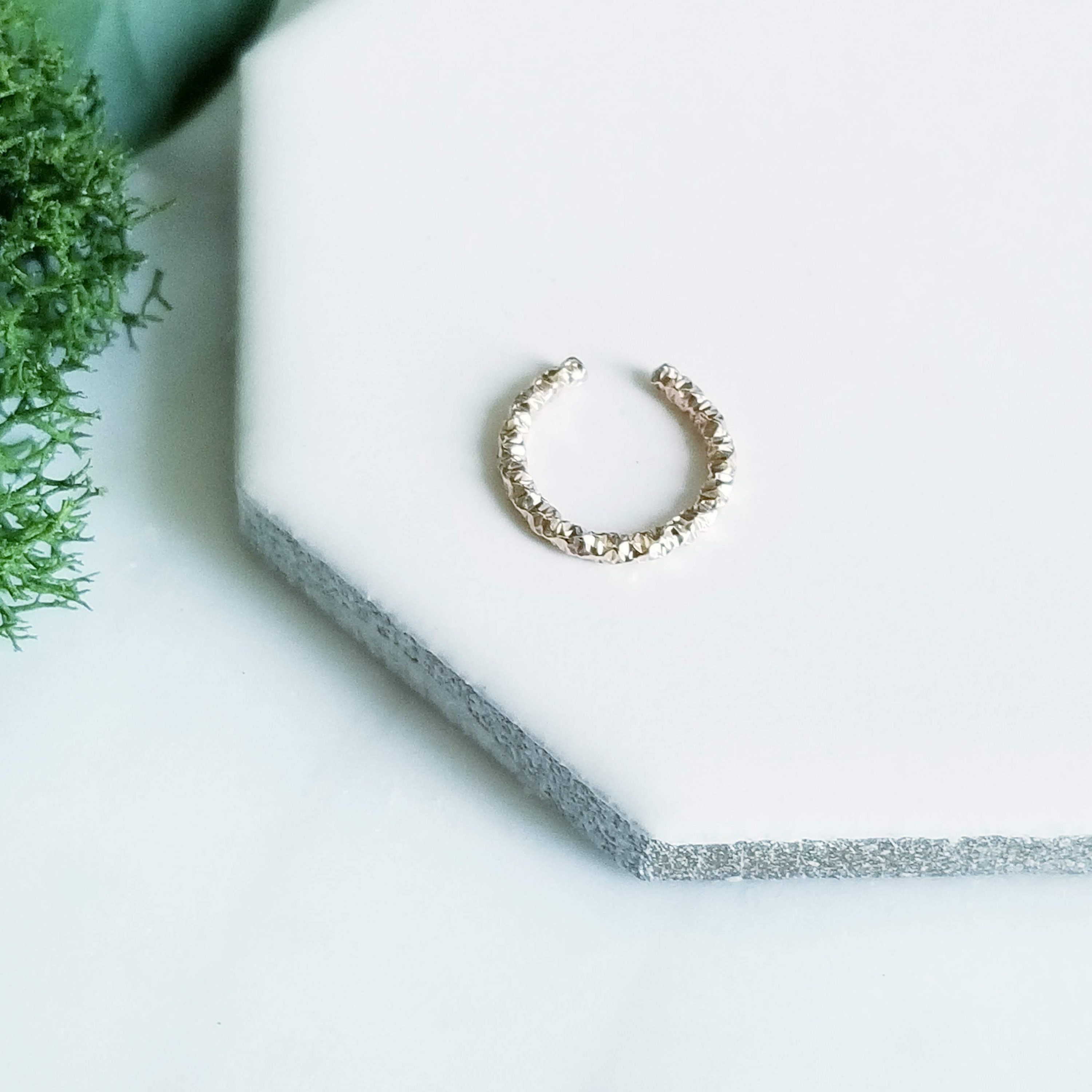 Can also be slid onto the side of your nose as a faux hoop piercing. Squeeze gently to size.