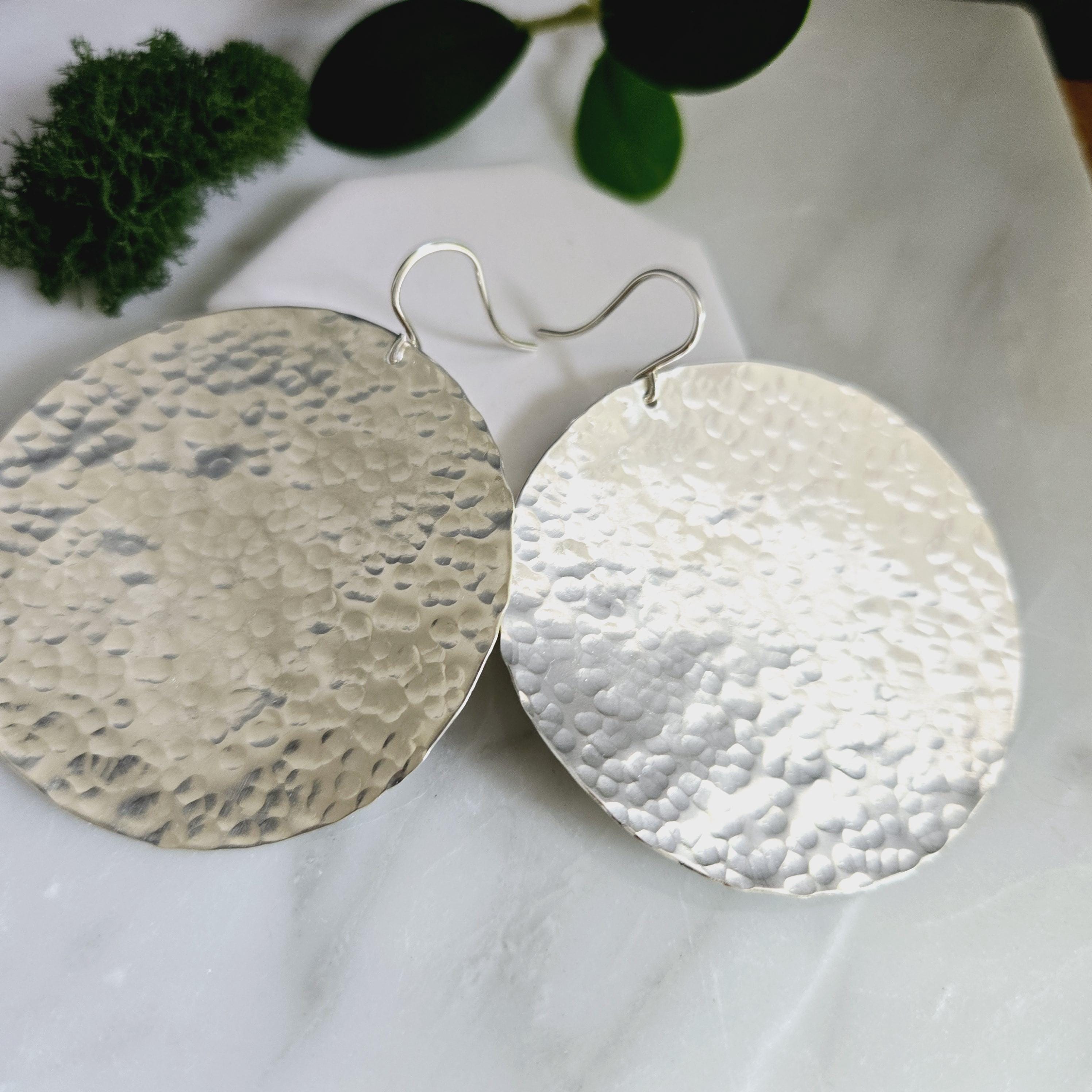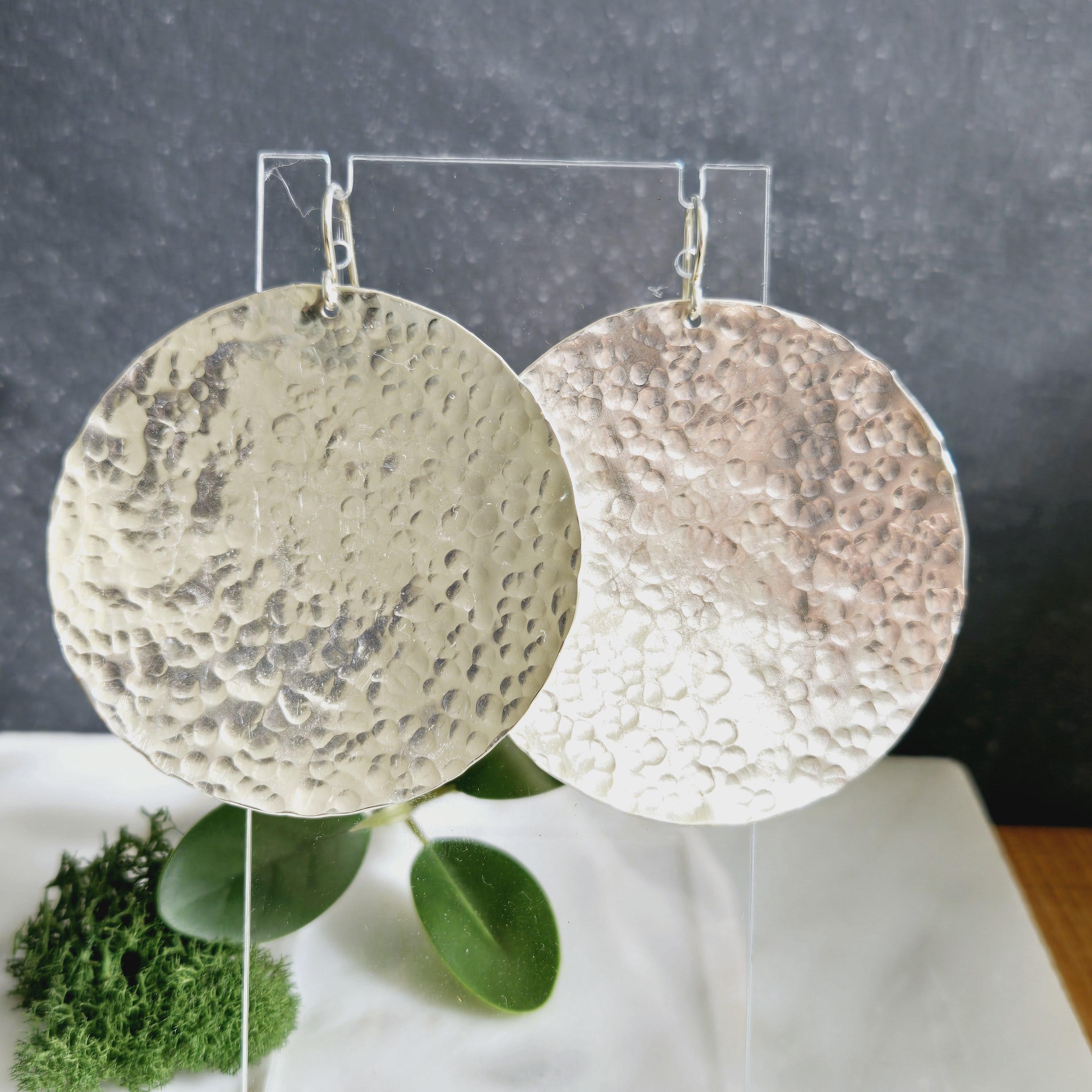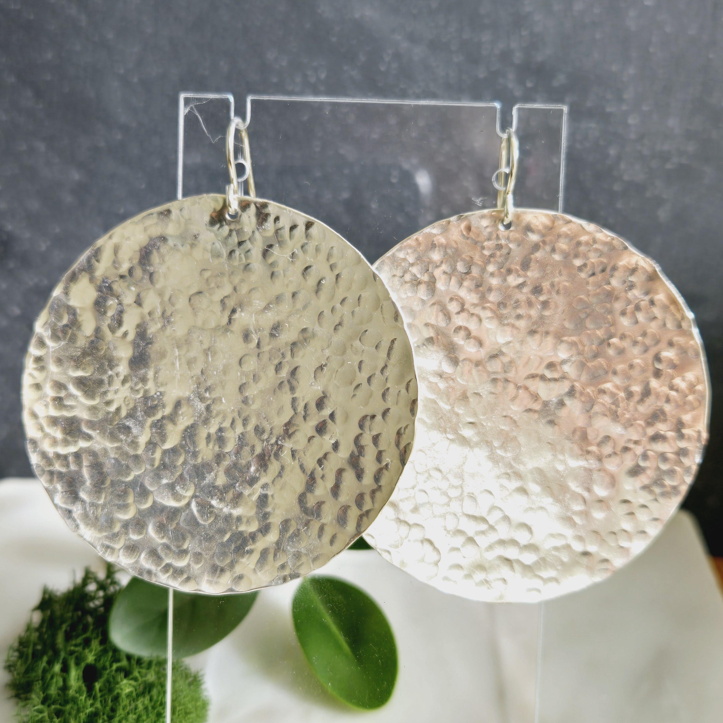 Discs are cut from sterling silver in a 2 inch width, textured and hammered and slightly dished to catch the light.