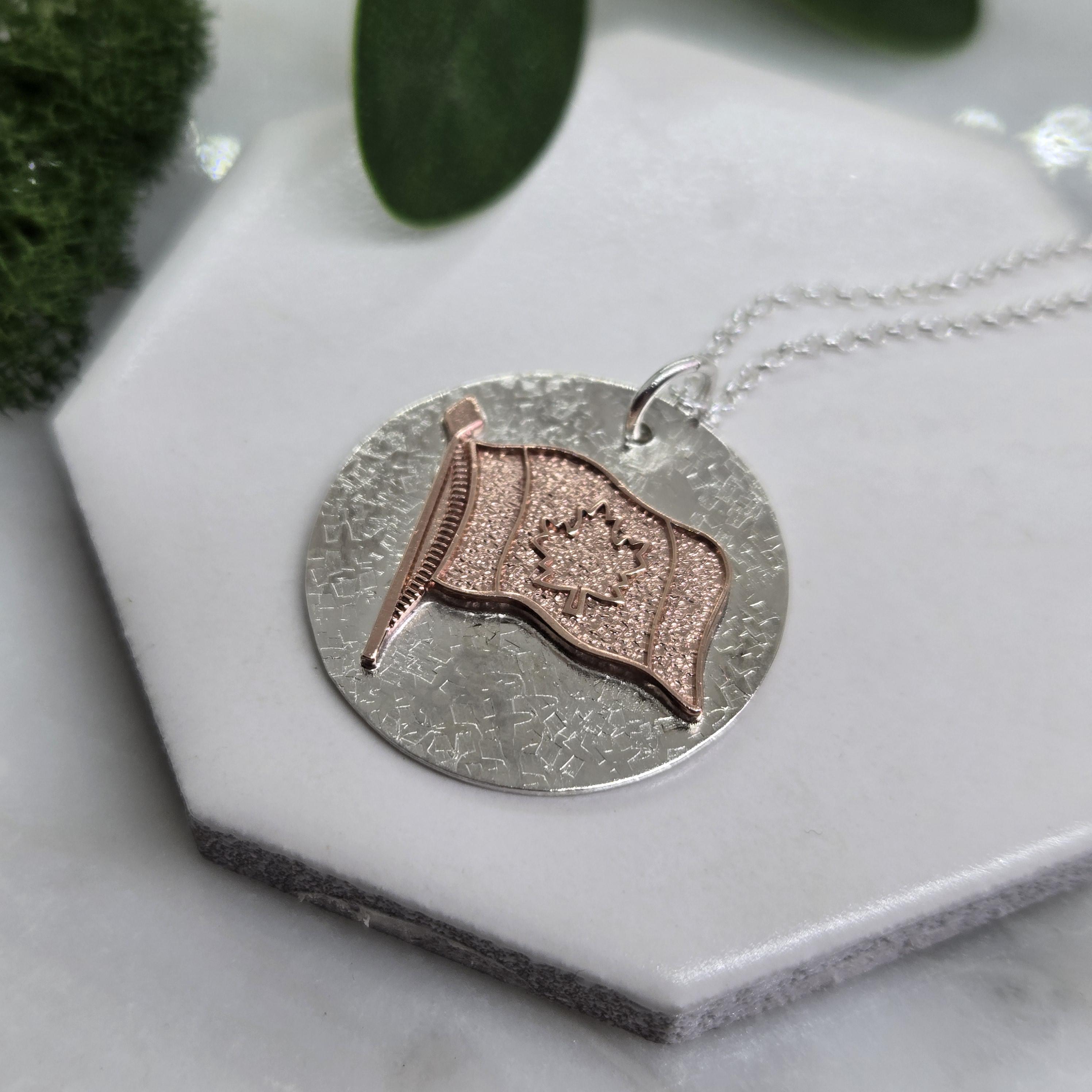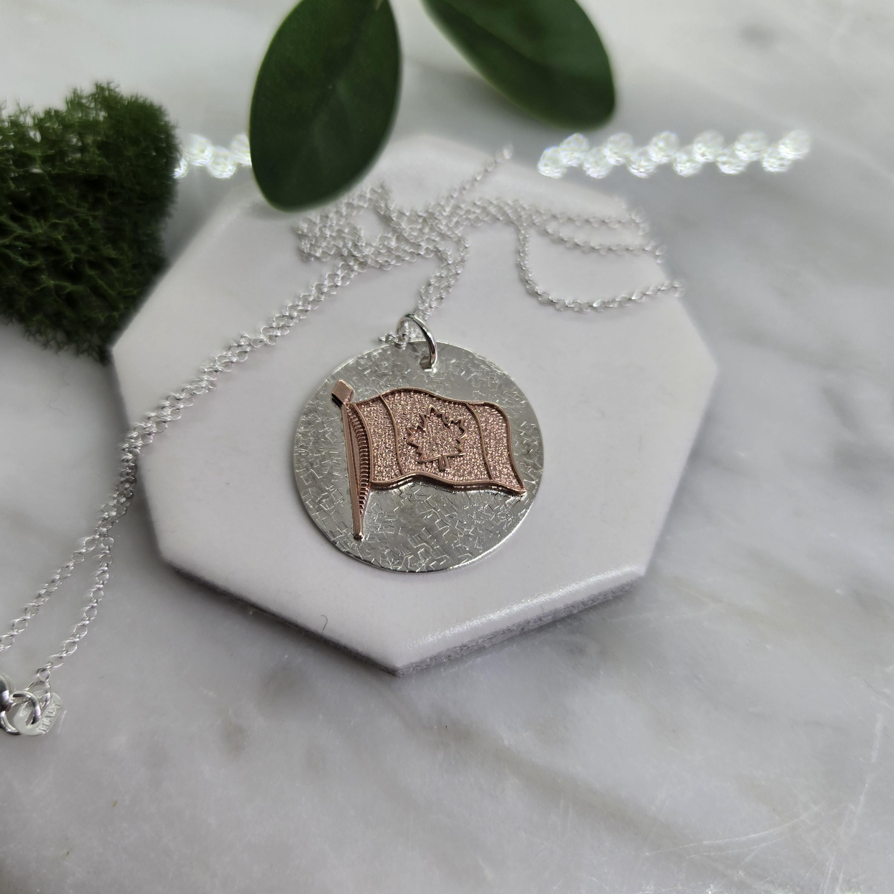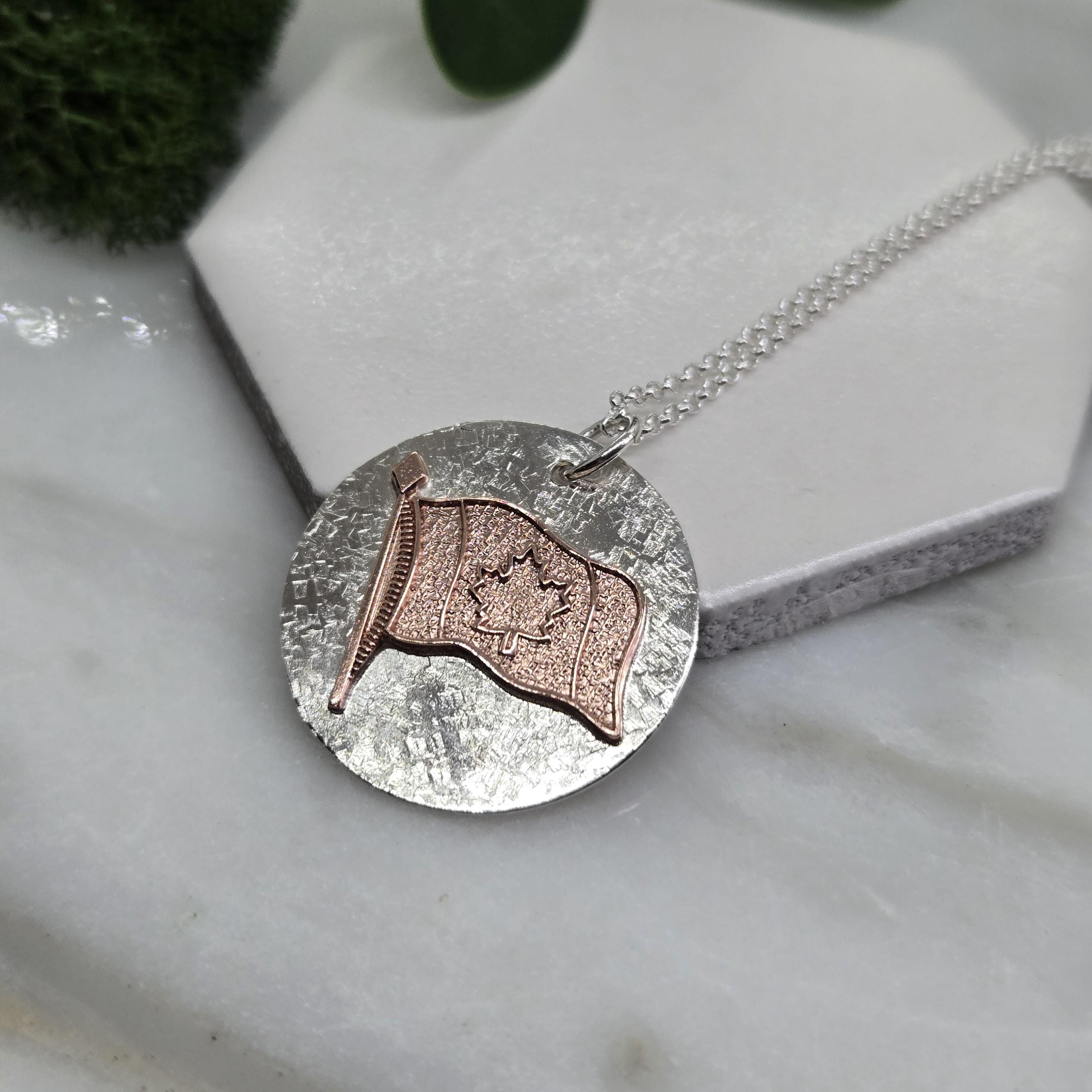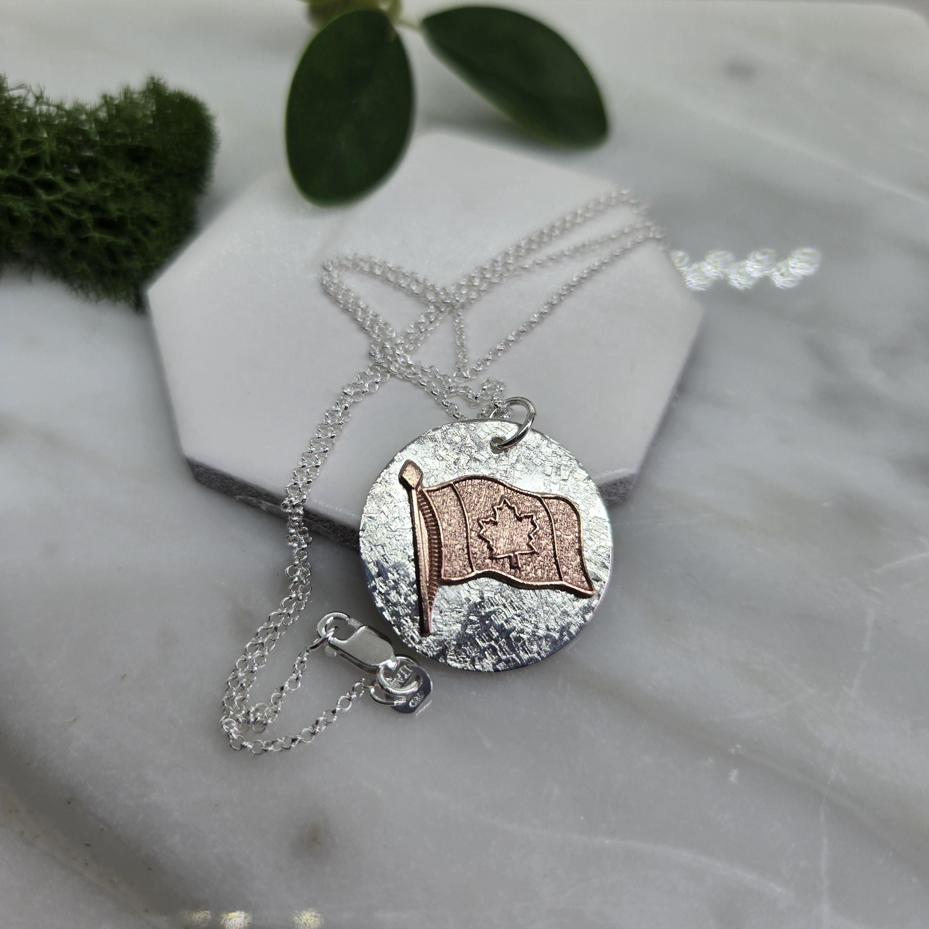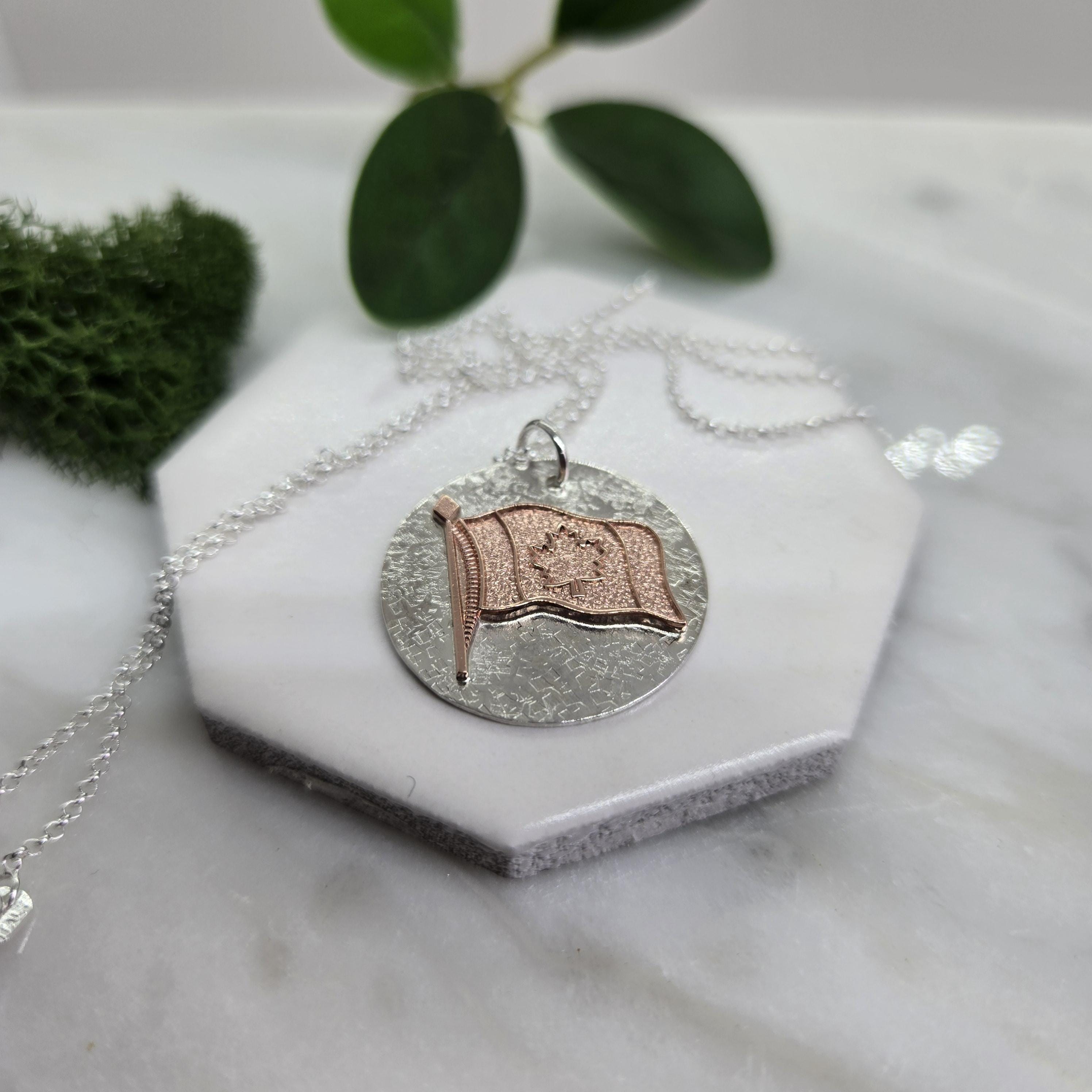 Sterling Silver and Copper Necklace featuring a Canadian Maple Leaf Flag in copper on a solid sterling silver round pendant. I've given the sterling a silk hammered finish.