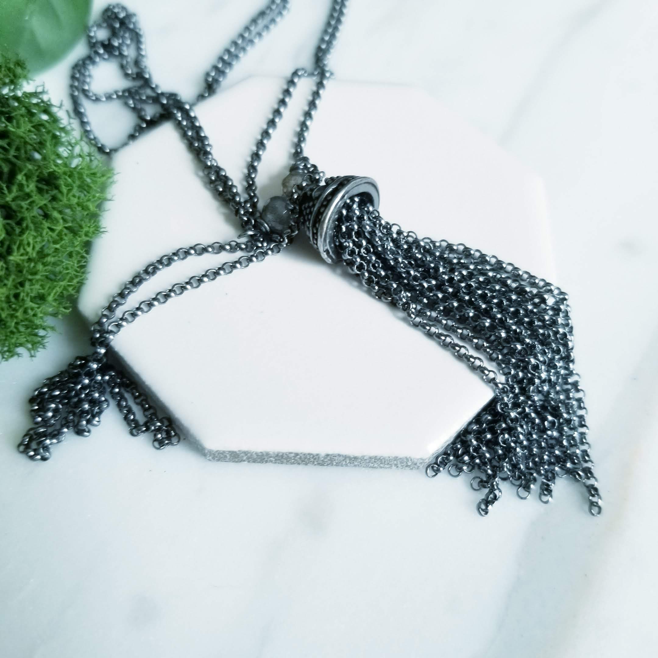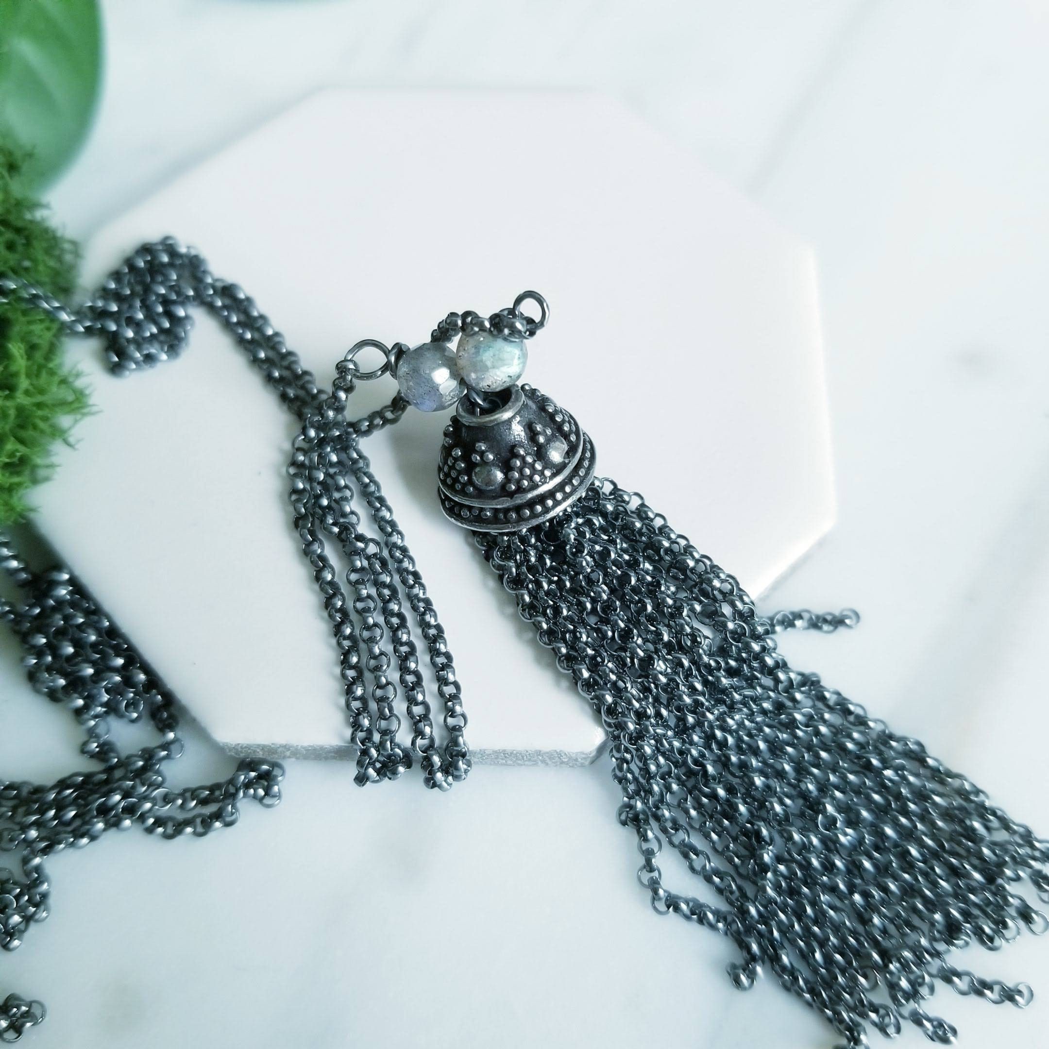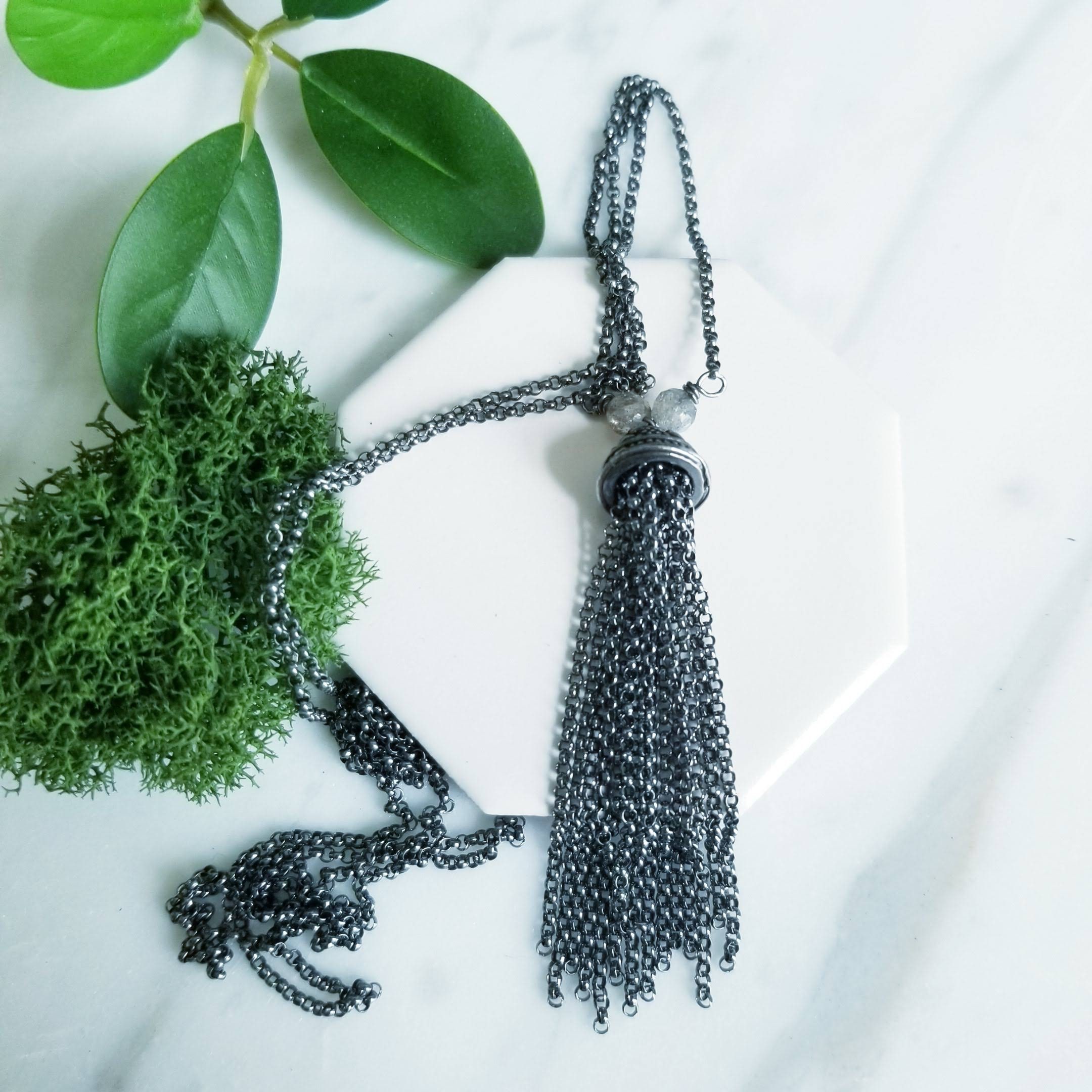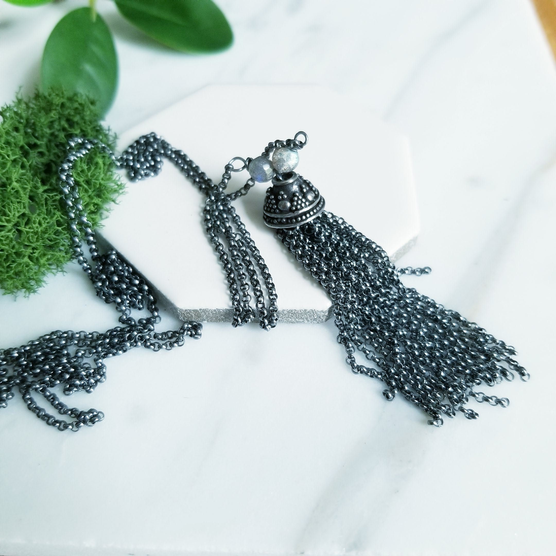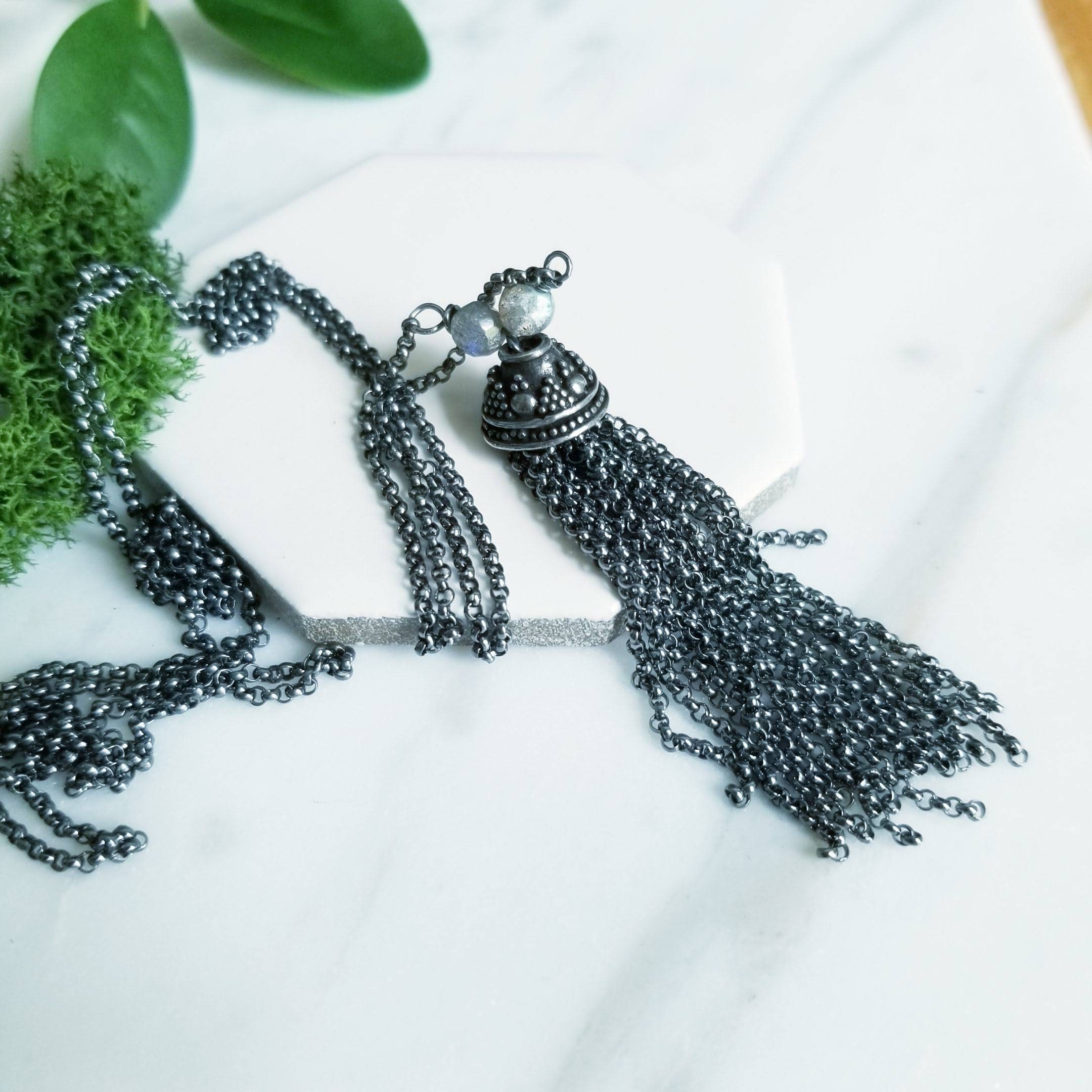 I've made the necklace 32" long, without a clasp so you can simply slip it on. The tassel is an additonal 2" in length, the tassel features a gorgeous detailed Sterling silver bead cap and the same rolo chain in random lengths. Two faceted blue laboradite beads anchor the chain to the bell cap and add a bit more sparkle.
