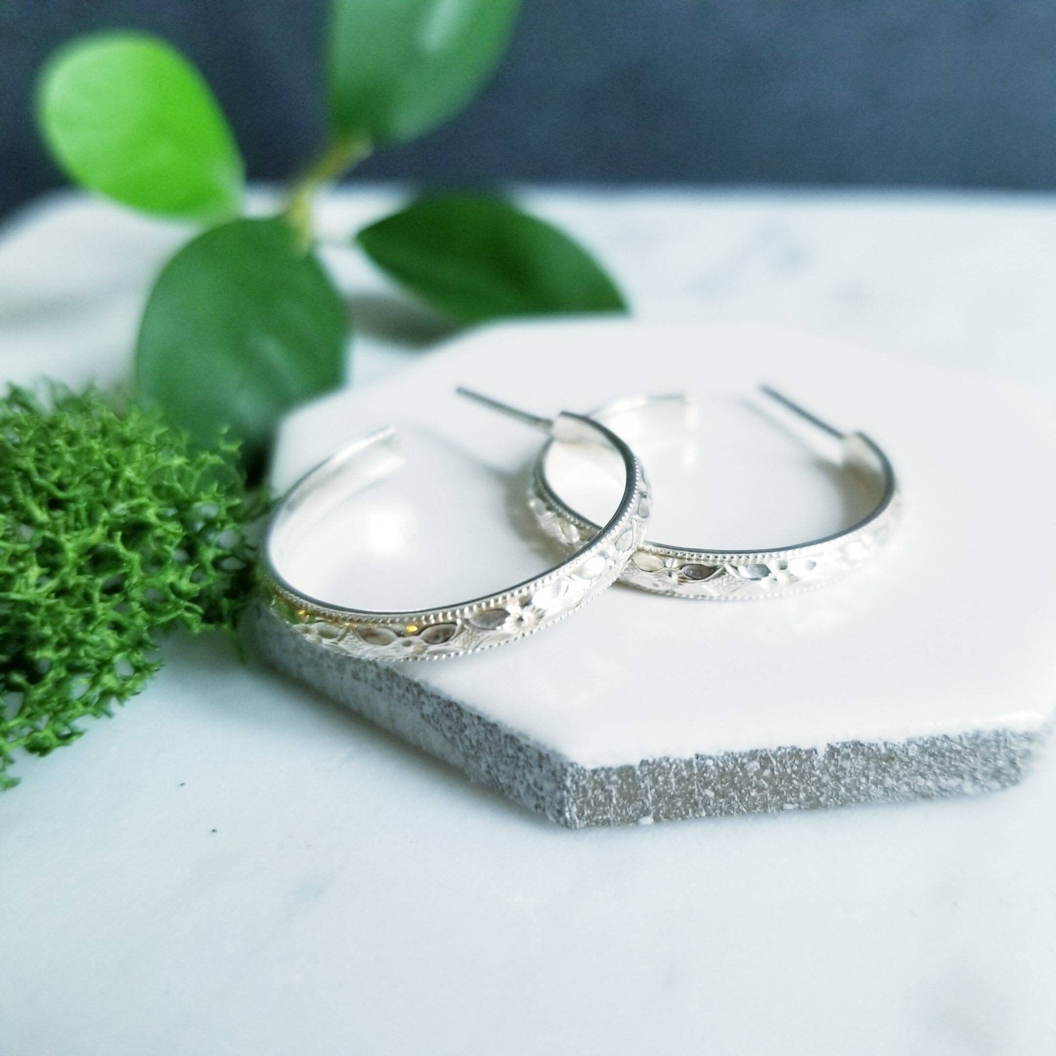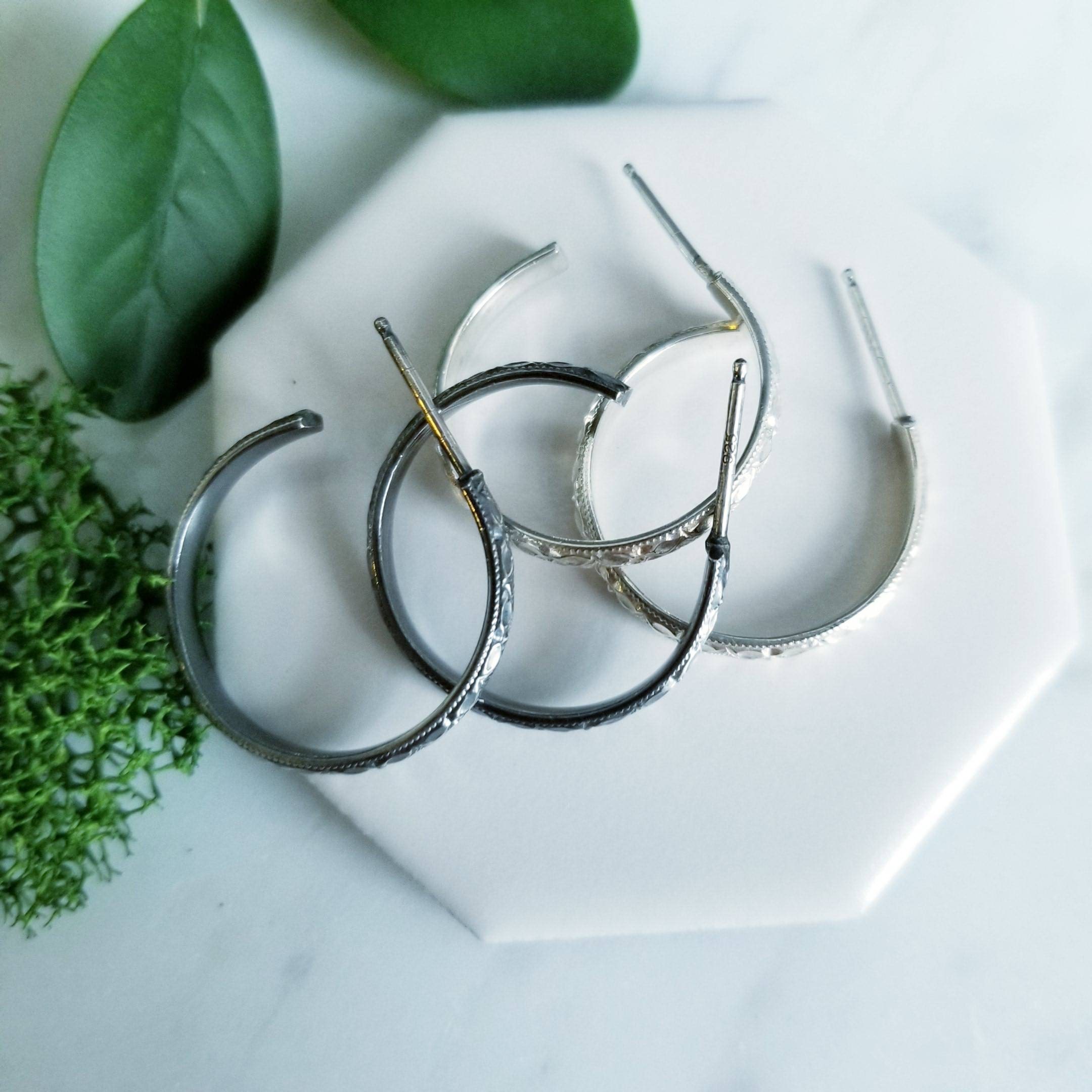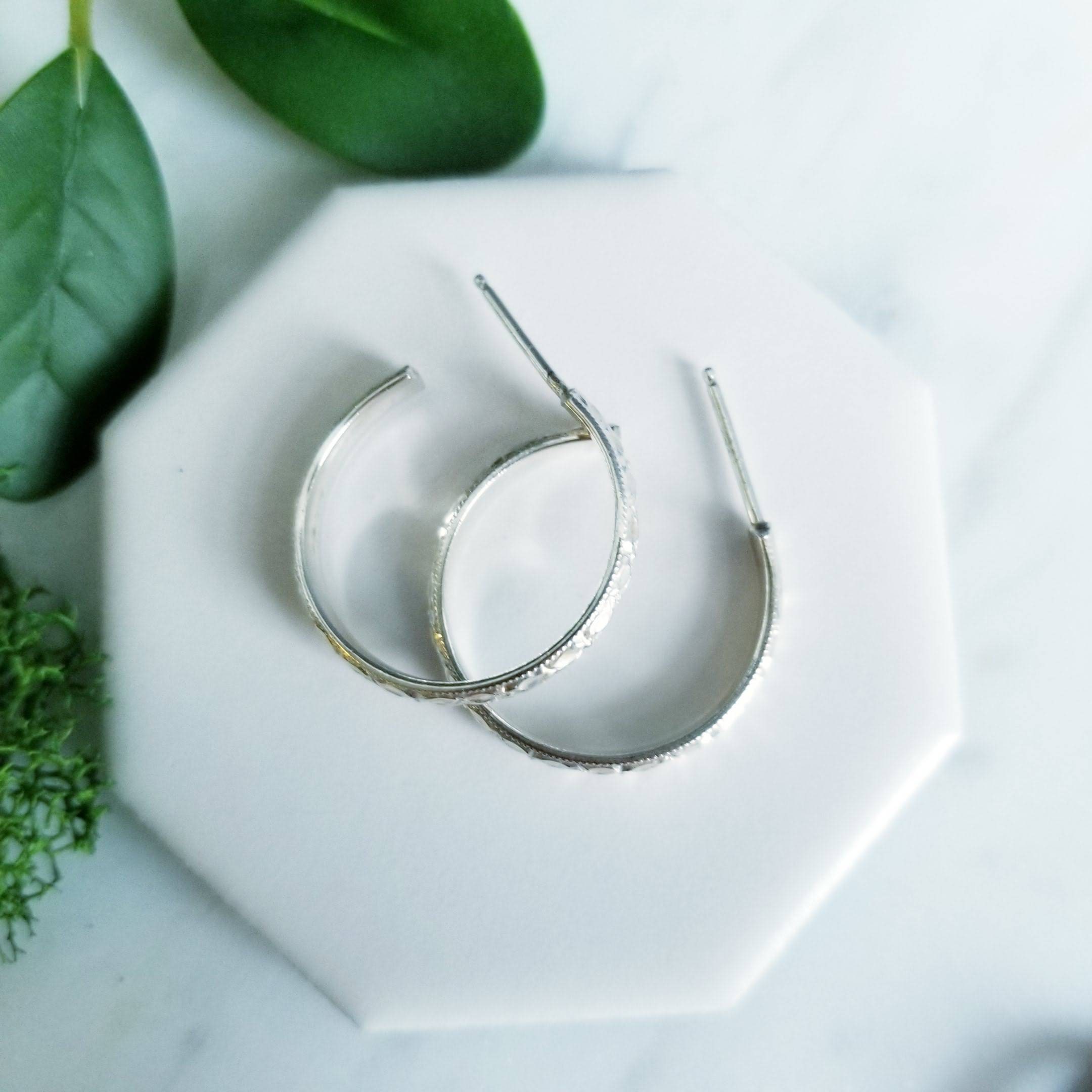 Diamond faceted patterned sterling silver curved into a medium sized post hoop earring.