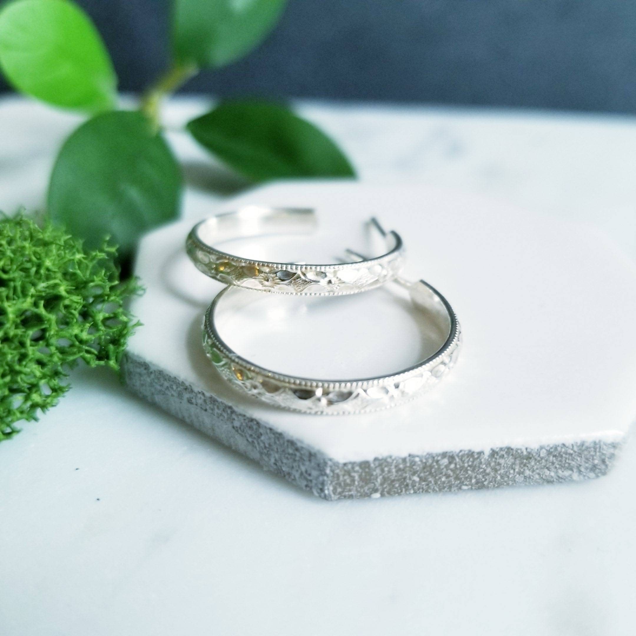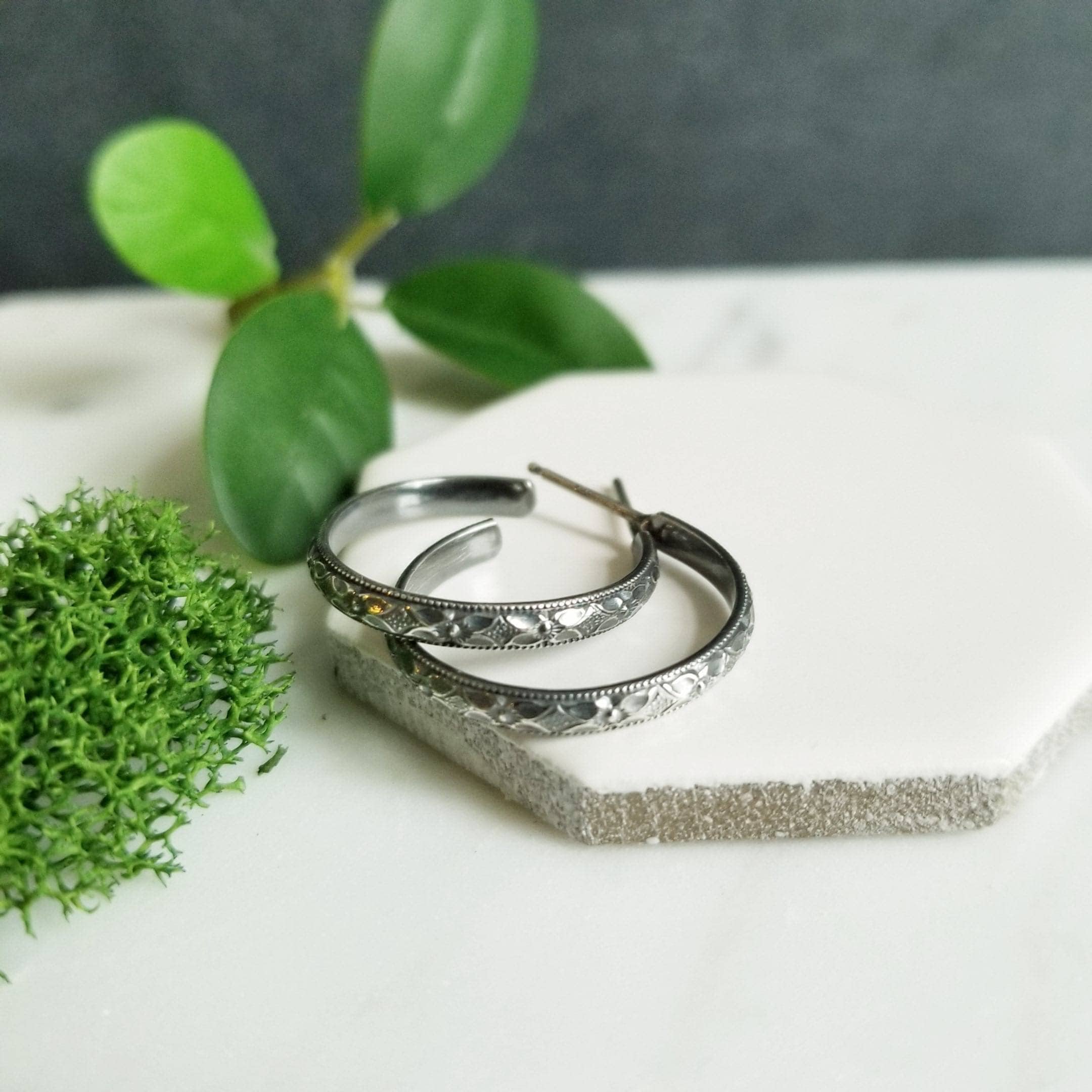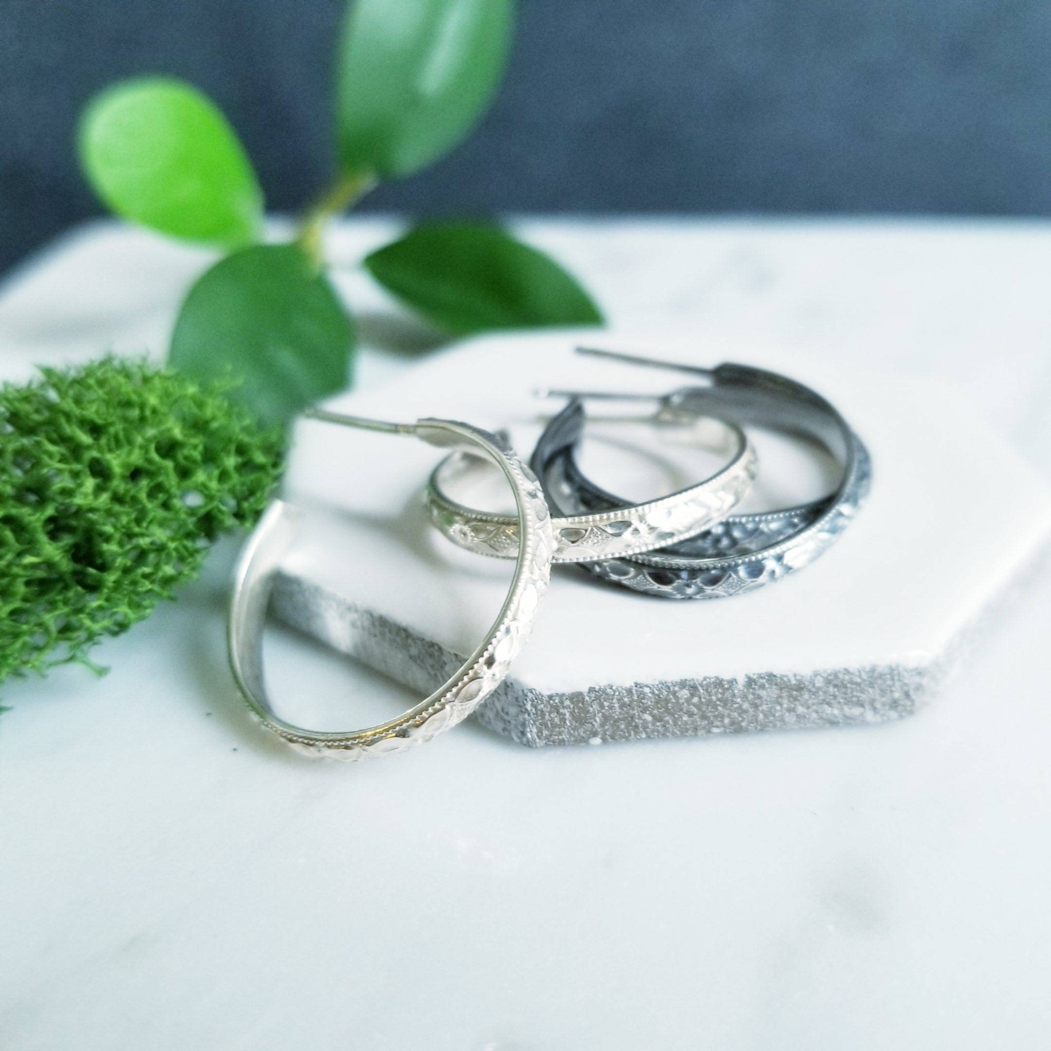 Diamond faceted patterned sterling silver curved into a medium sized post hoop earring.