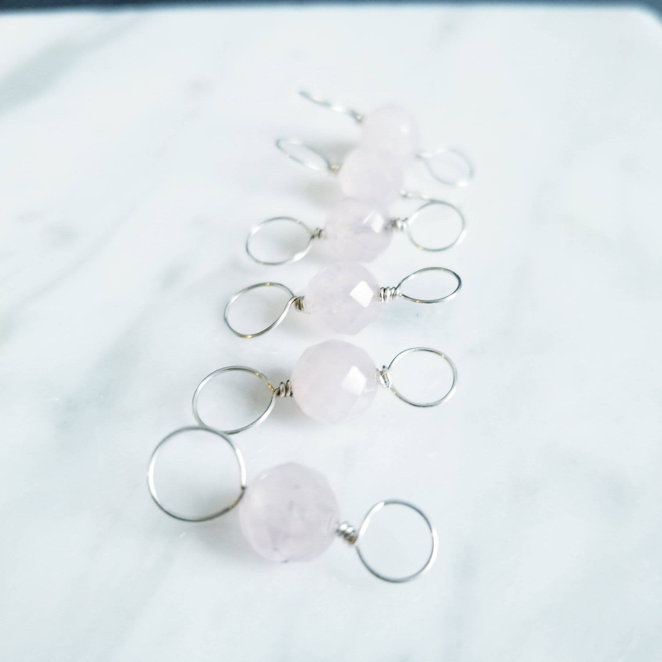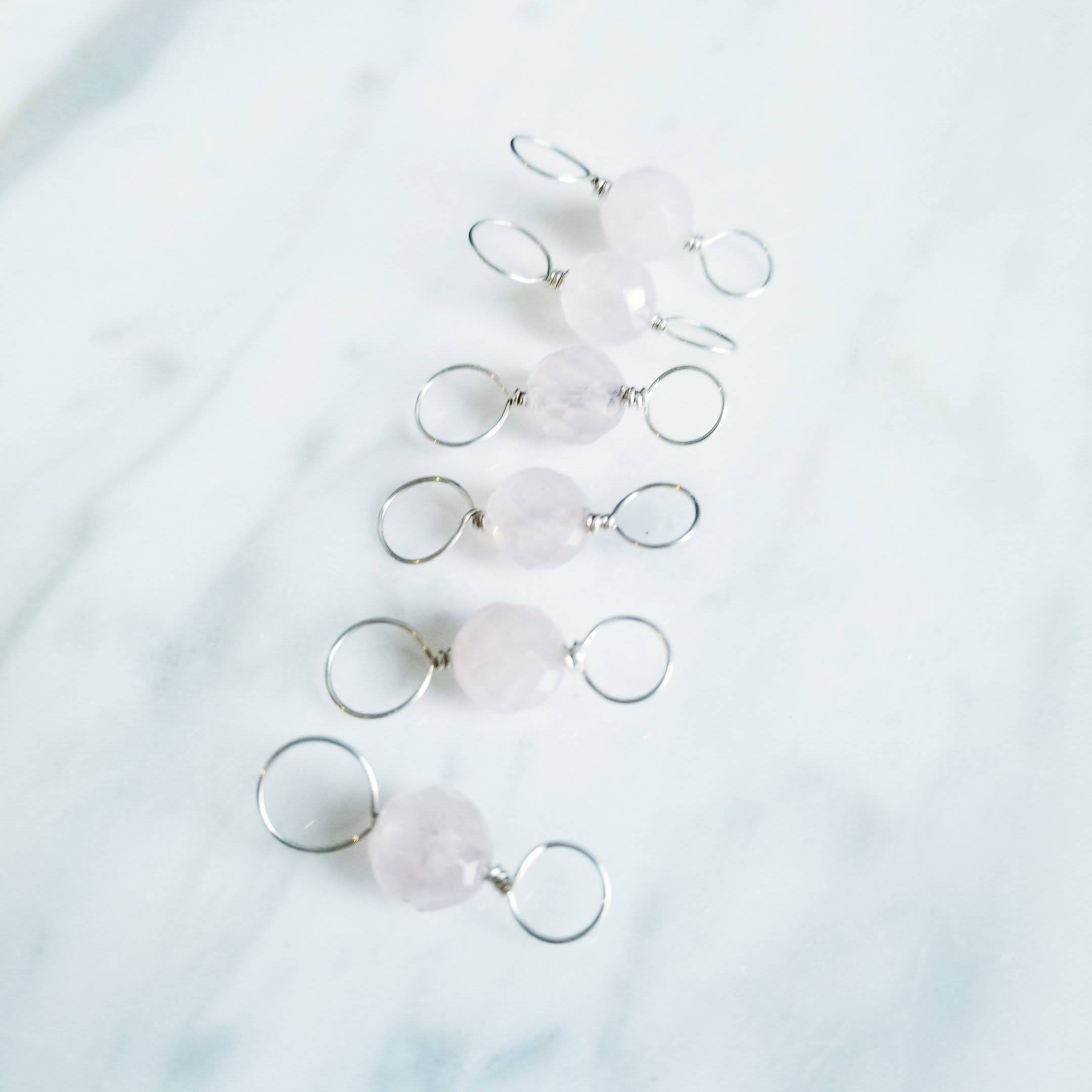 Set of 6 double ended stitch markers with faceted rose quartz rounds and sterling silver wire. One end fits up to a 6.5mm knitting needle, the other end fits up to a size 4.5mm.