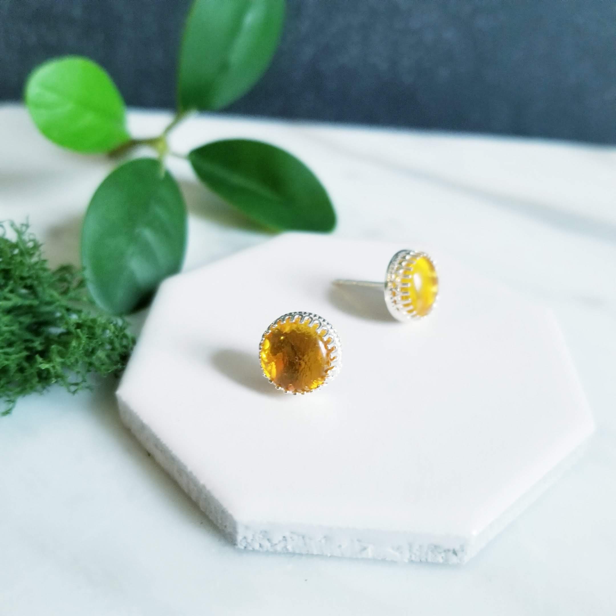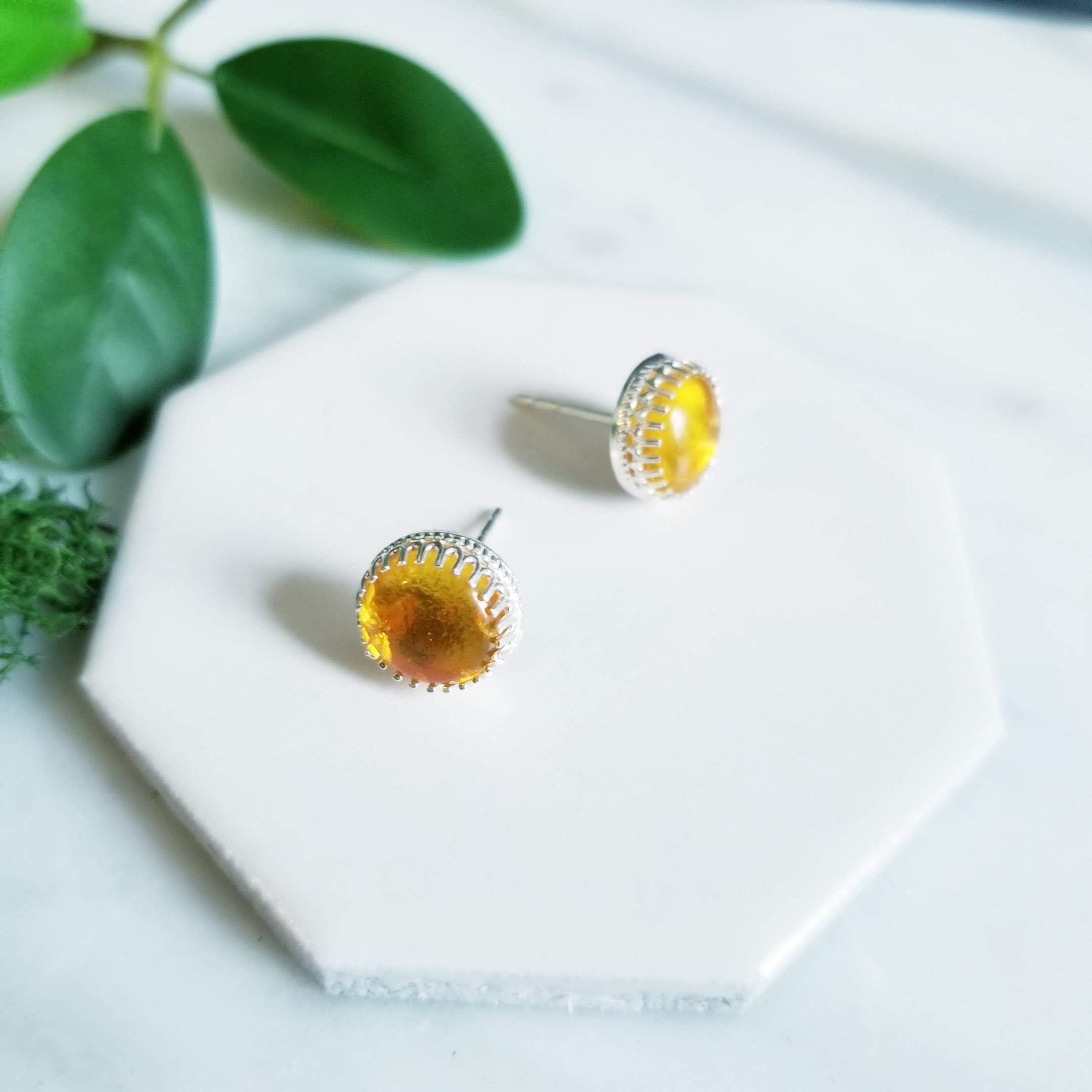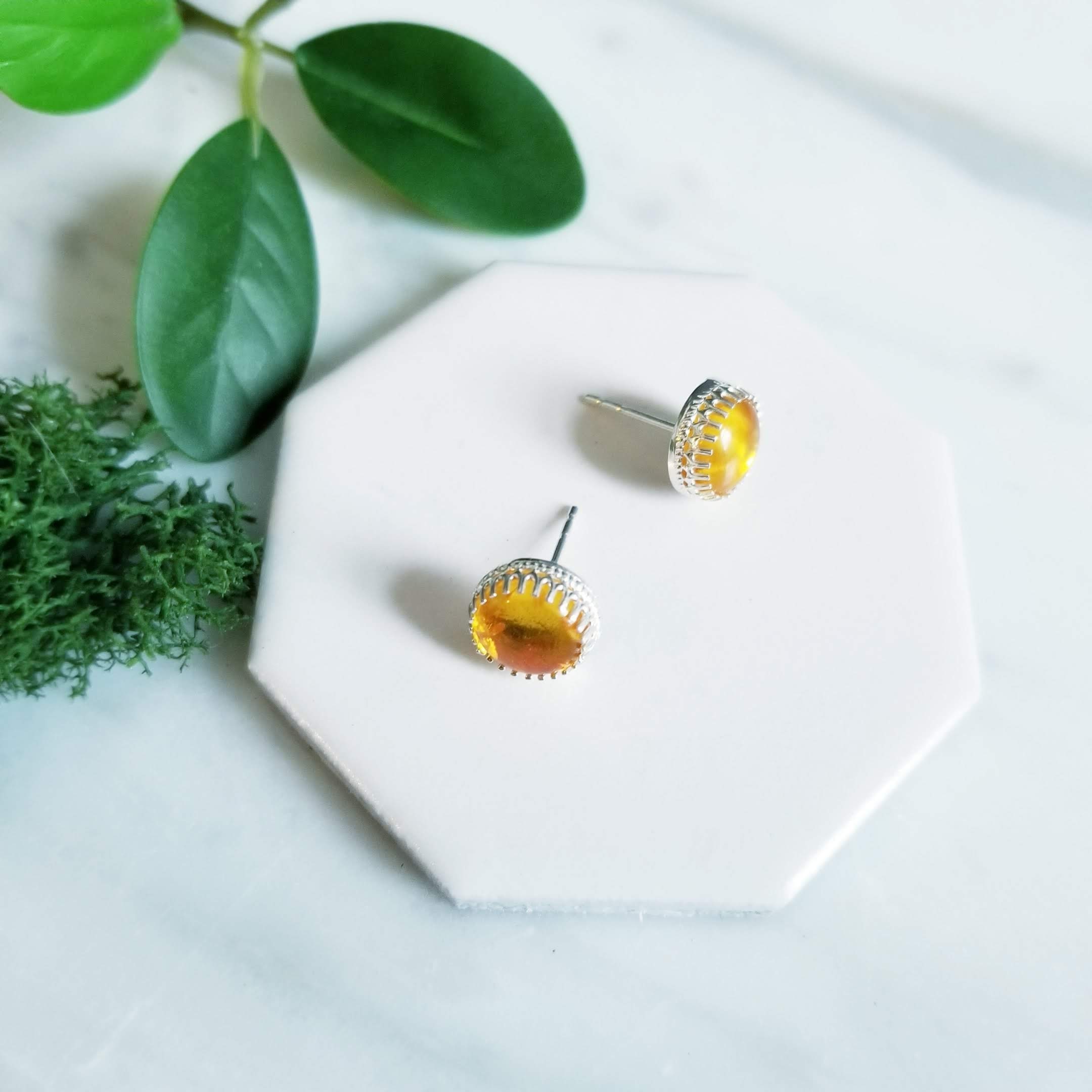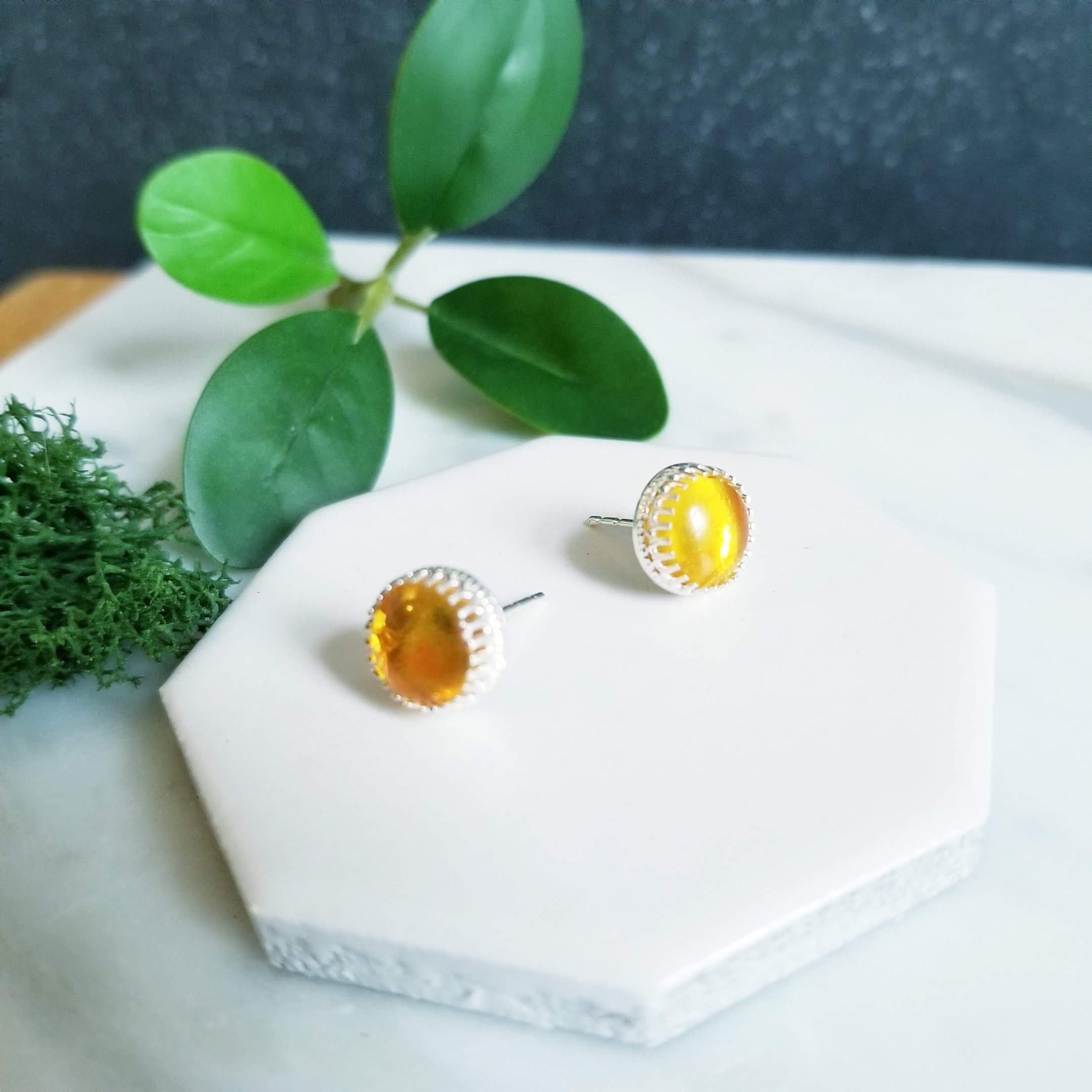 Gorgeous Amber cabochons are nestled inside a sterling silver crown setting.